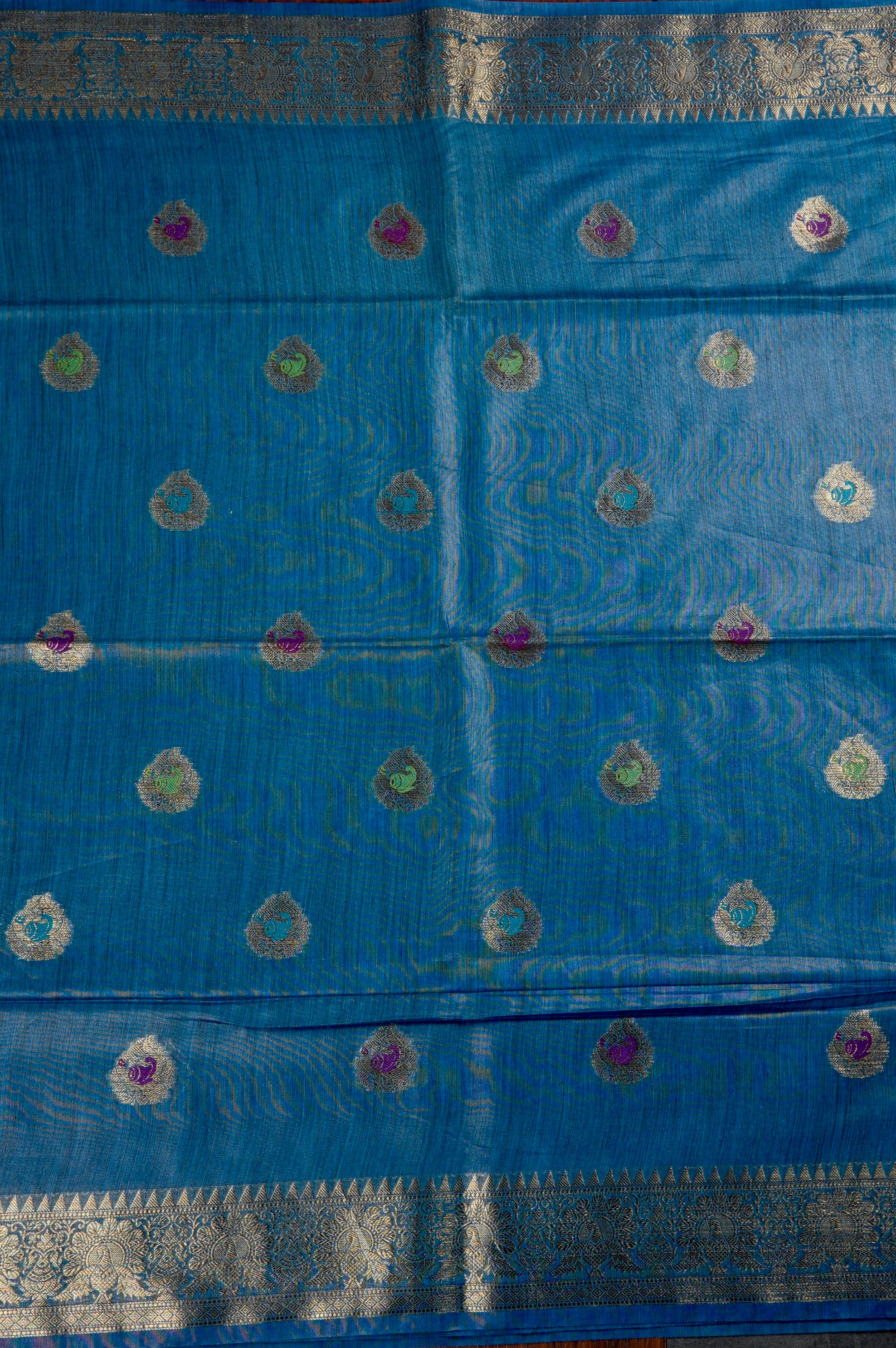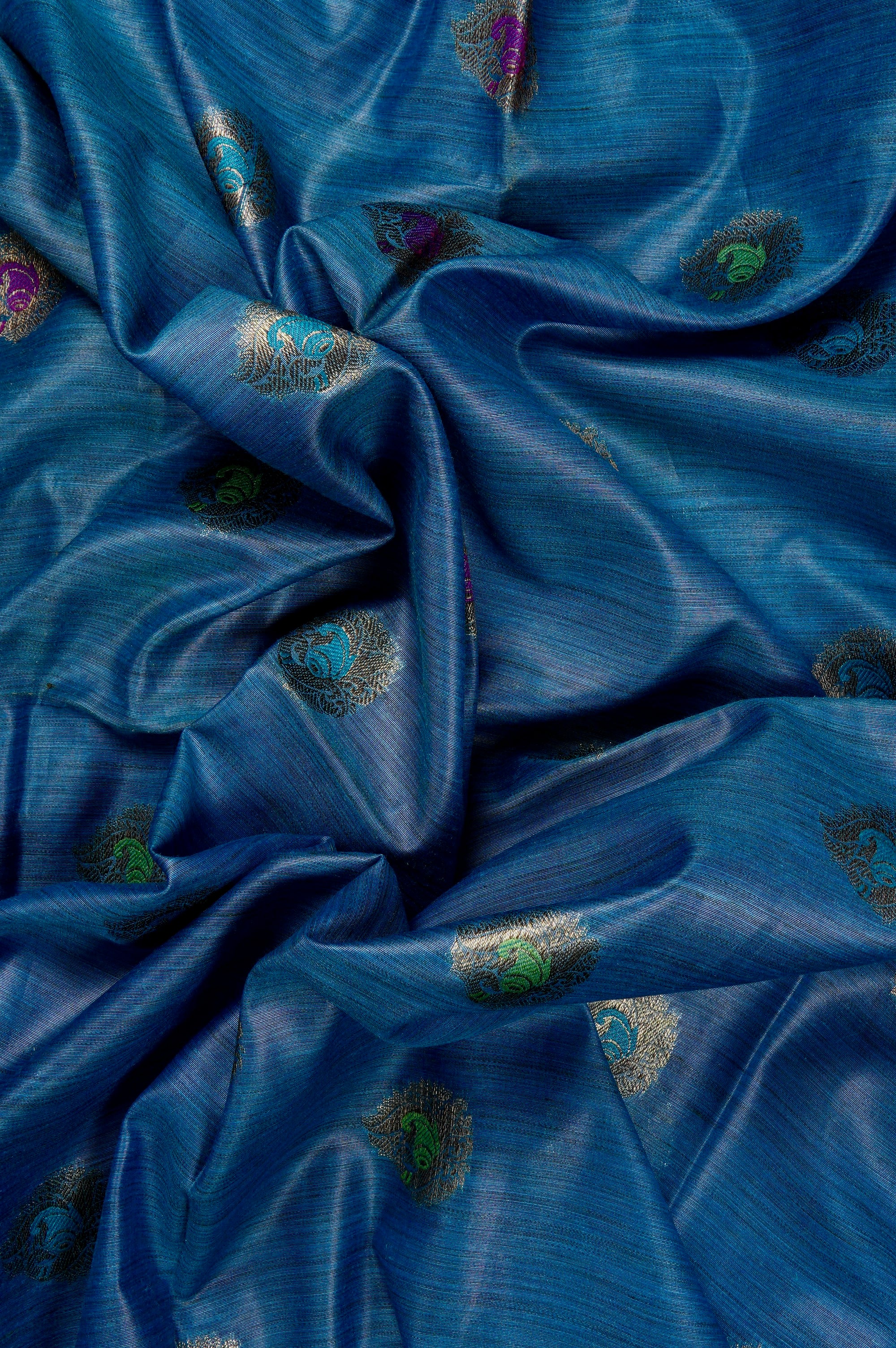 Chathams blue semi jute saree with small petal motifs holding smaller bhuttas in purple, green and blue woven throughout the body, resembling a peacock spreading its feathers out. The border is a band of recurring elegant peacock motifs filled with florals vines woven in gold zari. The saree has a vaira oosi pallu with a band of gold zari bordering it vertically.