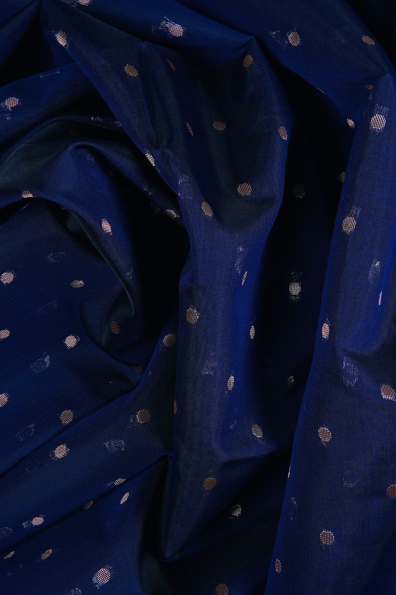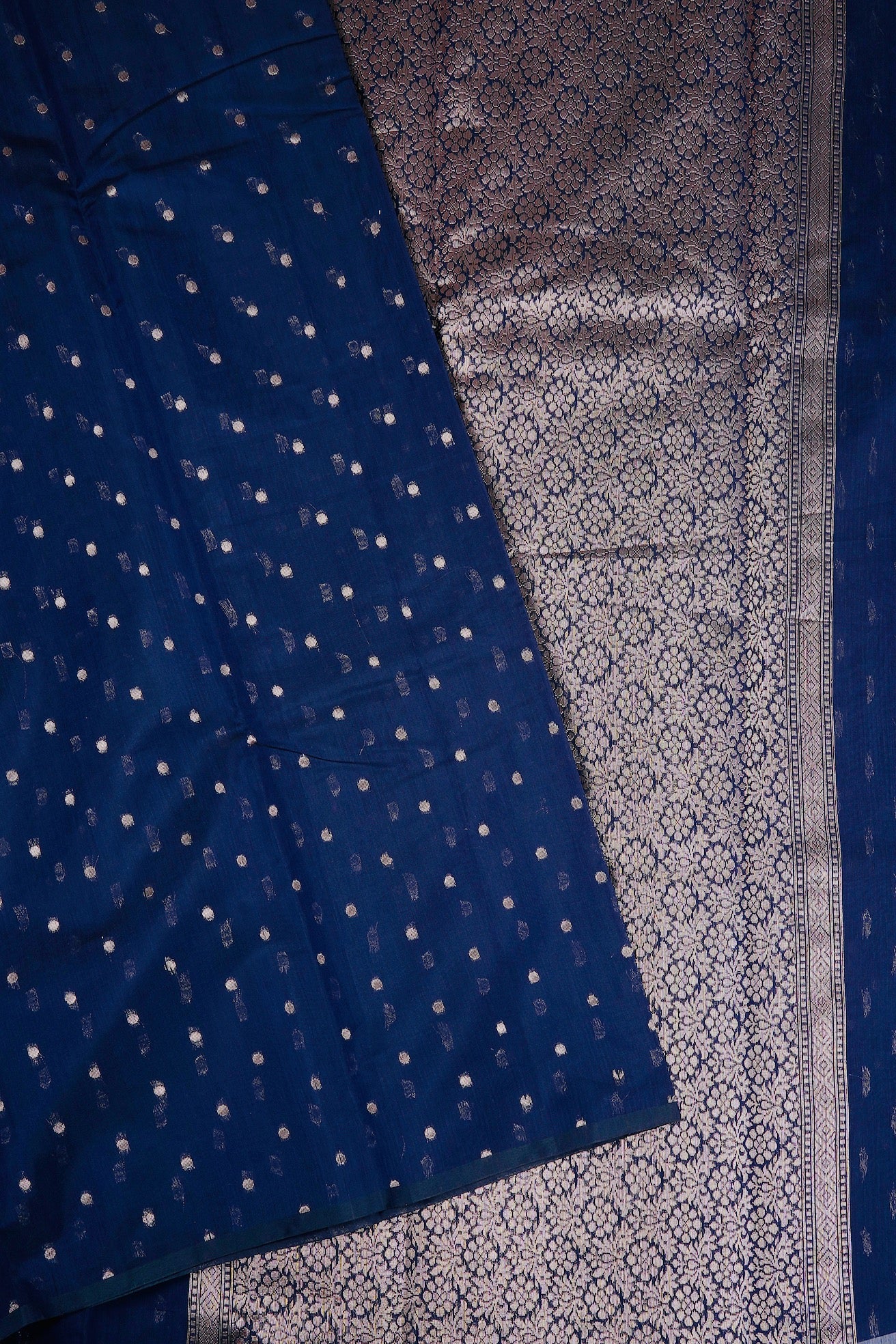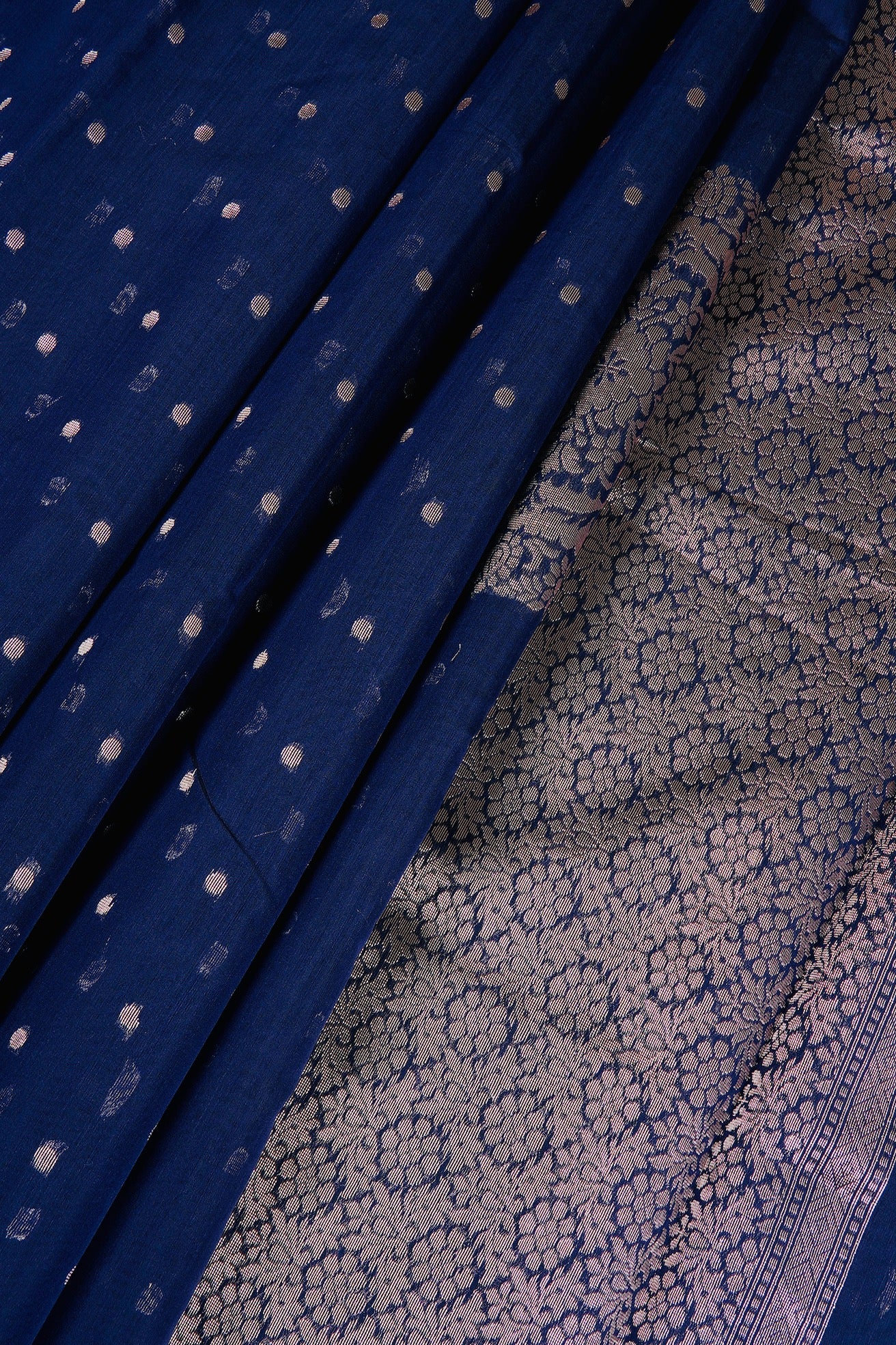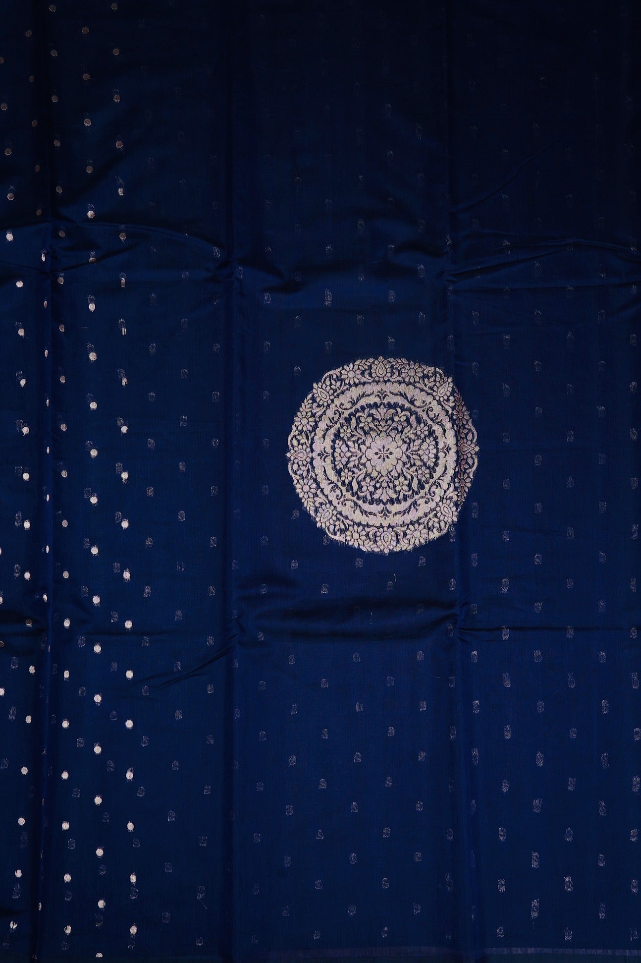Previous NextDark navy semi silk cotton saree with silver zari polka dots and a mandala centre piece filled with floral patterns in silver zari. The border is a thin band of dark navy. The pallu is a wide band of floral motifs surrounded by intricate leaf patterns, followed by a band of concentric diamonds woven in silver zari. The saree has a dark navy blouse with small diamonds woven throughout in silver zari.
