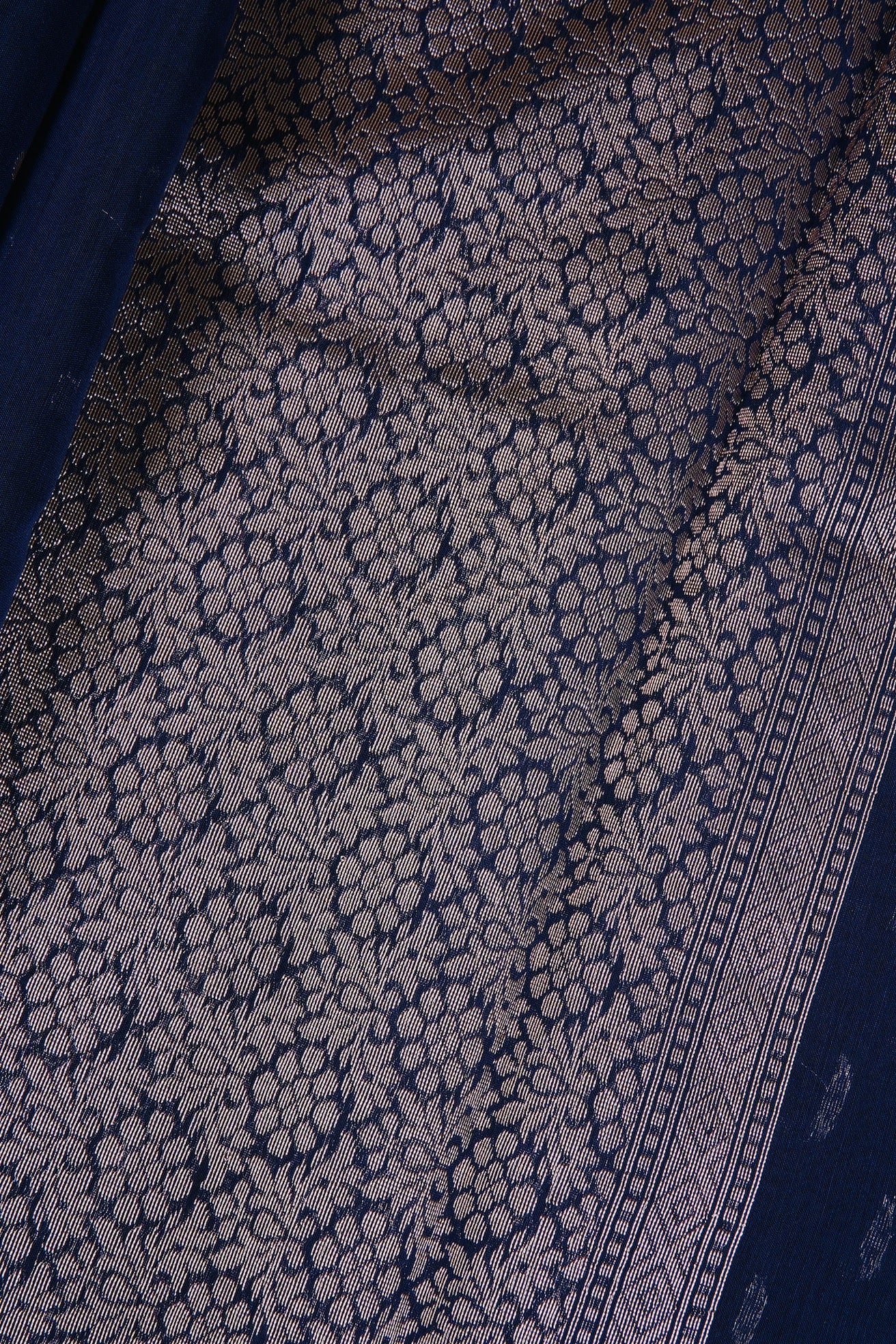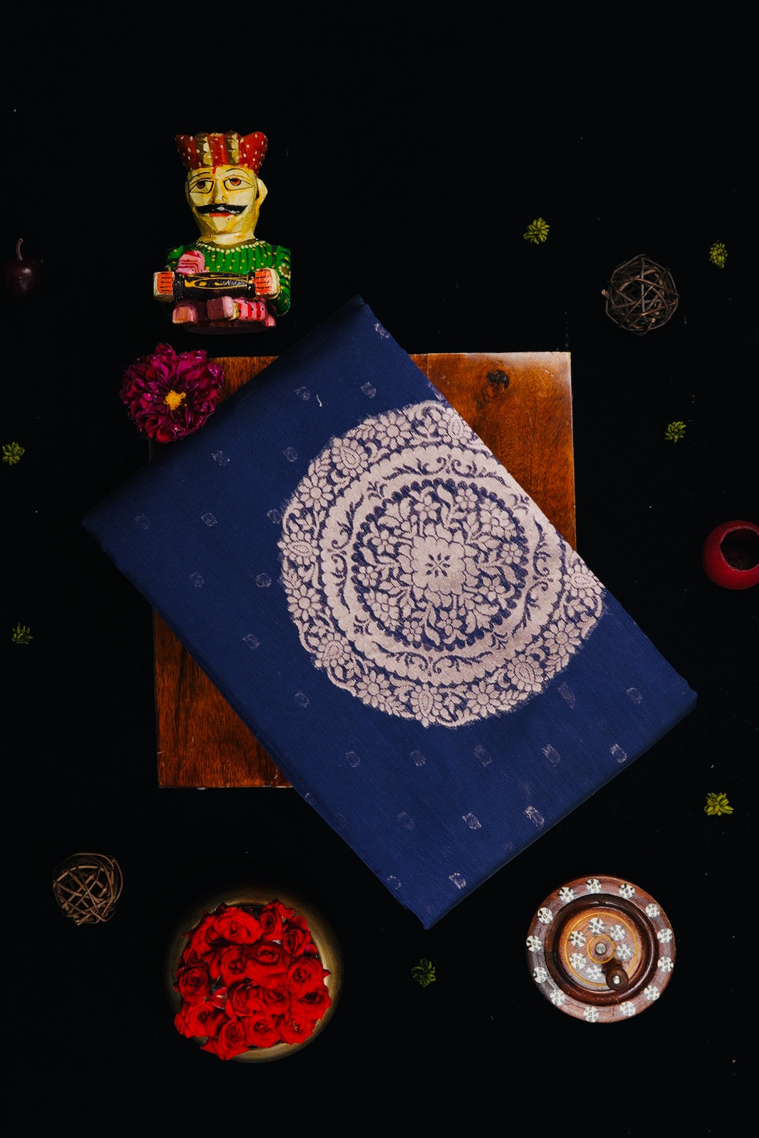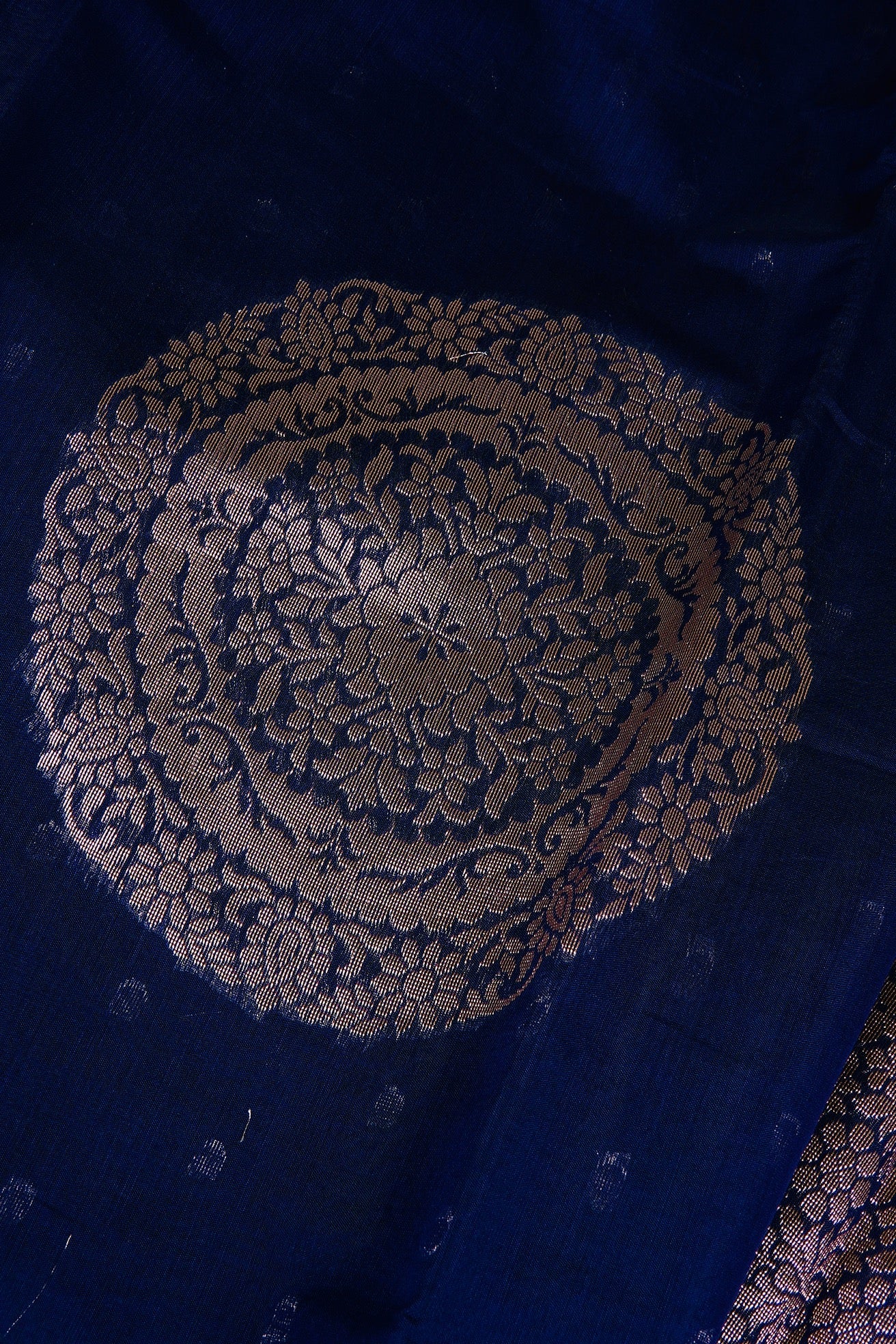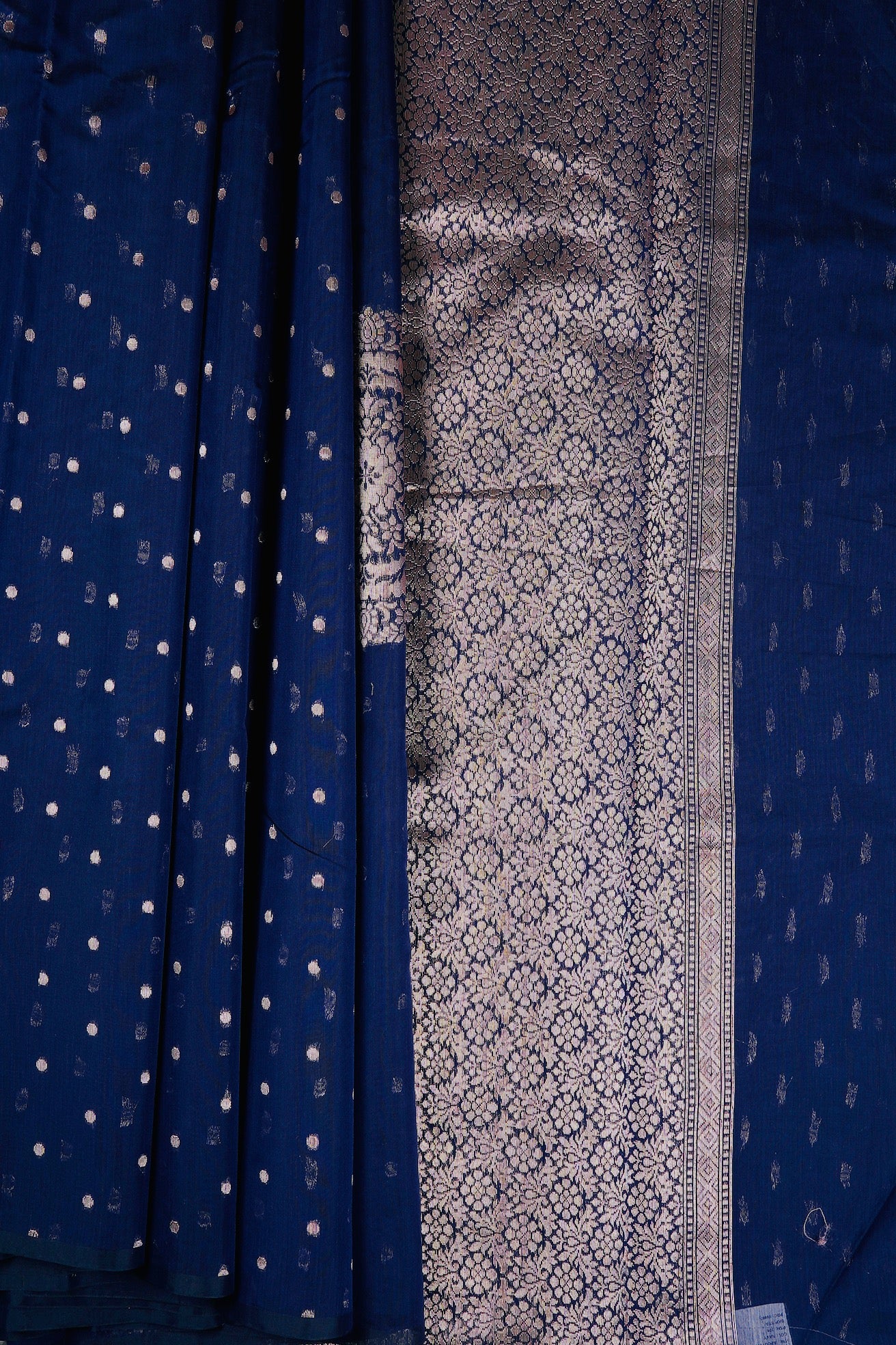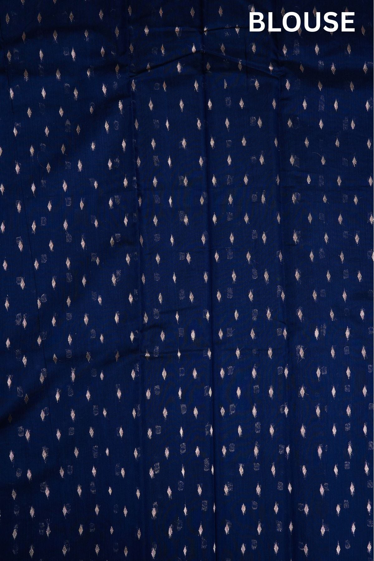 Previous NextDark navy semi silk cotton saree with silver zari polka dots and a mandala centre piece filled with floral patterns in silver zari. The border is a thin band of dark navy. The pallu is a wide band of floral motifs surrounded by intricate leaf patterns, followed by a band of concentric diamonds woven in silver zari. The saree has a dark navy blouse with small diamonds woven throughout in silver zari.