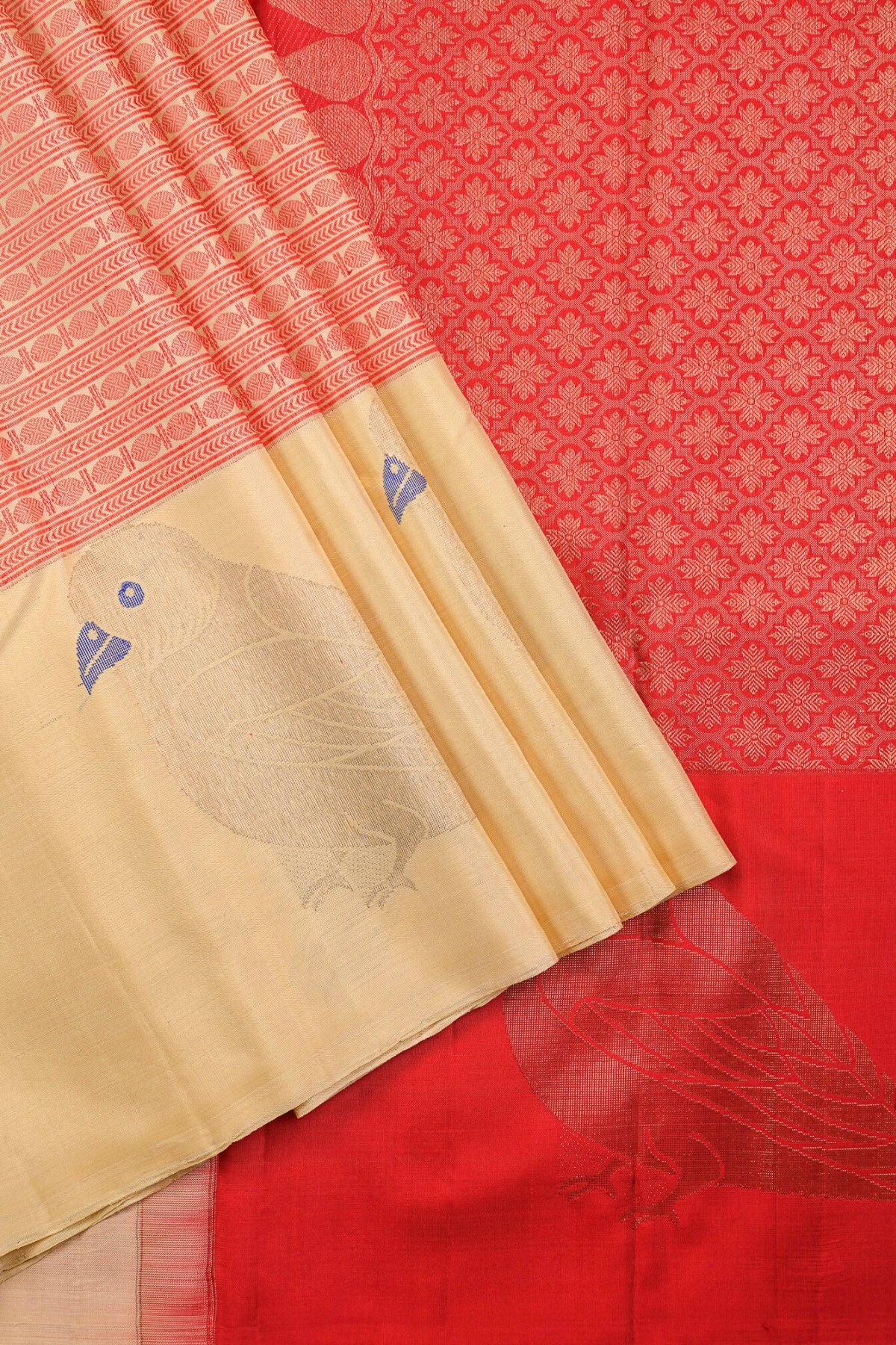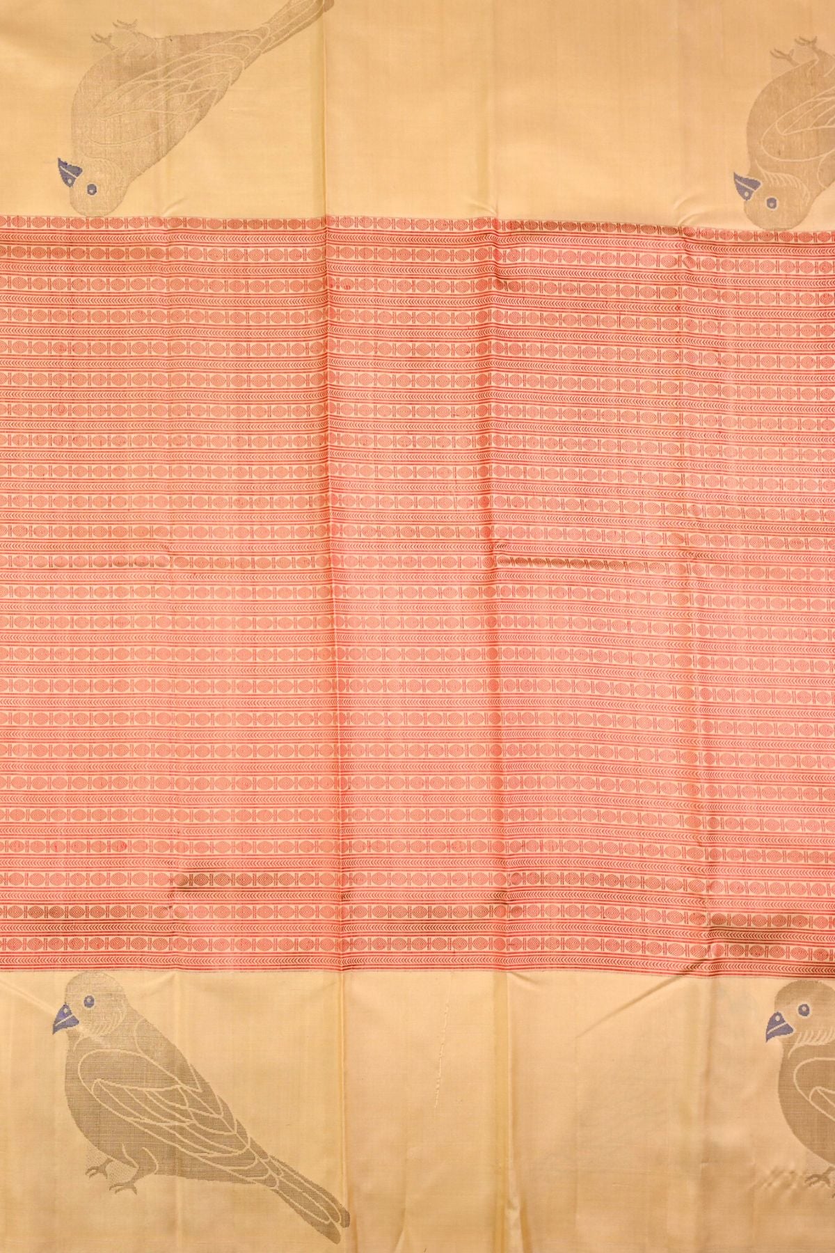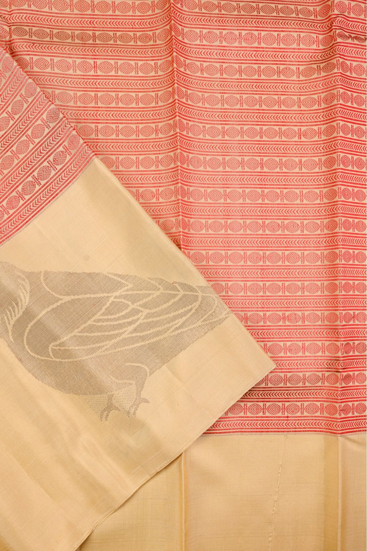 Beige Kanchipuram silk saree with Rudraksh patterns taking over the body in pink threads woven with elegant Kuruvi bhuttas in gold zari across the border.