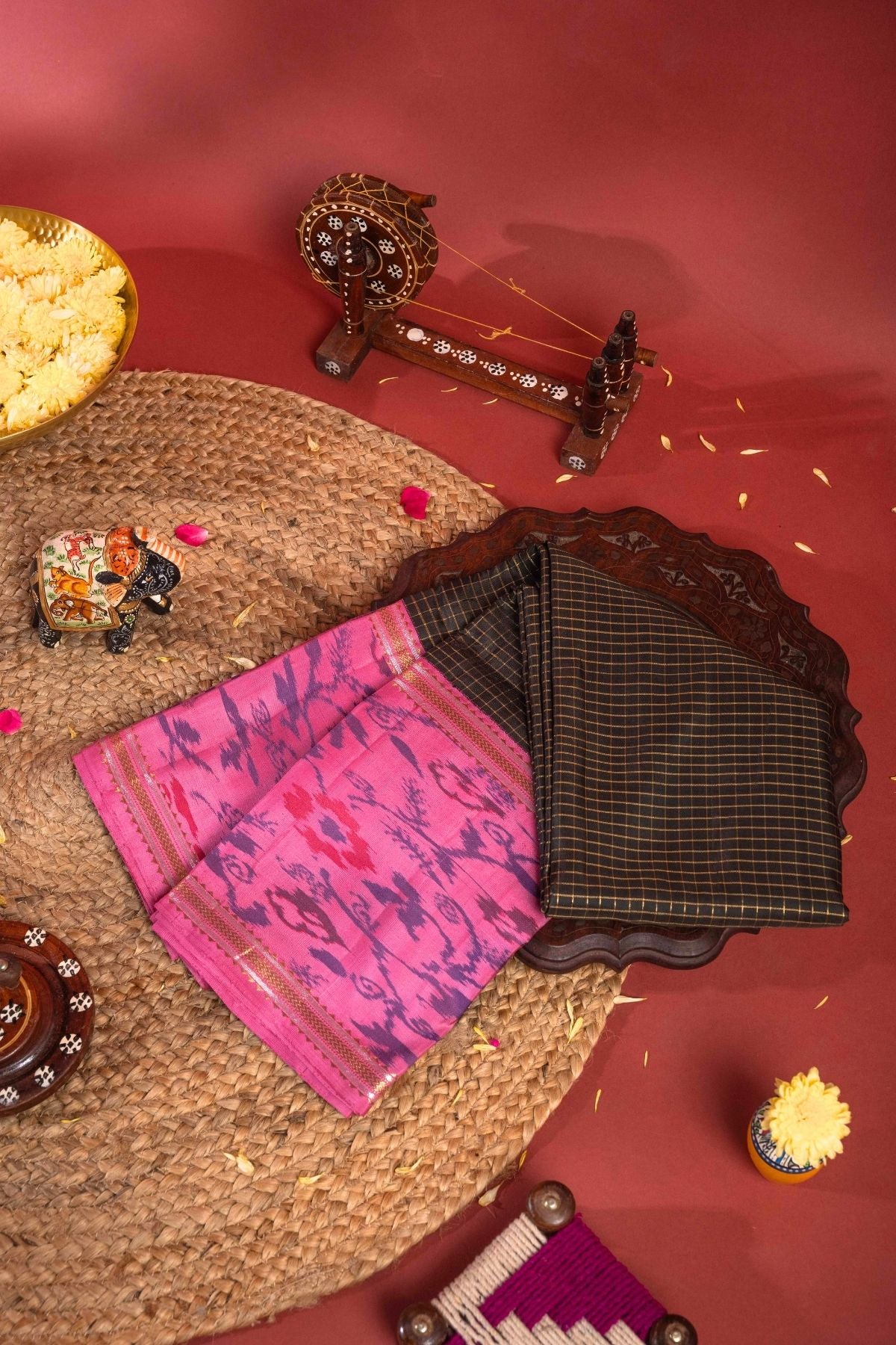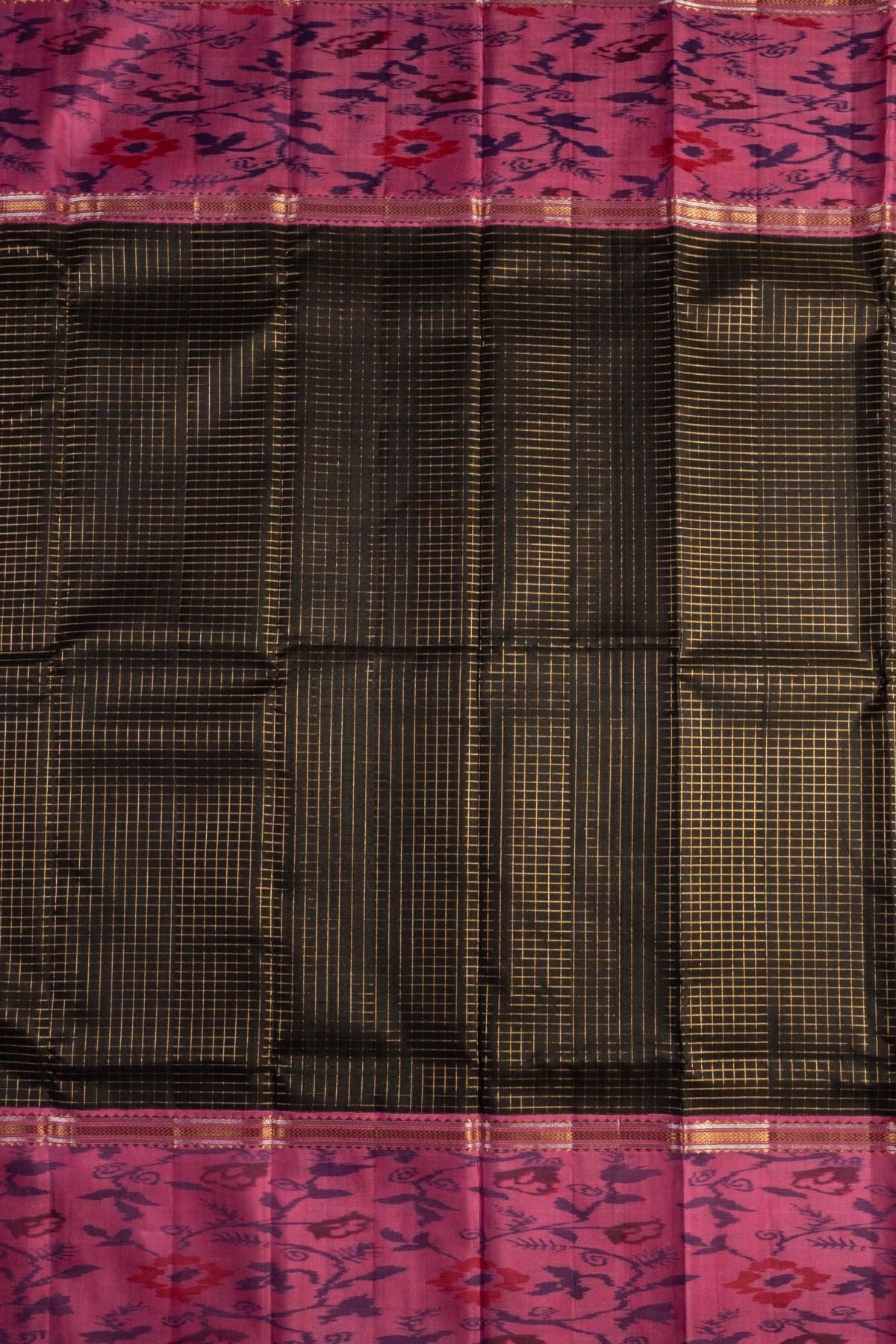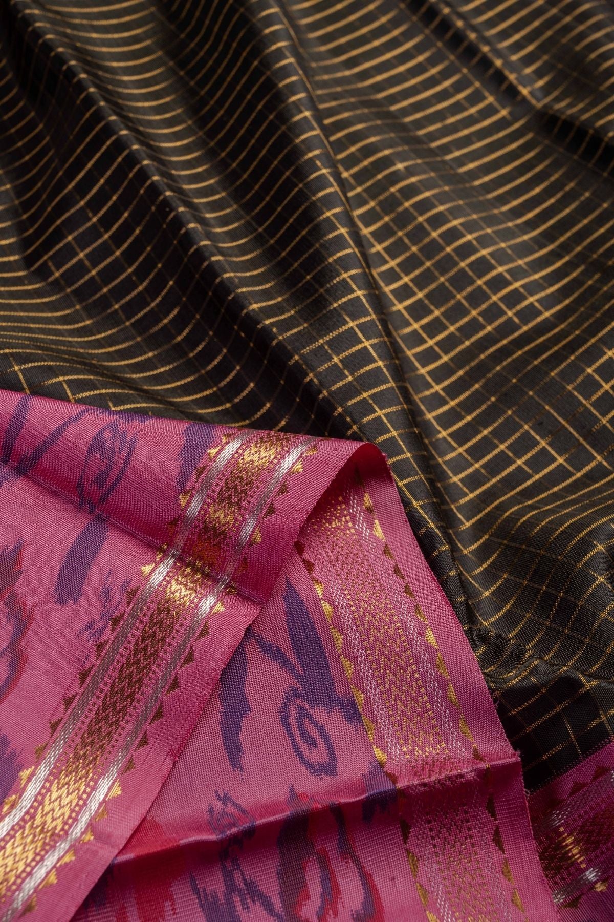 Black handloom kanchipuram silk saree with a purple Ikhat border. Vaira-oosi checks in gold zari trial the body. A Collectible.