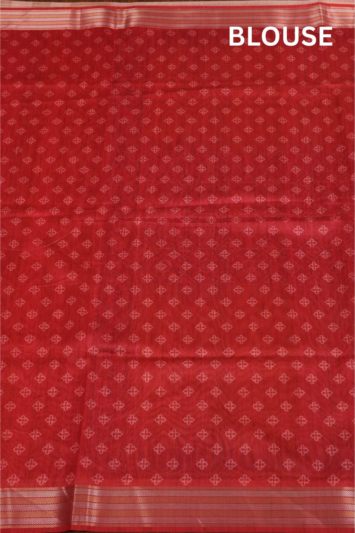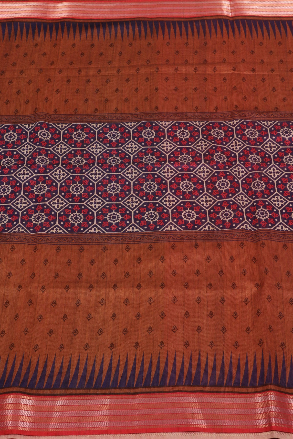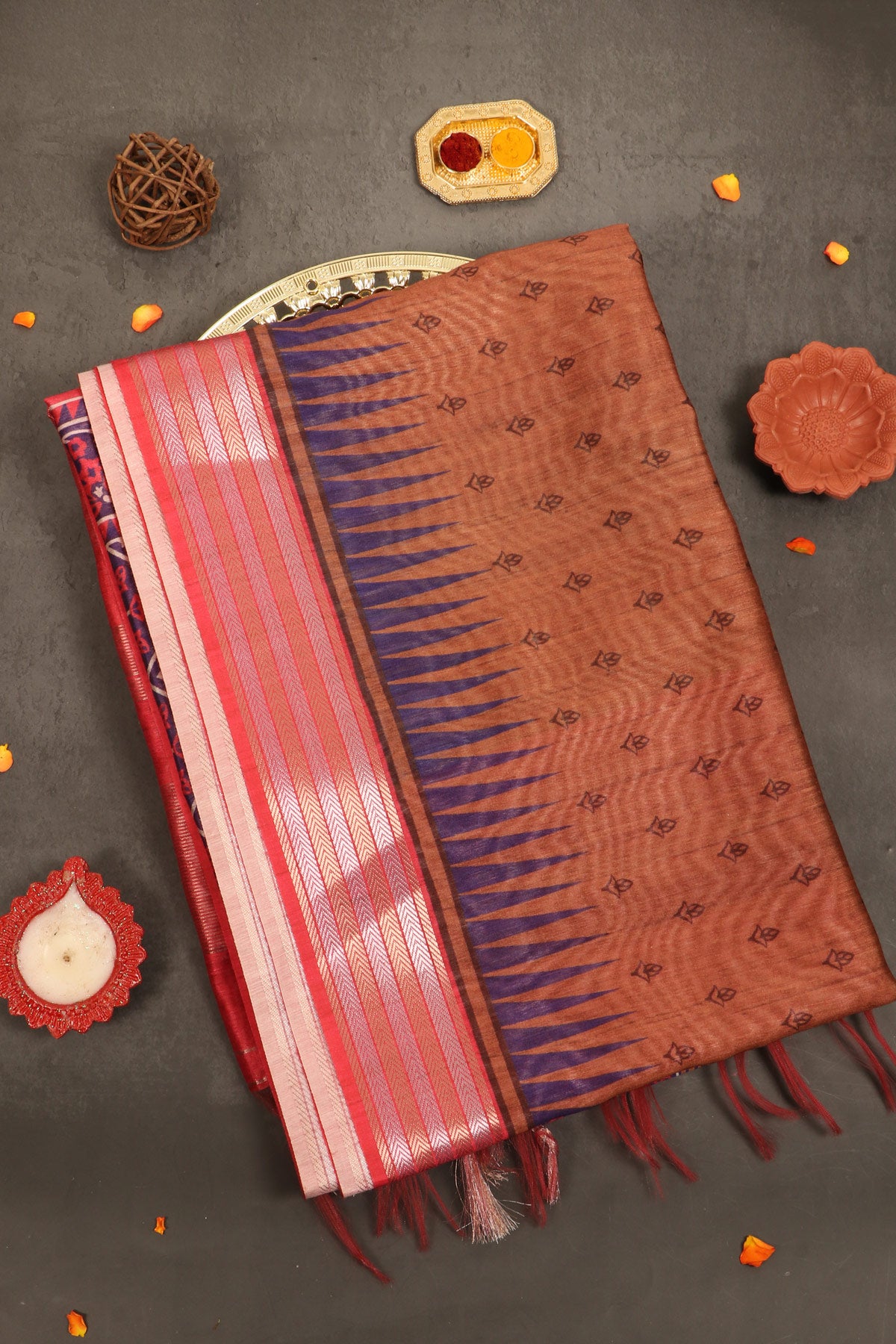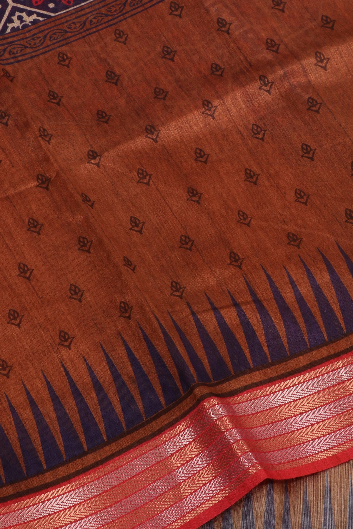 Brown semi tussar saree with a vibrant Temple border carrying gold and silver zari. The body carries classic Kalamkari and Patola prints