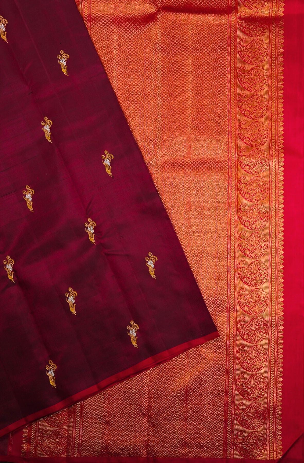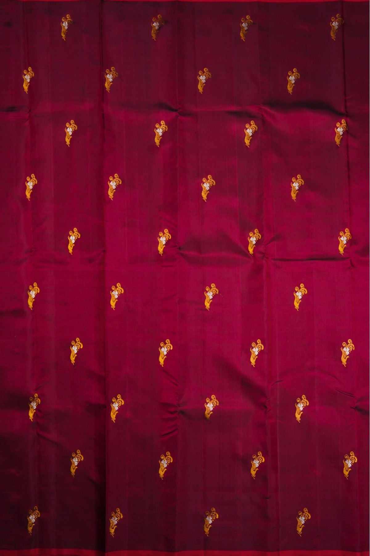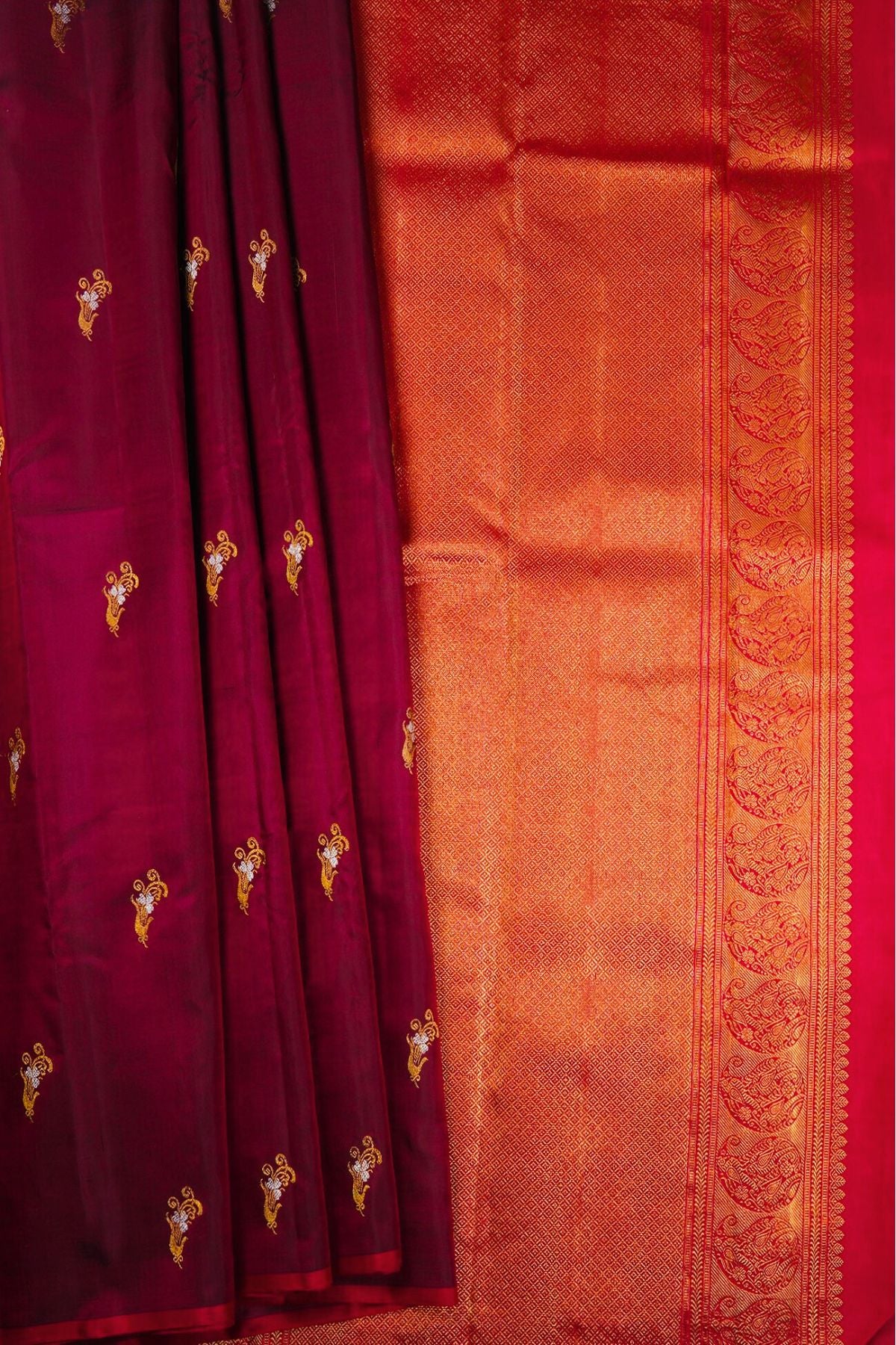Burgundy Kanchipuram Silk Saree with stylised flower motifs woven in gold and silver zari throughout the body. The pallu has an intricate width of a grid patterns filled with motifs and ends with a band of stylised mango bhuttas woven in gold zari on a bright pink base. The saree has a solid raspberry pink blouse.