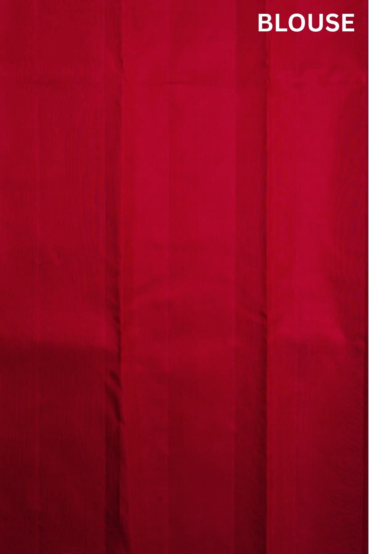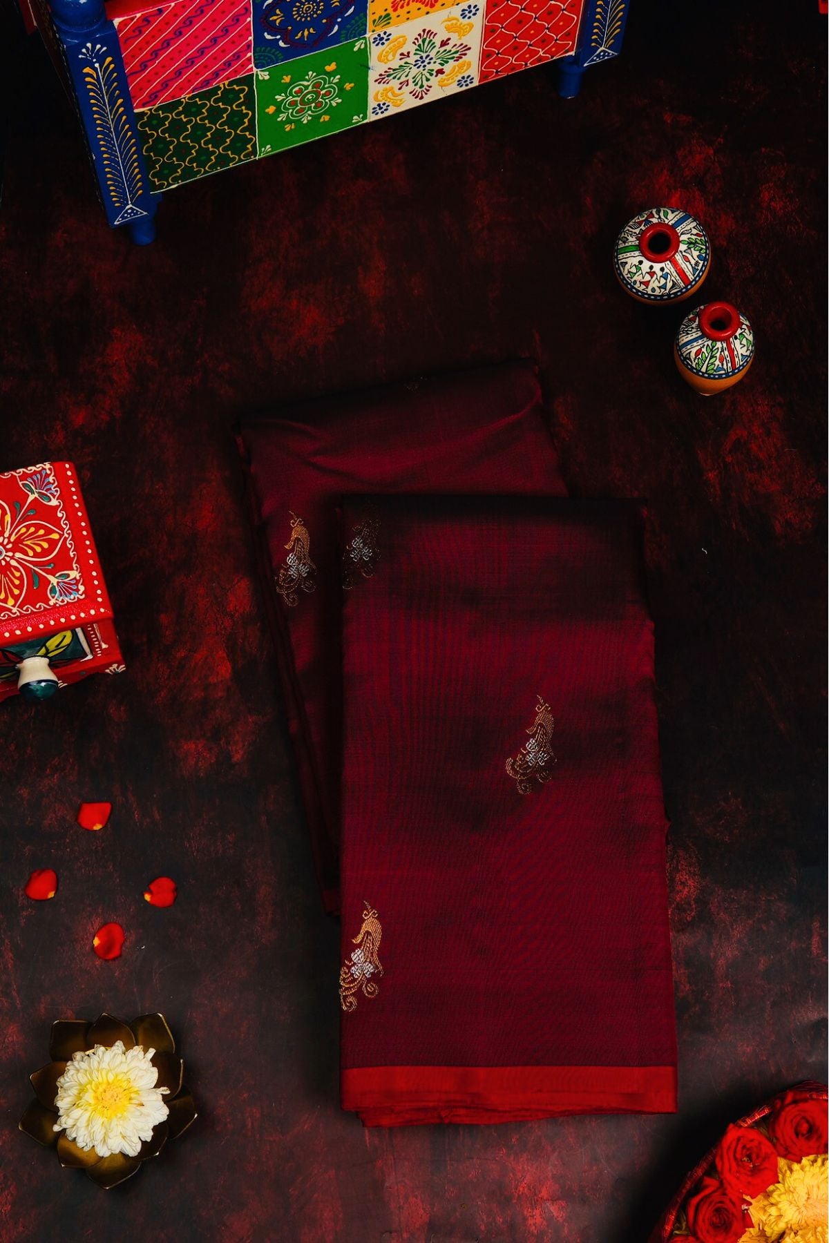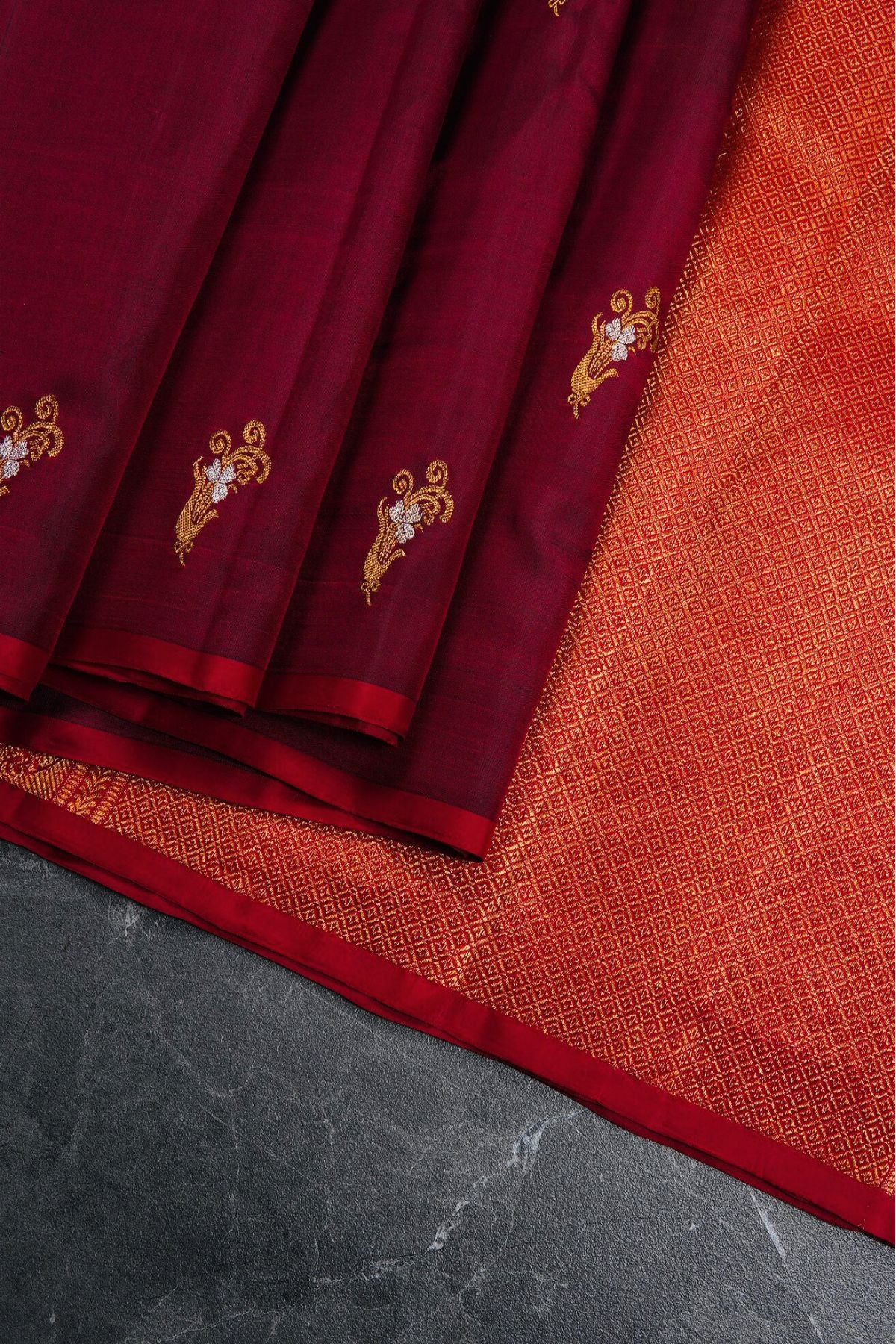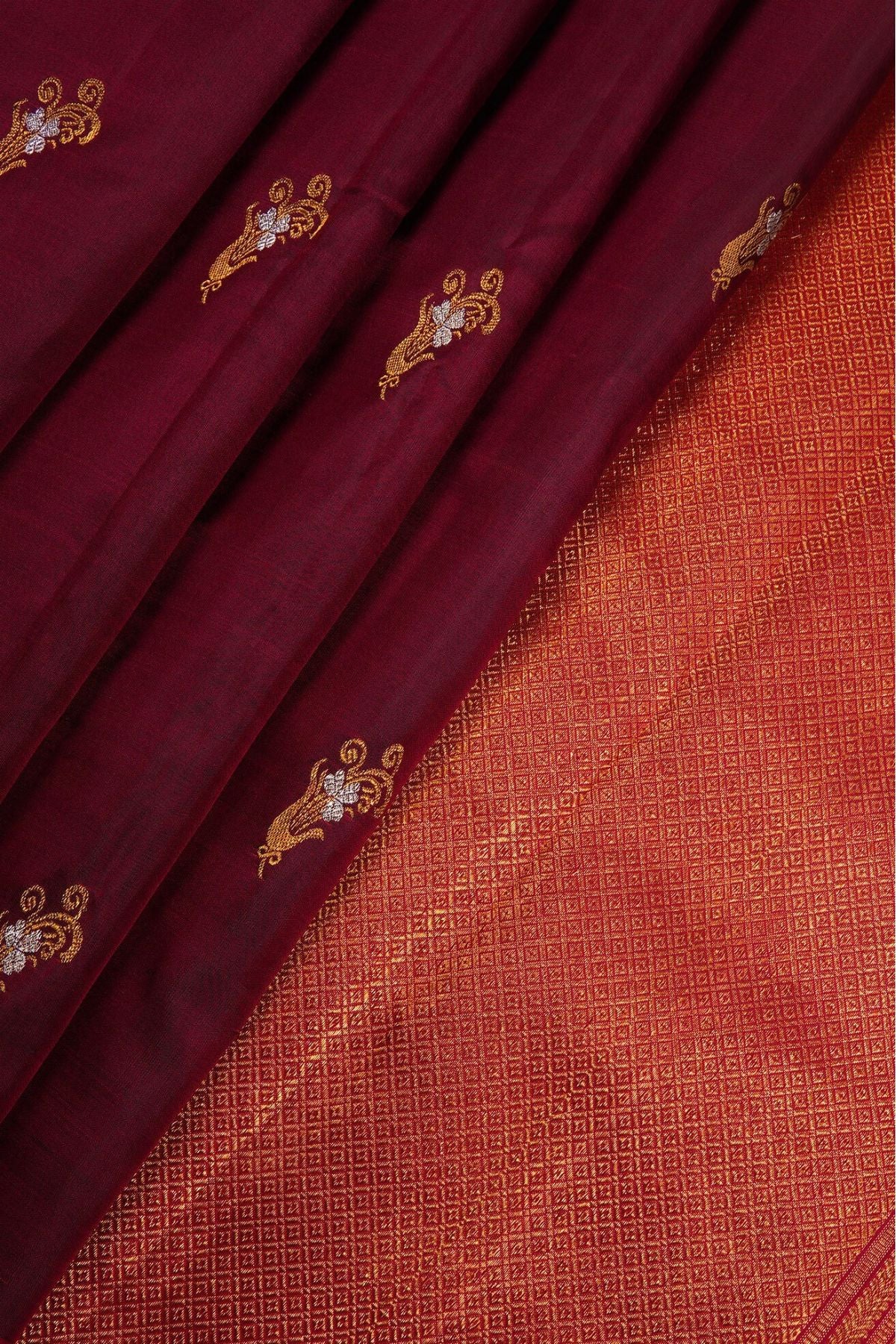 Burgundy Kanchipuram Silk Saree with stylised flower motifs woven in gold and silver zari throughout the body. The pallu has an intricate width of a grid patterns filled with motifs and ends with a band of stylised mango bhuttas woven in gold zari on a bright pink base. The saree has a solid raspberry pink blouse.
