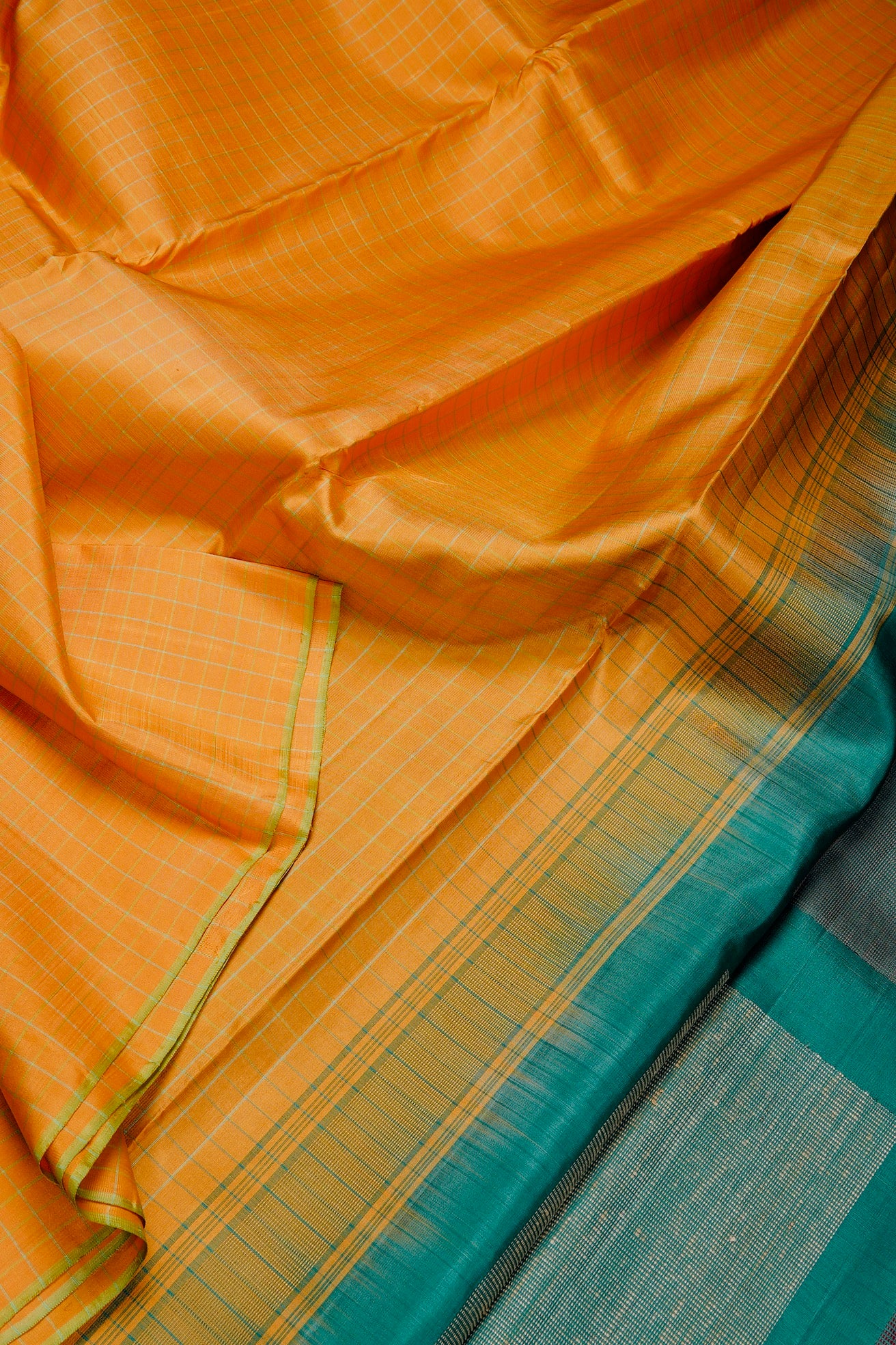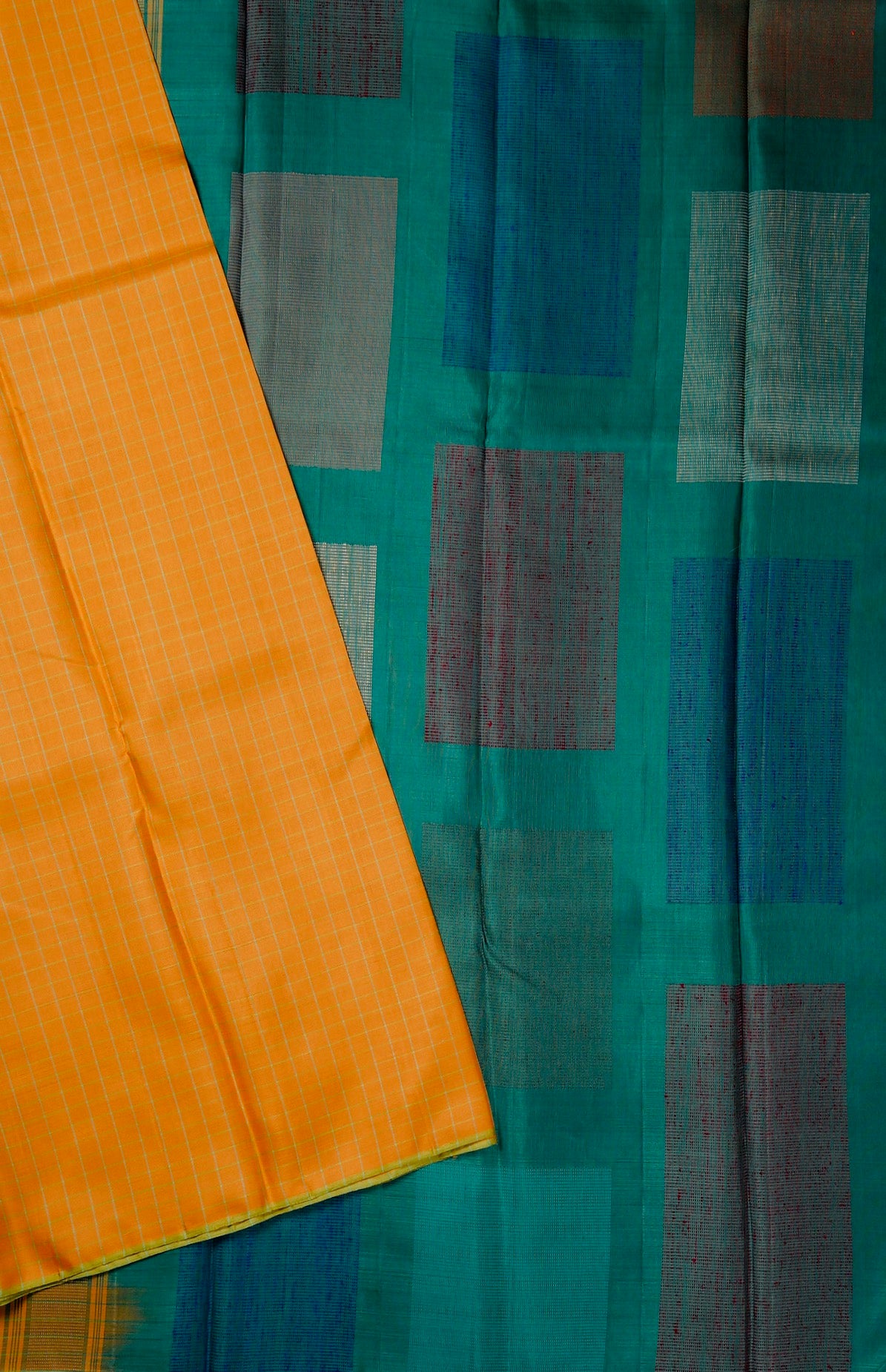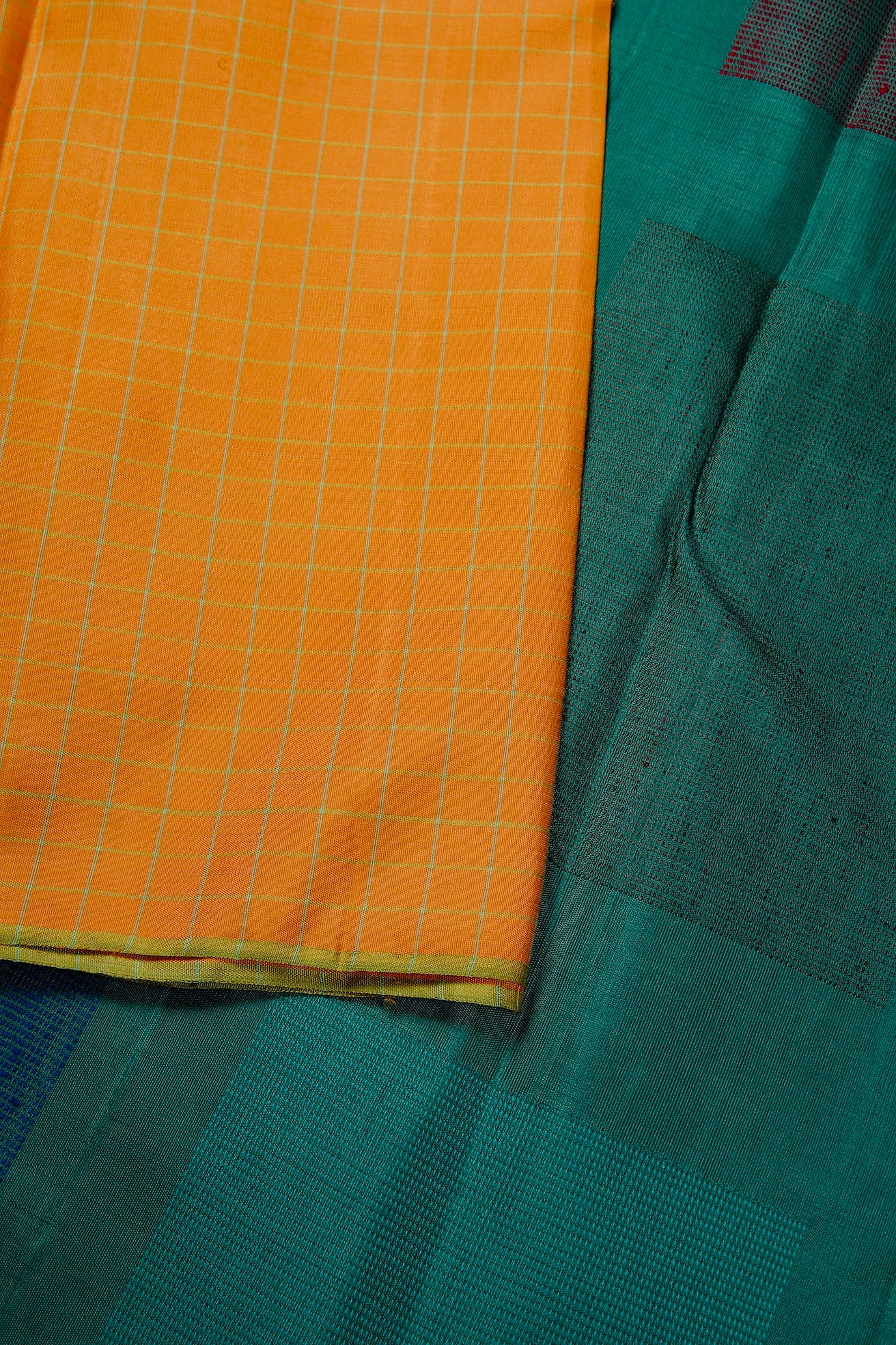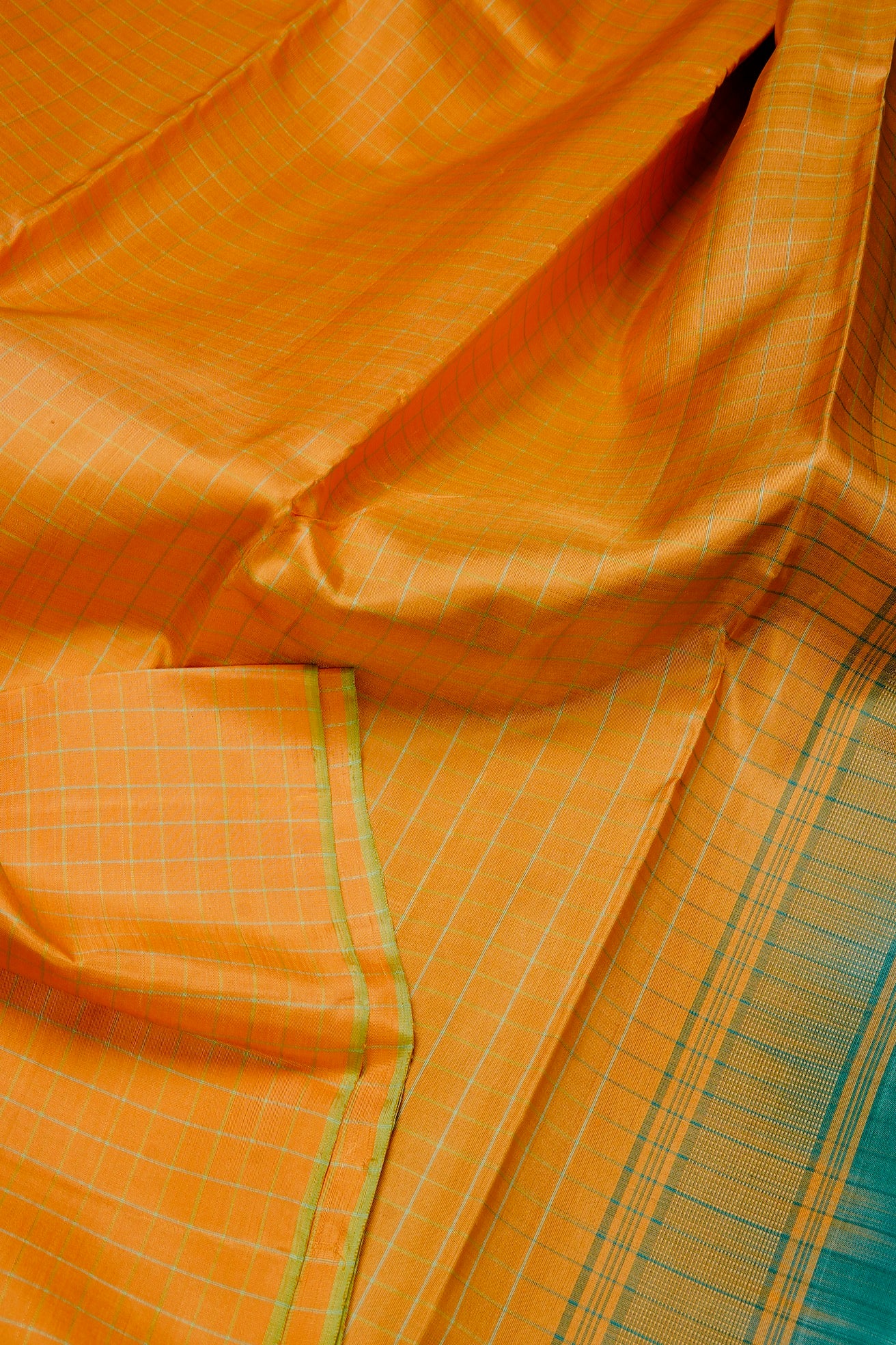 Cantaloupe orange Kanchipuram Silk Saree with checks woven in gold zari. The pallu has a peacock green base with rectangles woven in different colors including silver, grey, blue and maroon. The saree has a plain peacock green blouse.