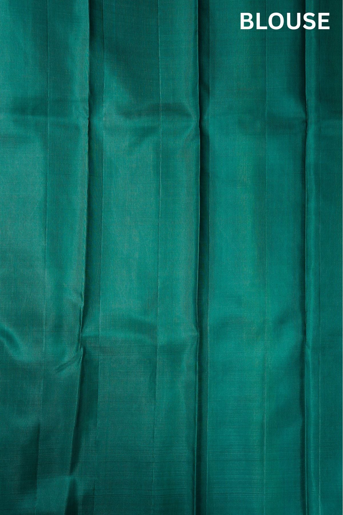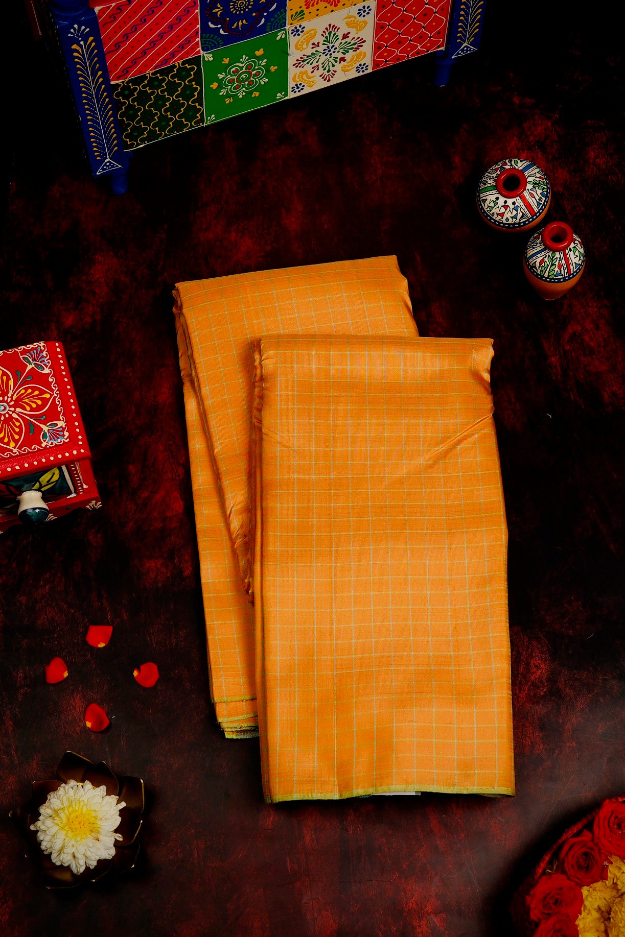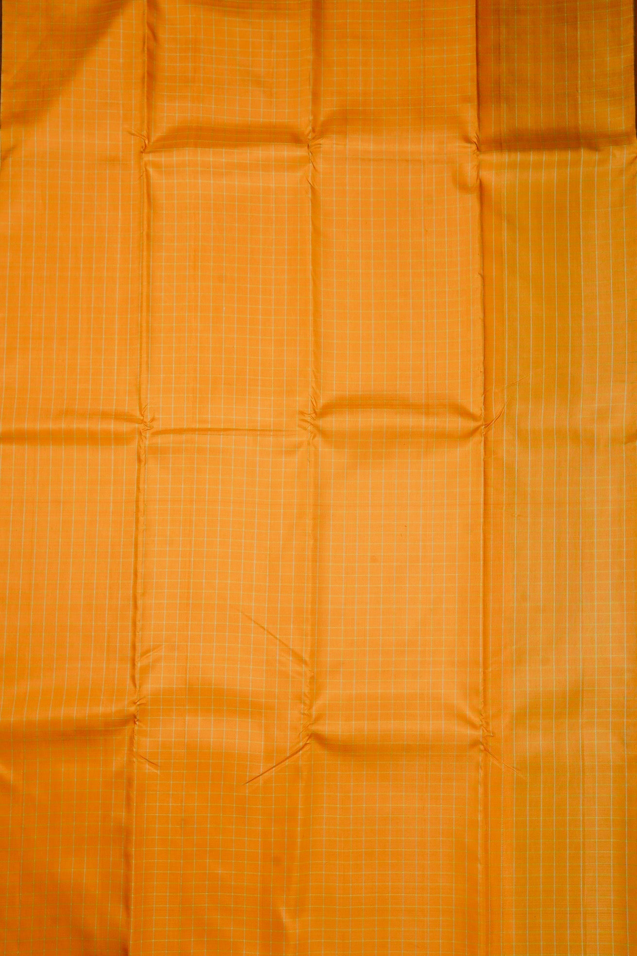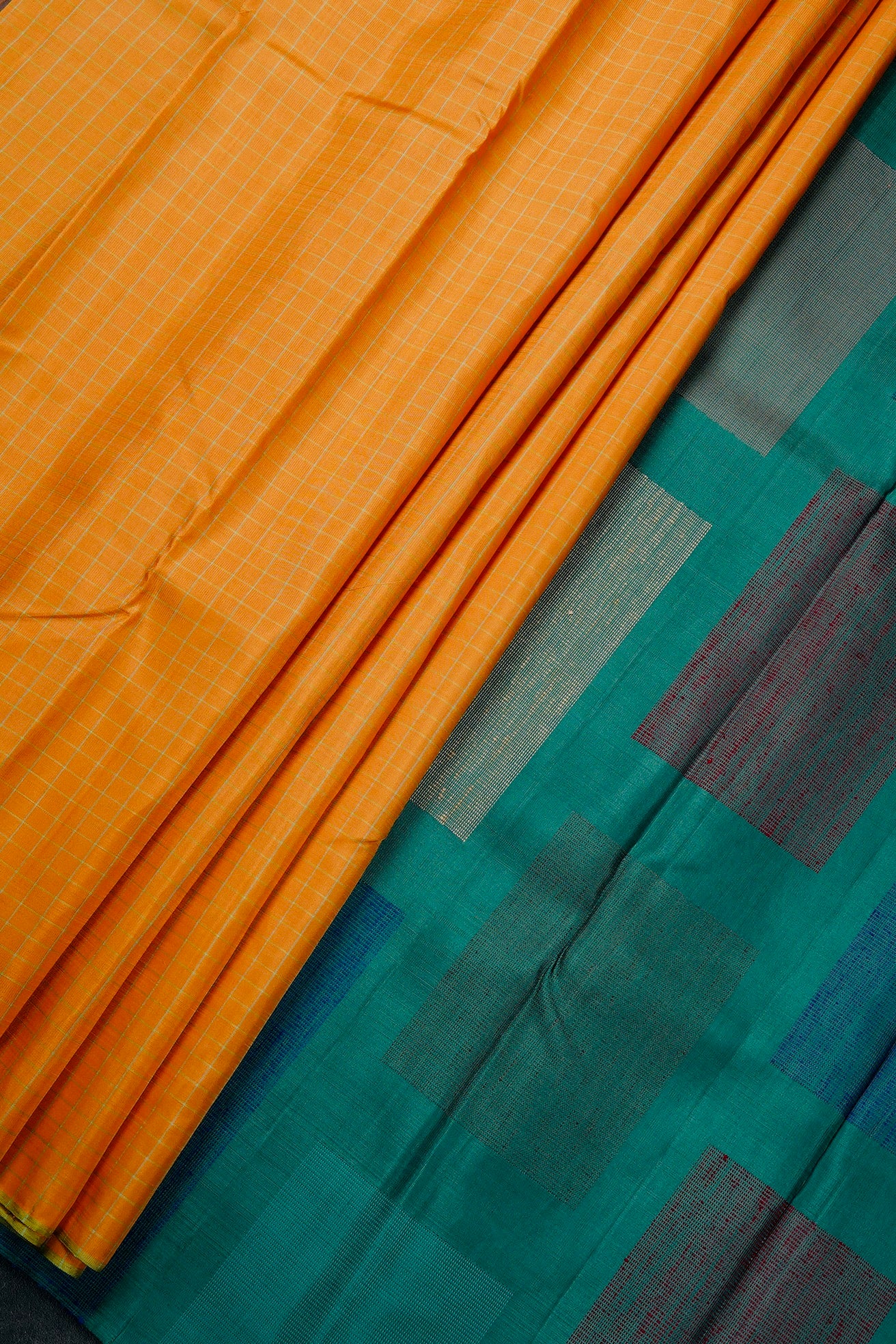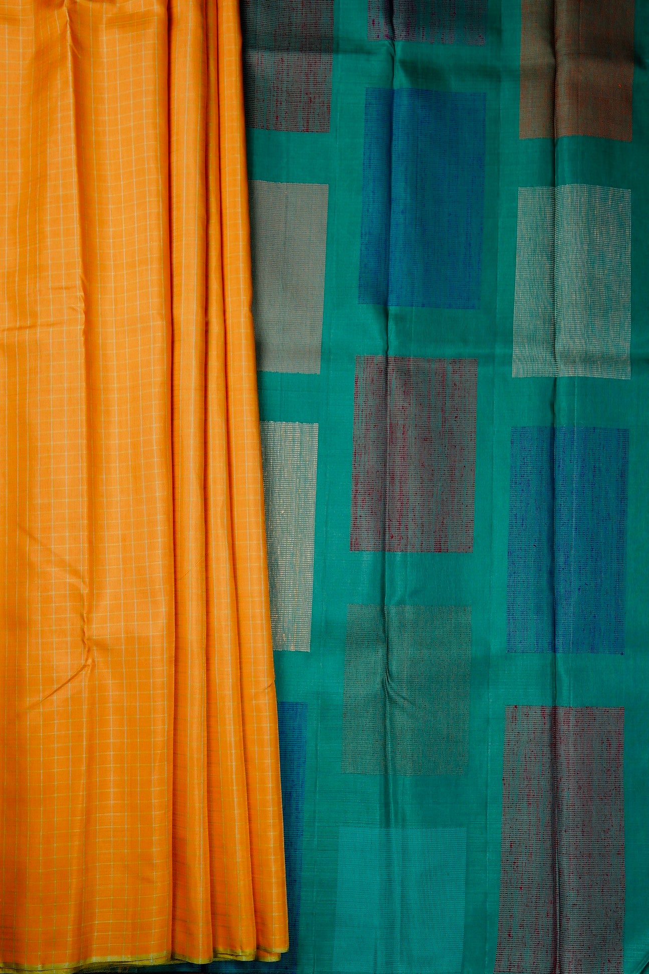 Cantaloupe orange Kanchipuram Silk Saree with checks woven in gold zari. The pallu has a peacock green base with rectangles woven in different colors including silver, grey, blue and maroon. The saree has a plain peacock green blouse.