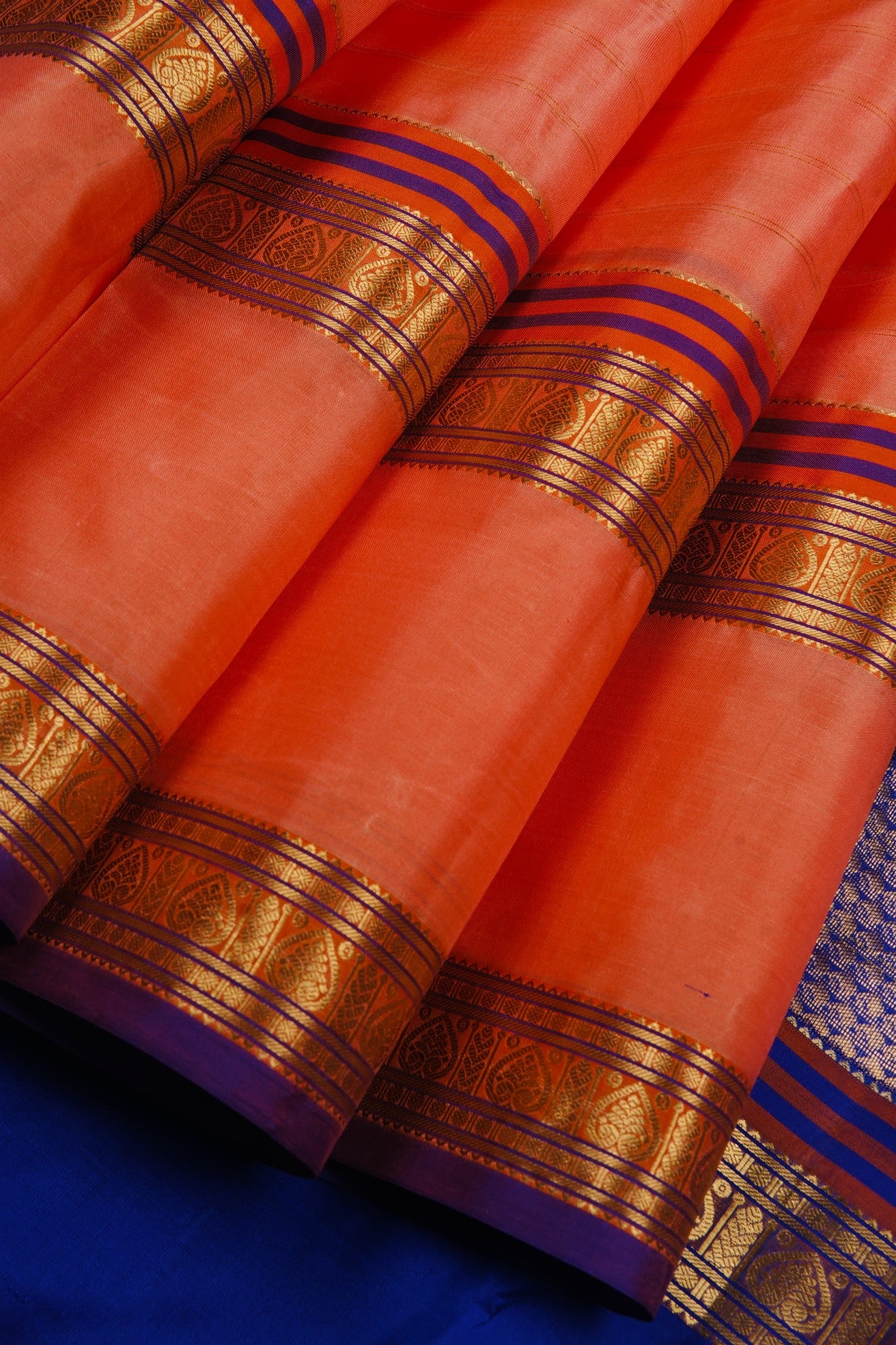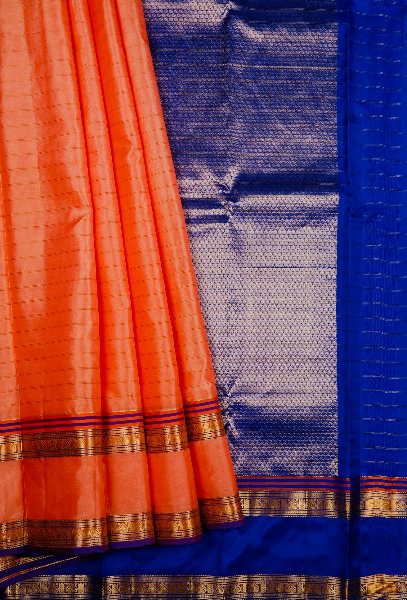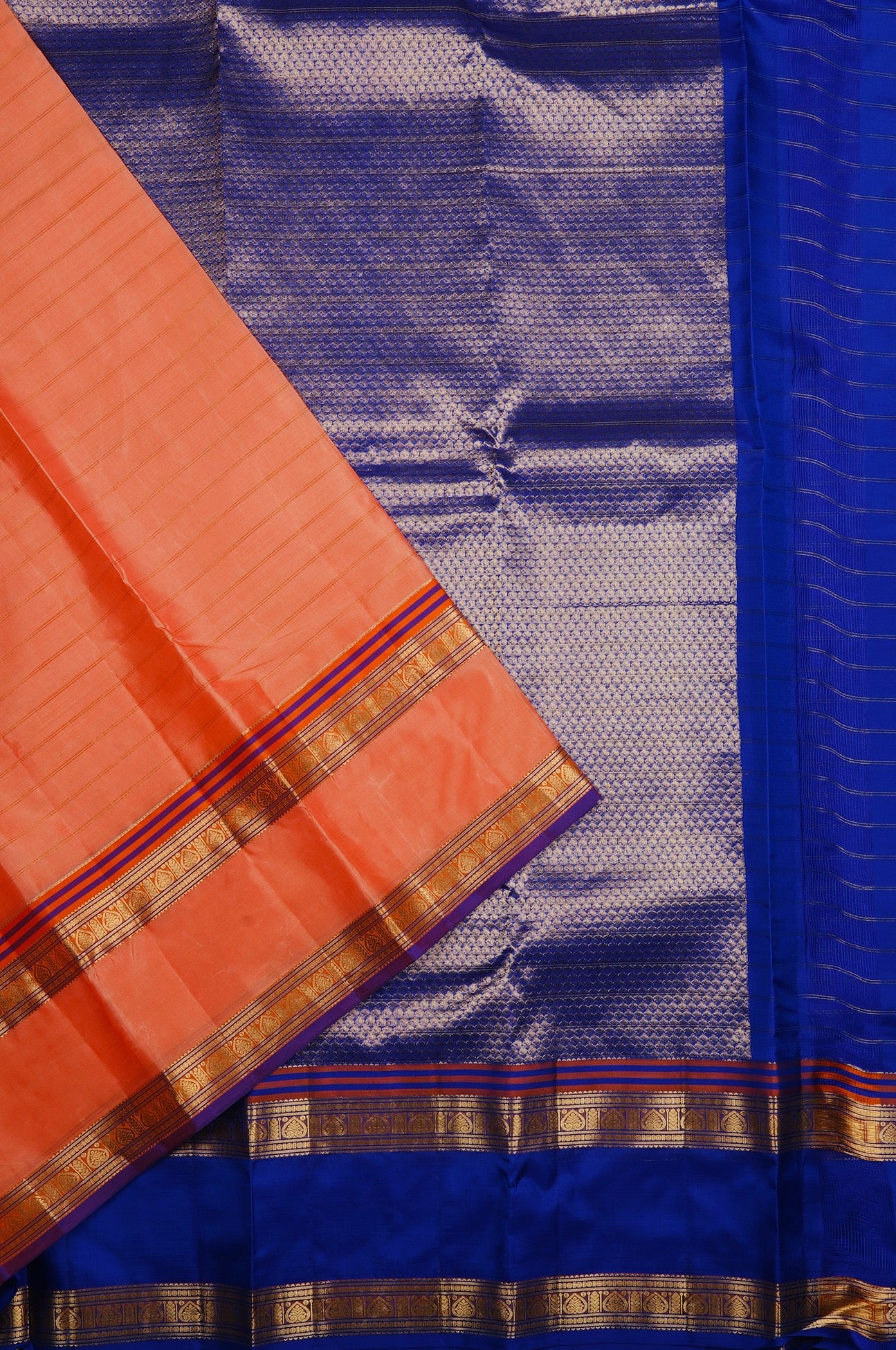 Cantaloupe silk mix saree with ochre double lines running horizontally throughout the body. The border starts of with bands of gold, orange and royal blue, leading to a small band of zari motifs portraying a series of dots, lines and a thicker band of thilakam bhuttas with a small expanse of cantaloupe in between the zari works. The pallu has a royal blue base with an intricate and rich zari pattern followed by horizontal zari lines. The saree has a royal blue blouse with horizontal zari lines and the same border.