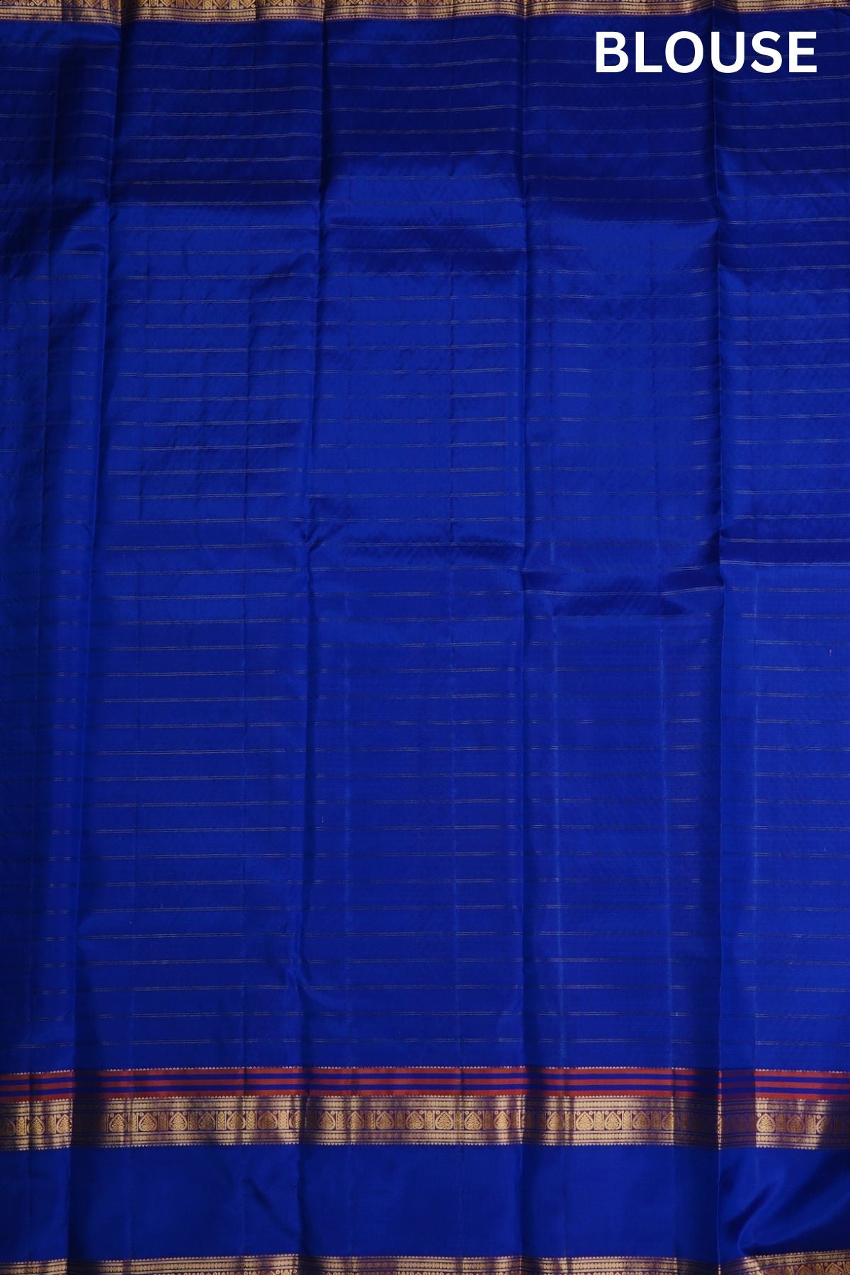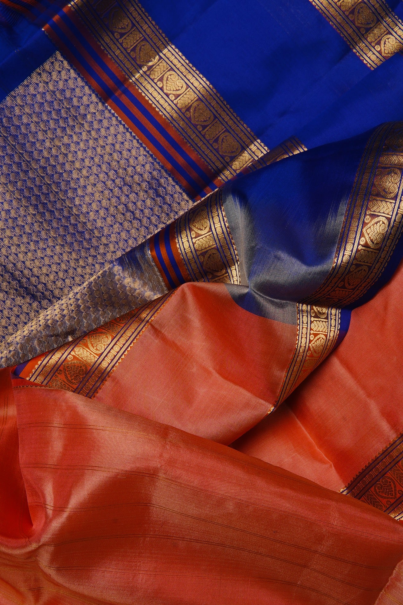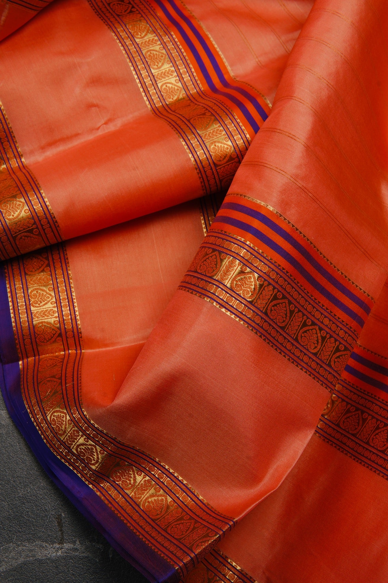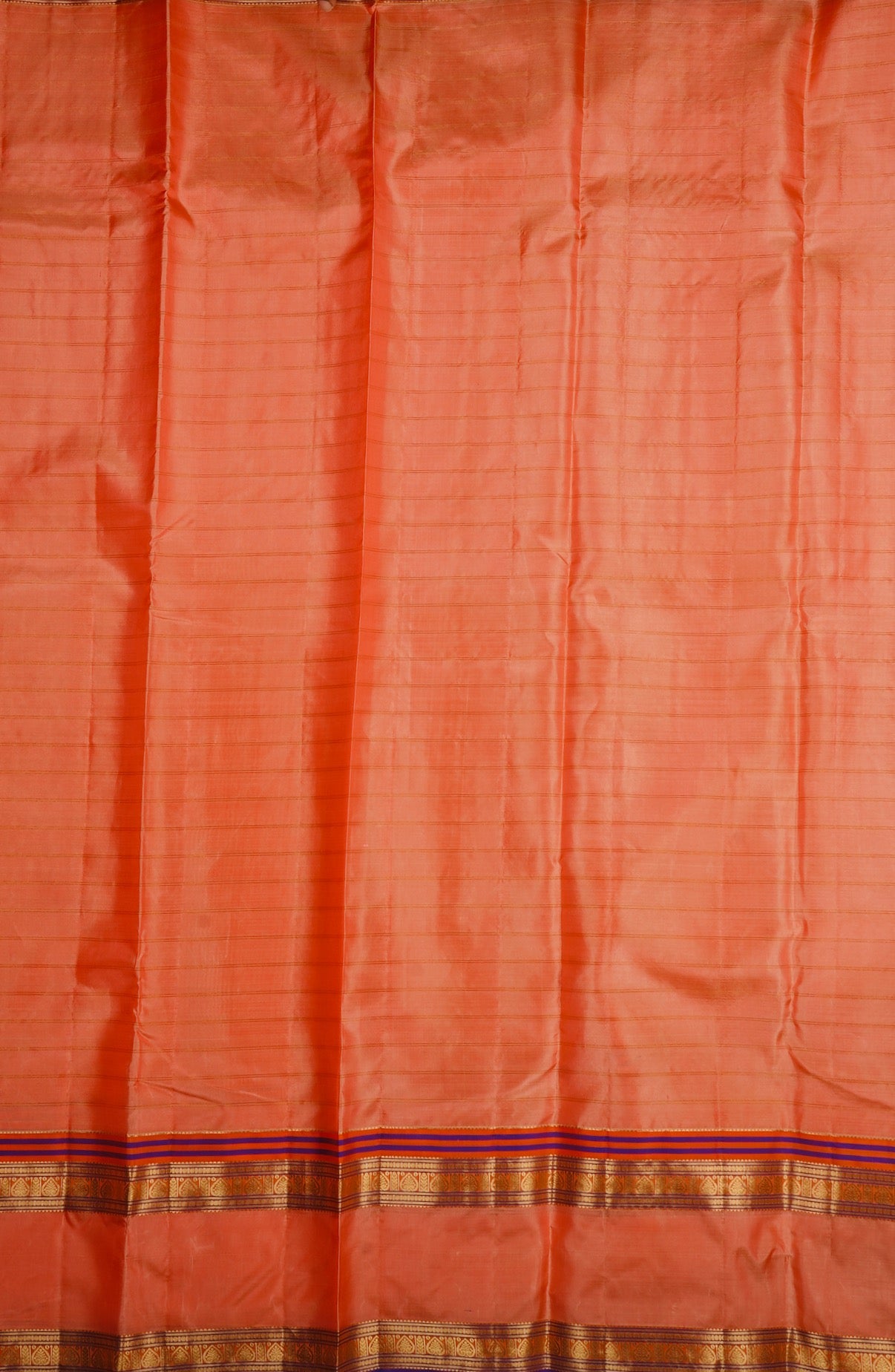 Cantaloupe silk mix saree with ochre double lines running horizontally throughout the body. The border starts of with bands of gold, orange and royal blue, leading to a small band of zari motifs portraying a series of dots, lines and a thicker band of thilakam bhuttas with a small expanse of cantaloupe in between the zari works. The pallu has a royal blue base with an intricate and rich zari pattern followed by horizontal zari lines. The saree has a royal blue blouse with horizontal zari lines and the same border.
