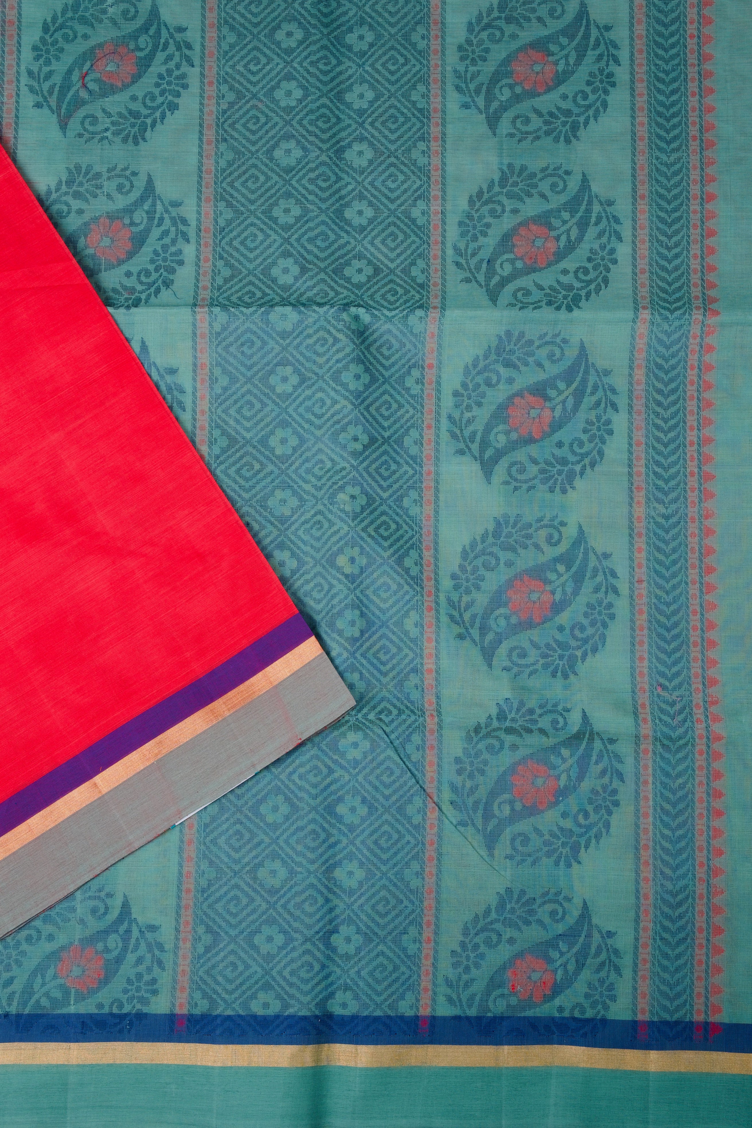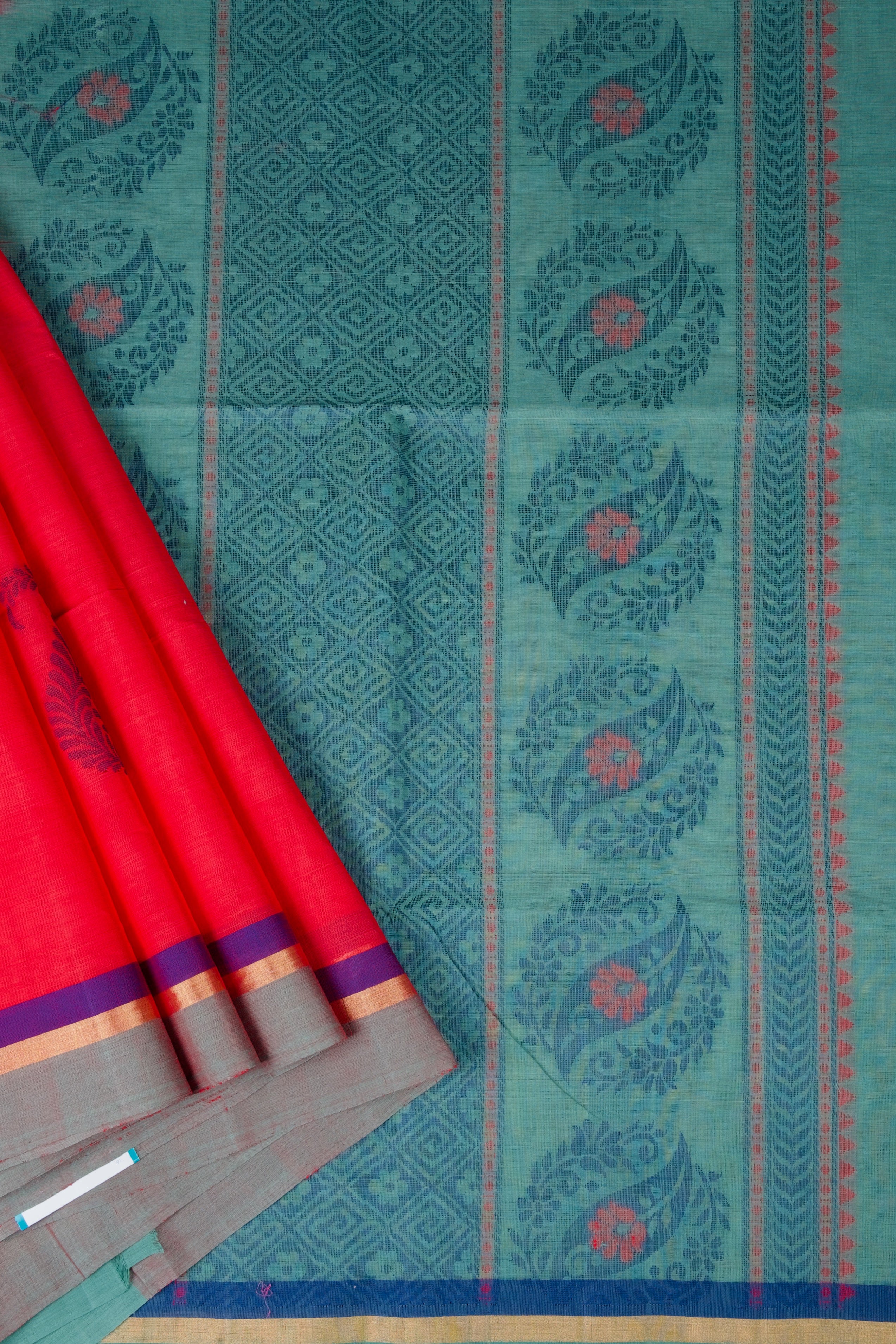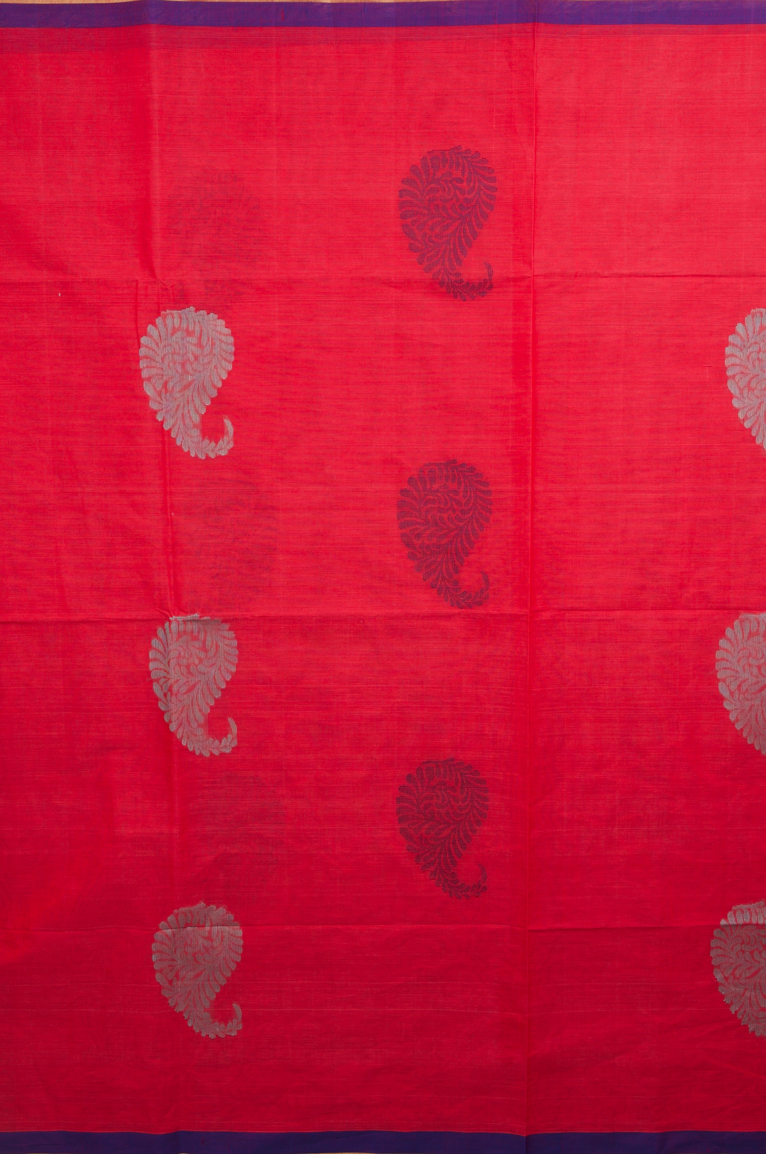 A cherry red cotton saree with violet and silver mango buttas spread throughout the body. The border is a plain violet self border with a band of gold zari. The saree has a dull teal pallu with a wide range of motifs including leaves, flowers and geometric patterns woven in dark teal blue and cherry red. It has a plain teal blouse with navy blue and gold zari bands in the border.