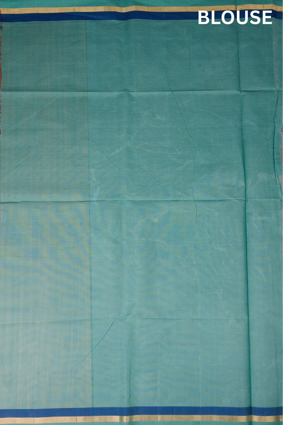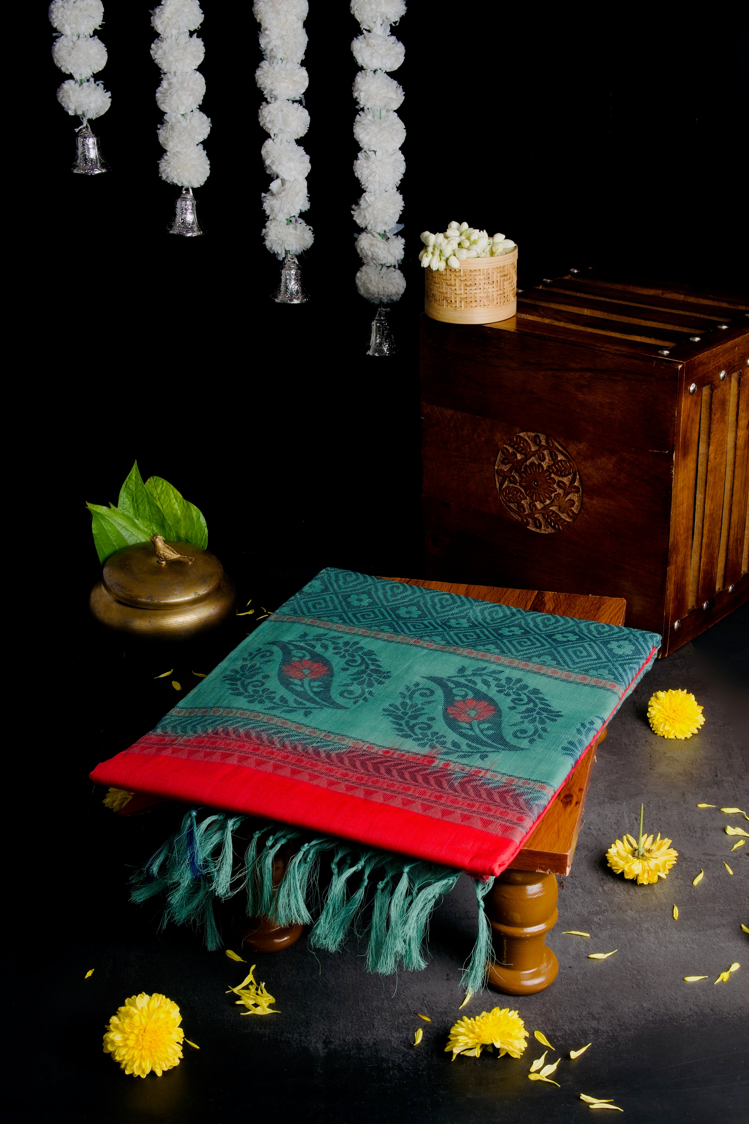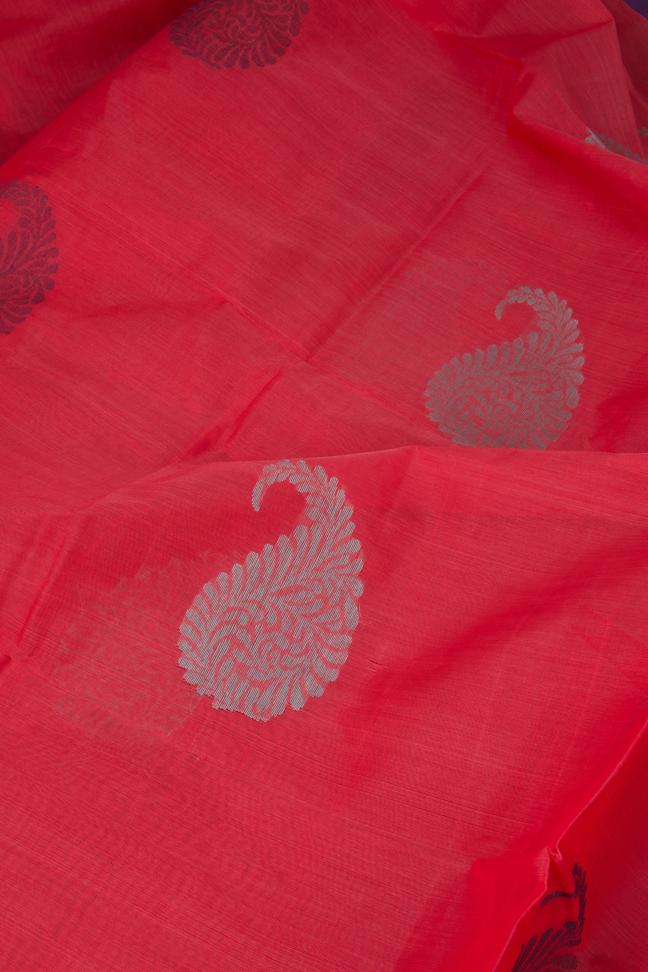 A cherry red cotton saree with violet and silver mango buttas spread throughout the body. The border is a plain violet self border with a band of gold zari. The saree has a dull teal pallu with a wide range of motifs including leaves, flowers and geometric patterns woven in dark teal blue and cherry red. It has a plain teal blouse with navy blue and gold zari bands in the border.
