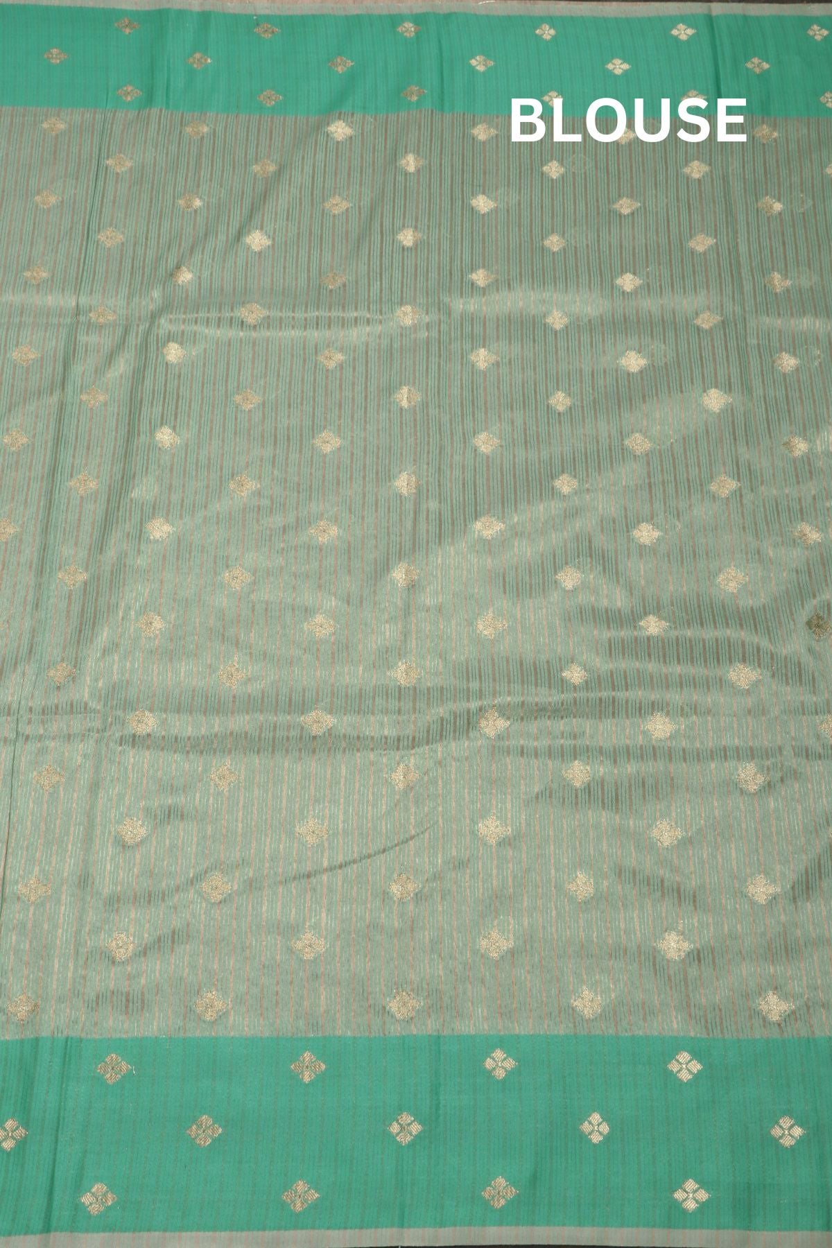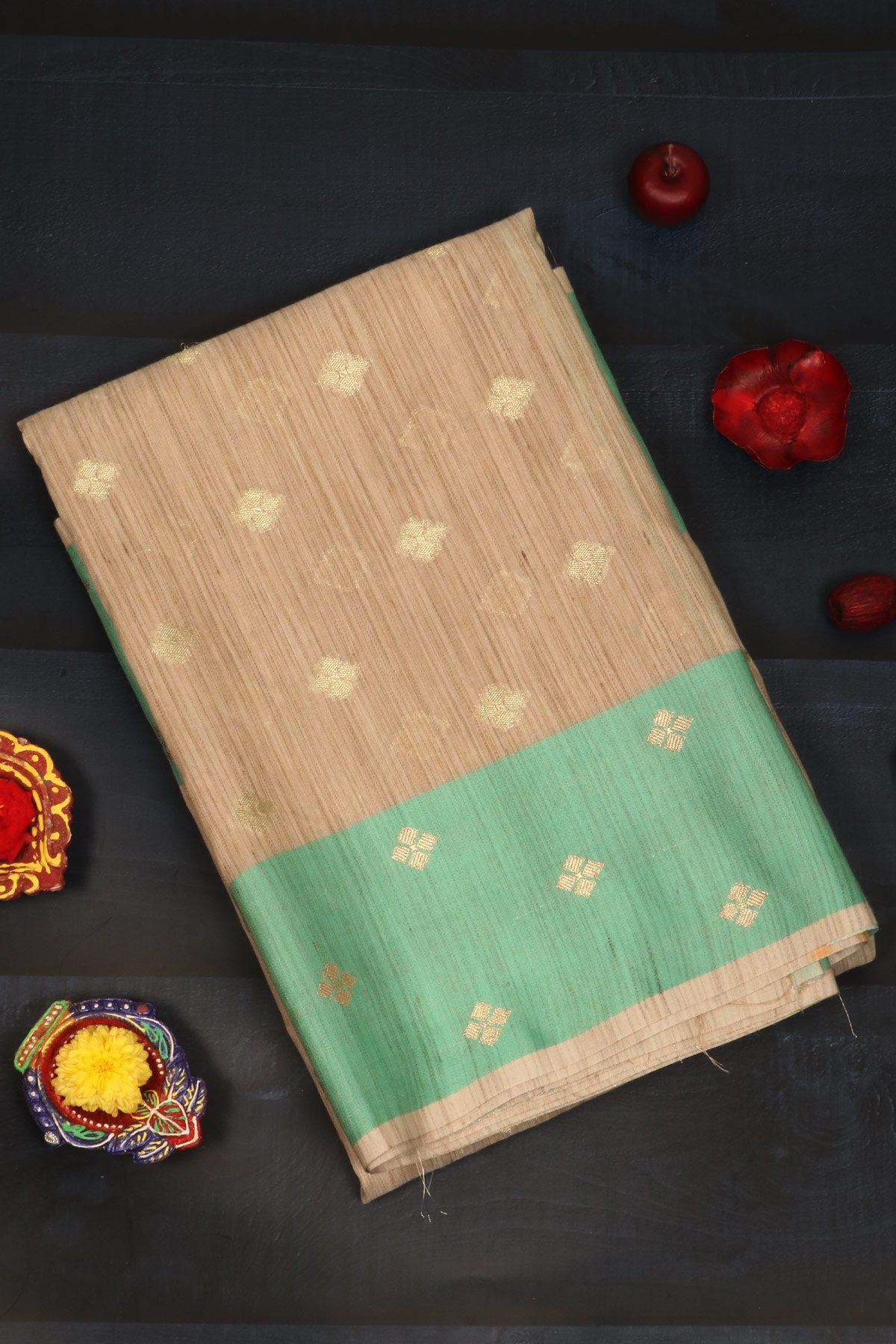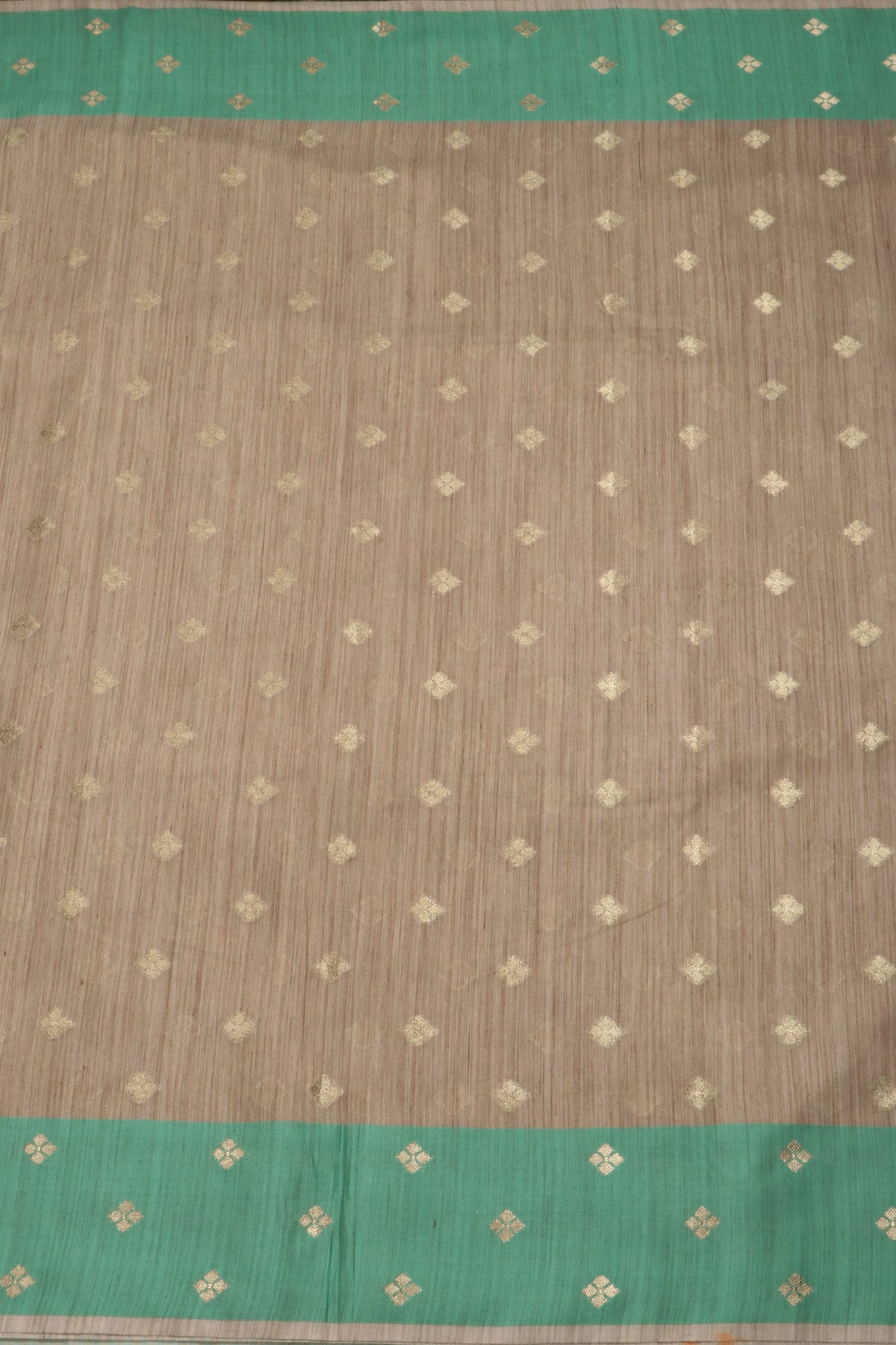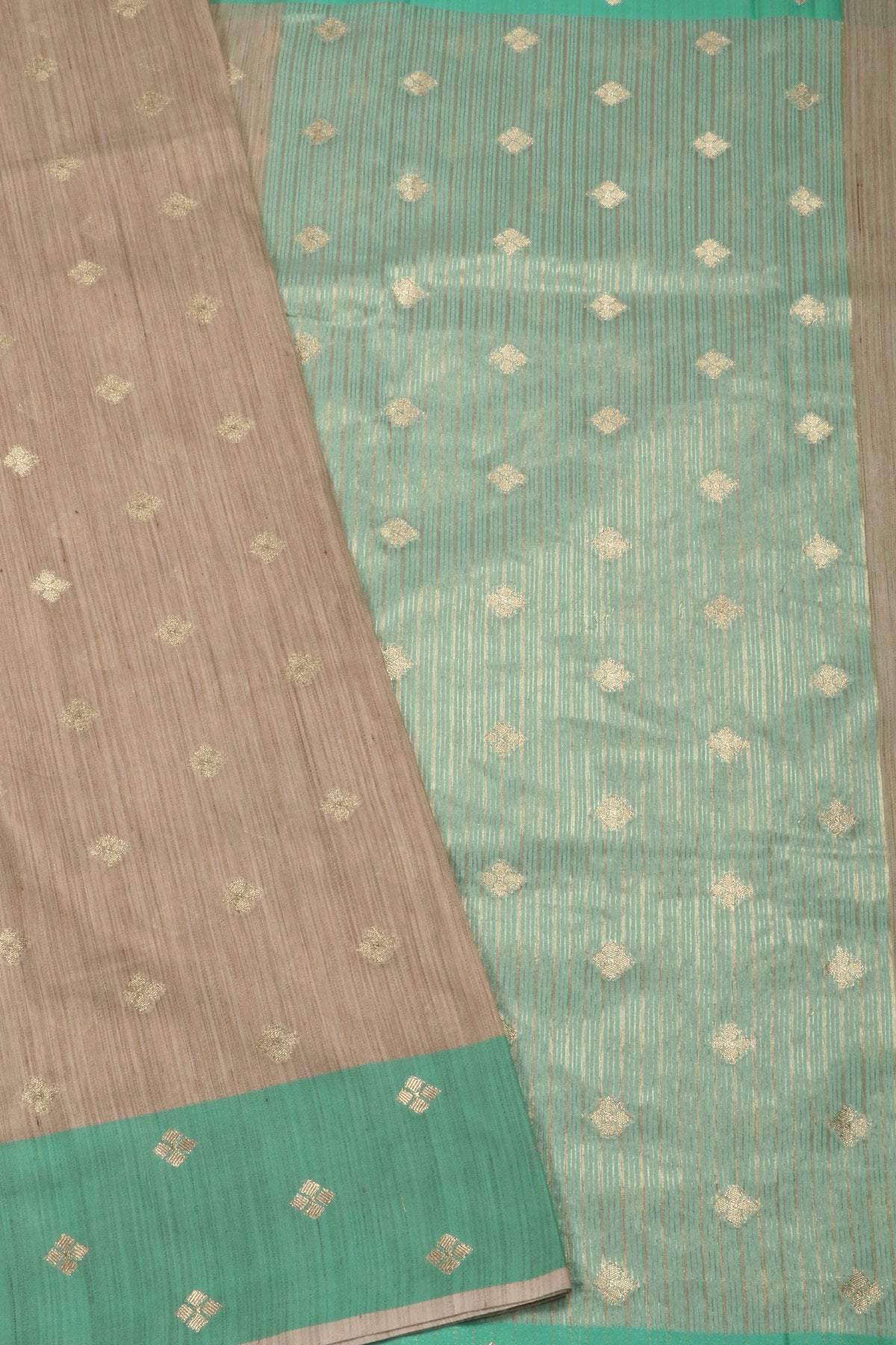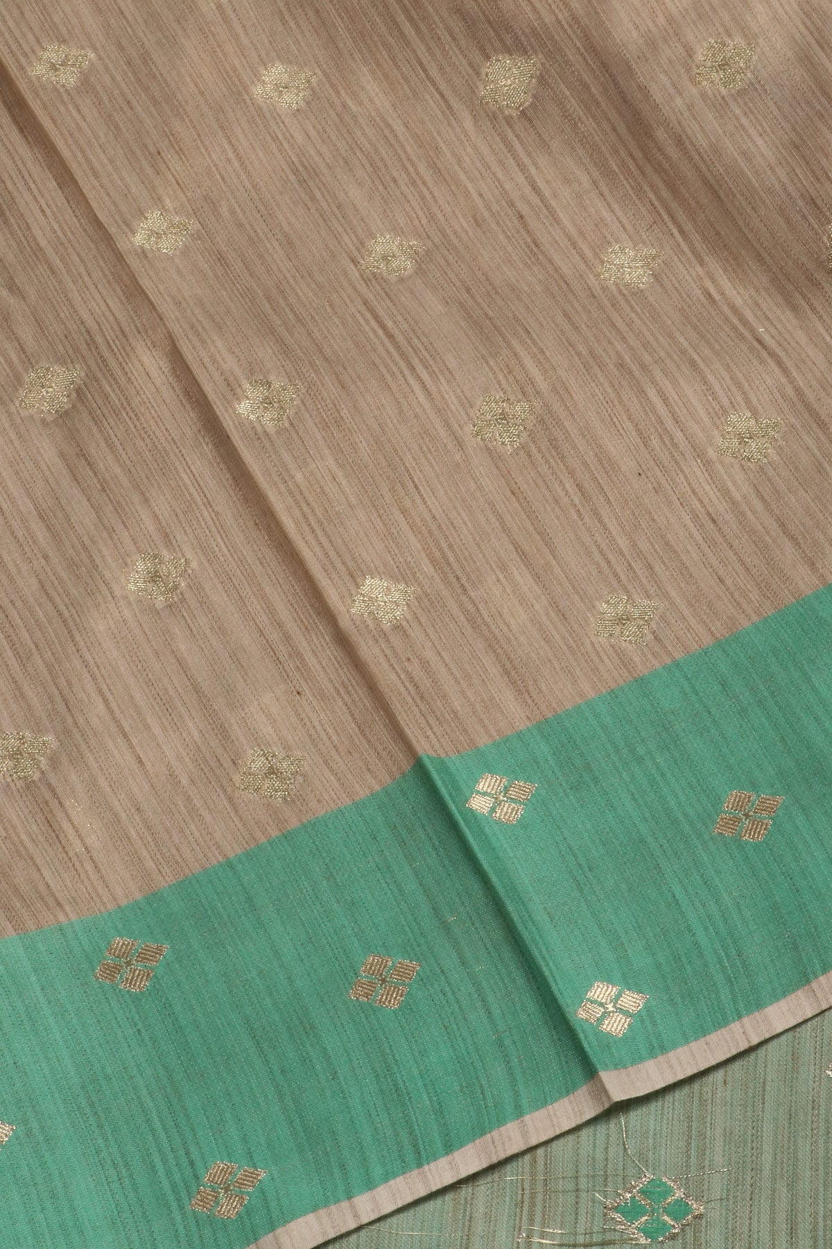 Chiku coloured semi tussar saree, paired with a mint green border. The body, border and pallu carry "Bhottu" bhutties in gold zari.