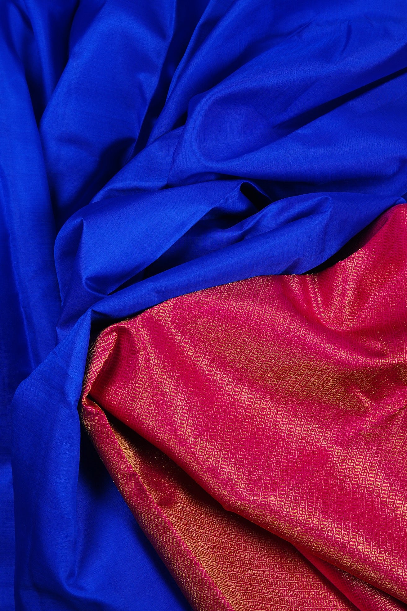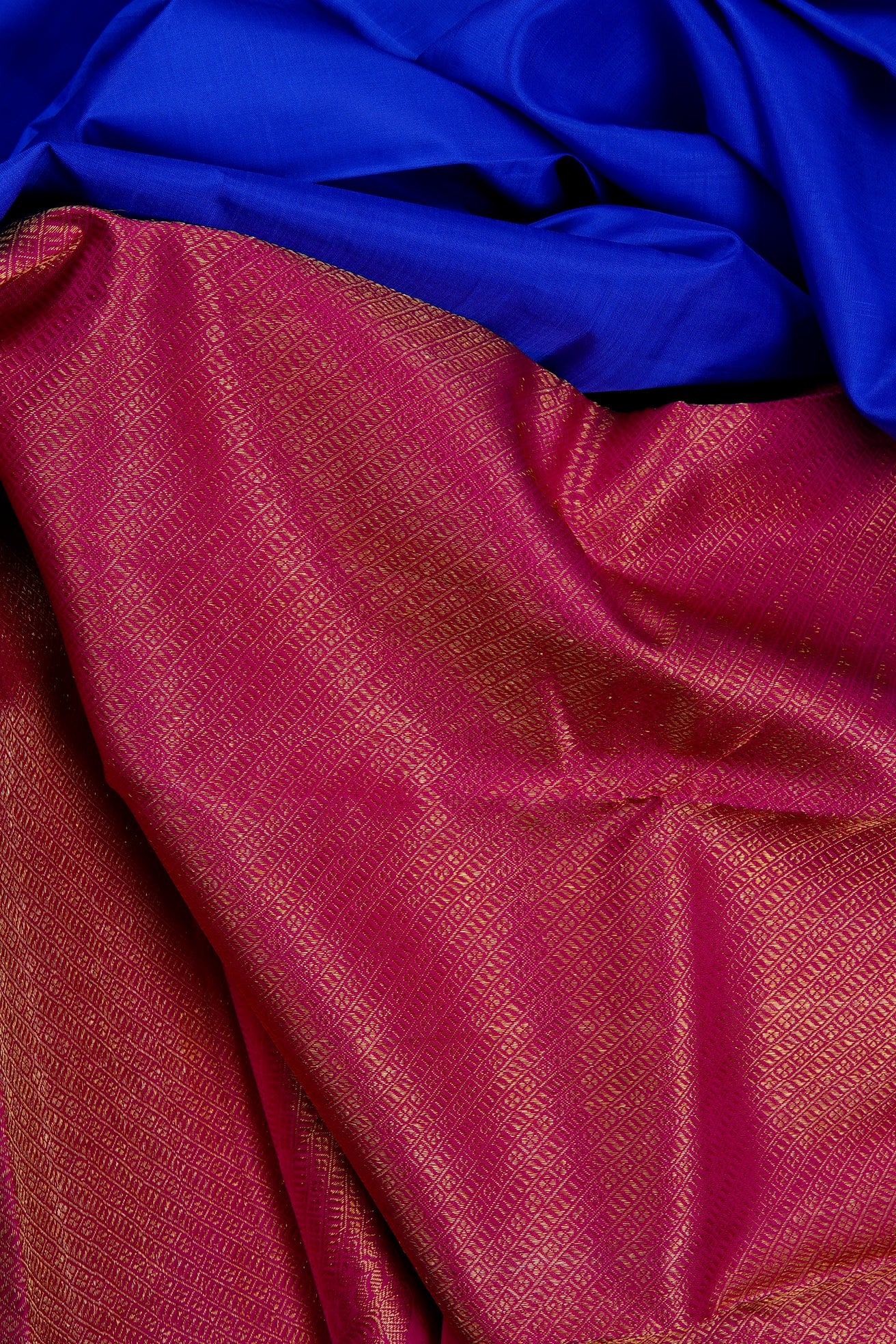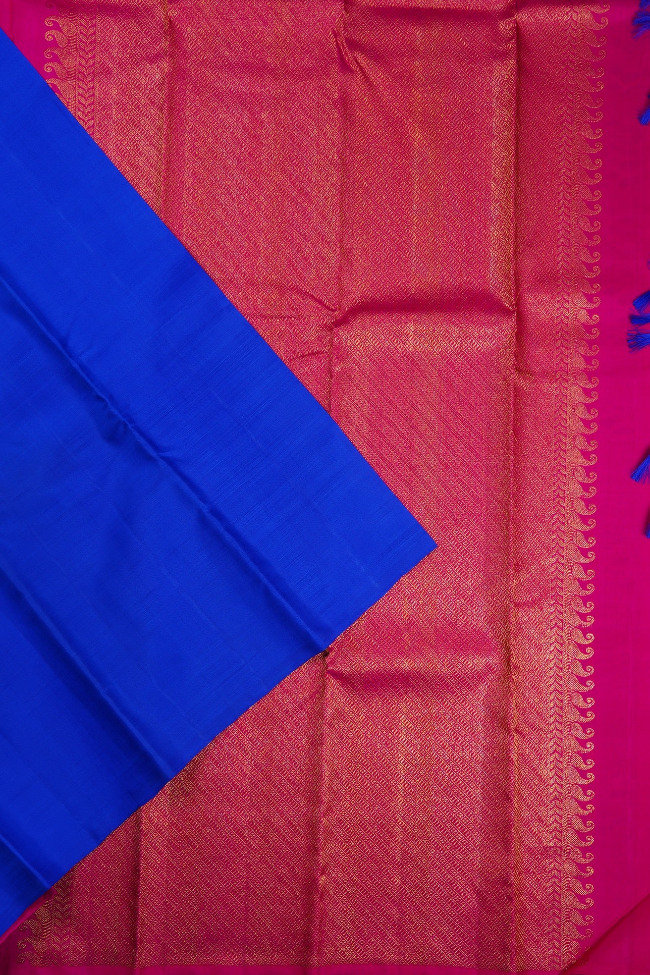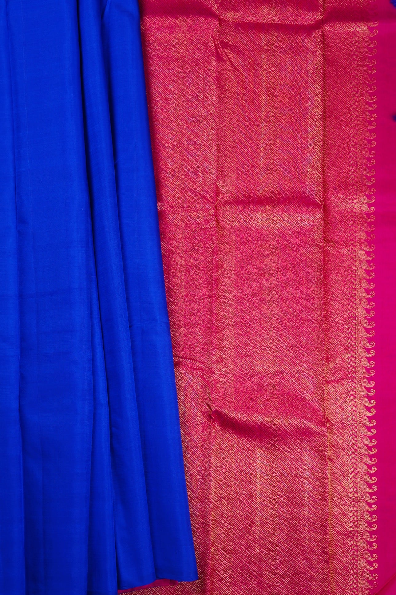 Solid cobalt blue Kanchipuram Silk Saree with a fuchsia pallu woven with intricate diagonal bands with alternating stripe motifs, followed by a band of leafs and a band of mango bhuttas woven in gold zari. The saree has a plain fuchsia blouse.