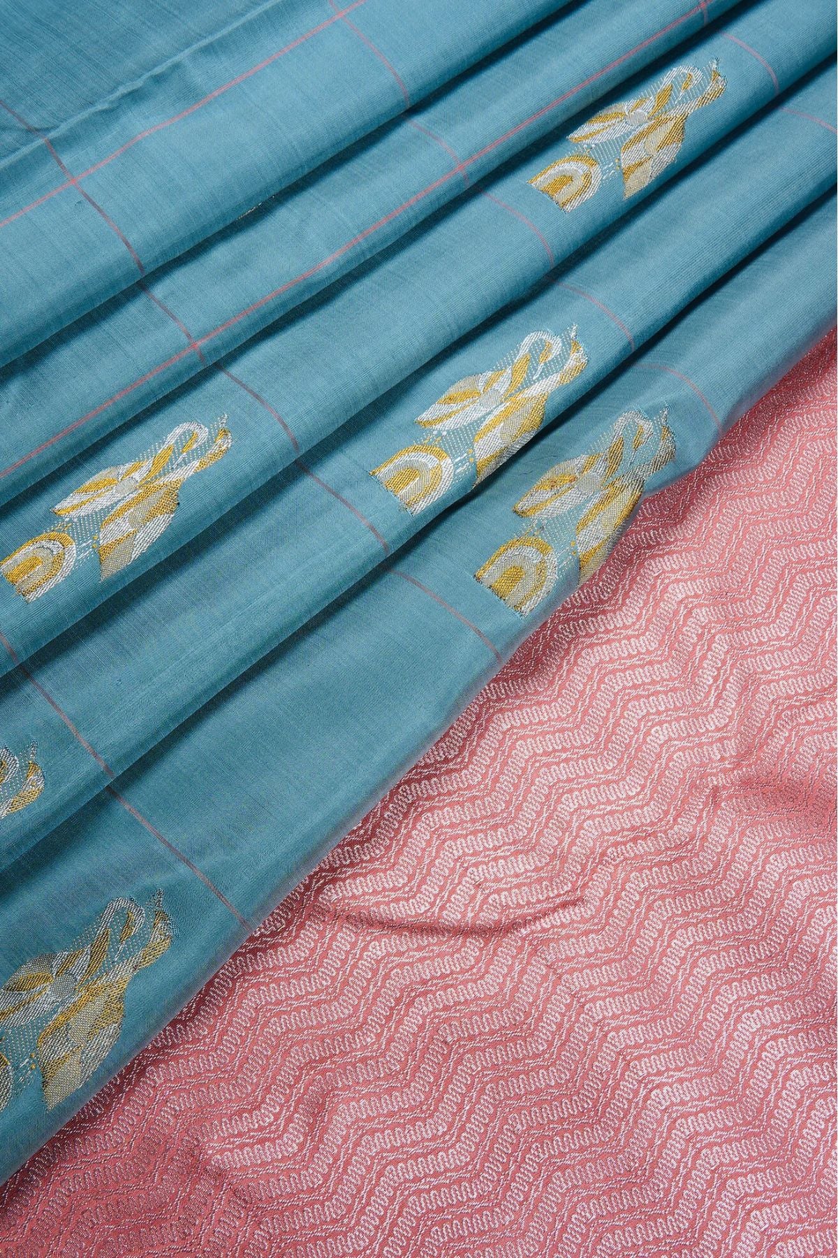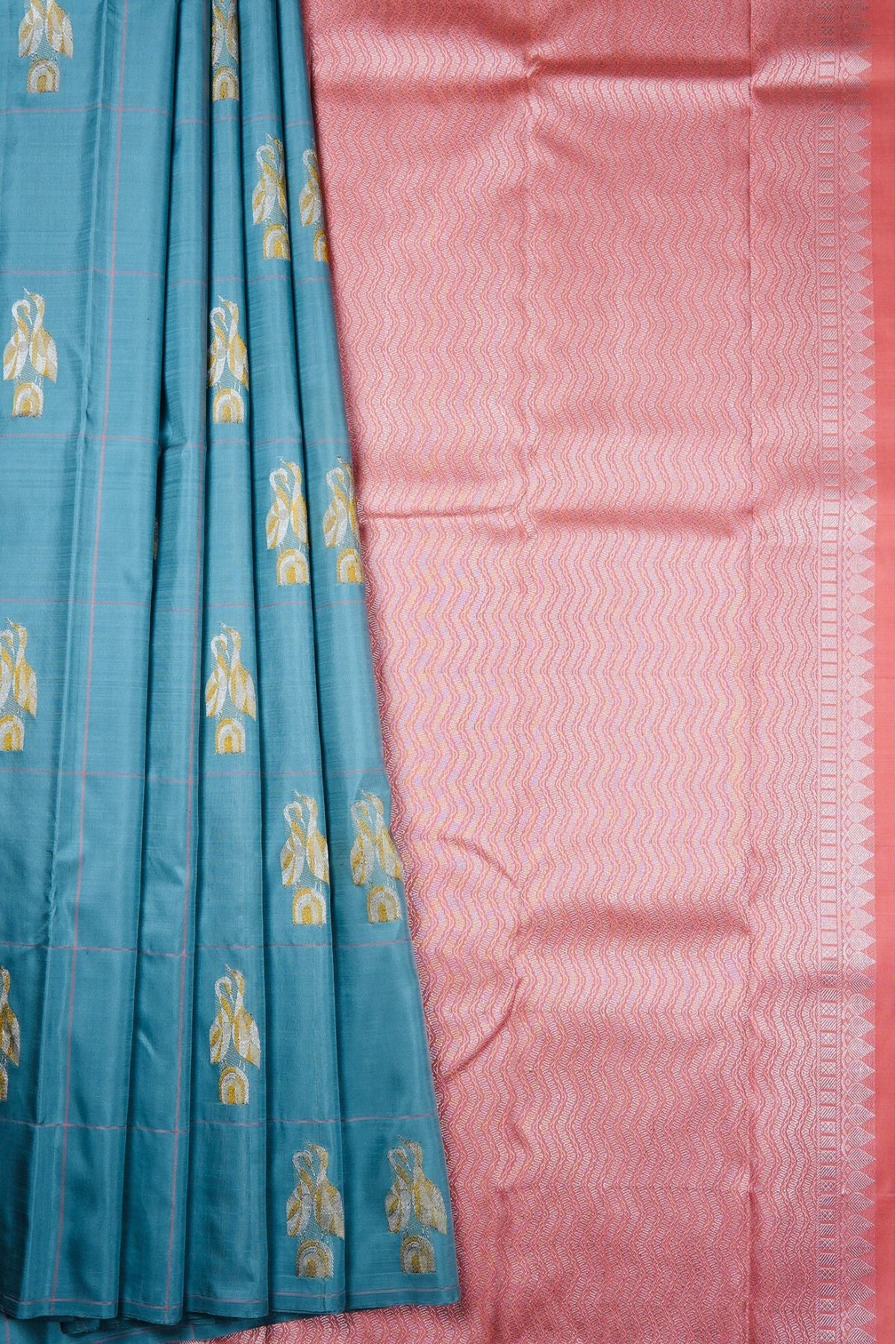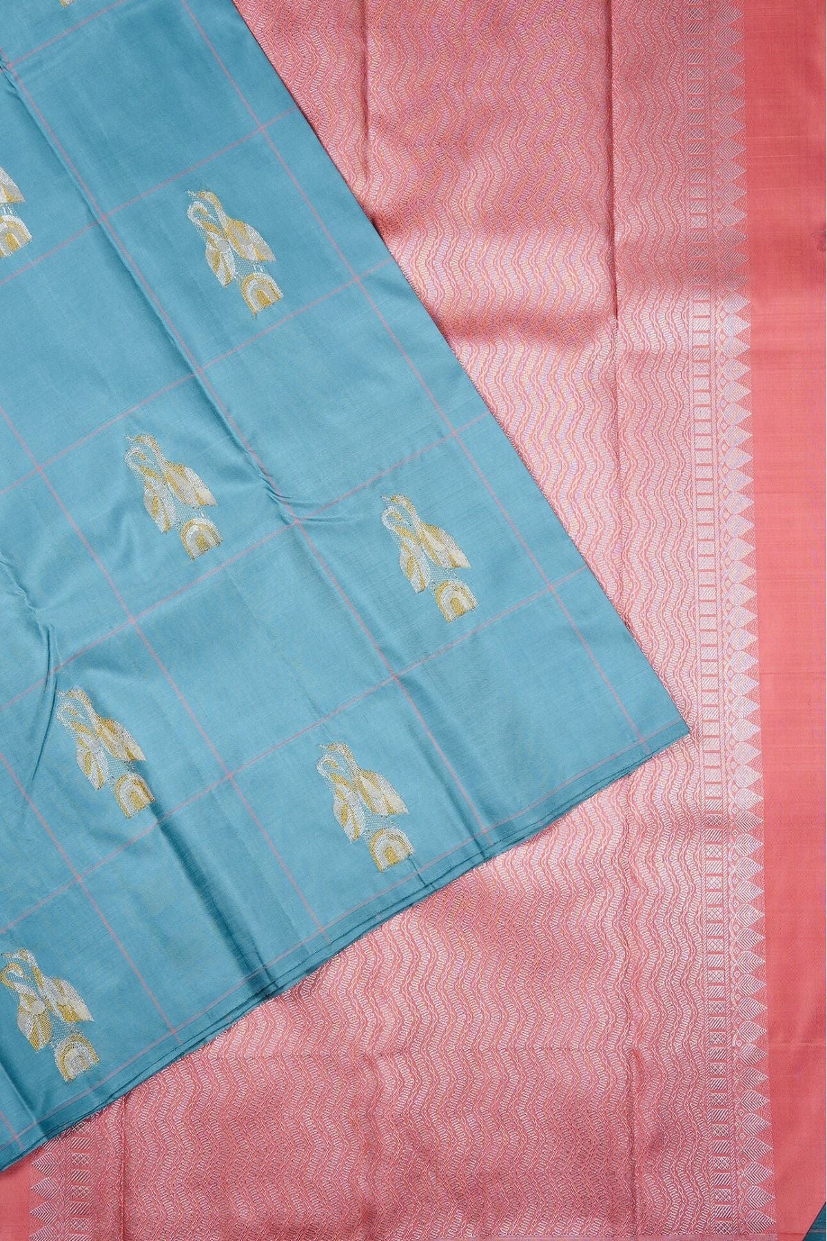 Cornflower blue Kanchipuram Silk Saree with broad checks woven in blush pink threads and motifs resembling two storks together woven in gold and silver zari. The pallu has a blush pink base with tangled and cruvey lined forming waves throughout woven in gold and silver zari followed by thin bands of stripes and continuous thilakam bhuttas woven in silver zari. The saree has a plain blush pink blouse.