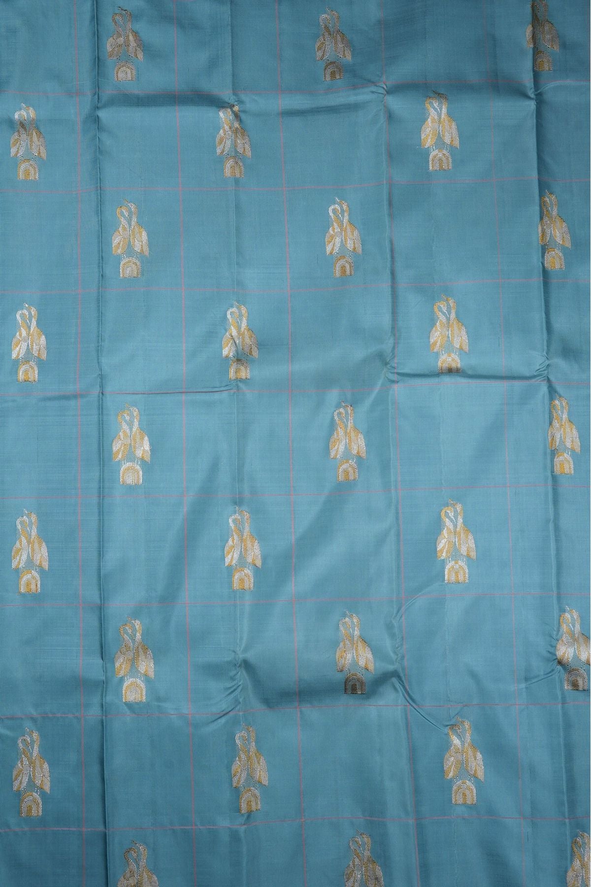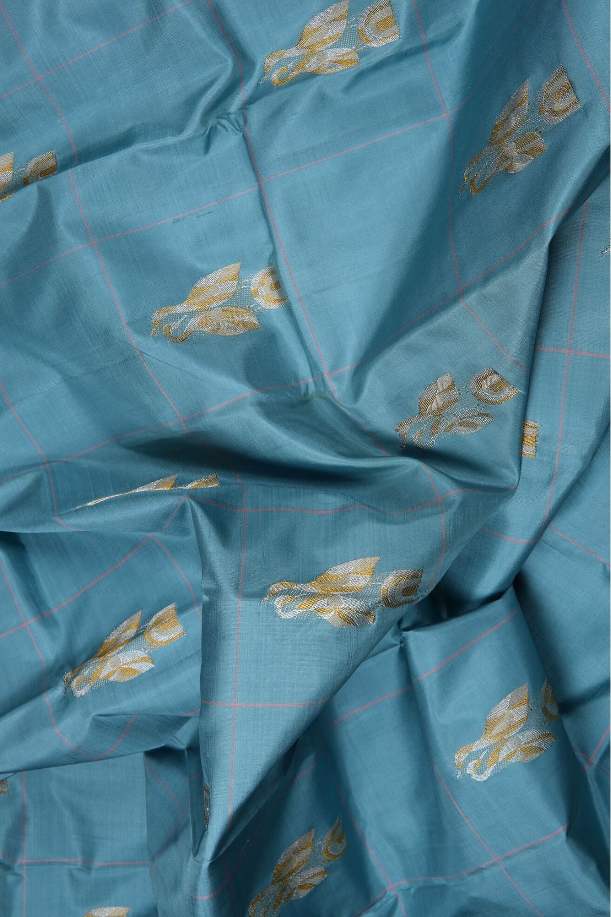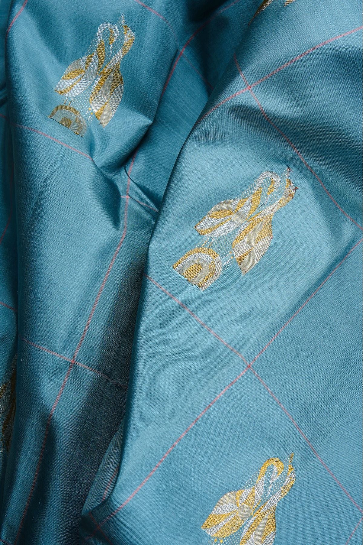 Cornflower blue Kanchipuram Silk Saree with broad checks woven in blush pink threads and motifs resembling two storks together woven in gold and silver zari. The pallu has a blush pink base with tangled and cruvey lined forming waves throughout woven in gold and silver zari followed by thin bands of stripes and continuous thilakam bhuttas woven in silver zari. The saree has a plain blush pink blouse.