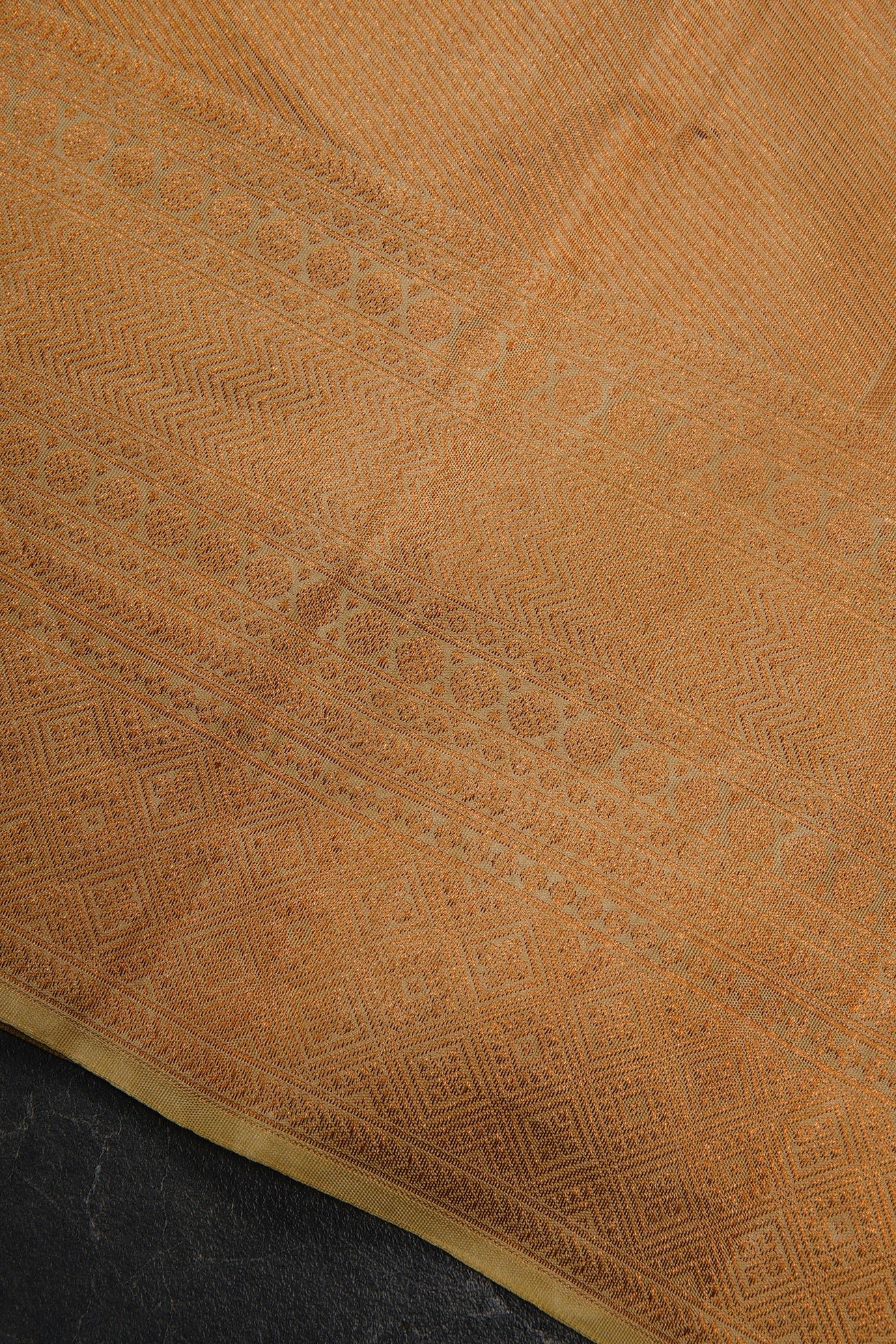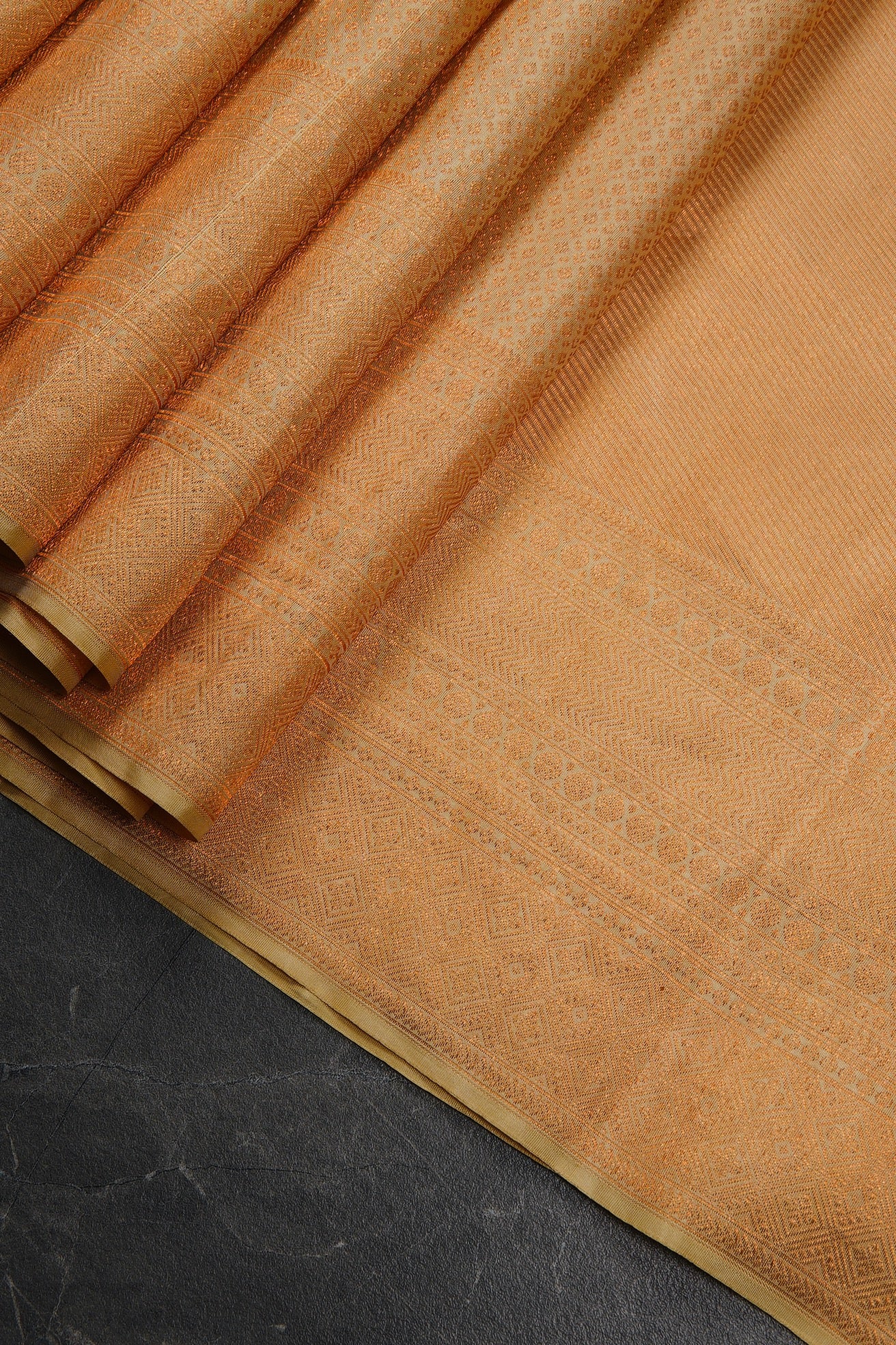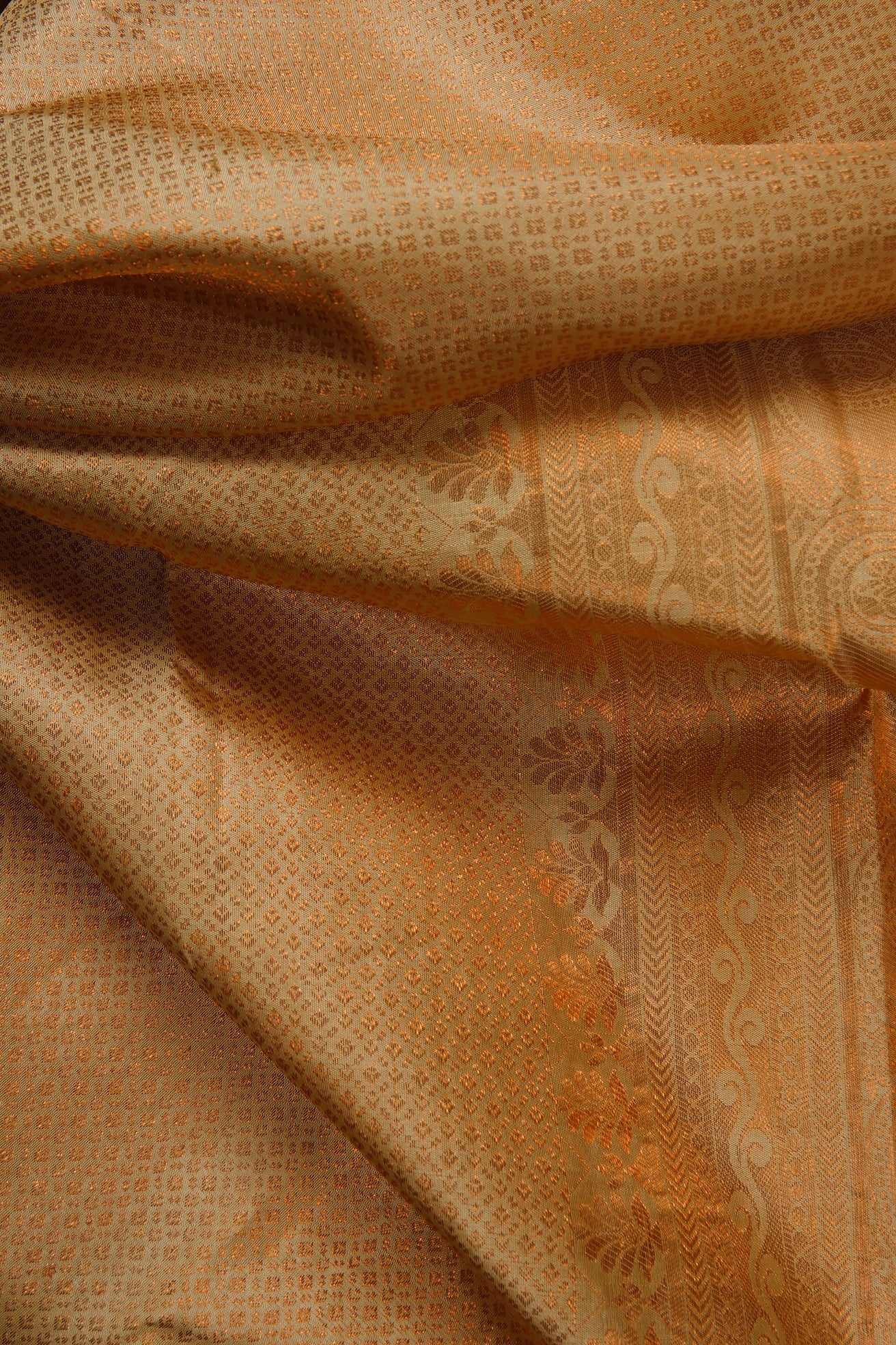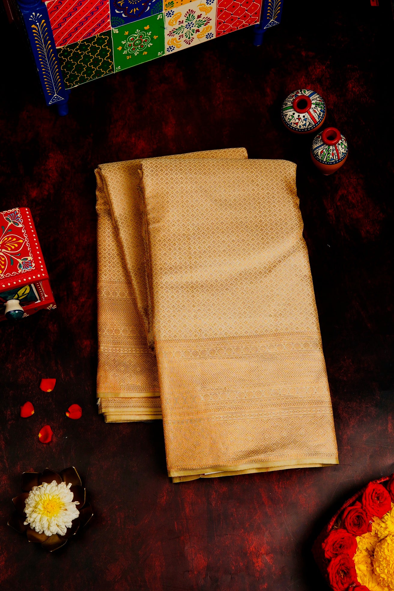 Cream Kanchipuram silk saree with small intricate disconnected diamond motifs woven in bronze zari. The saree has a long border with bands of waves, rudraksham bhuttas, neli patterns followed by a wide band of diamond grids woven in zari. The pallu starts off with a band of kodi pattern, followed by mango bhuttas and floral patterns woven in bronze zari. The saree has a cream blouse filled with small diamond motifs woven in bronze zari and the same border.