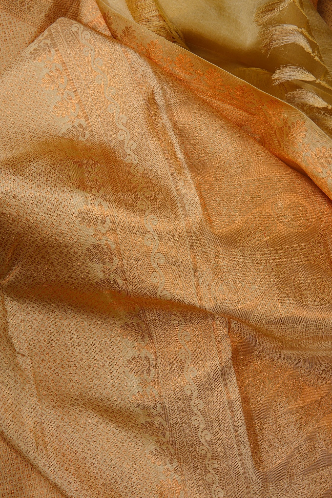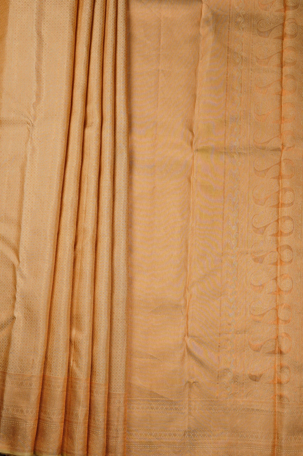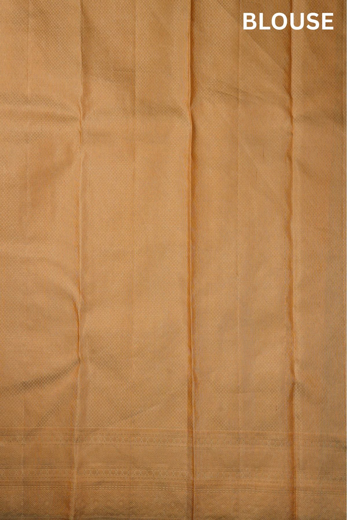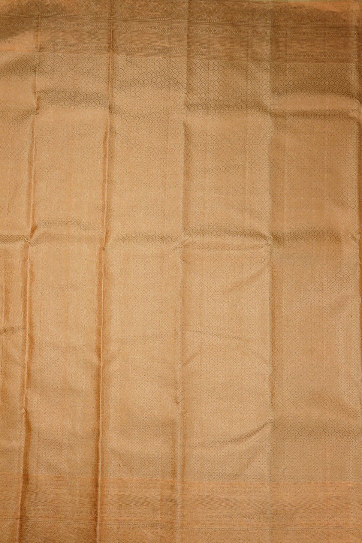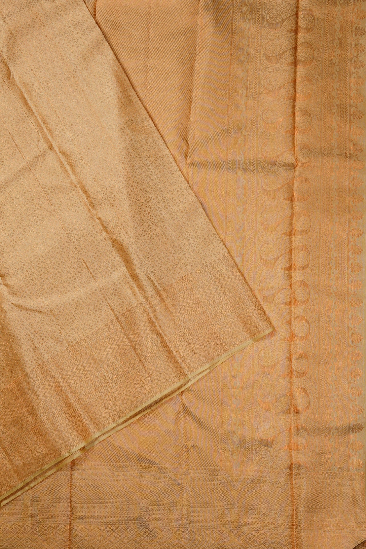 Cream Kanchipuram silk saree with small intricate disconnected diamond motifs woven in bronze zari. The saree has a long border with bands of waves, rudraksham bhuttas, neli patterns followed by a wide band of diamond grids woven in zari. The pallu starts off with a band of kodi pattern, followed by mango bhuttas and floral patterns woven in bronze zari. The saree has a cream blouse filled with small diamond motifs woven in bronze zari and the same border.