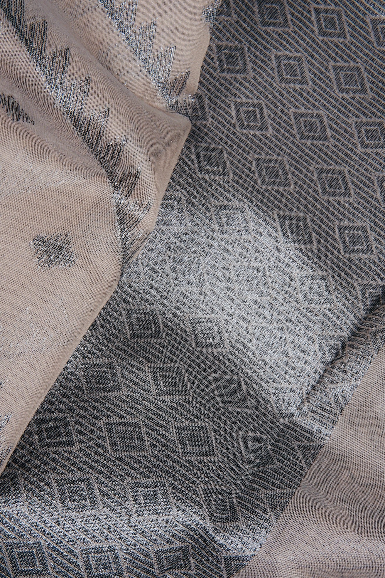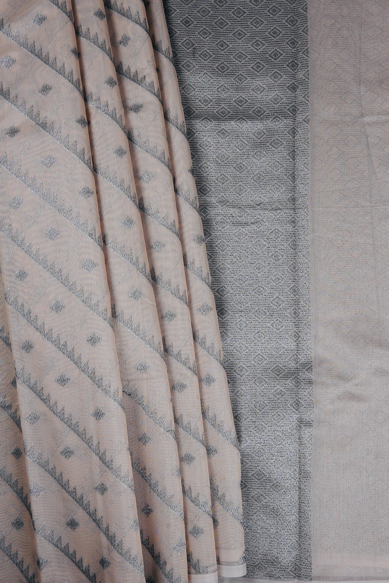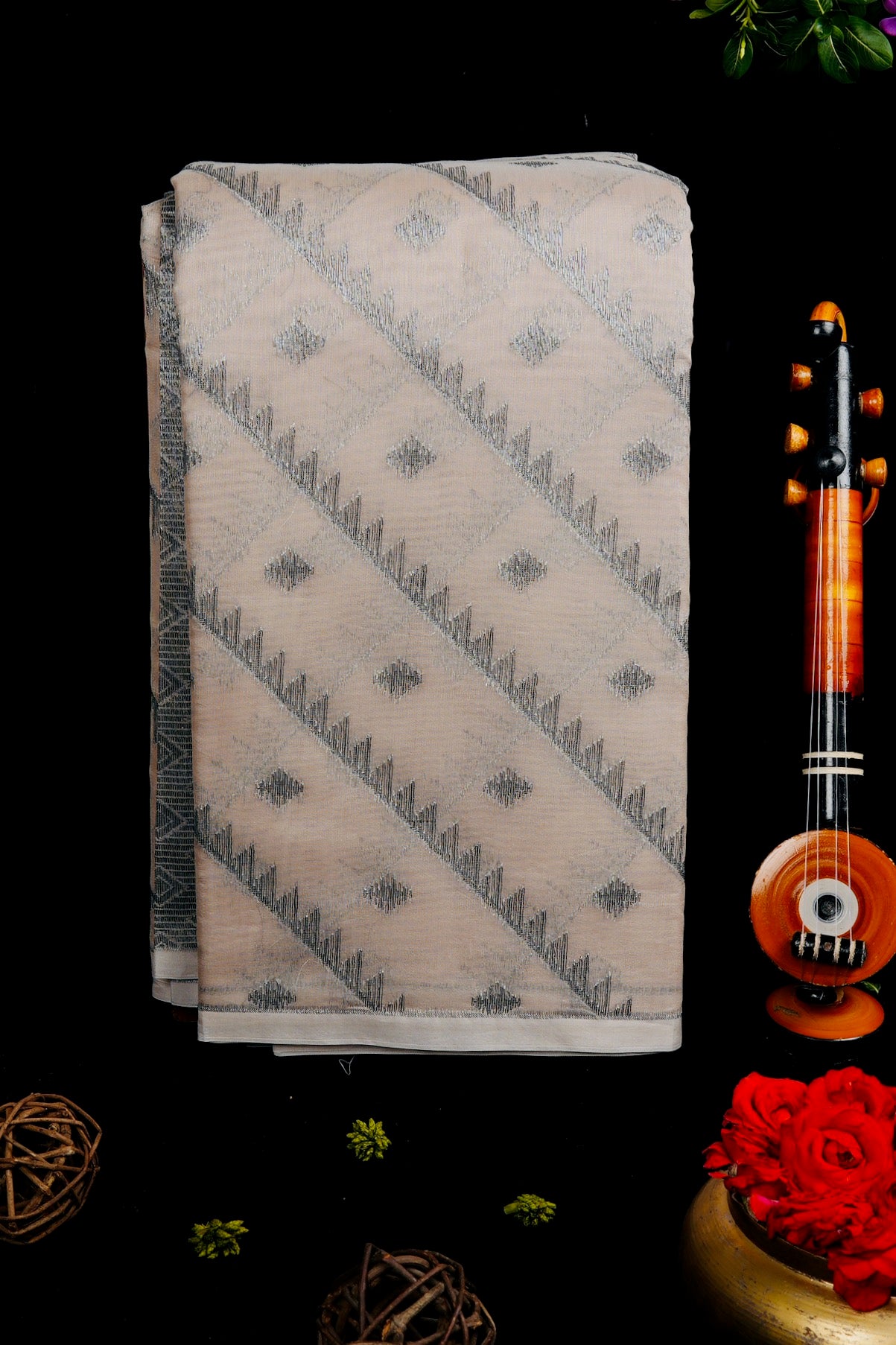 Cream semi silk cotton saree with triangular lines running diagonally in silver threads followed by small diamonds throughout the body. The pallu and the blouse is an expanse of horizontal lines holding small diamonds at even distances woven in silver.