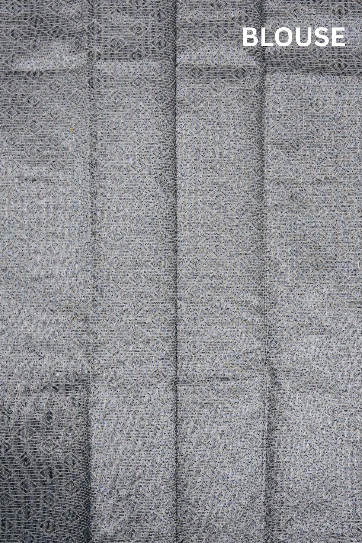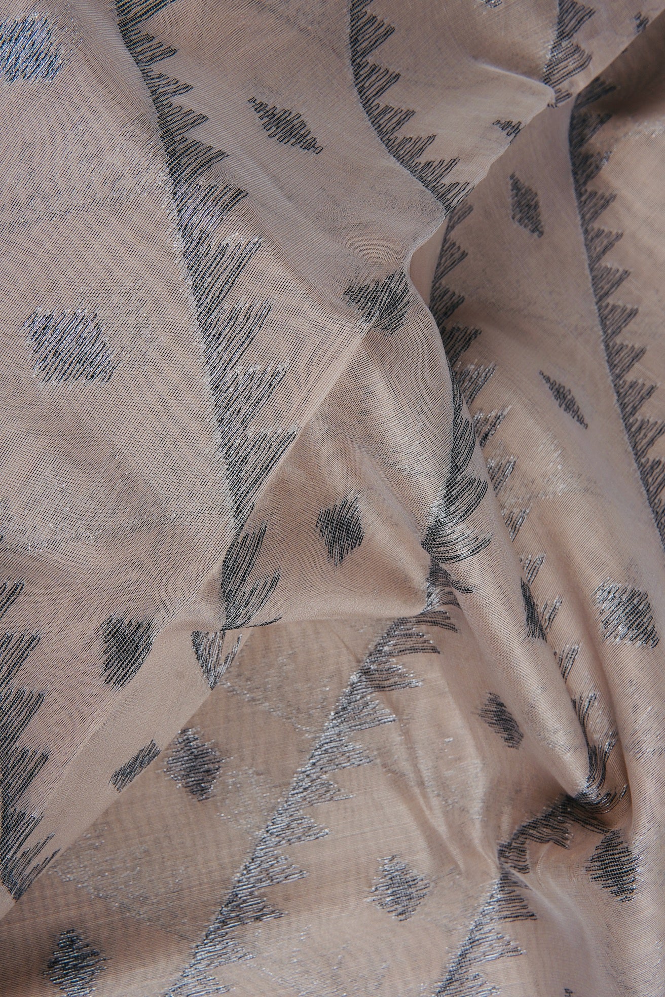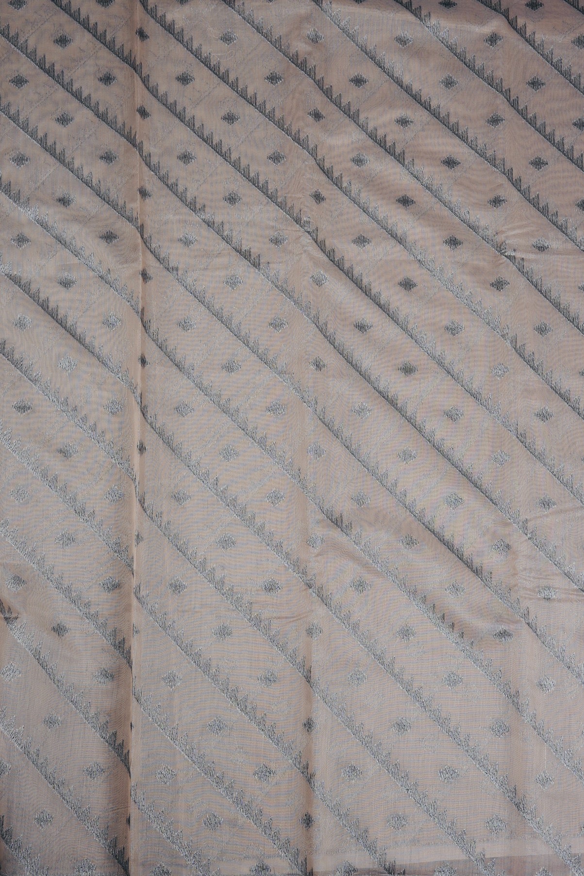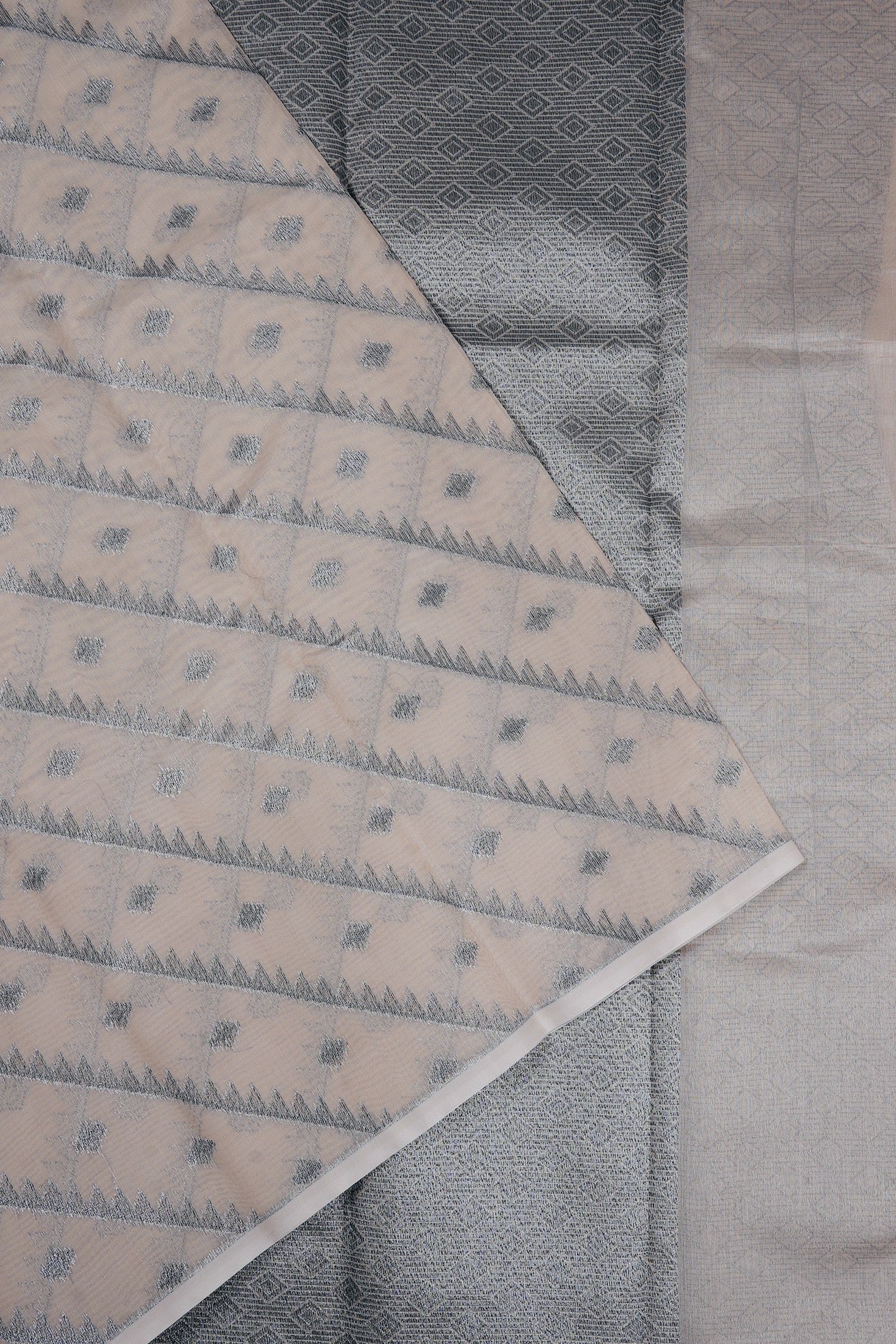 Cream semi silk cotton saree with triangular lines running diagonally in silver threads followed by small diamonds throughout the body. The pallu and the blouse is an expanse of horizontal lines holding small diamonds at even distances woven in silver.
