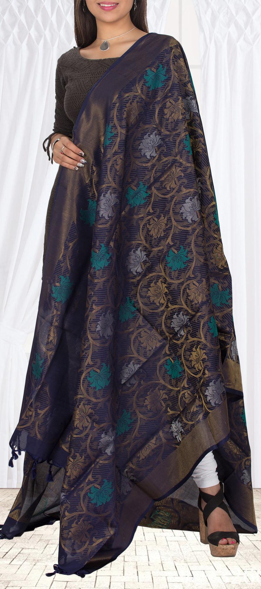 Dark Blue Kora Silk Dupatta With Zari & Thread Weaving
