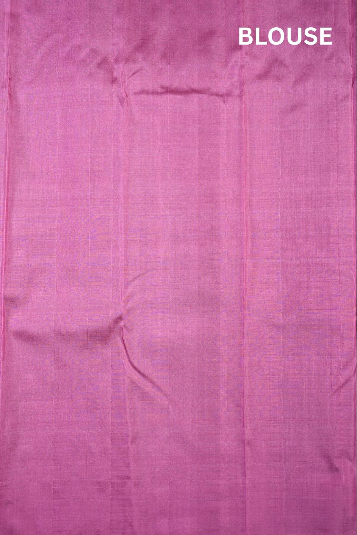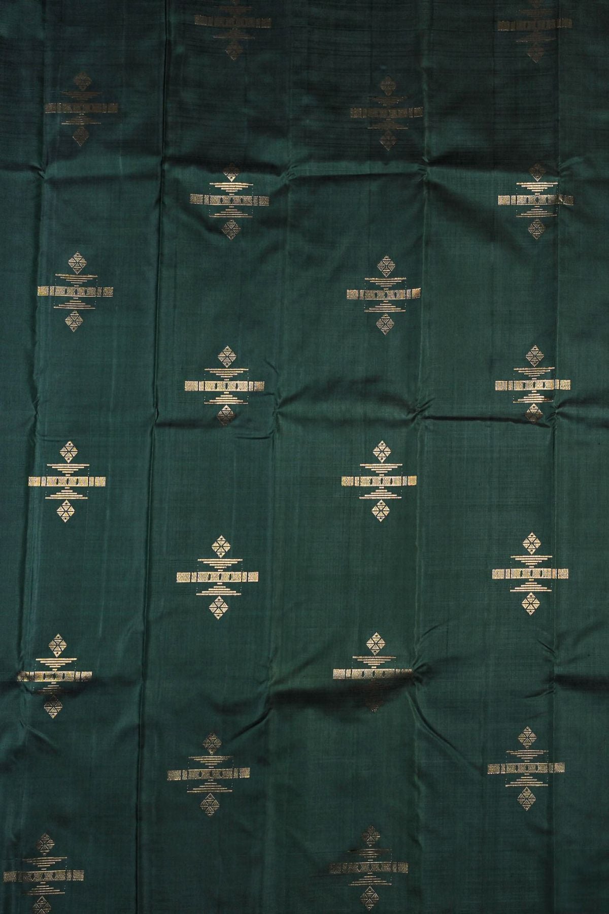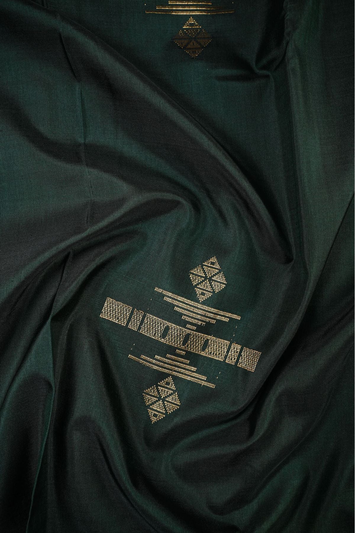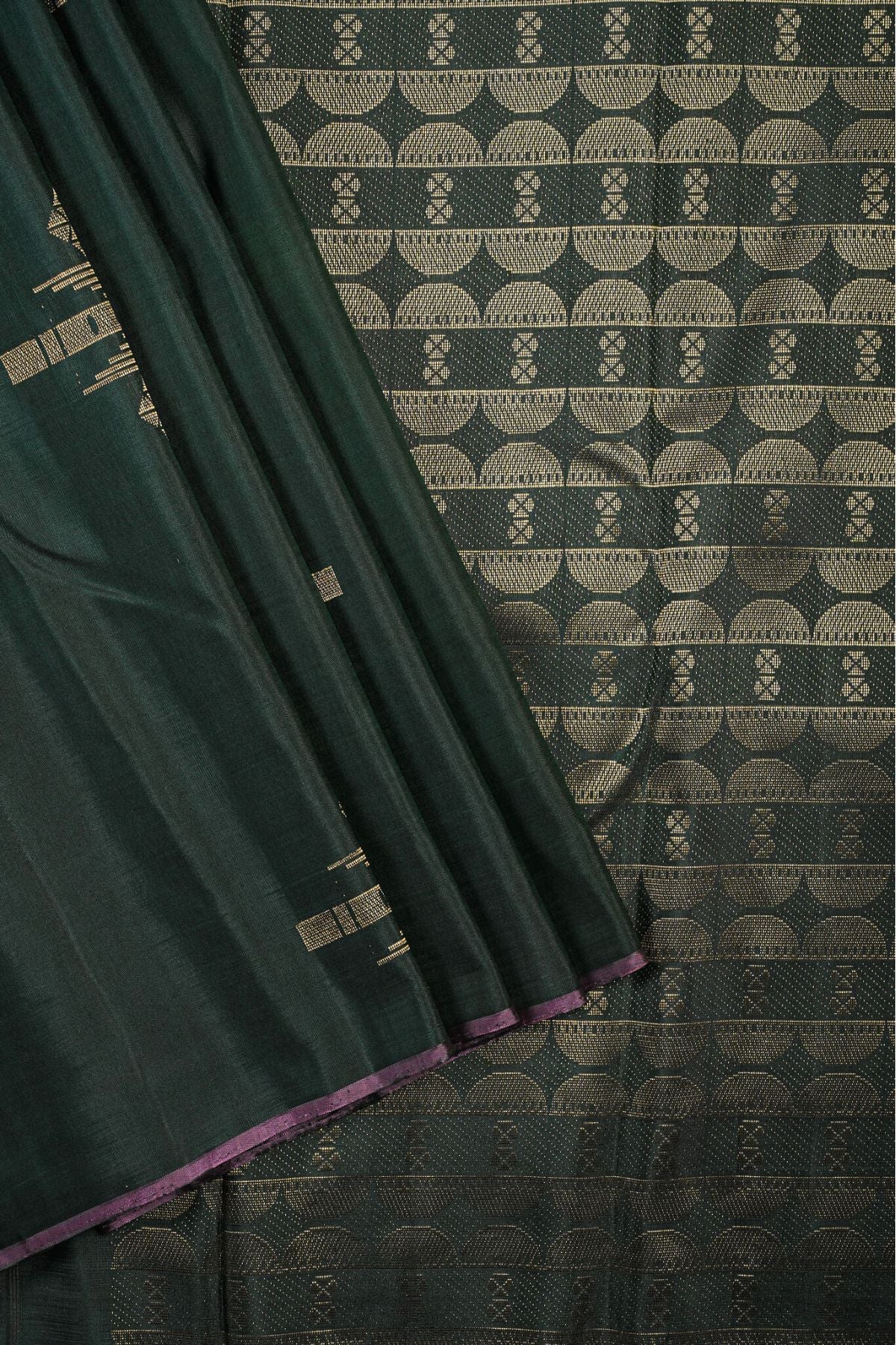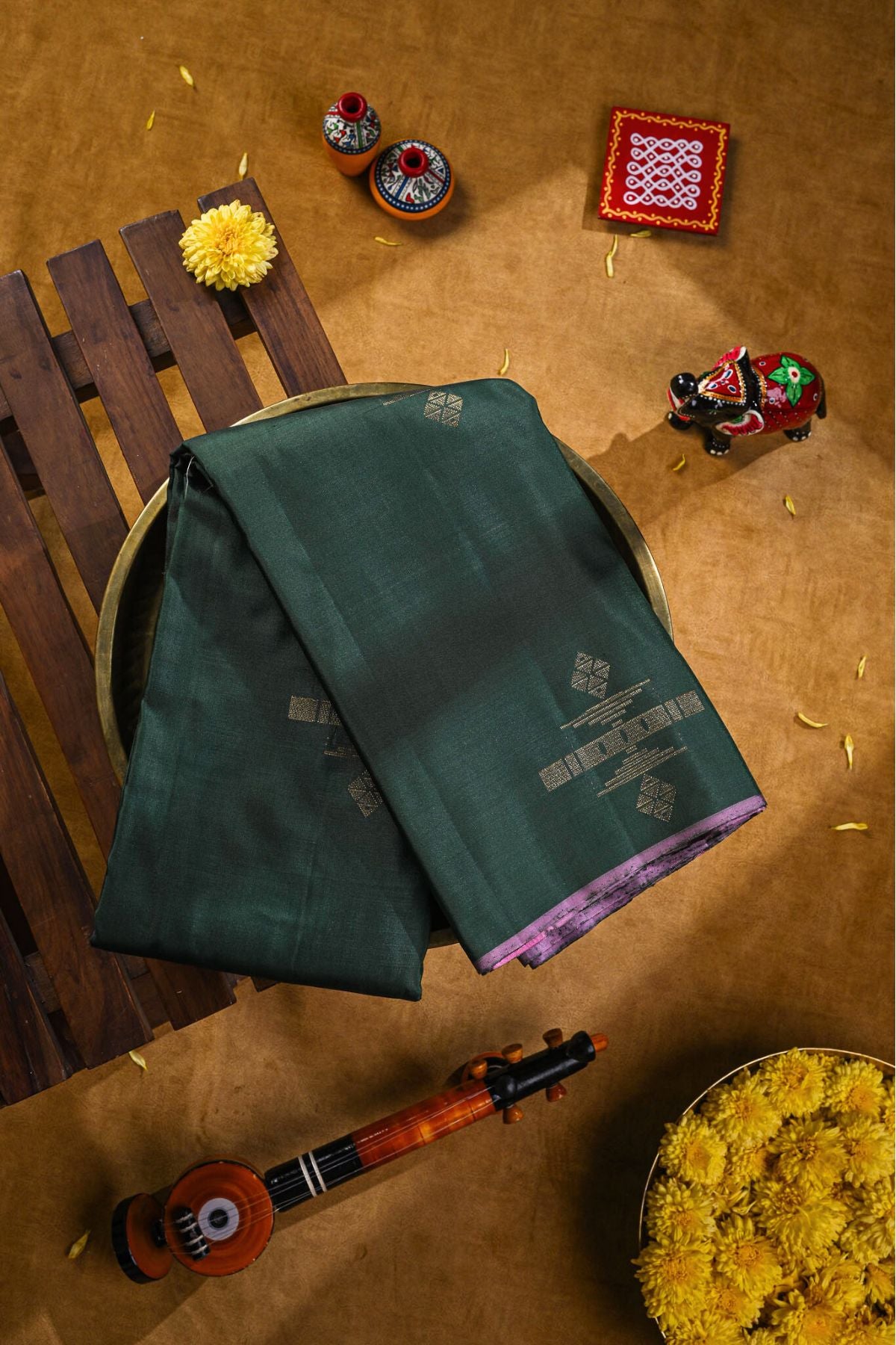 Dark Pine Green Kanchipuram Silk Saree with folk art inspired bhuttas in gold zari and a lavendar piping border. The "self" pallu in dark pine green is with Folk Art inspired patterns in gold zari.