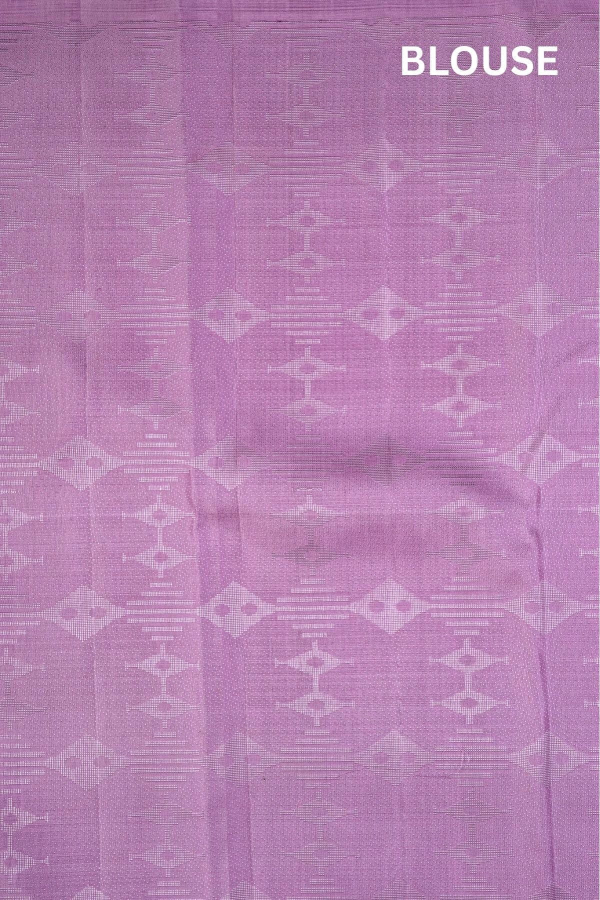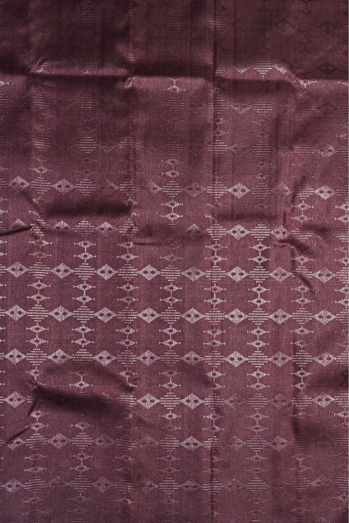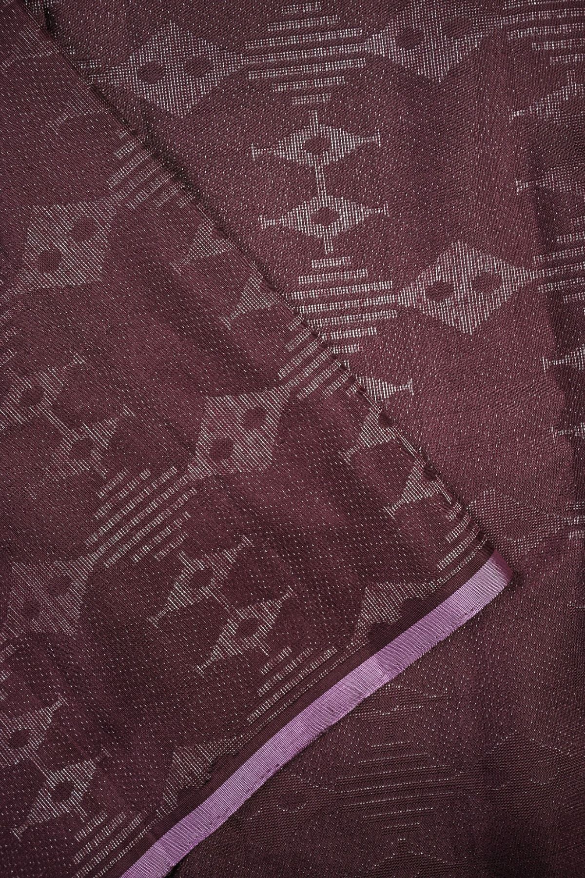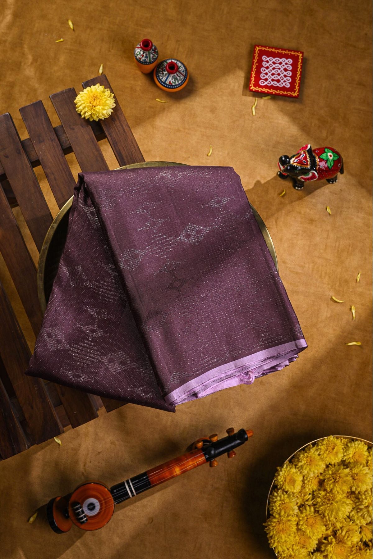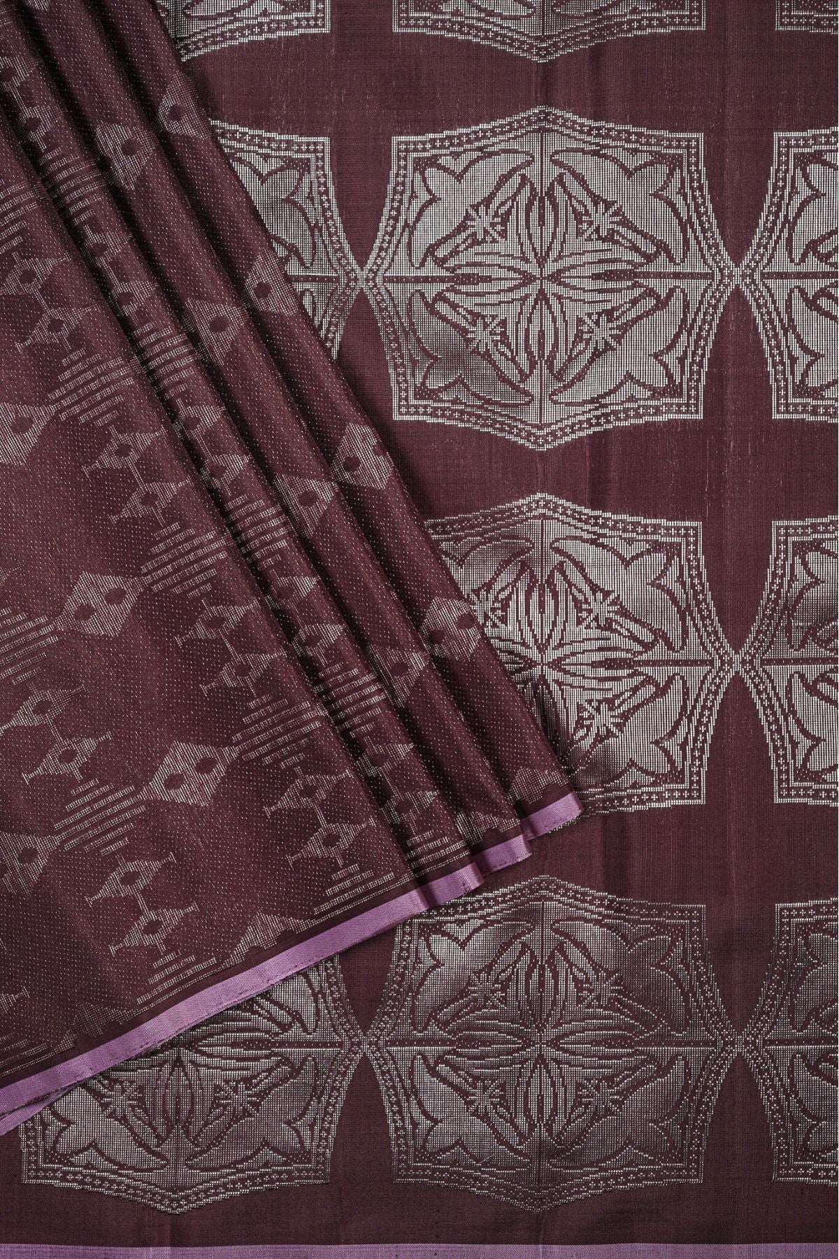 Brown Kanchipuram Silk Saree with Folk Art inspired jacquard weaves woven across the body in neem zari, paired with a piping lilac border.