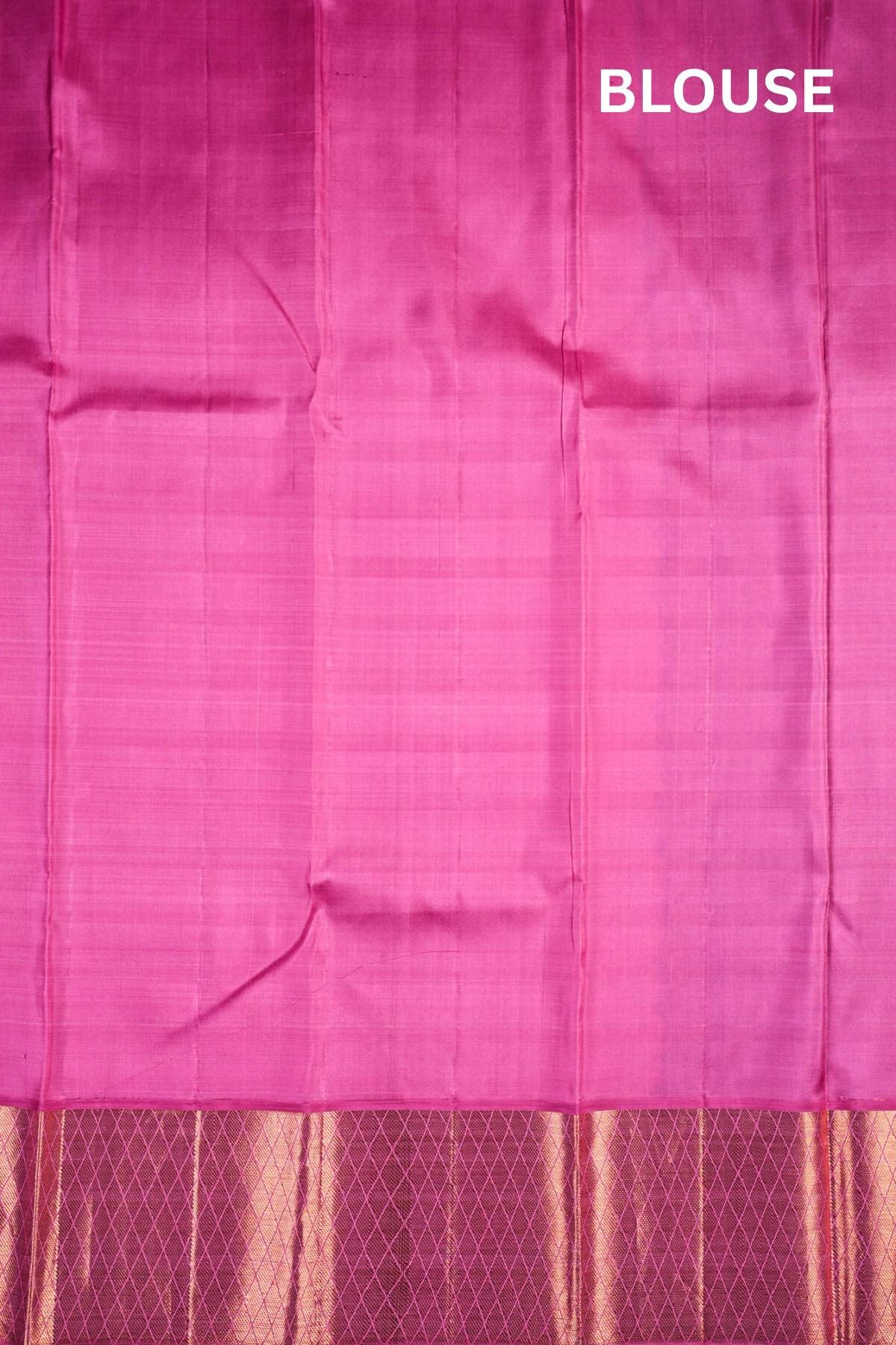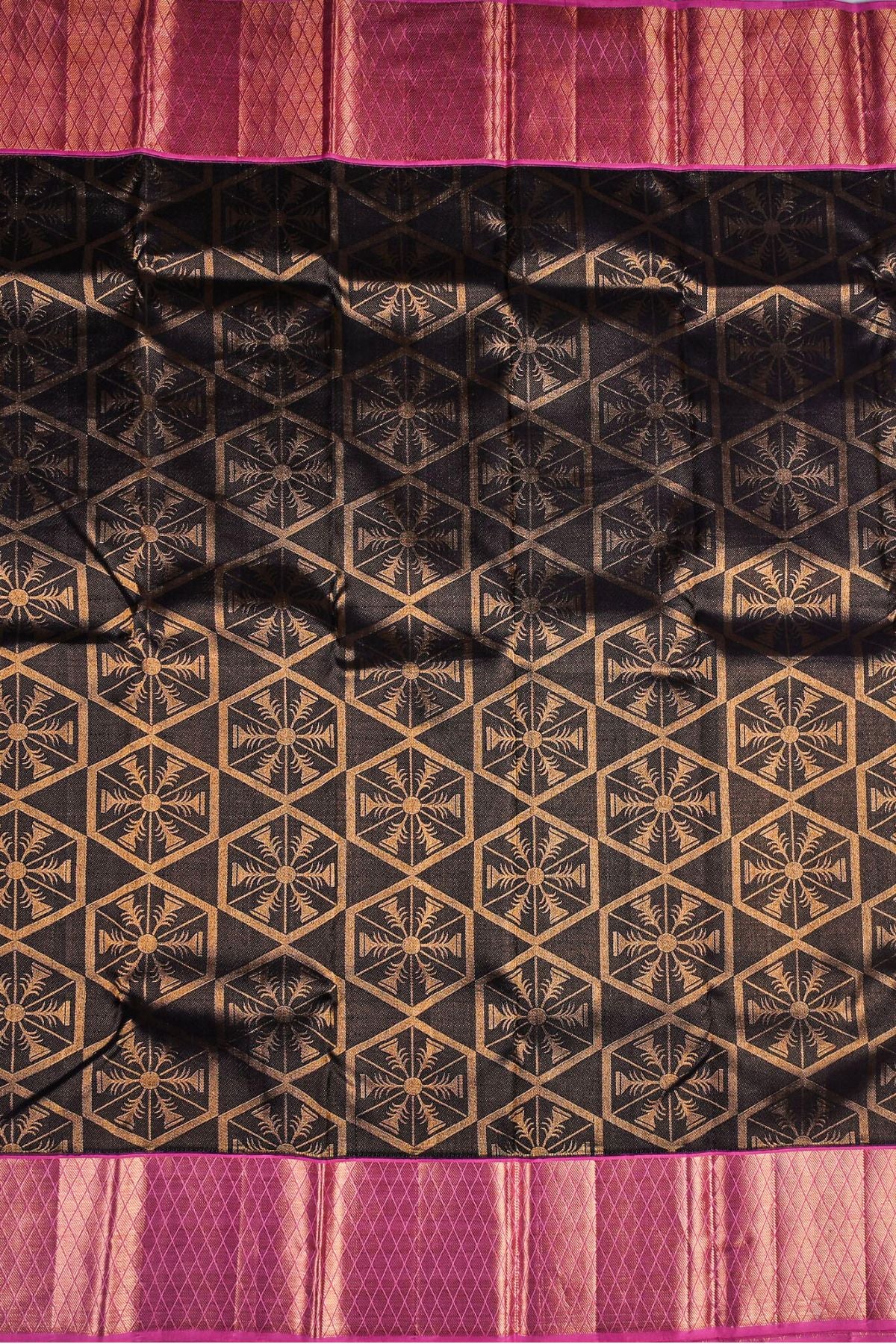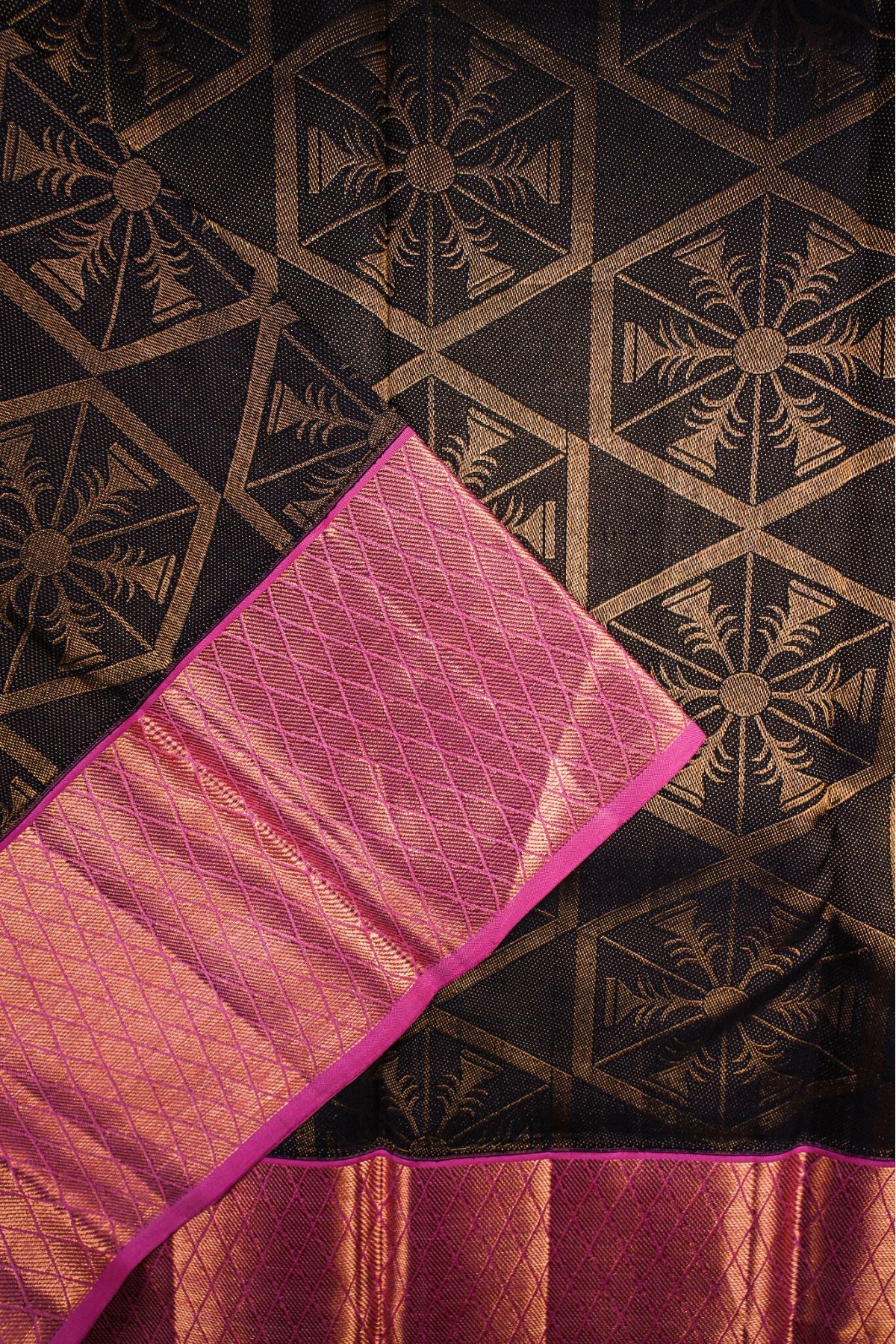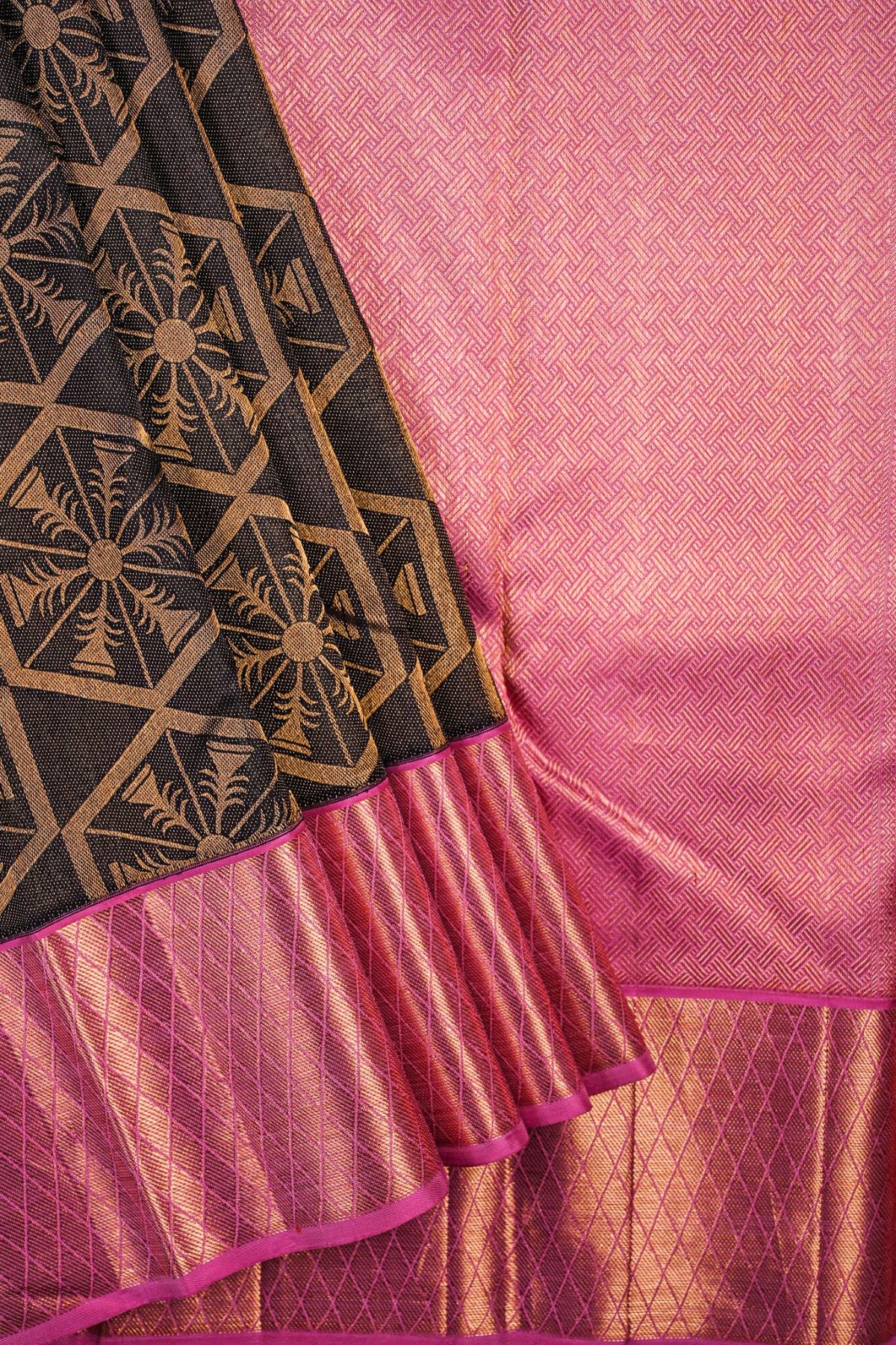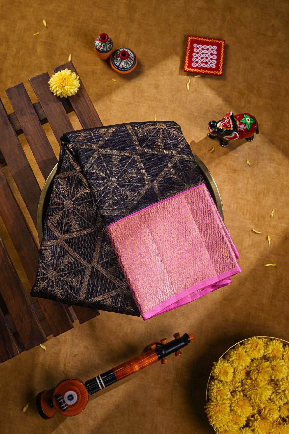 Ink blue kanchipuram saree with Wheel motifs as jacquard patterns woven in gold zari, paired with a bright pink border. Bright pink pallu carries zig-zag patterns in gold zari. The saree comes with a plain bright pink blouse with the same border.