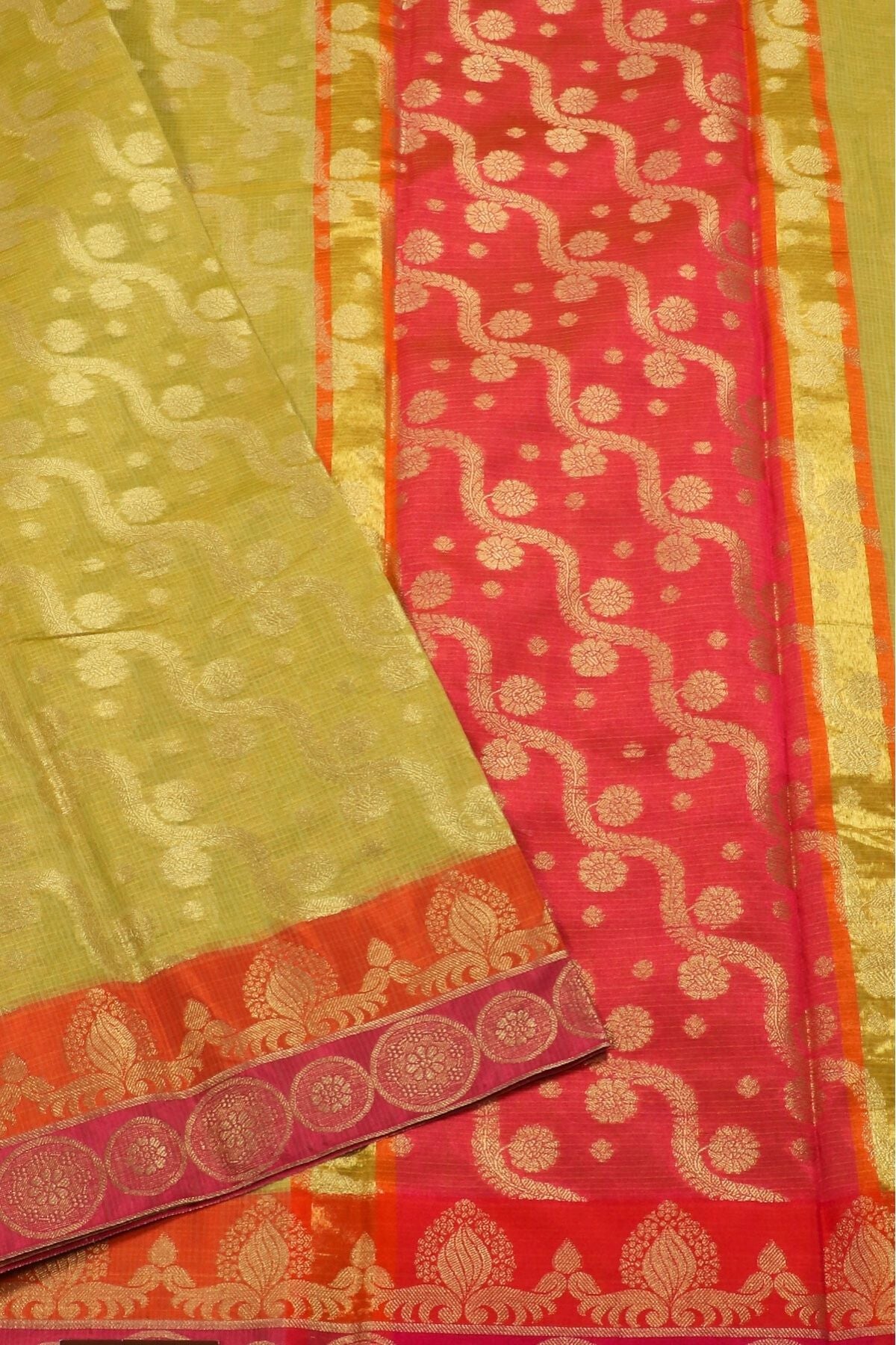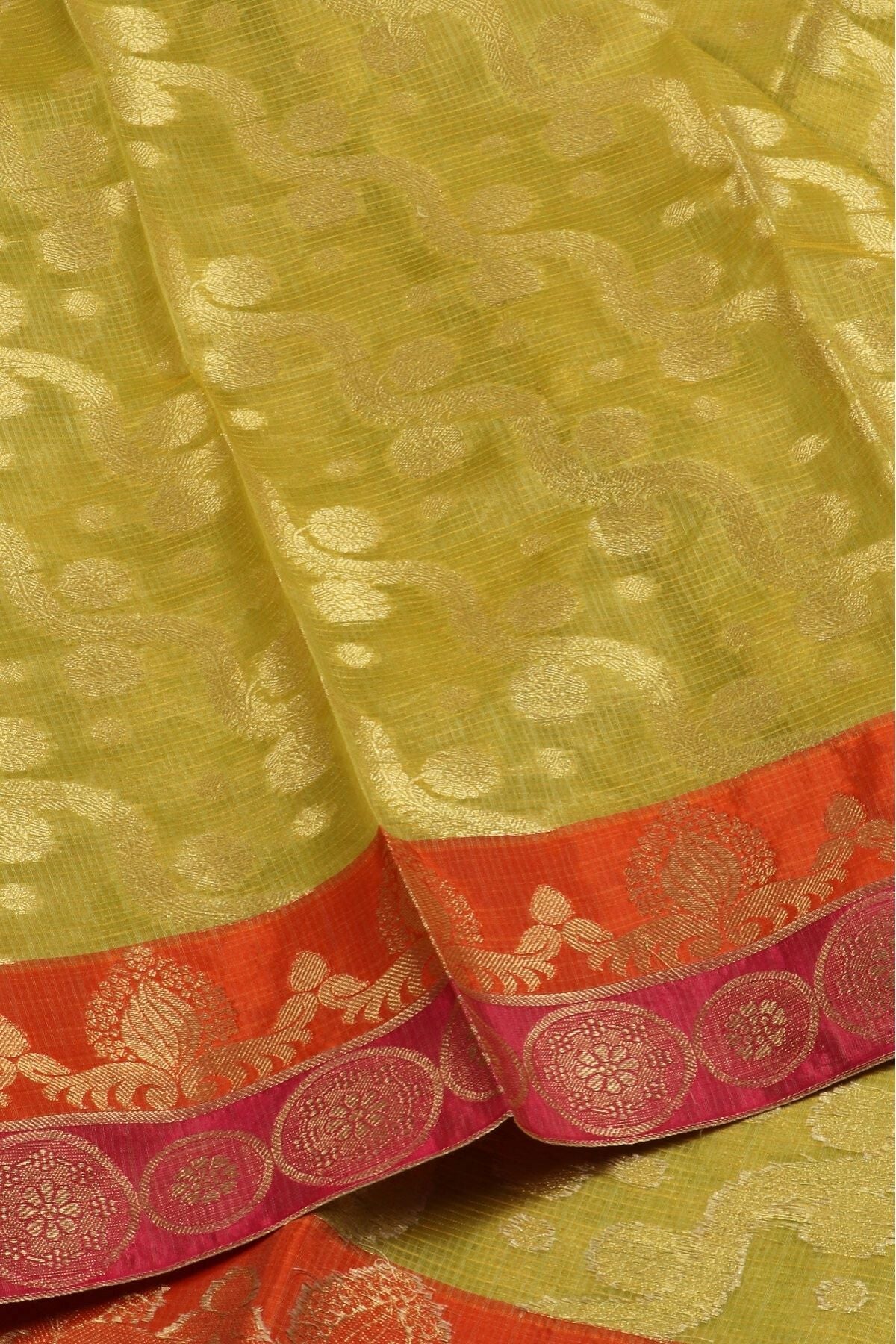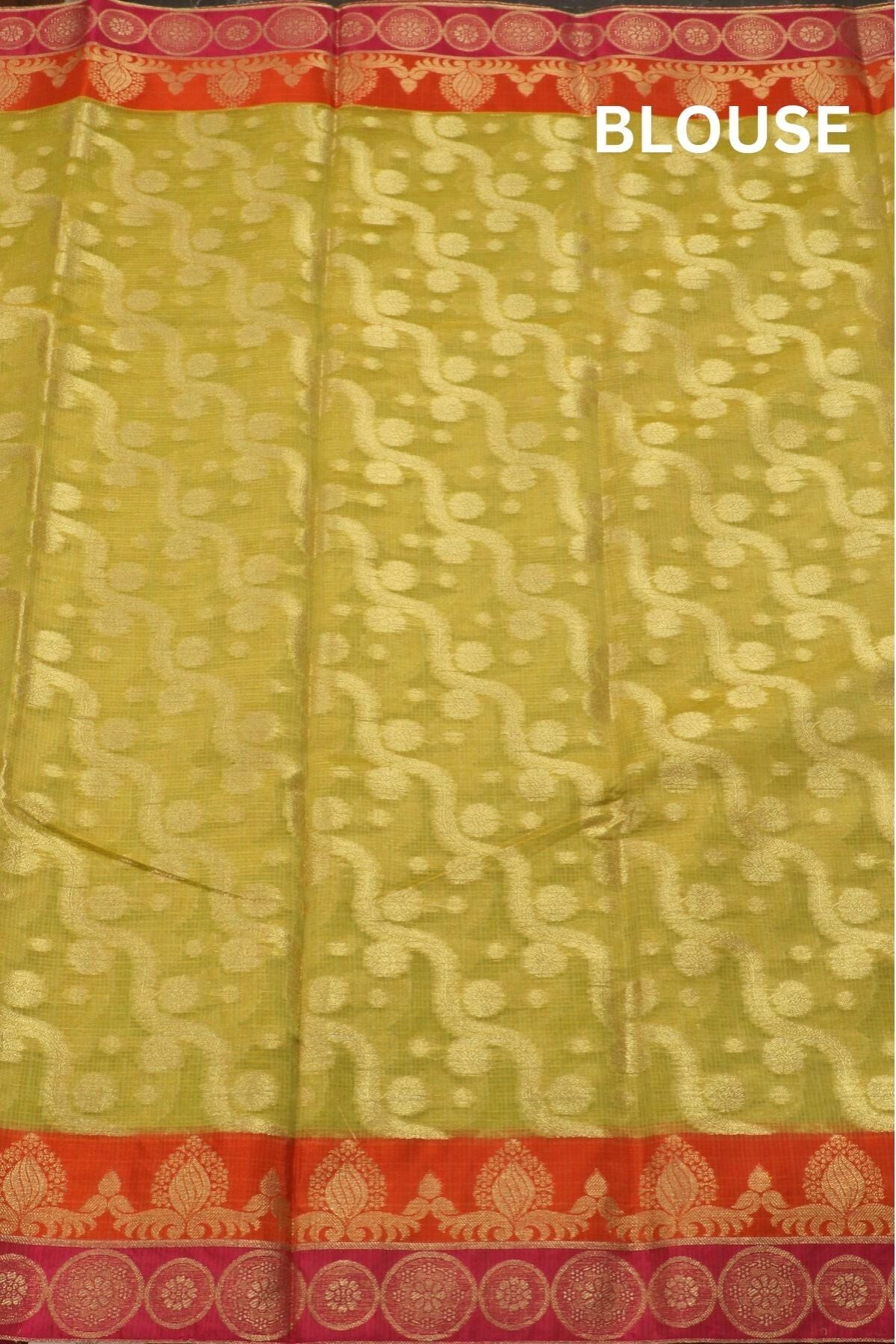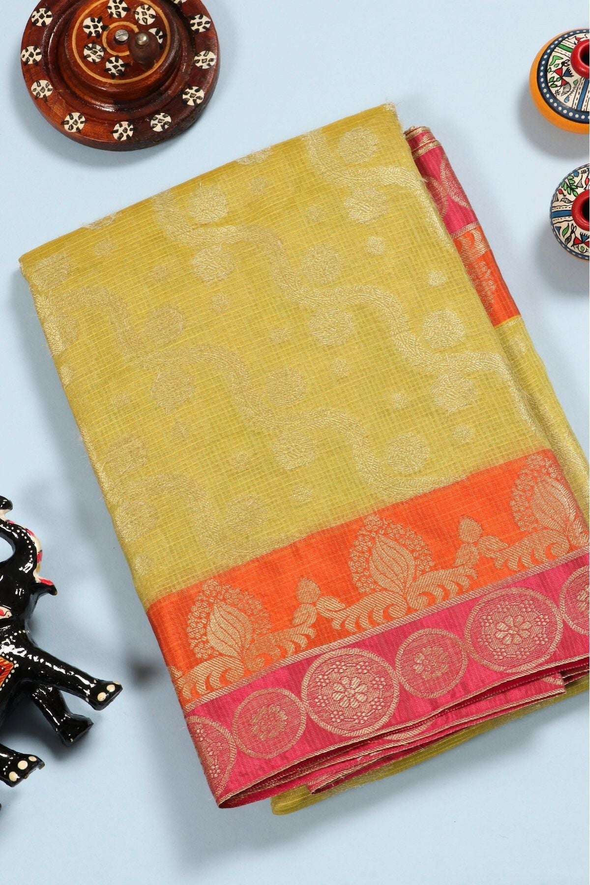 Gold organza saree with a deep red contrast border. The body carries abstract patterns woven in gold zari.