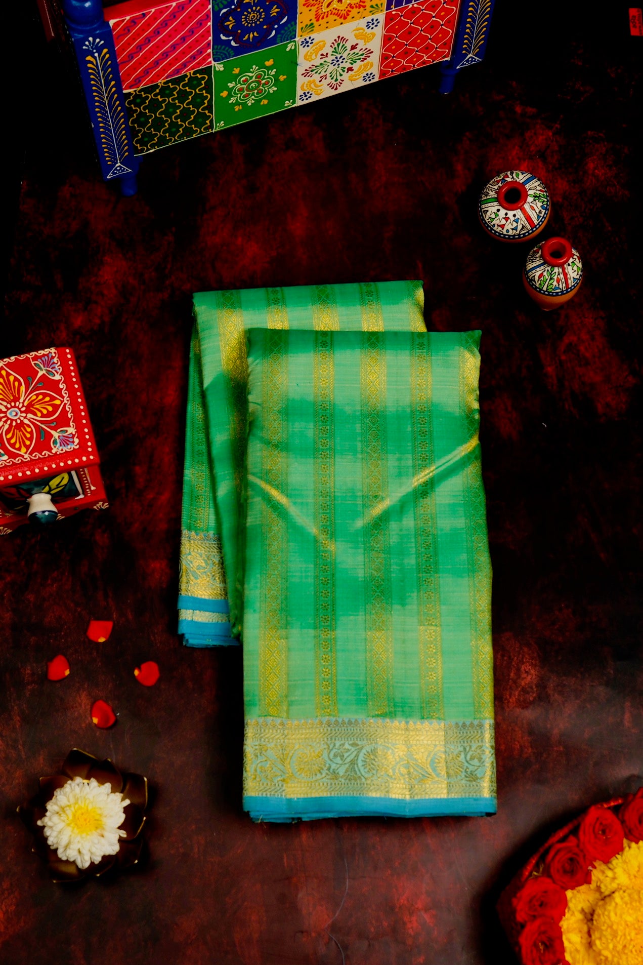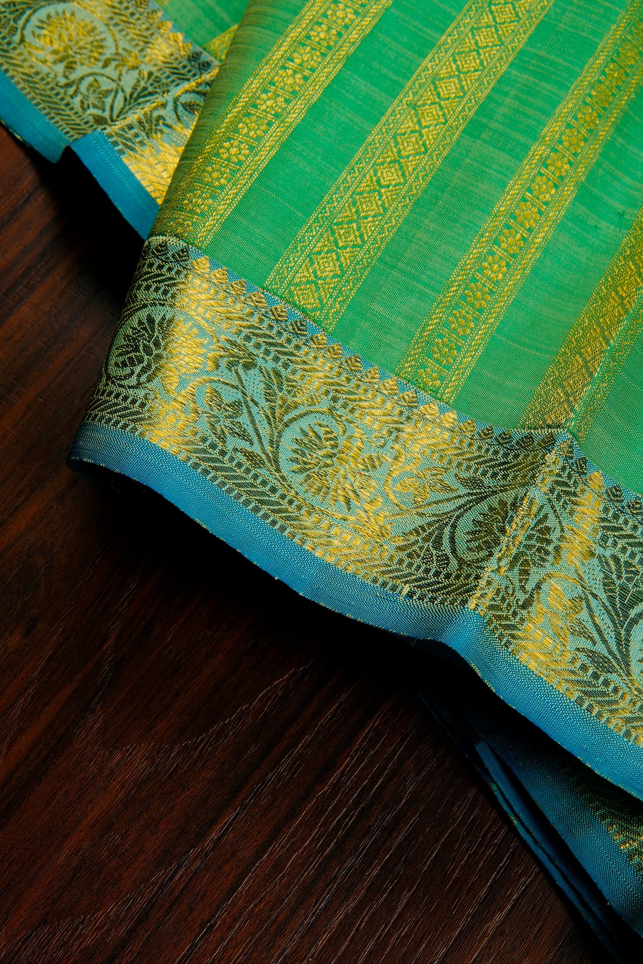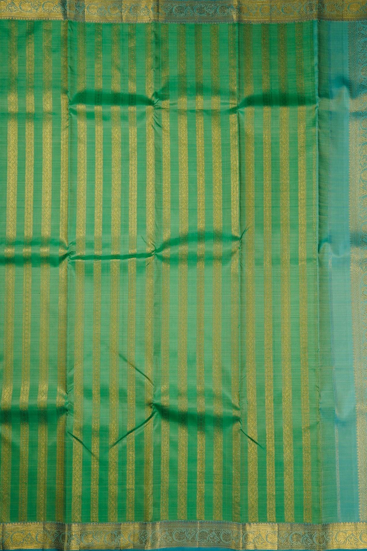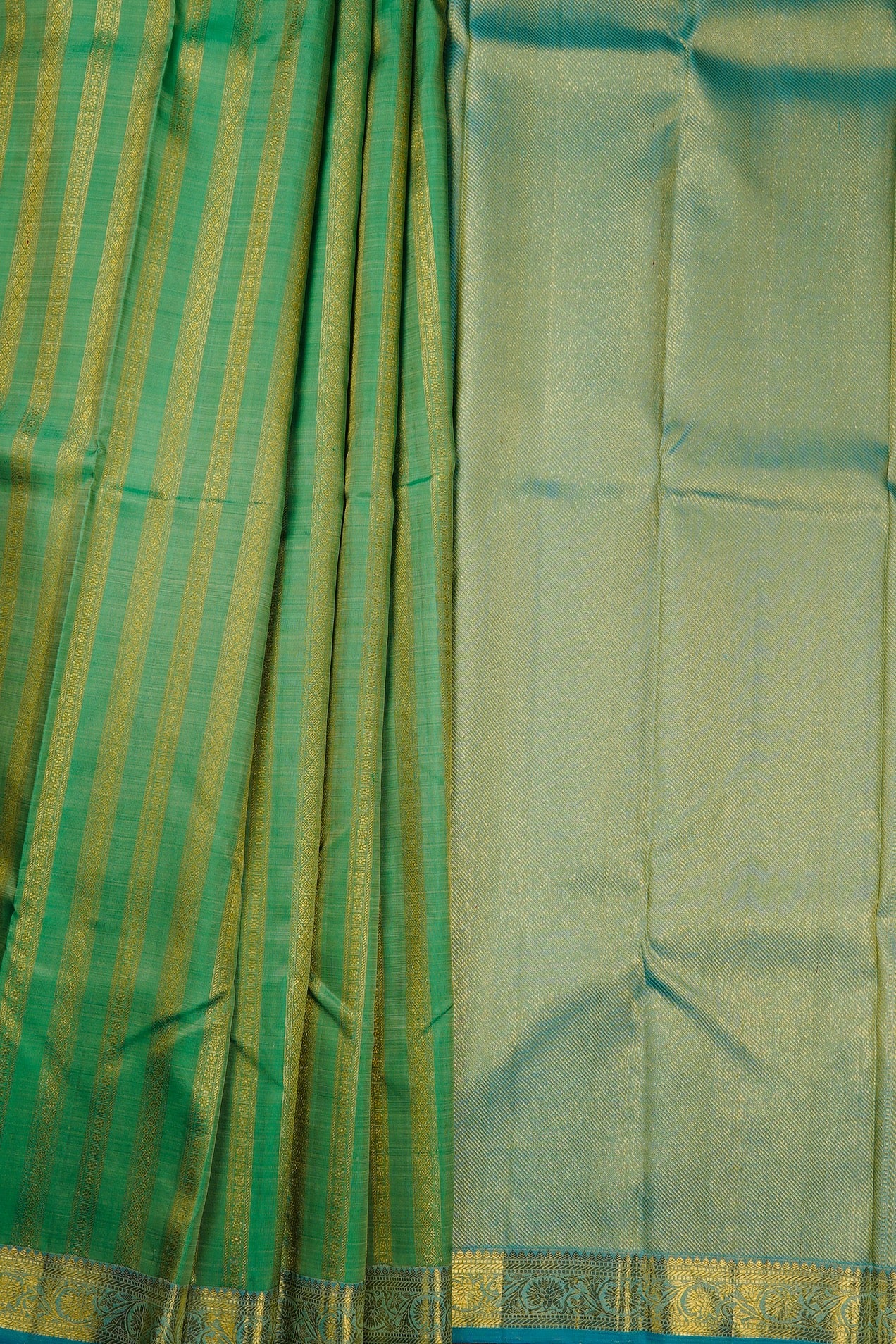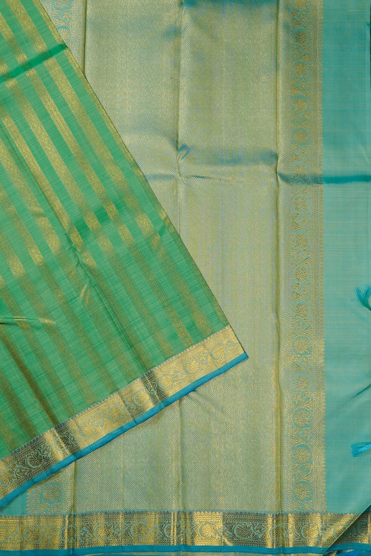 Greenish turquoise Kanchipuram Silk Saree with vertical bands of gold zari portraying floral motifs and stylised diamond motifs alternating with each band. The border has elegant kodi patterns woven in gold zari on a light blue base. The pallu has a dual tone of light blue and gold with the same border. The saree has a plain light blue blouse with the same border.