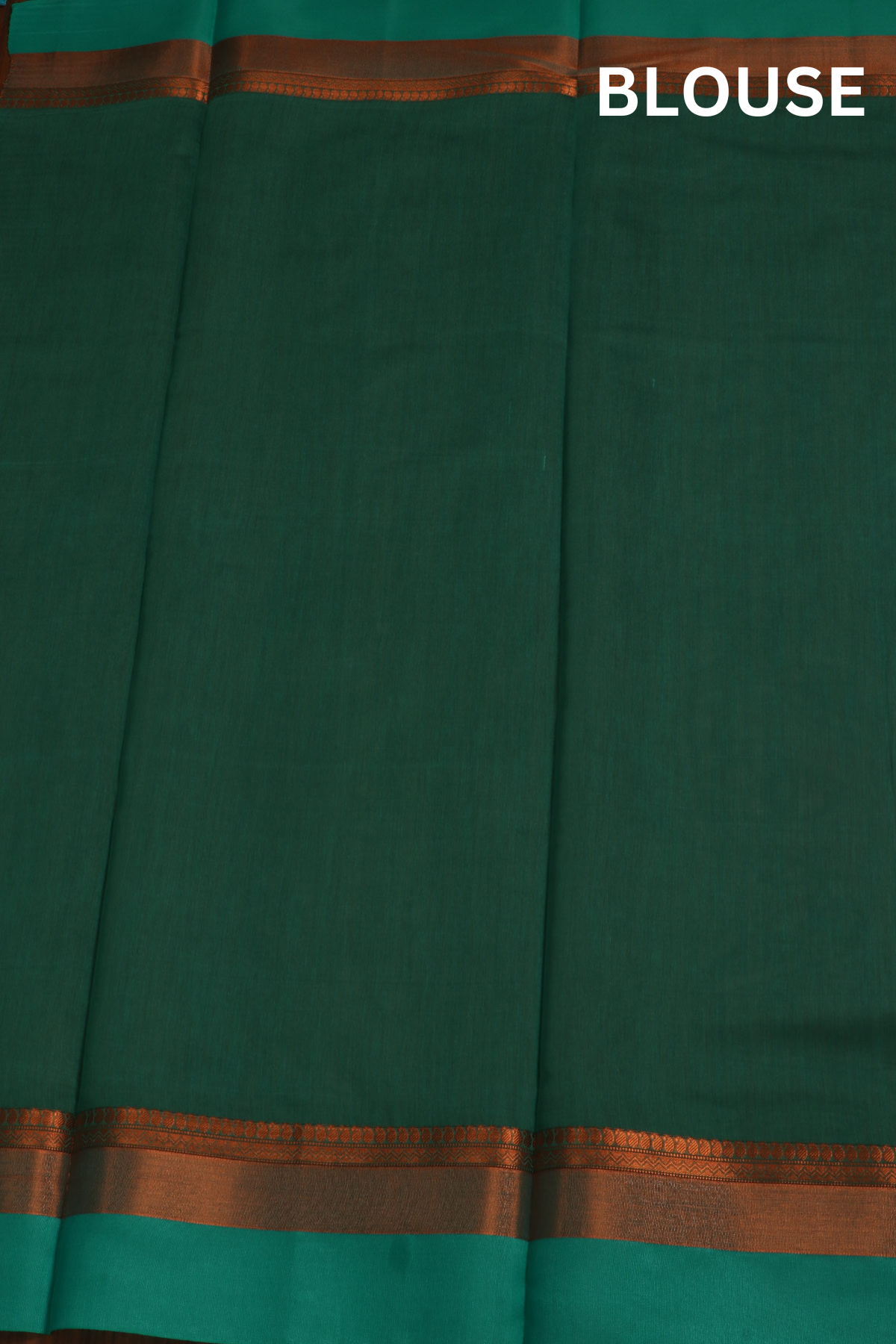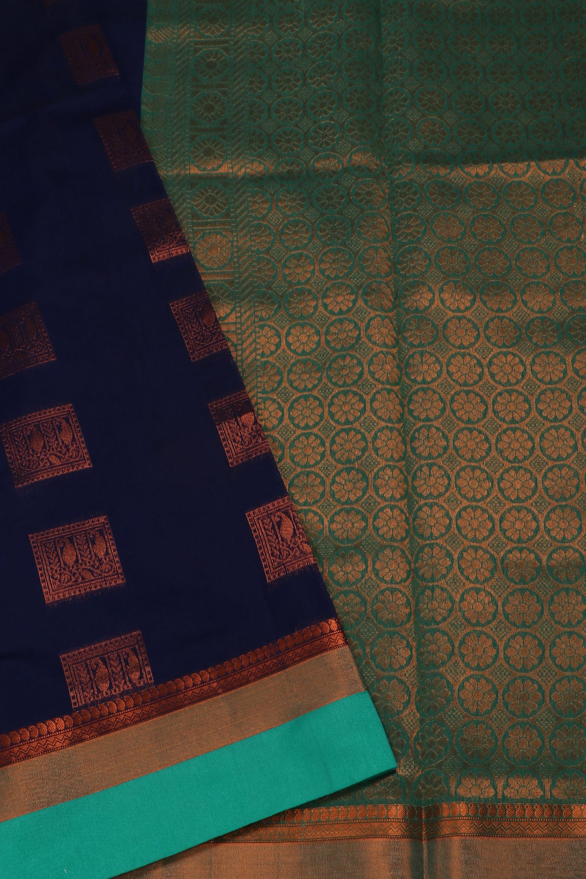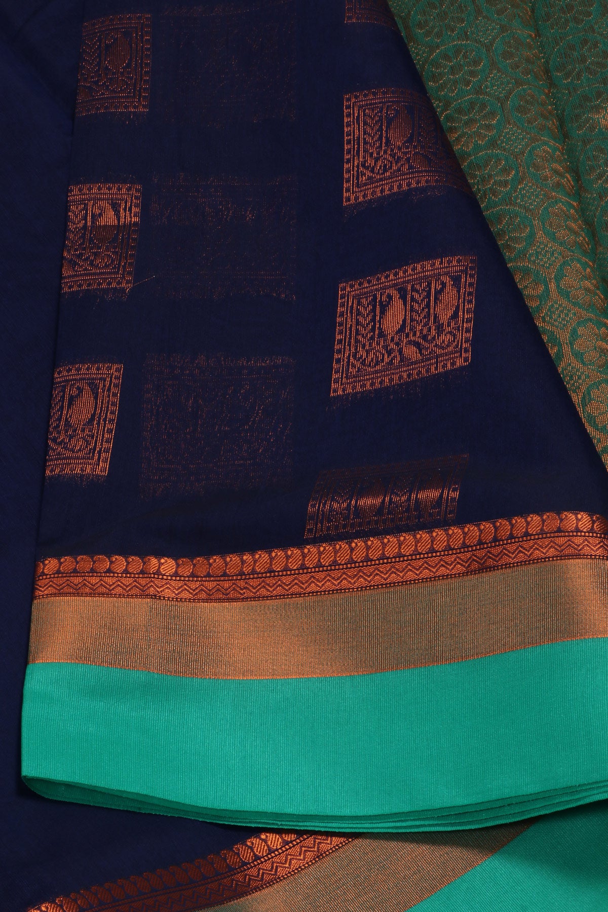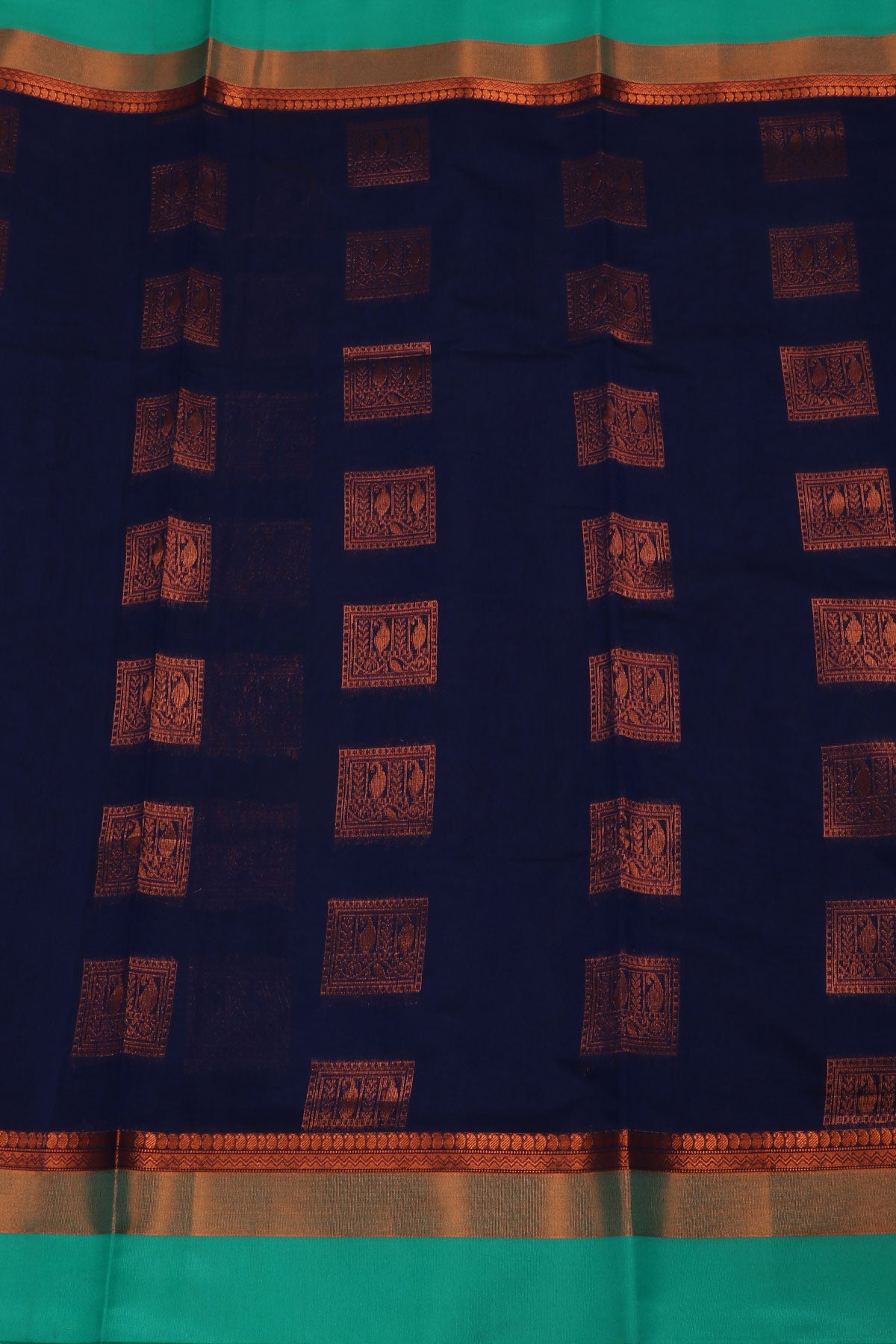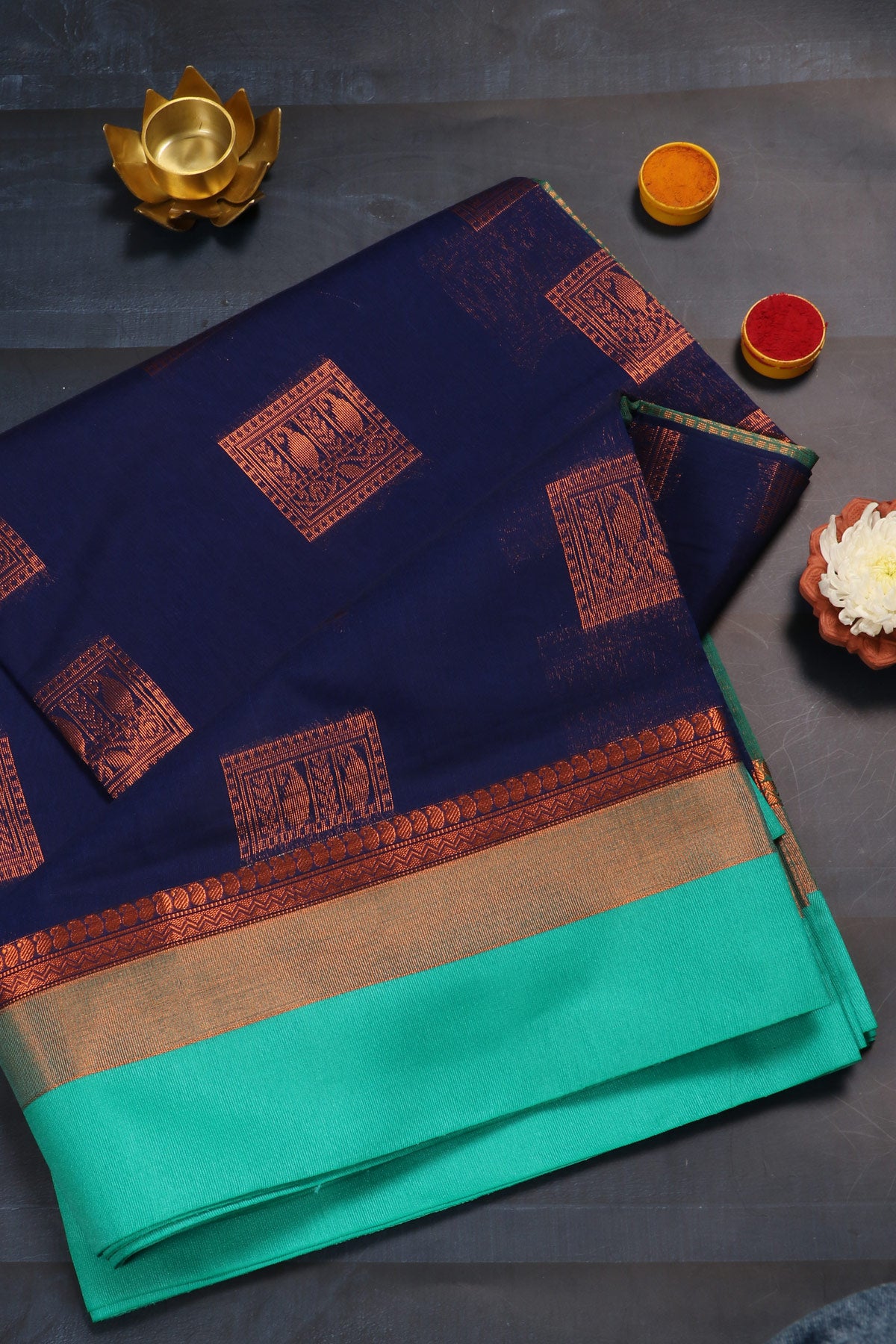 Ink blue semi silk cotton saree with framed paisley bhuttas in copper zari, paired with a turquoise blue border.