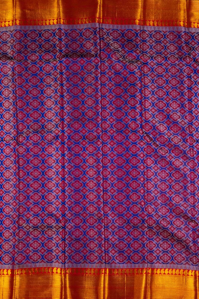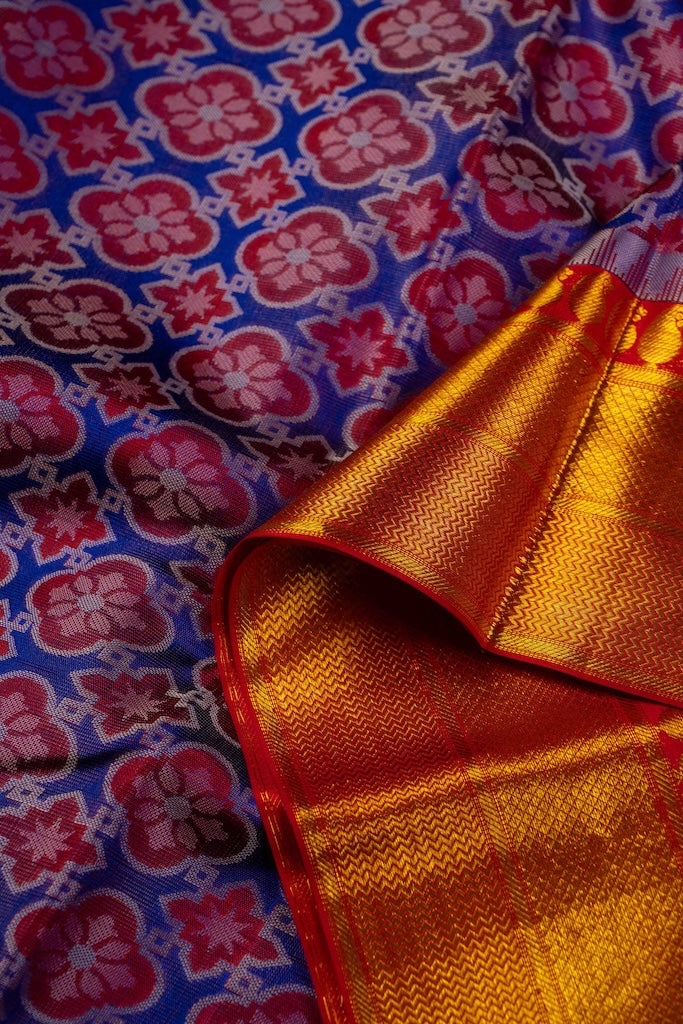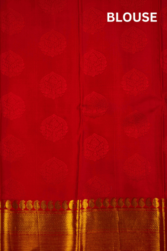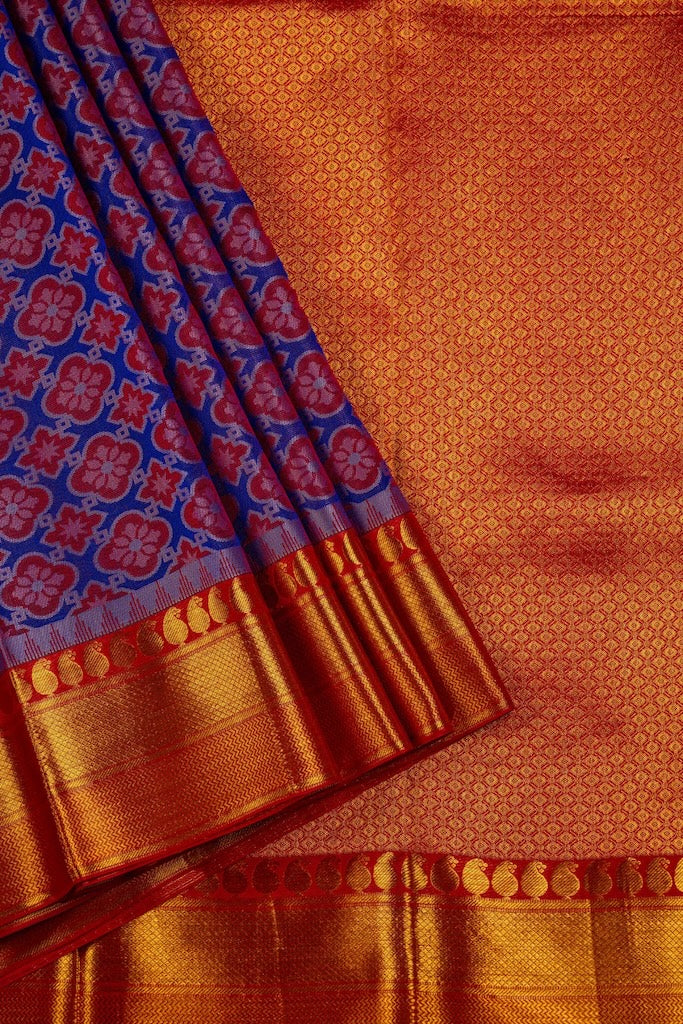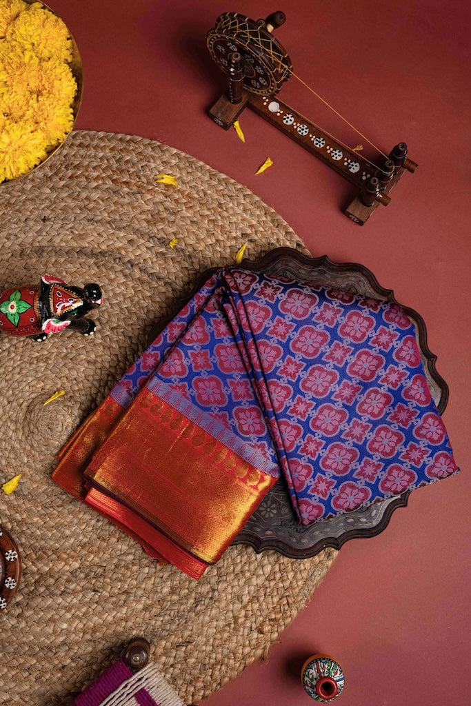 Pure handloom kanchipuram silk saree with Kalamkari inspired thread patterns strongly resembling printed patterns.