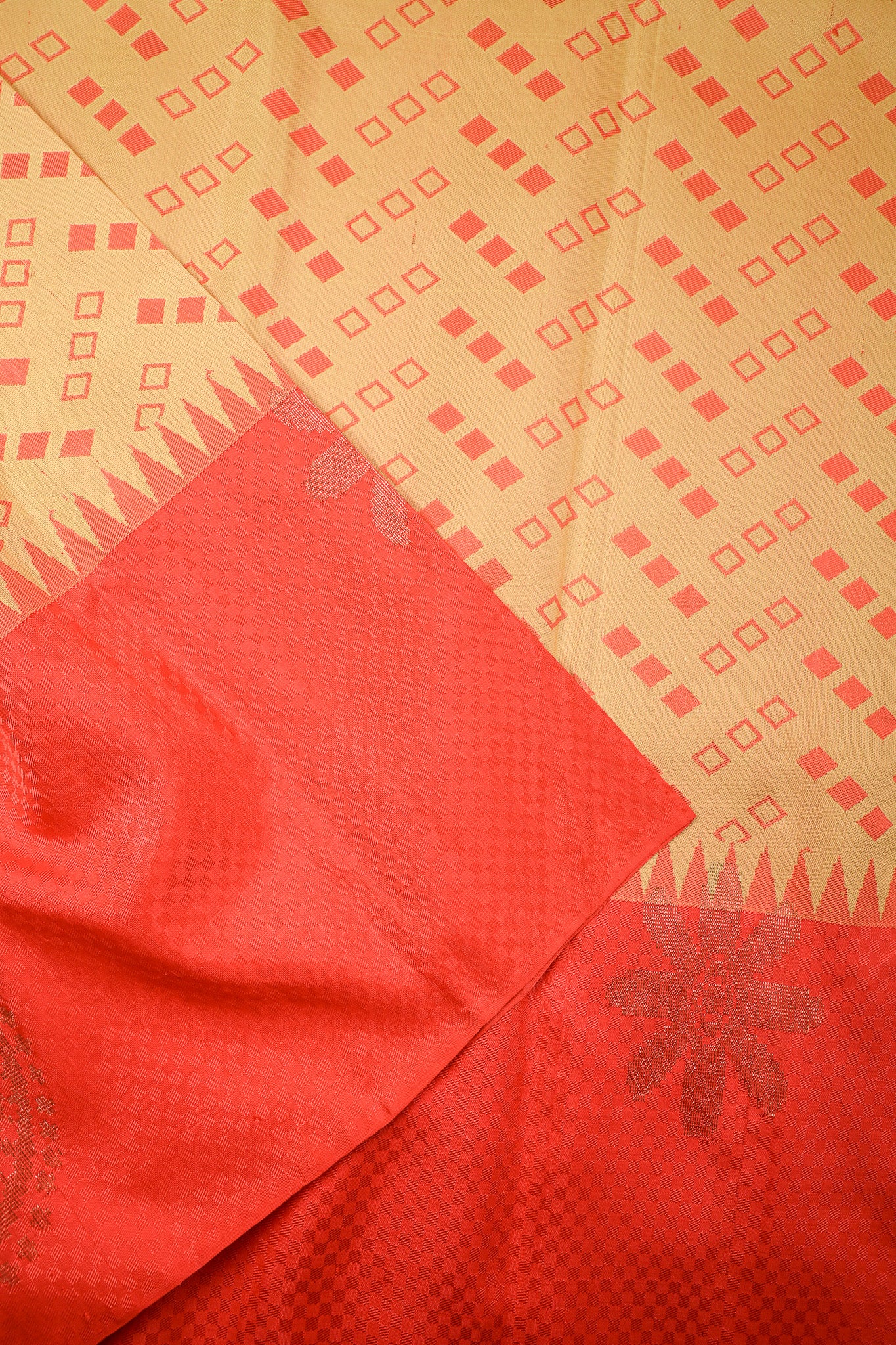 Lemon yellow kanchipuram silk saree with a peach Temple-rek border. The body carries abstract thread patterns inspired from traditional brocade weaves.