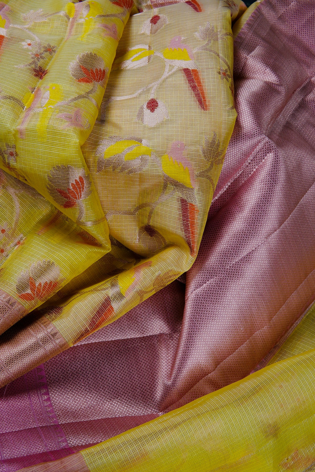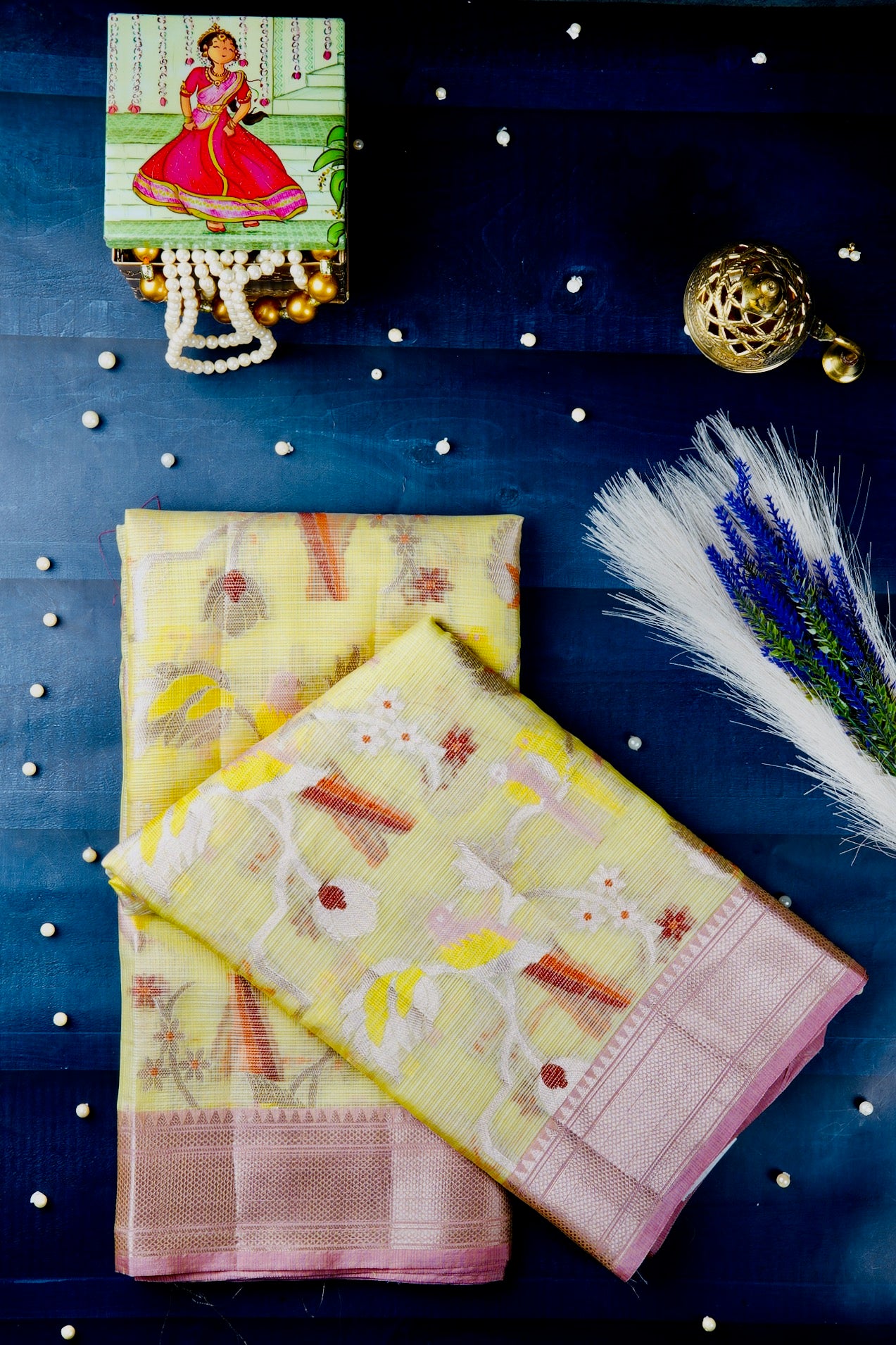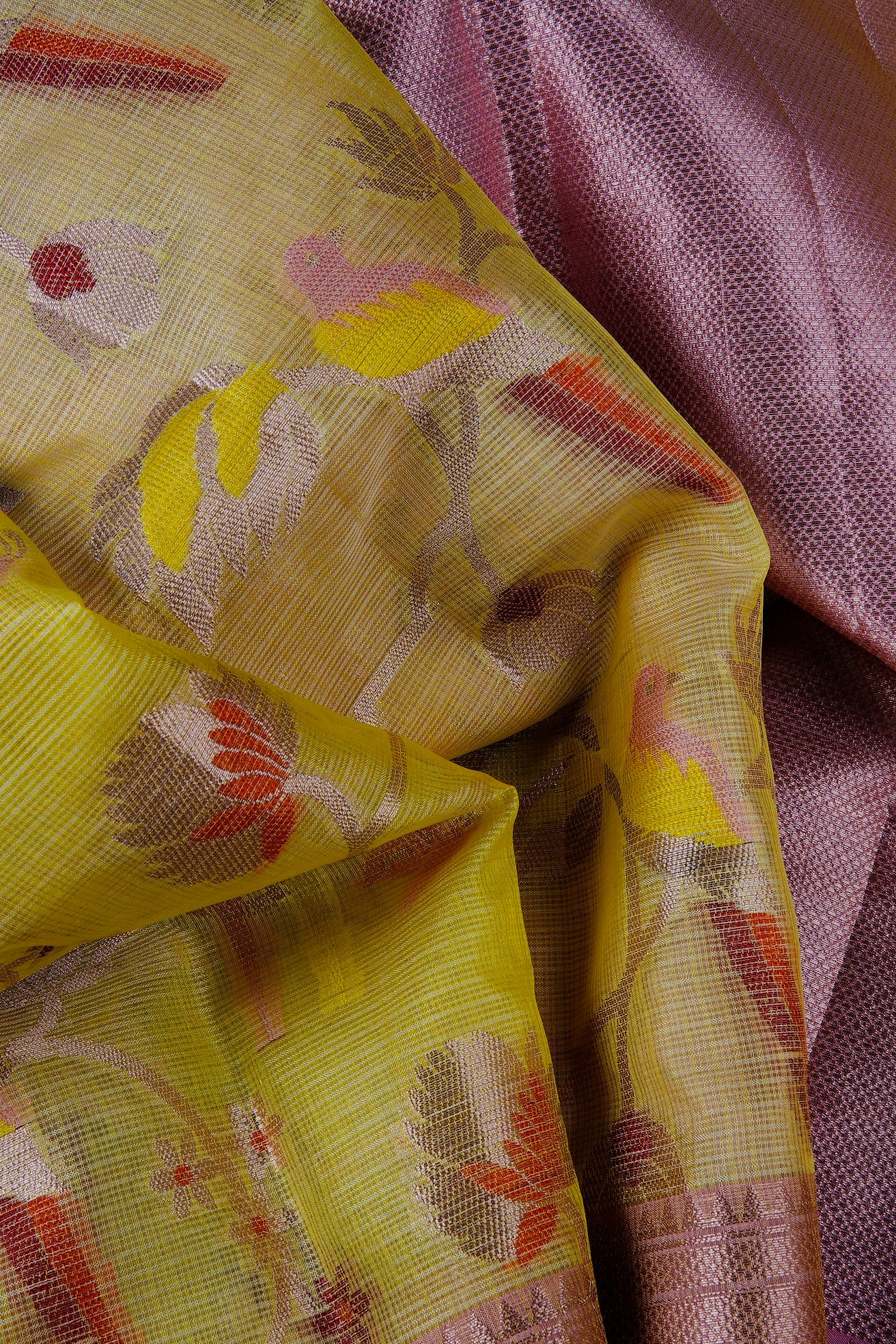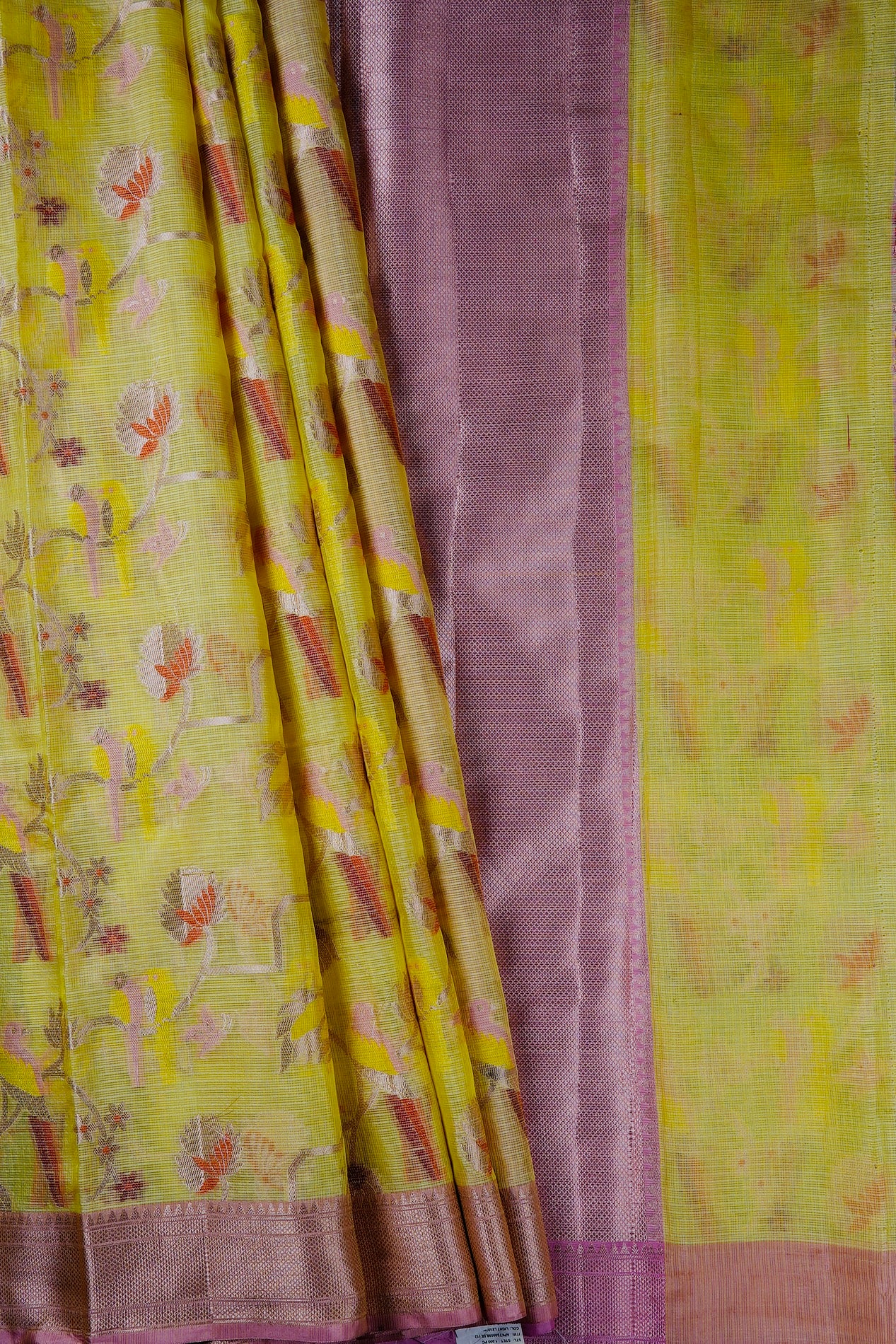 Lemon yellow semi tussar zari type saree with birds resting on tree branches woven in gold, pink, yellow and maroon threads throughout the body. The border is onion pink with intricate lattice patterns woven in zari. The pallu has an onion pink base with intricate lattice pattern woven in zari followed by a bare expanse of lemon yellow. the saree has an onion pink blouse with floral motifs woven in silver zari with the same border.