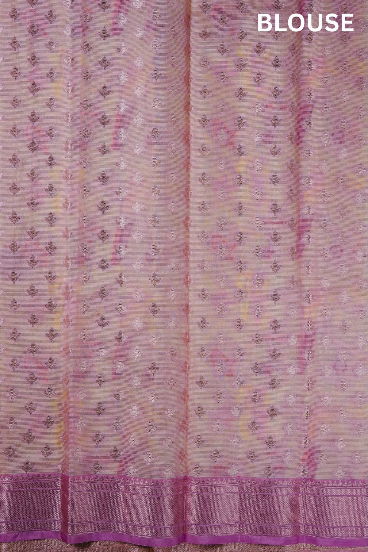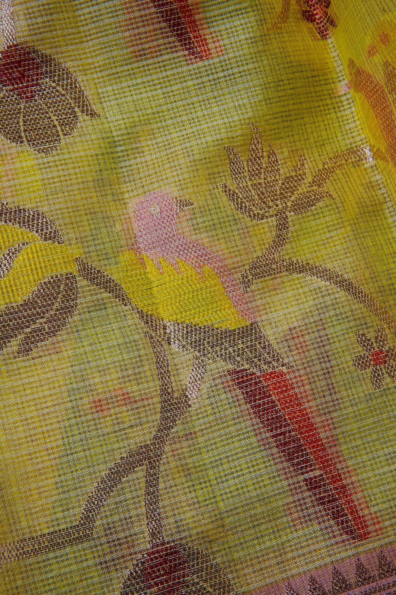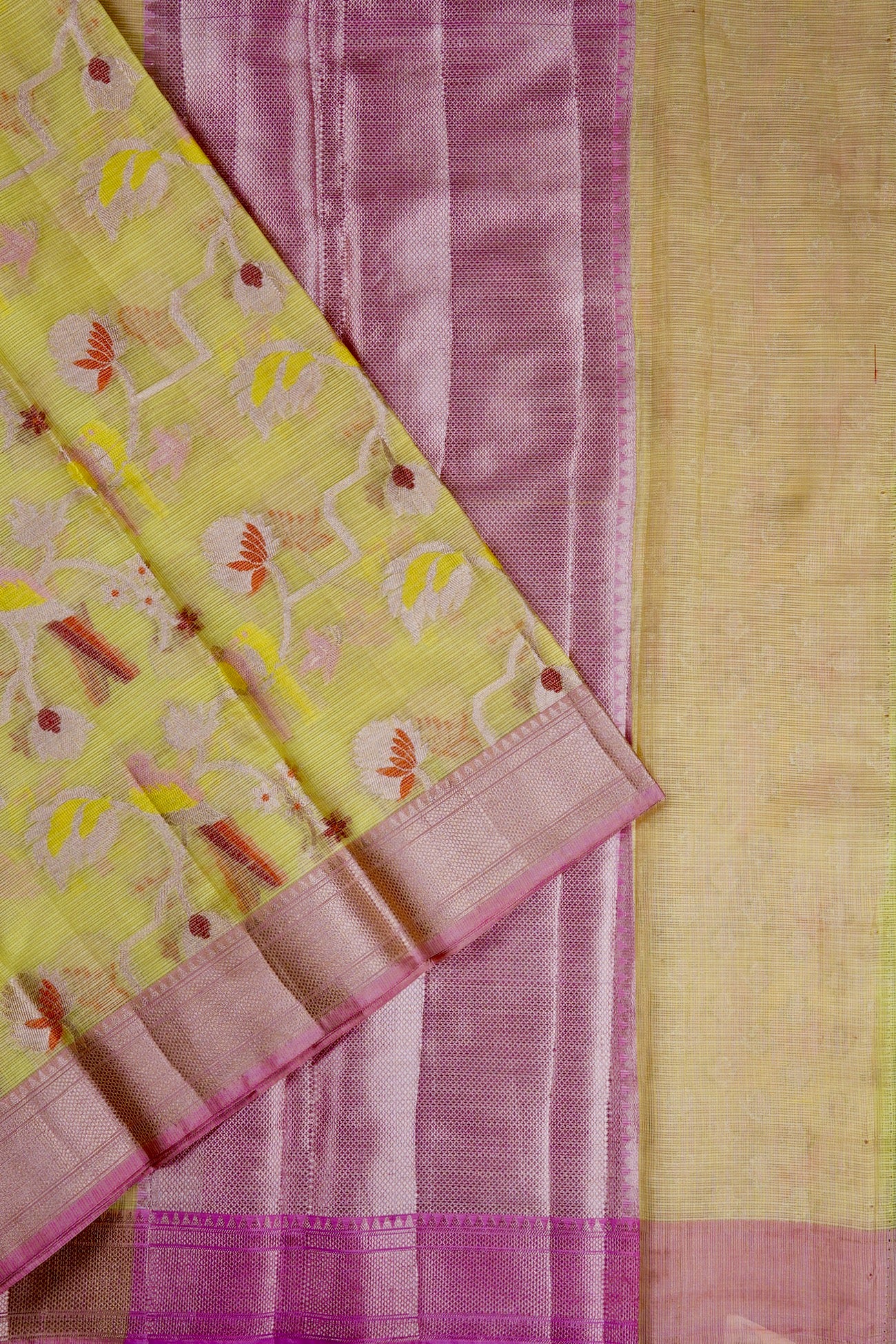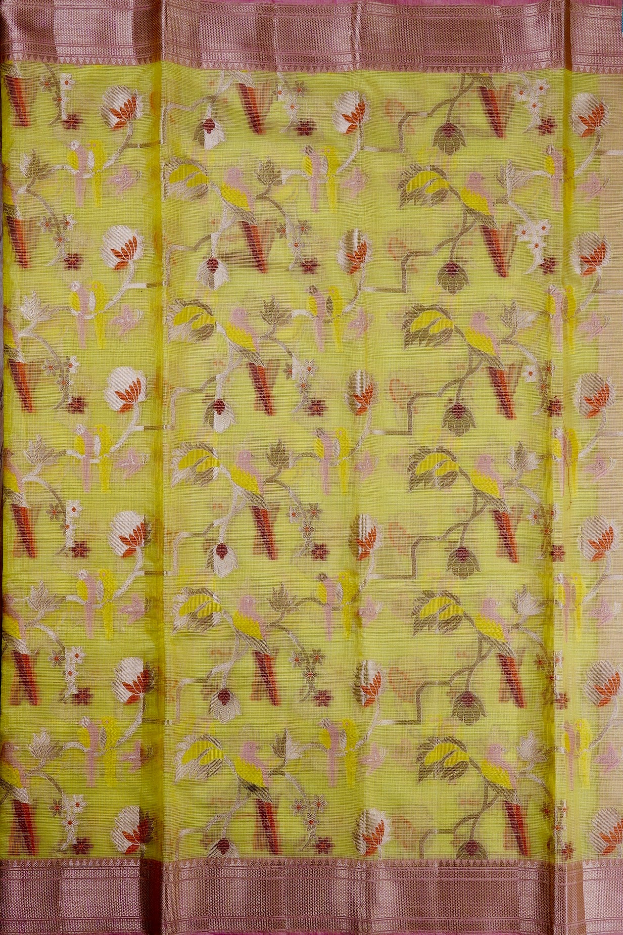 Lemon yellow semi tussar zari type saree with birds resting on tree branches woven in gold, pink, yellow and maroon threads throughout the body. The border is onion pink with intricate lattice patterns woven in zari. The pallu has an onion pink base with intricate lattice pattern woven in zari followed by a bare expanse of lemon yellow. the saree has an onion pink blouse with floral motifs woven in silver zari with the same border.
