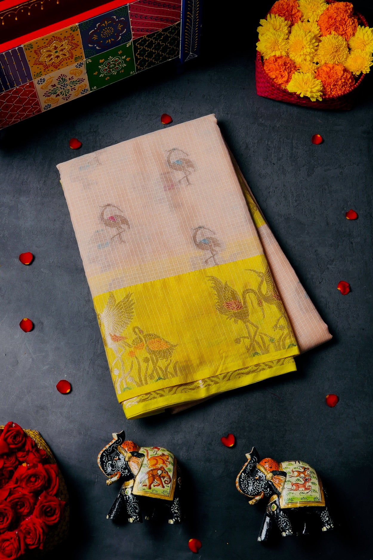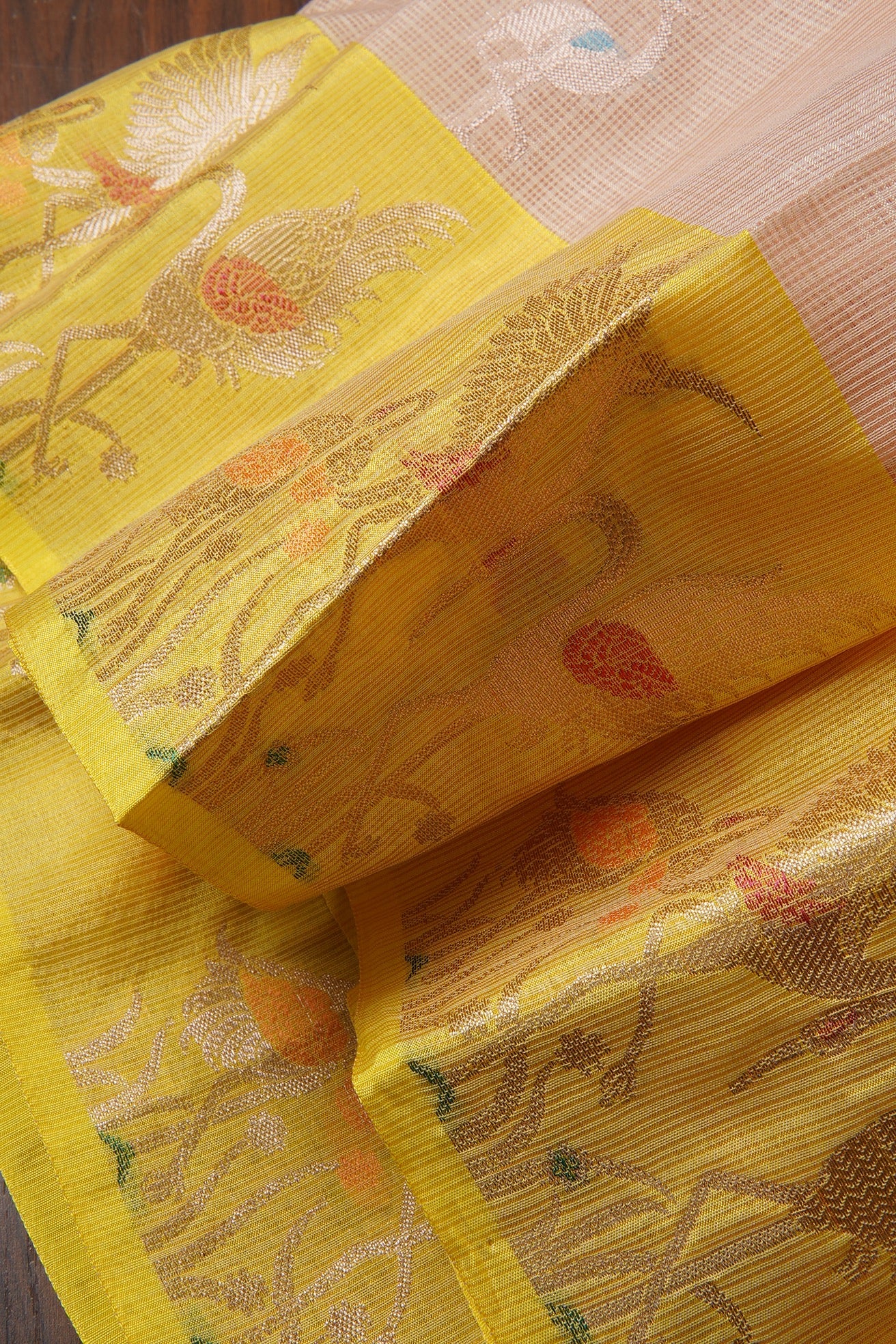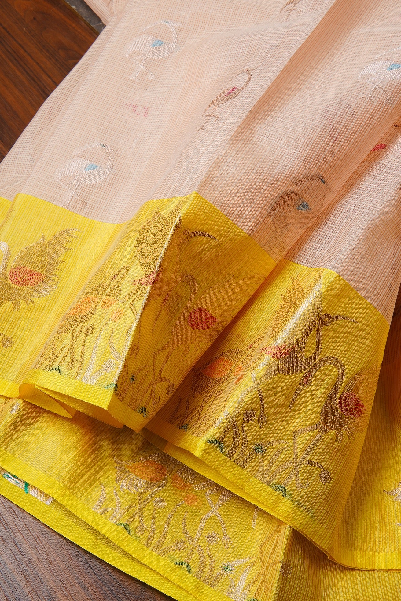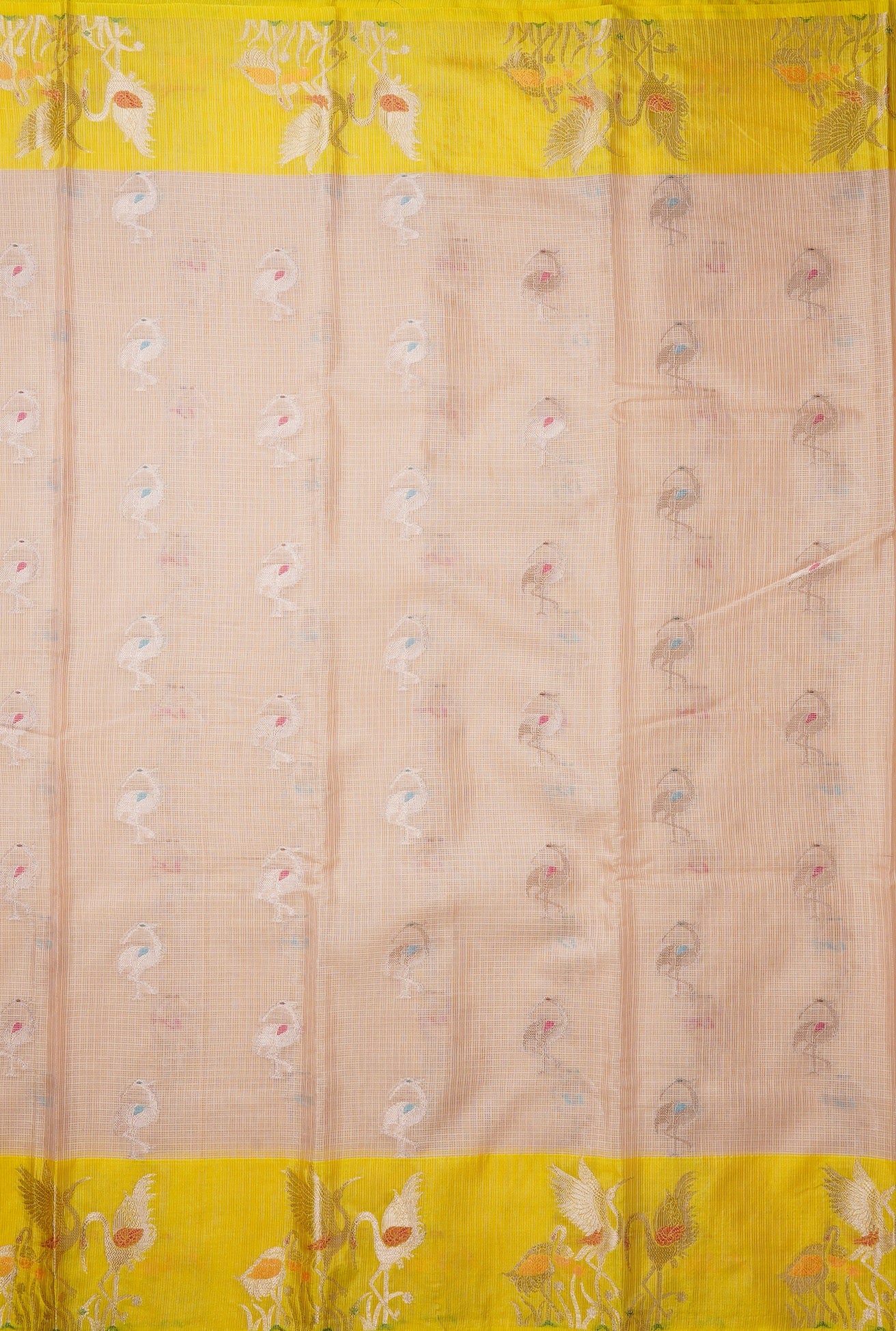 Light peach semi tussar saree with stork motifs woven in silver zari throughout the body with alternating blue and red thread embellishments to their wings. The border has a bright mustard base with motifs resembling storks standing on grass woven in silver zari. The pallu and the blouse are filled with storks woven in silver zari on a mustard base with thin leaves in between with the same border.