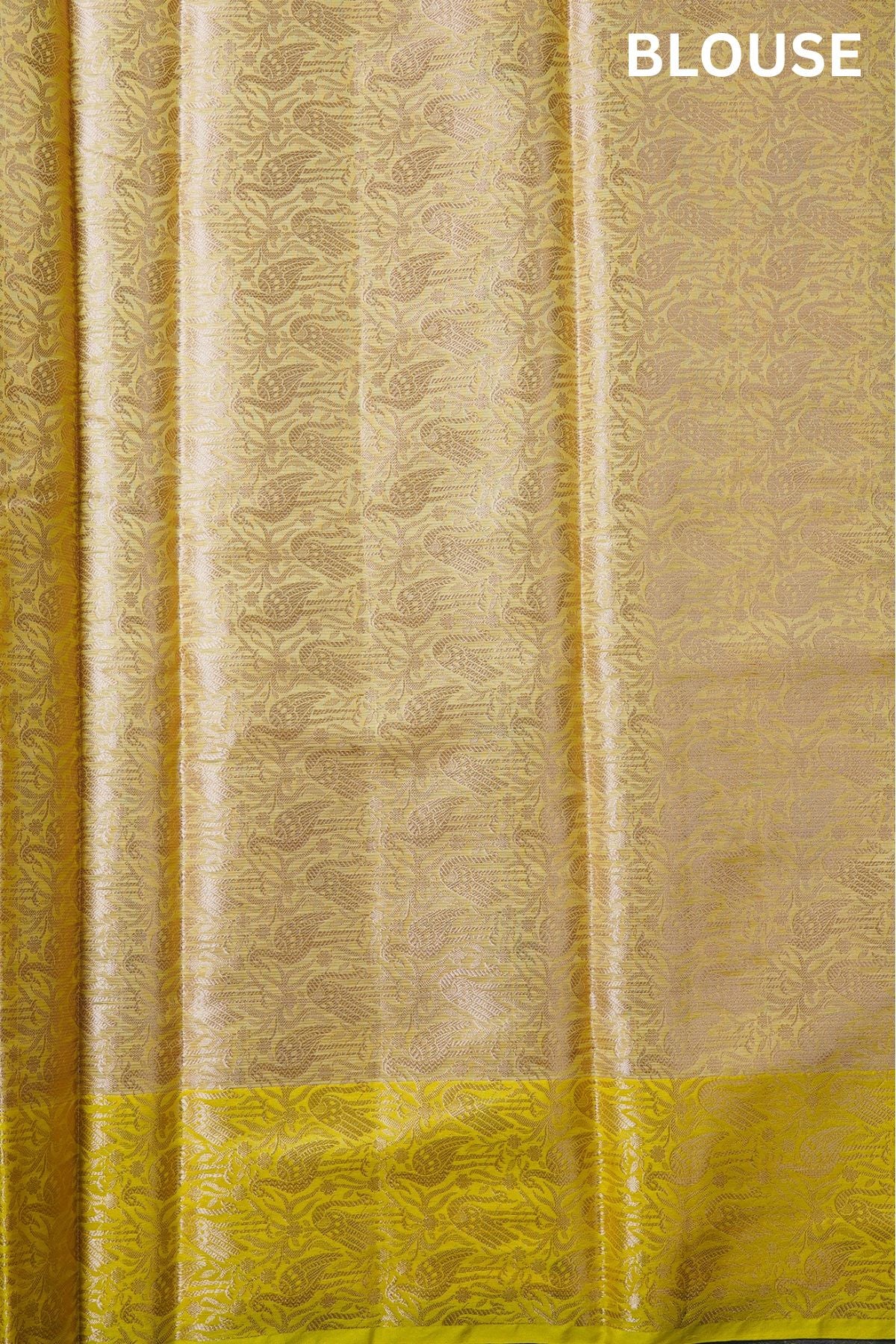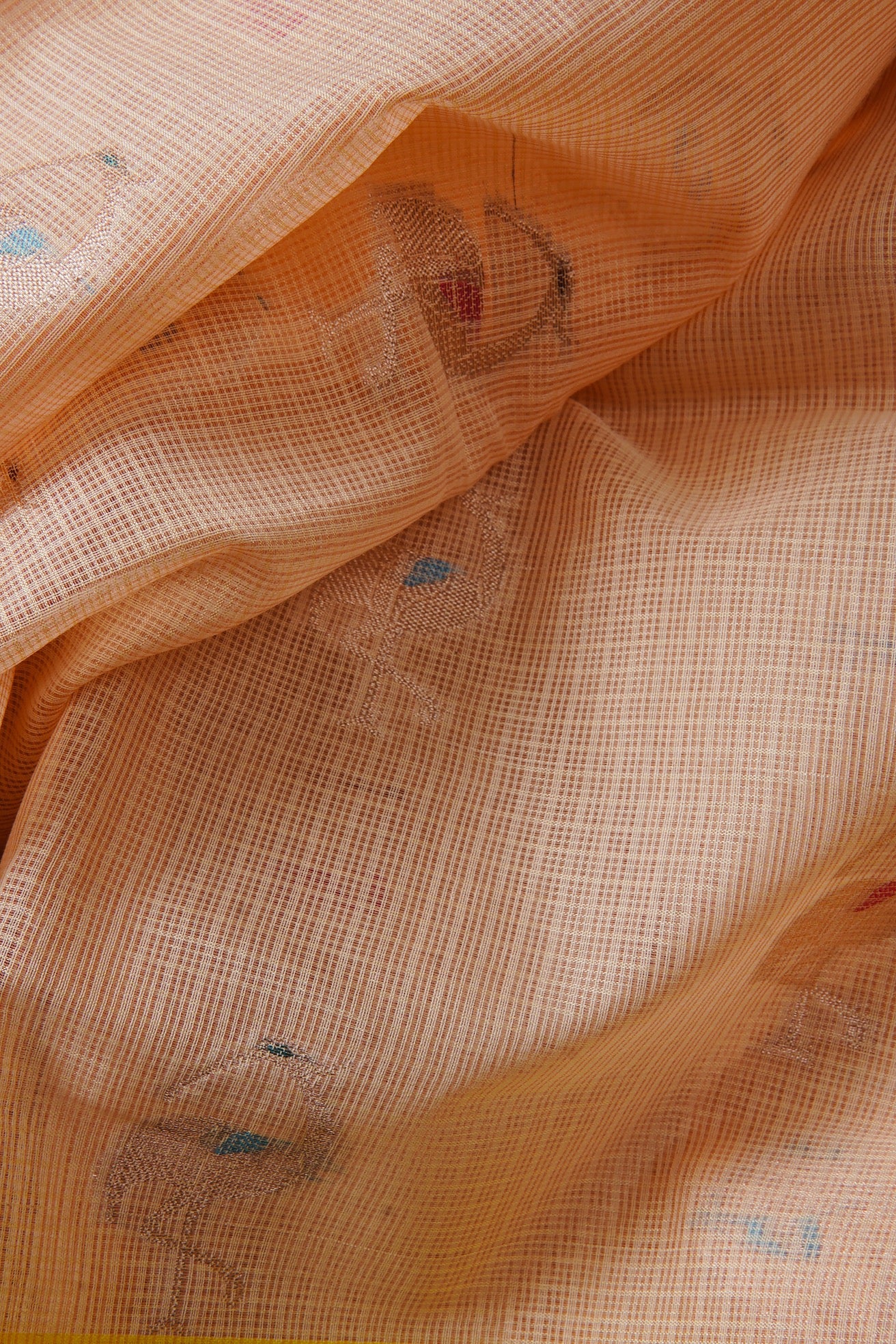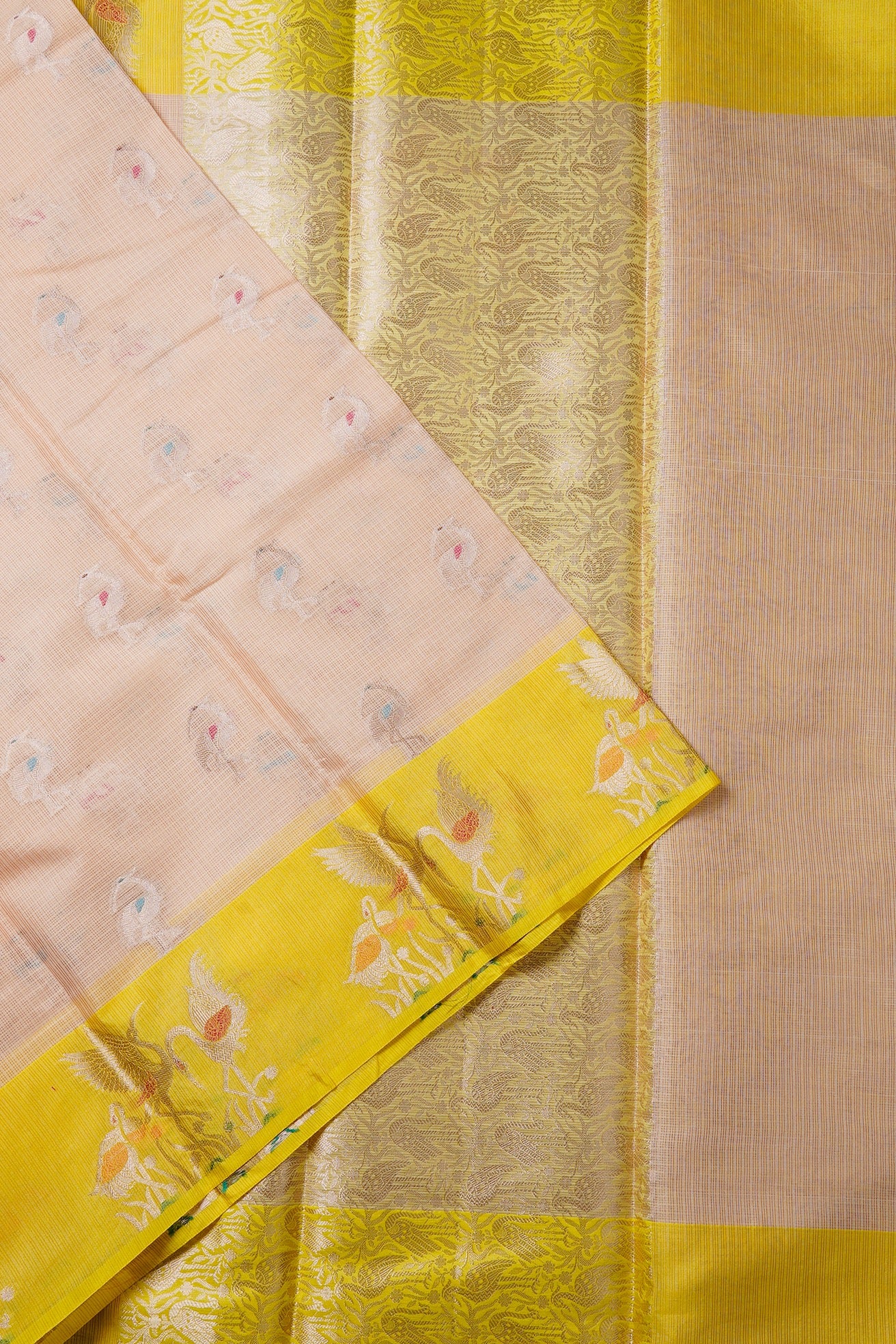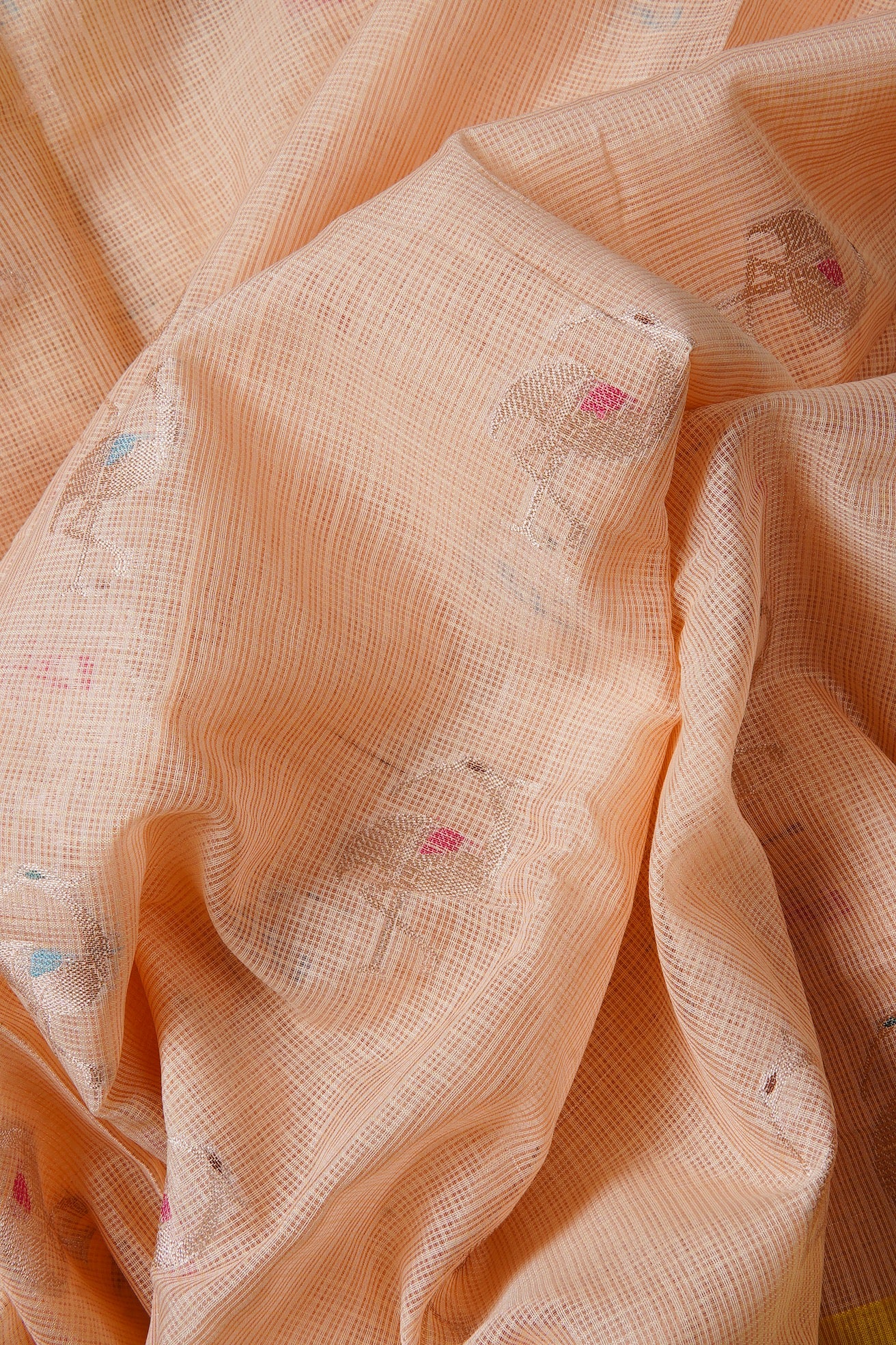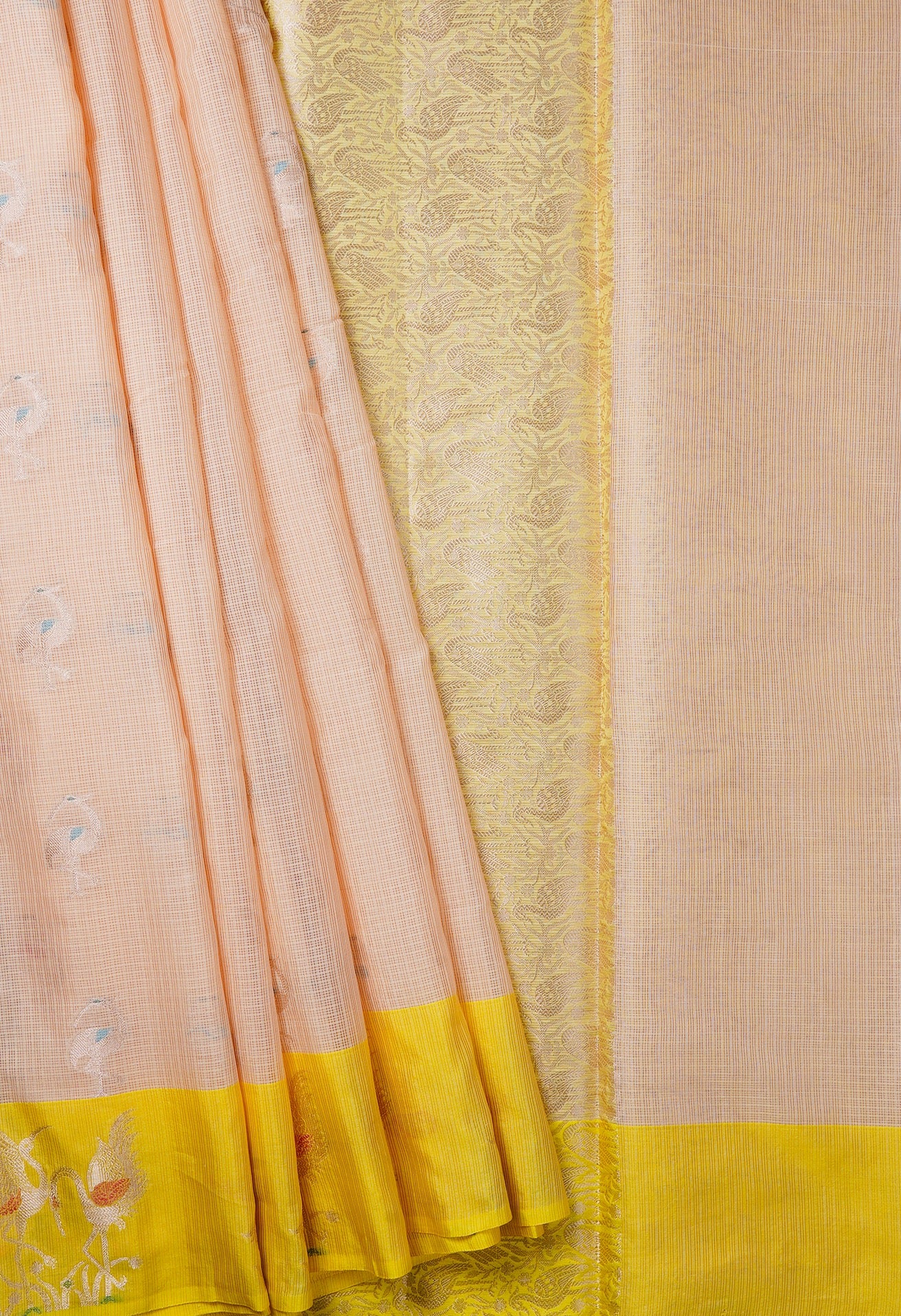 Light peach semi tussar saree with stork motifs woven in silver zari throughout the body with alternating blue and red thread embellishments to their wings. The border has a bright mustard base with motifs resembling storks standing on grass woven in silver zari. The pallu and the blouse are filled with storks woven in silver zari on a mustard base with thin leaves in between with the same border.