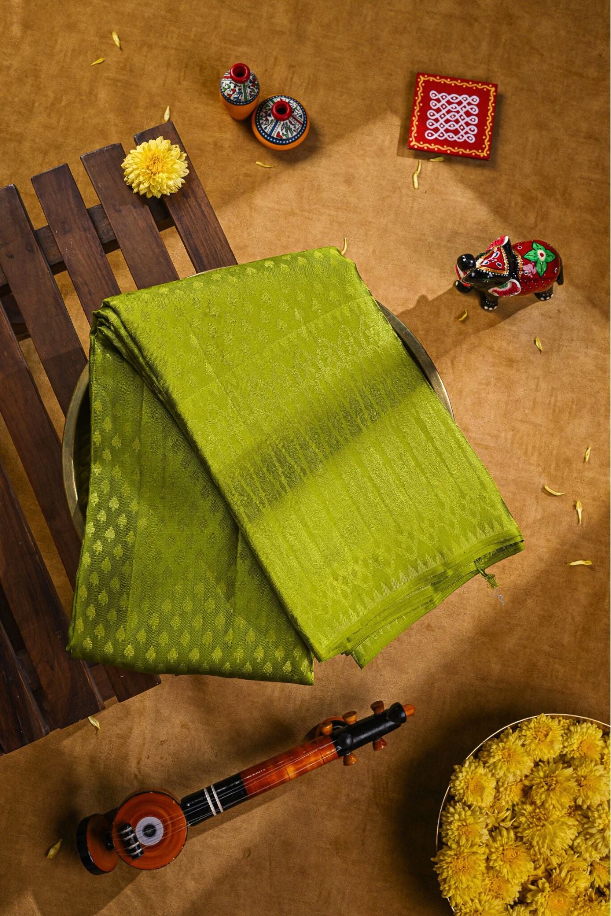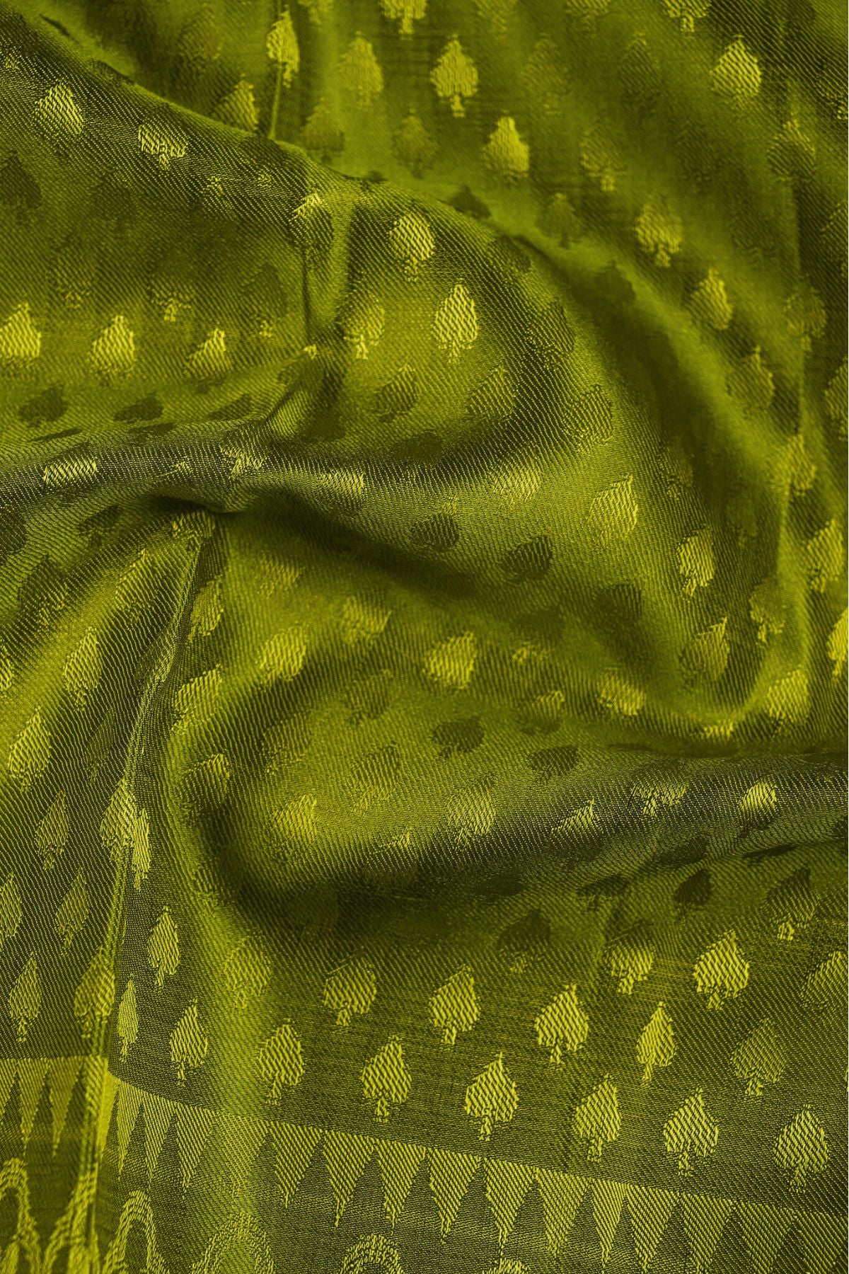 Lime Green Kanchipuram Saree with embossed threadwork, paired with a "mystery" pallu woven in a realistic fashion.