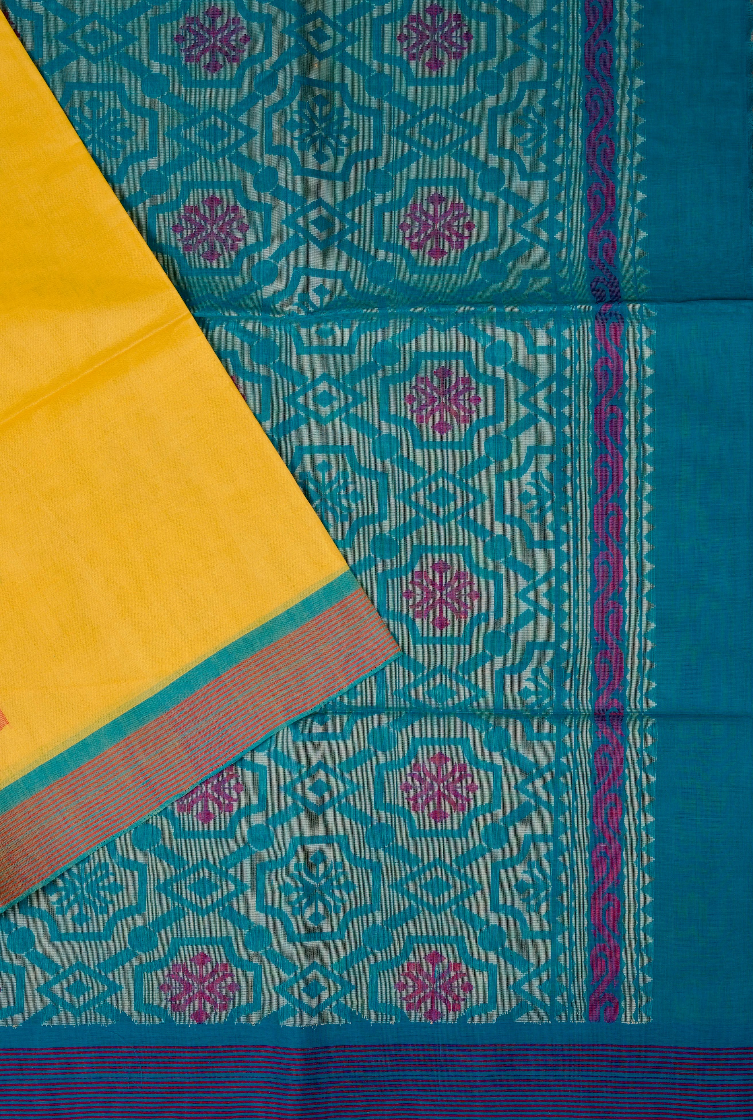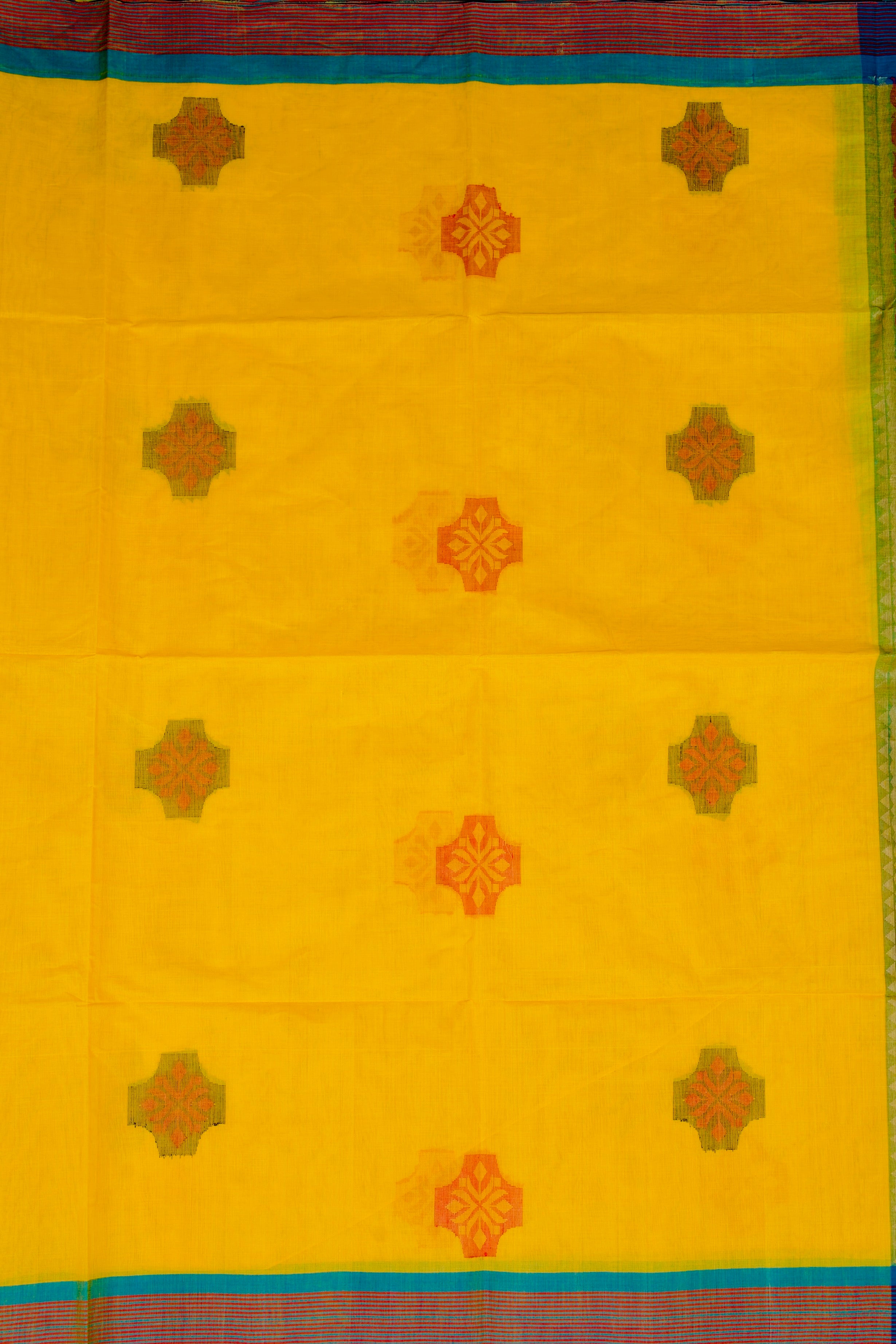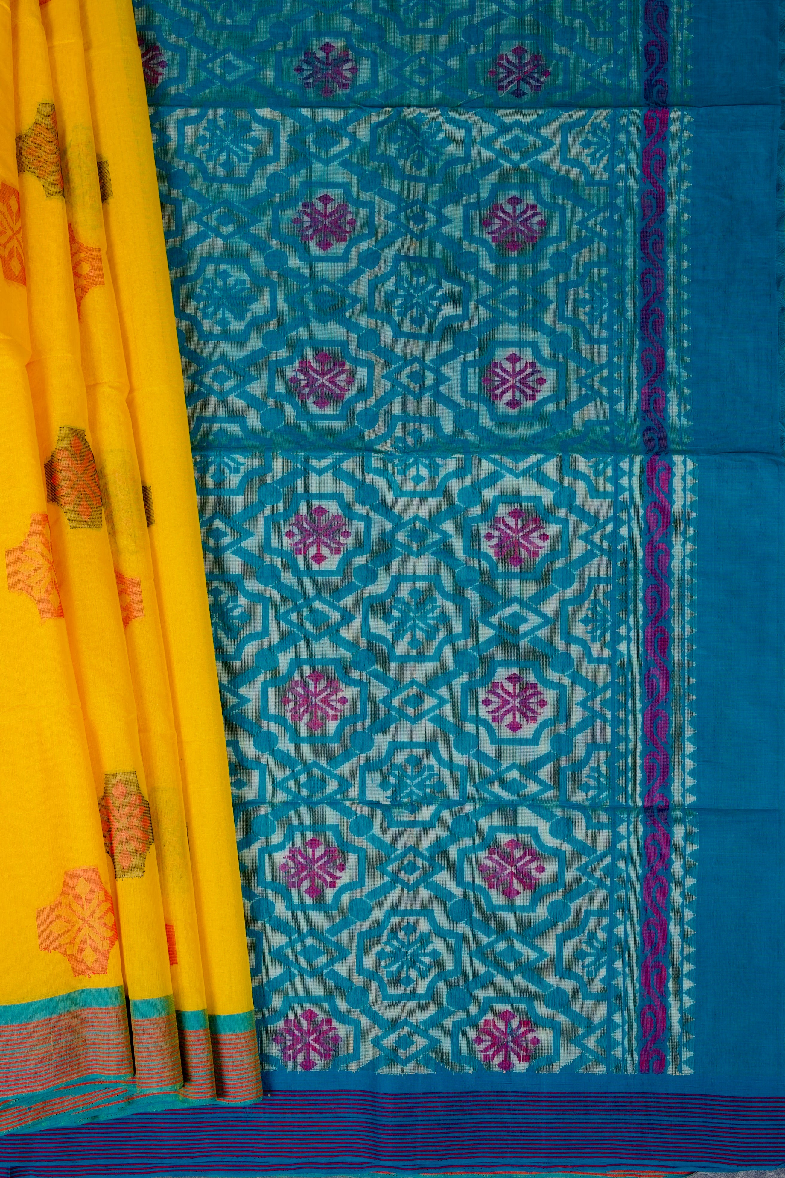 Yellow cotton saree with floral buttas enclosed by geometric frames woven in red and leaf green. The border starts with a band of light blue followed by horizontal red stripes on peacock blue. The pallu has a vast lattice pattern enclosing floral butta-frames and connecting geometric patterns in woven in blue, purple and gold zari, followed by simple triangular and kodi patterns. The saree has a plain peaock blue blouse with the same border.