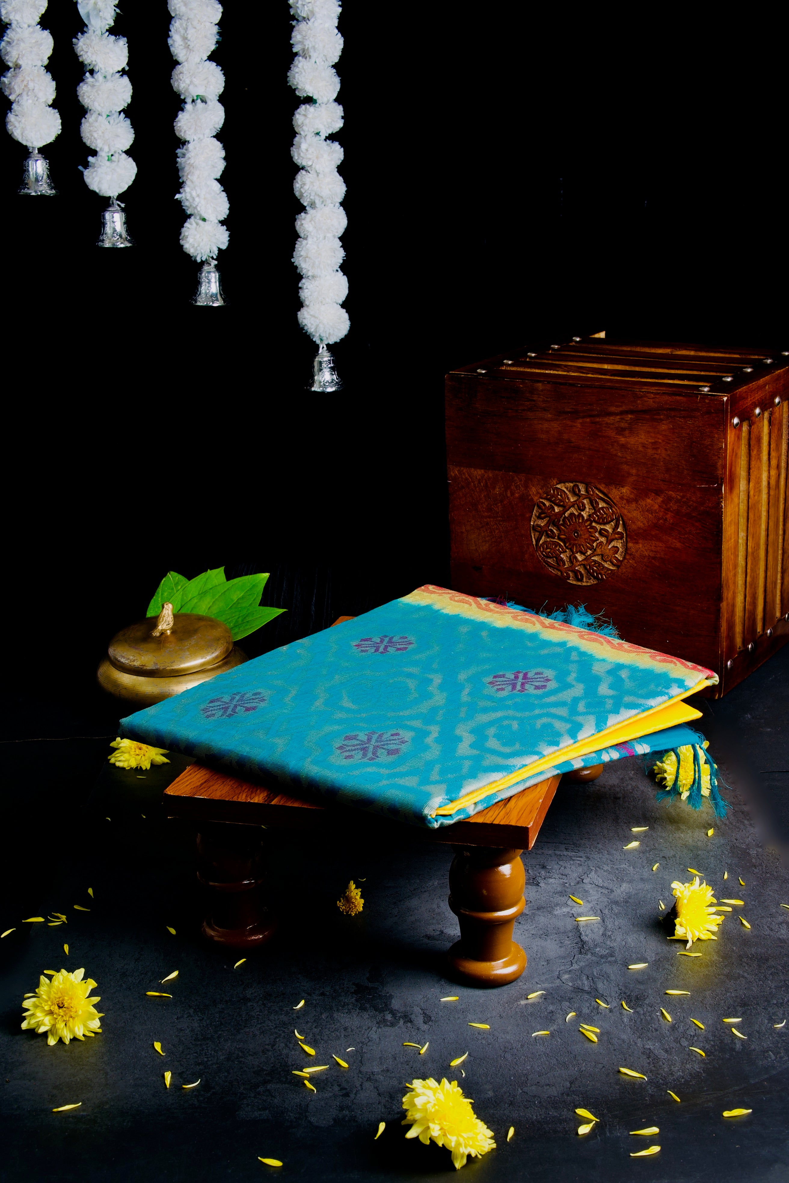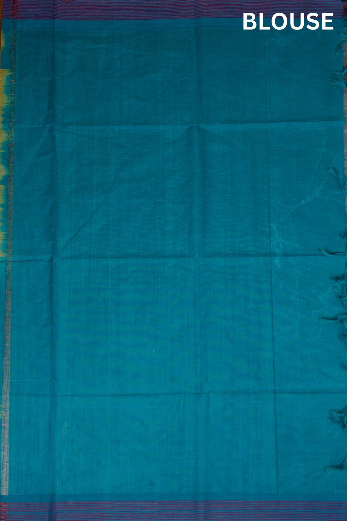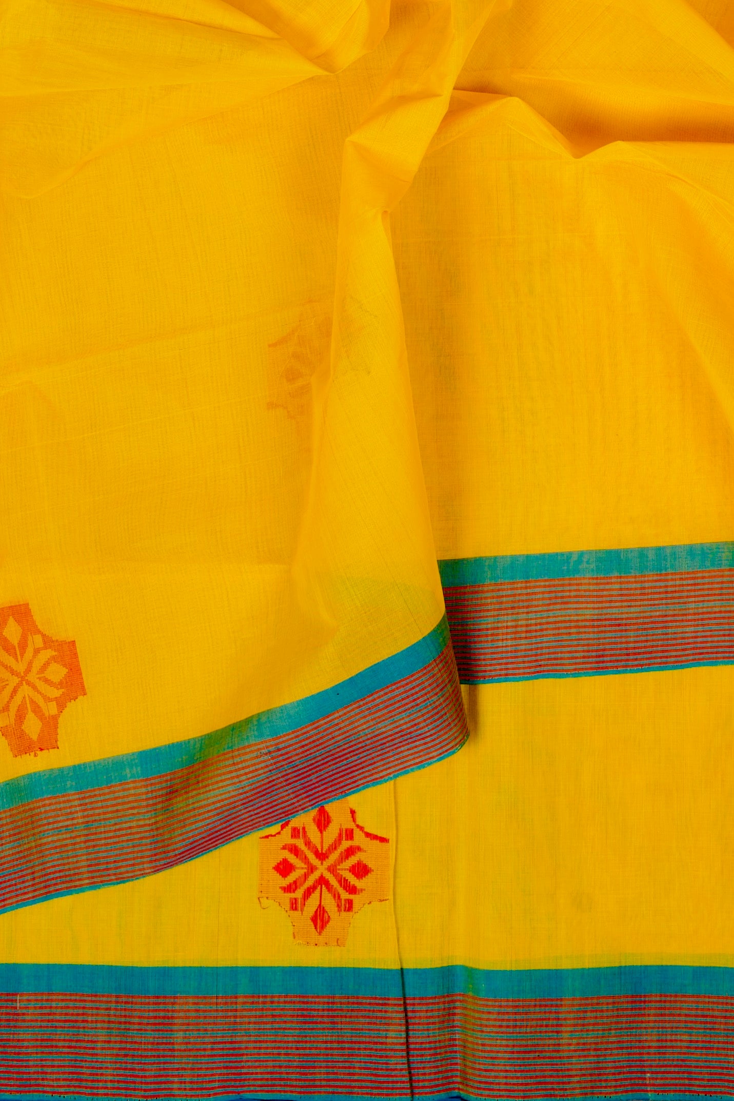 Yellow cotton saree with floral buttas enclosed by geometric frames woven in red and leaf green. The border starts with a band of light blue followed by horizontal red stripes on peacock blue. The pallu has a vast lattice pattern enclosing floral butta-frames and connecting geometric patterns in woven in blue, purple and gold zari, followed by simple triangular and kodi patterns. The saree has a plain peaock blue blouse with the same border.