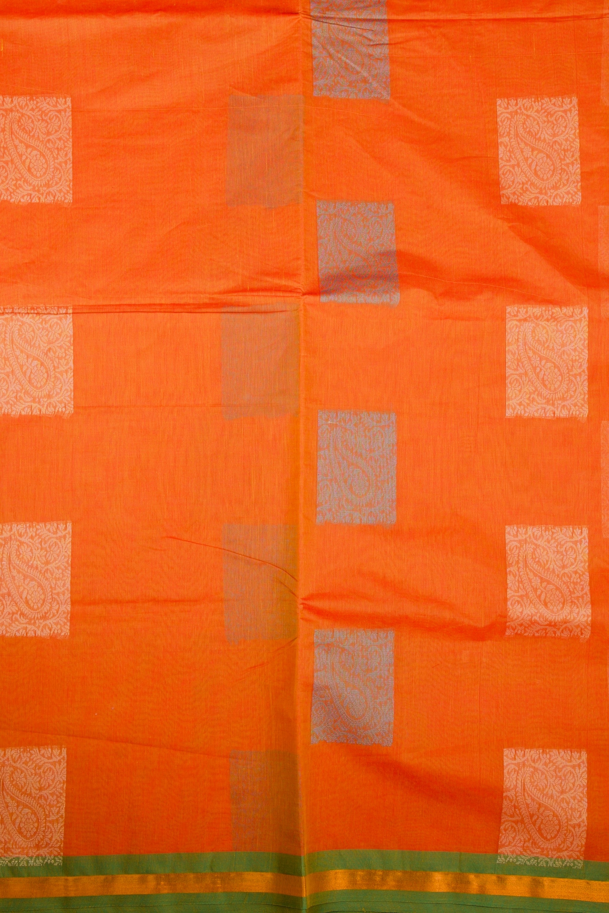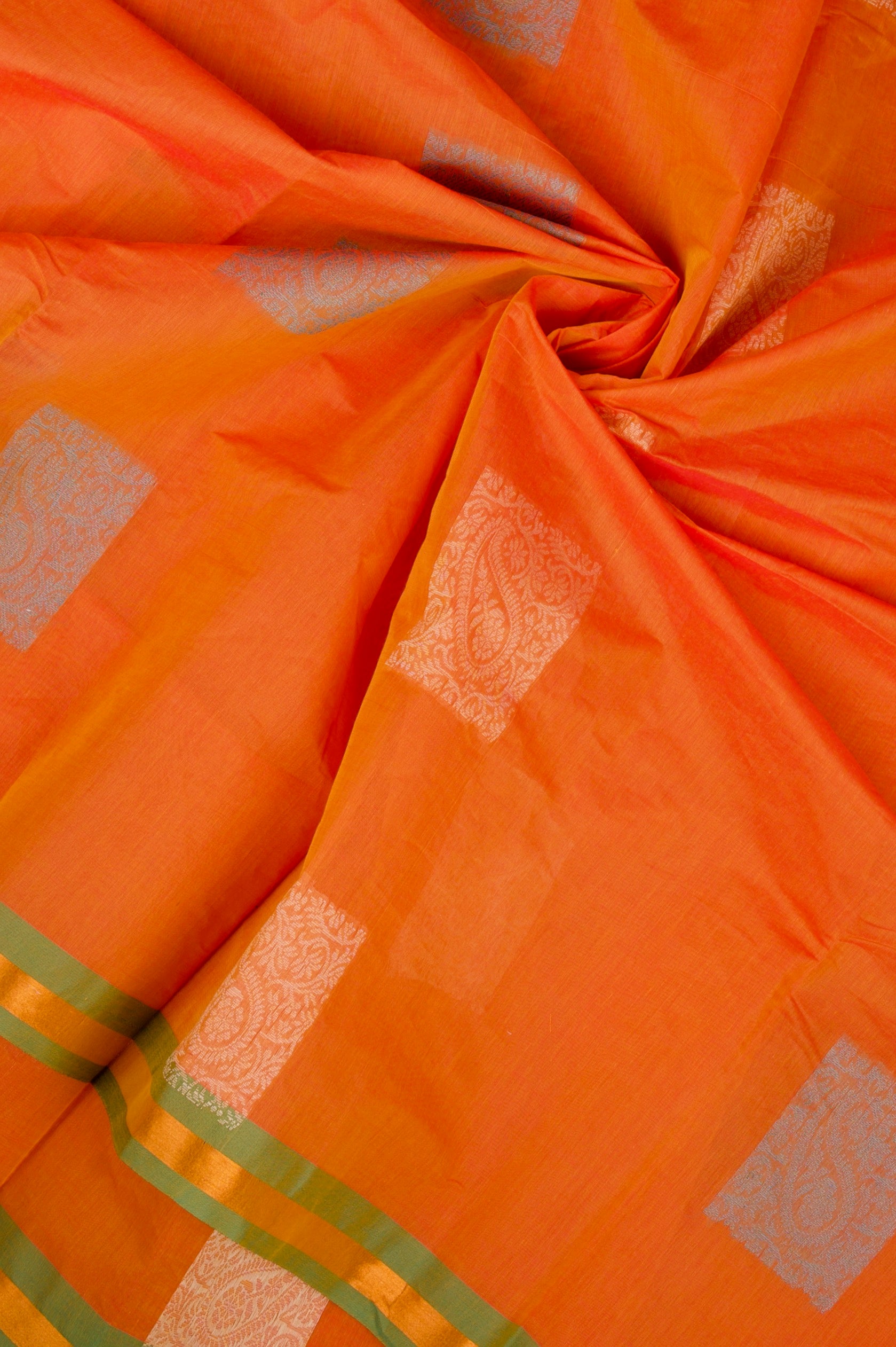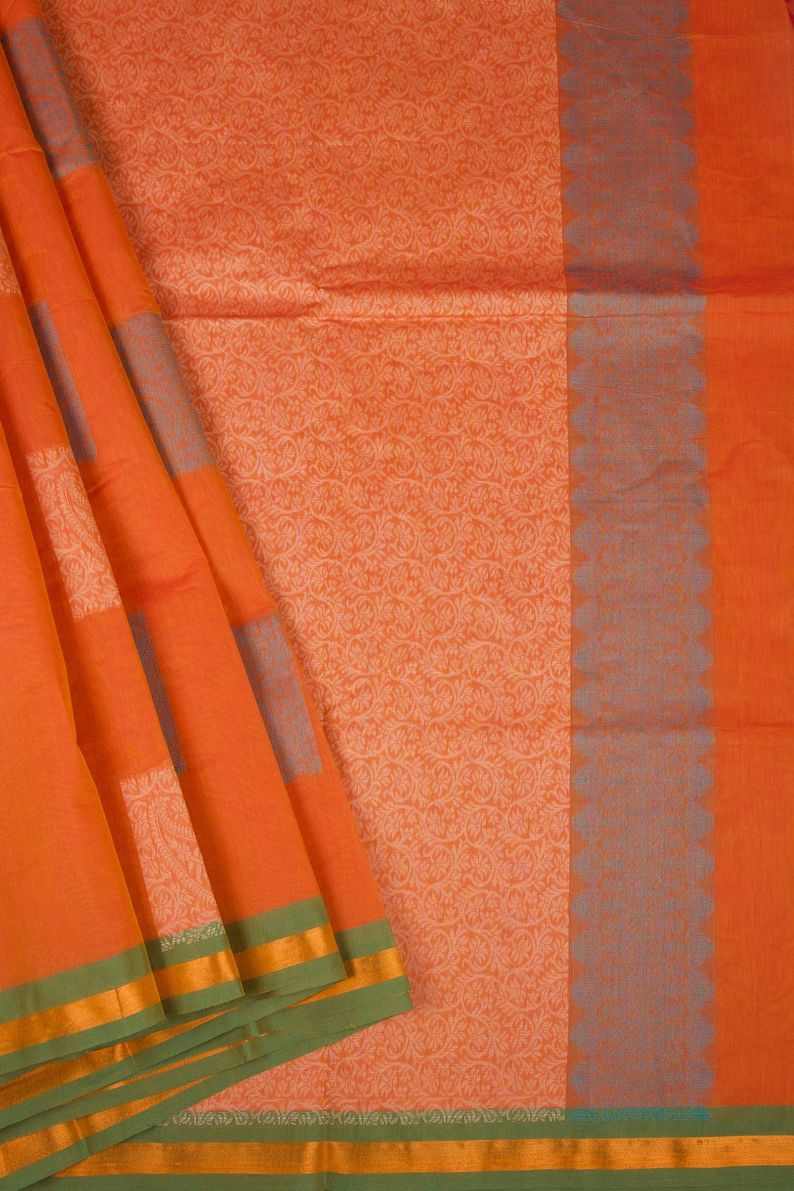 An orange cotton saree with frames of intricate motifs engulfing mango buttas and kodi pattern woven alternativey in silver-gold zari and slate blue over the body. The border is a golden zari band bordered by two leaf green bands. The pallu is intricately woven in silver-gold zari portraying a wide band of continuous kodi pattern, ending with a band of motifs woven in slate blue. The saree has a plain orange blouse with the same border.