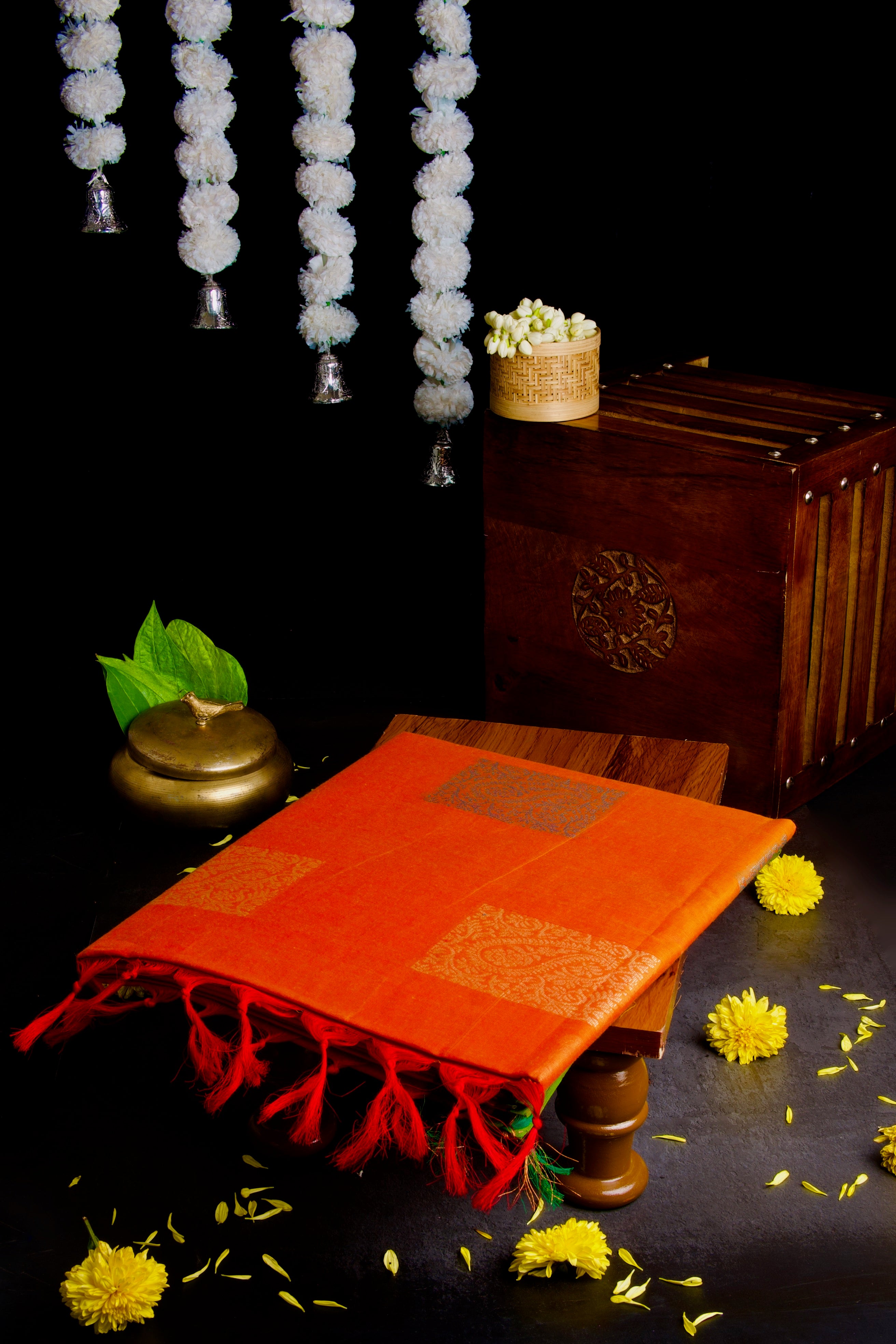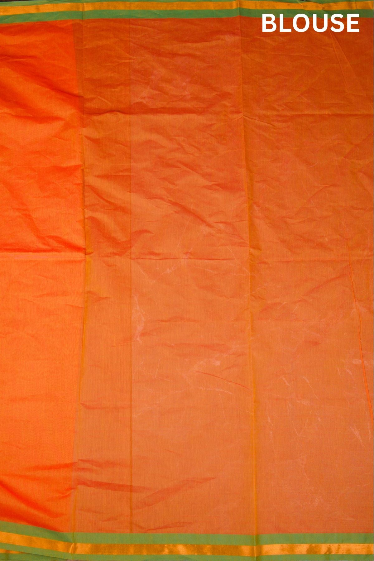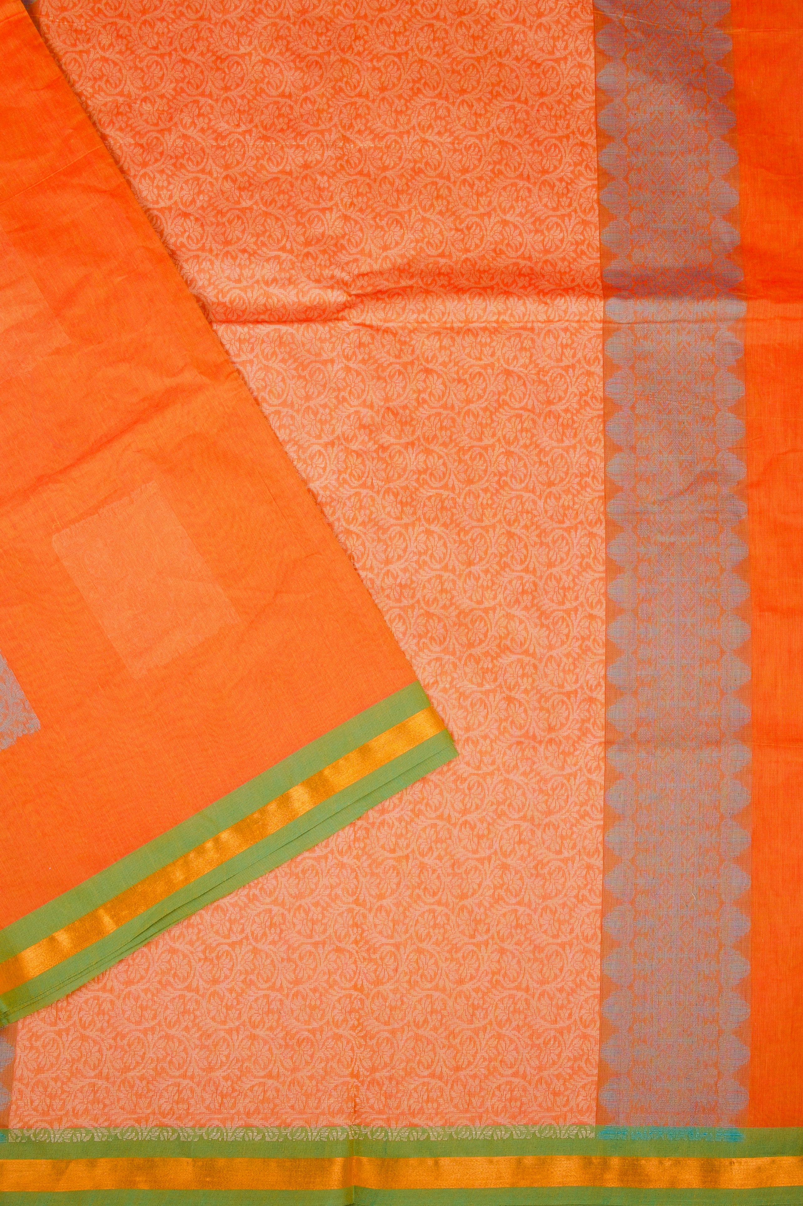 An orange cotton saree with frames of intricate motifs engulfing mango buttas and kodi pattern woven alternativey in silver-gold zari and slate blue over the body. The border is a golden zari band bordered by two leaf green bands. The pallu is intricately woven in silver-gold zari portraying a wide band of continuous kodi pattern, ending with a band of motifs woven in slate blue. The saree has a plain orange blouse with the same border.