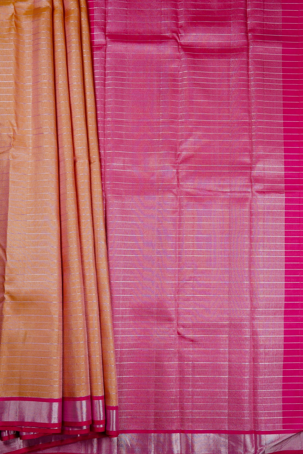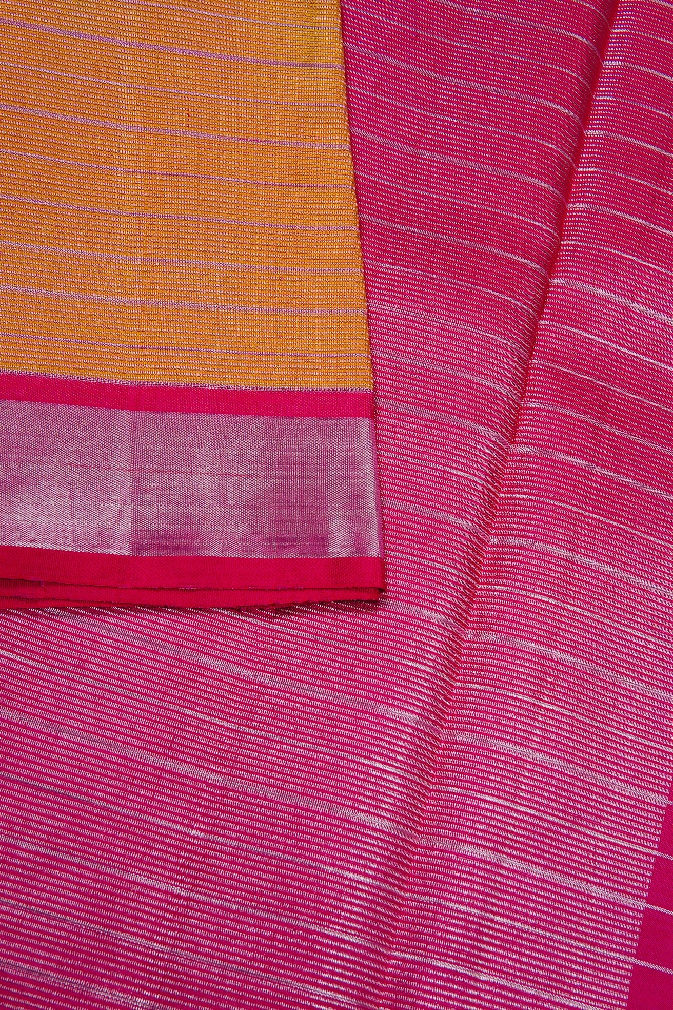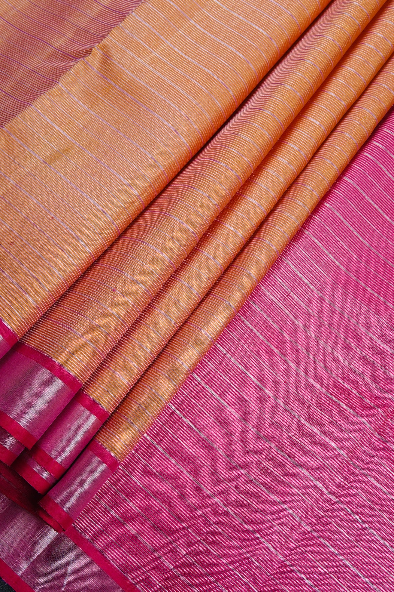 Orange Kanchipuram Silk Saree with vertical stripes and bands woven in silver zari with a hot pink border holding a band of silver zari. The pallu has a hot pink base with a silver under tone and horizontal zari lines running across. The saree has a hot pink blouse with horizontal silver zari stripes and the same border.