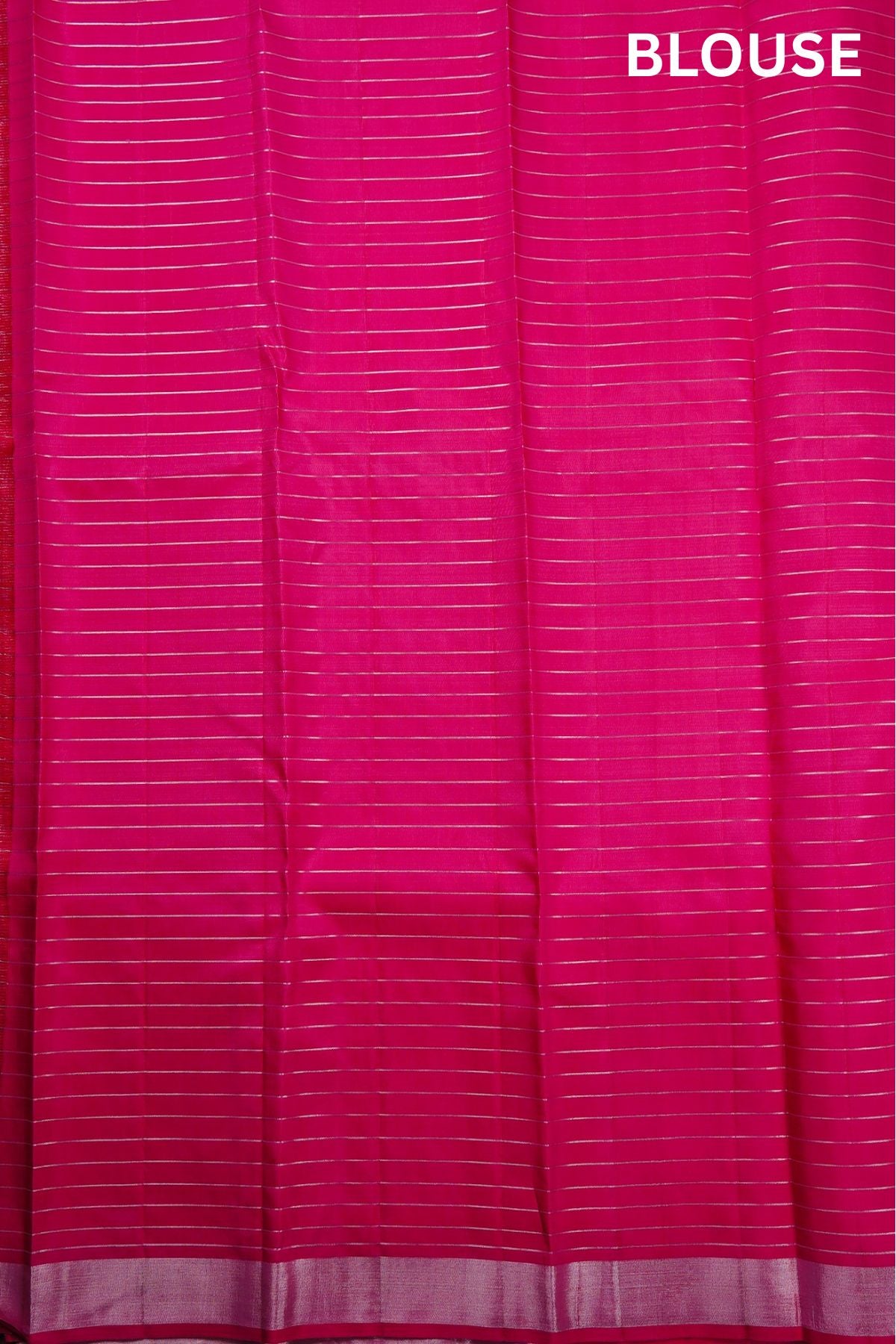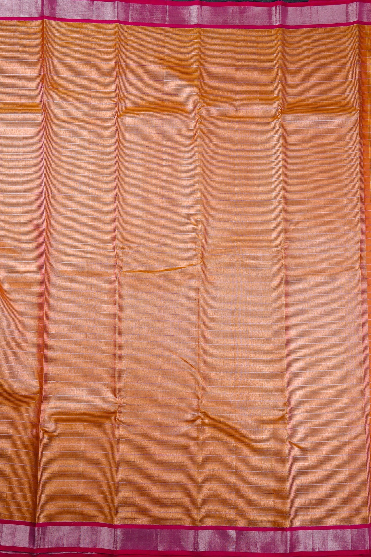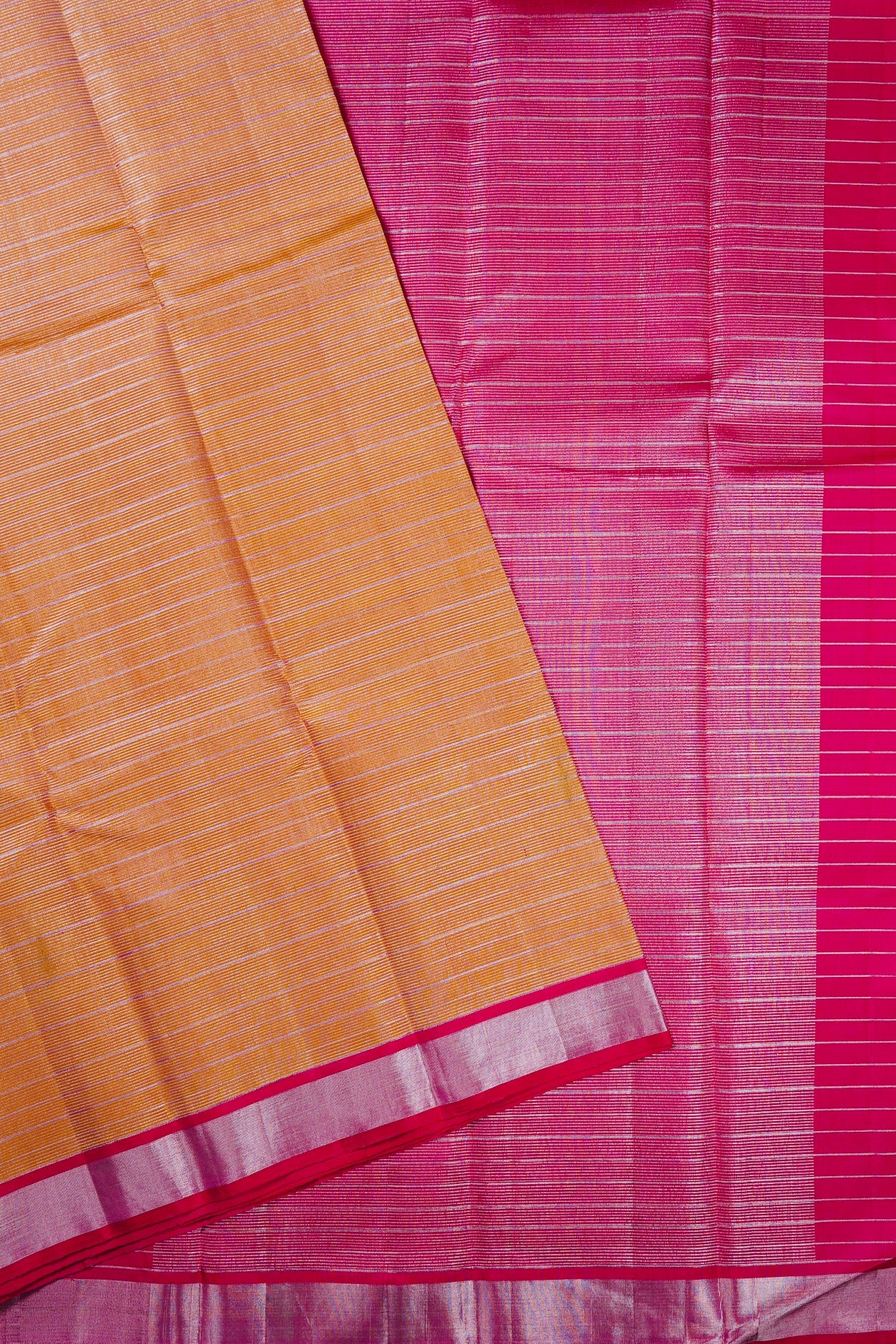 Orange Kanchipuram Silk Saree with vertical stripes and bands woven in silver zari with a hot pink border holding a band of silver zari. The pallu has a hot pink base with a silver under tone and horizontal zari lines running across. The saree has a hot pink blouse with horizontal silver zari stripes and the same border.