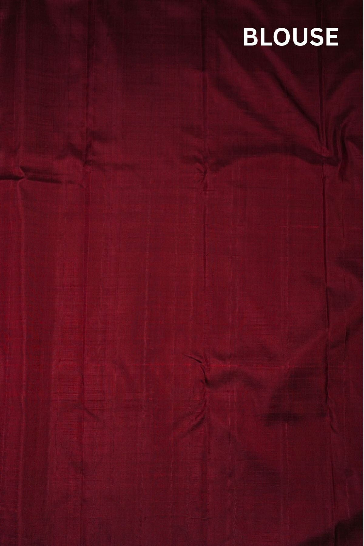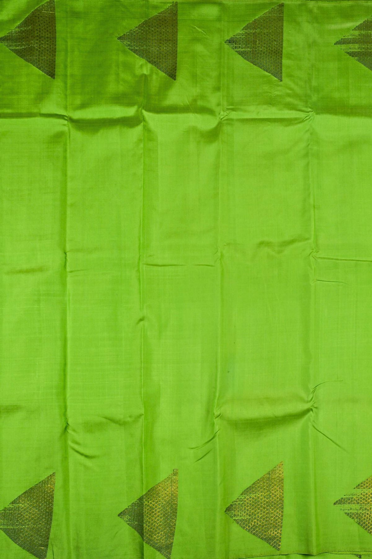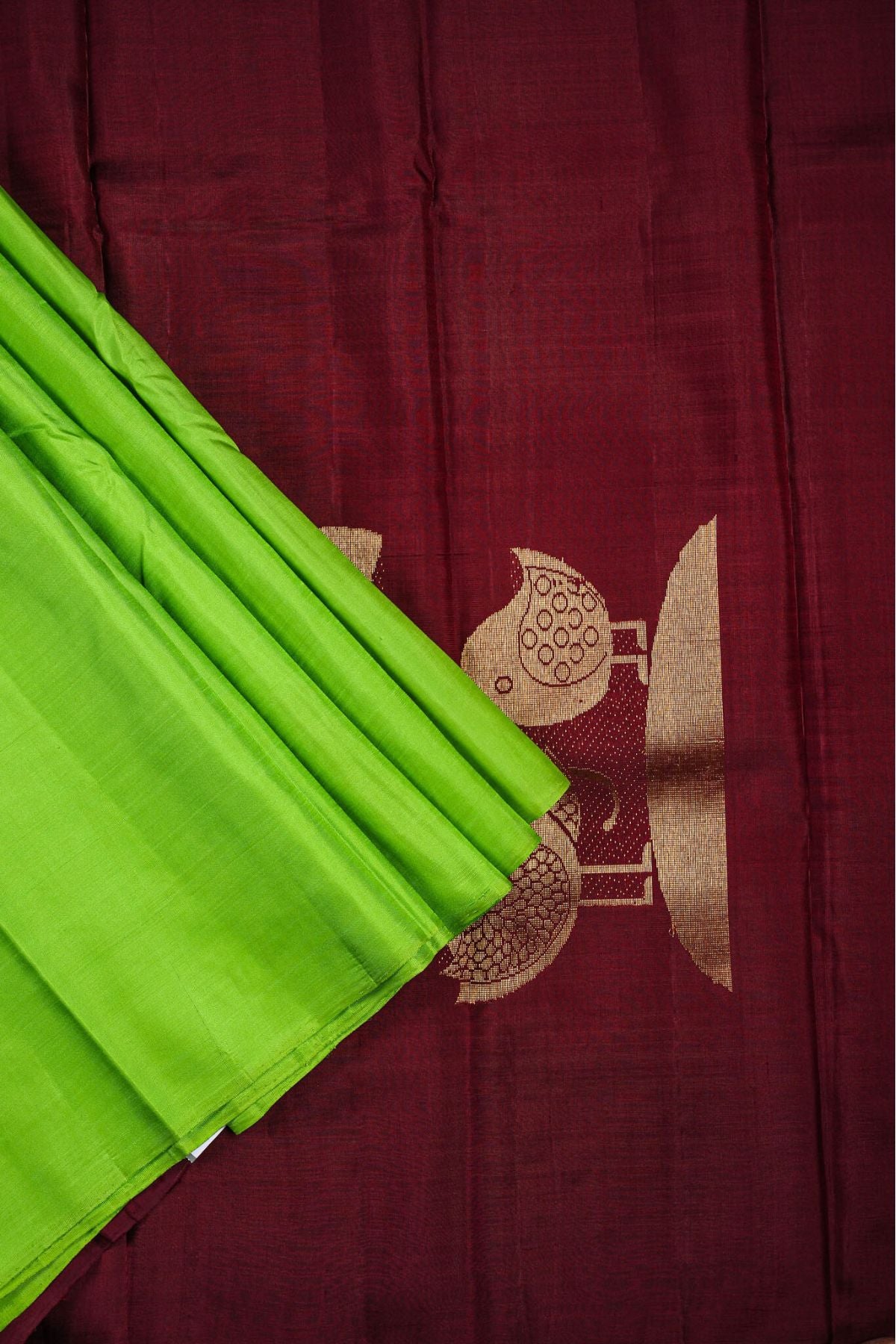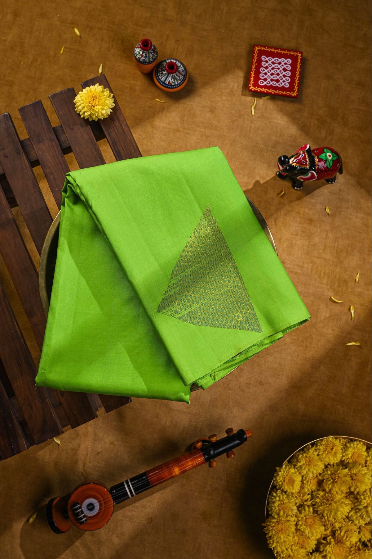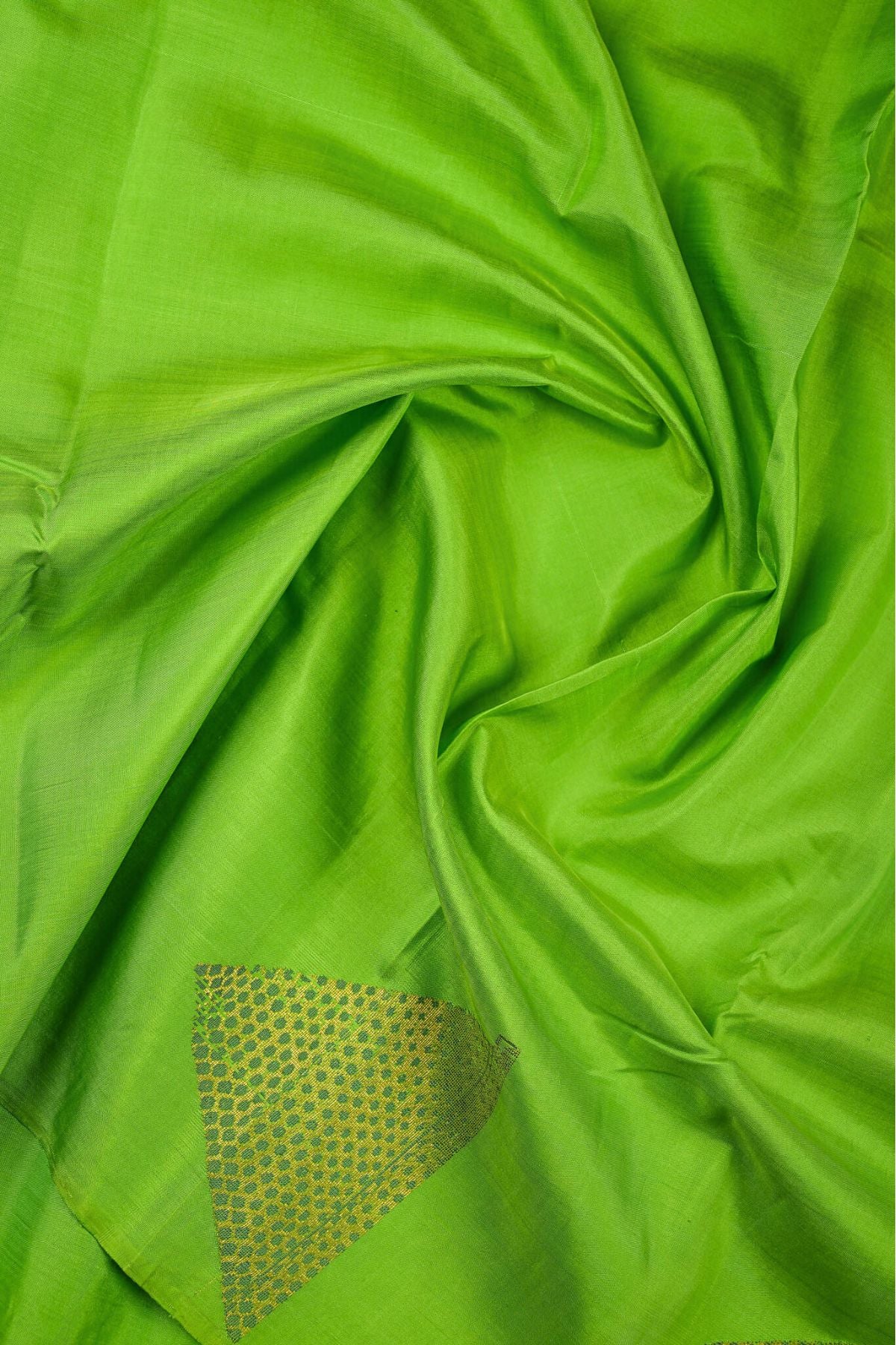 Parrot green kanchipuram silk saree with intricately woven Mukonam motifs in gold zari. Magenta pallu woven with anime inspired bird motifs. The saree comes with a plain magenta purple blouse.