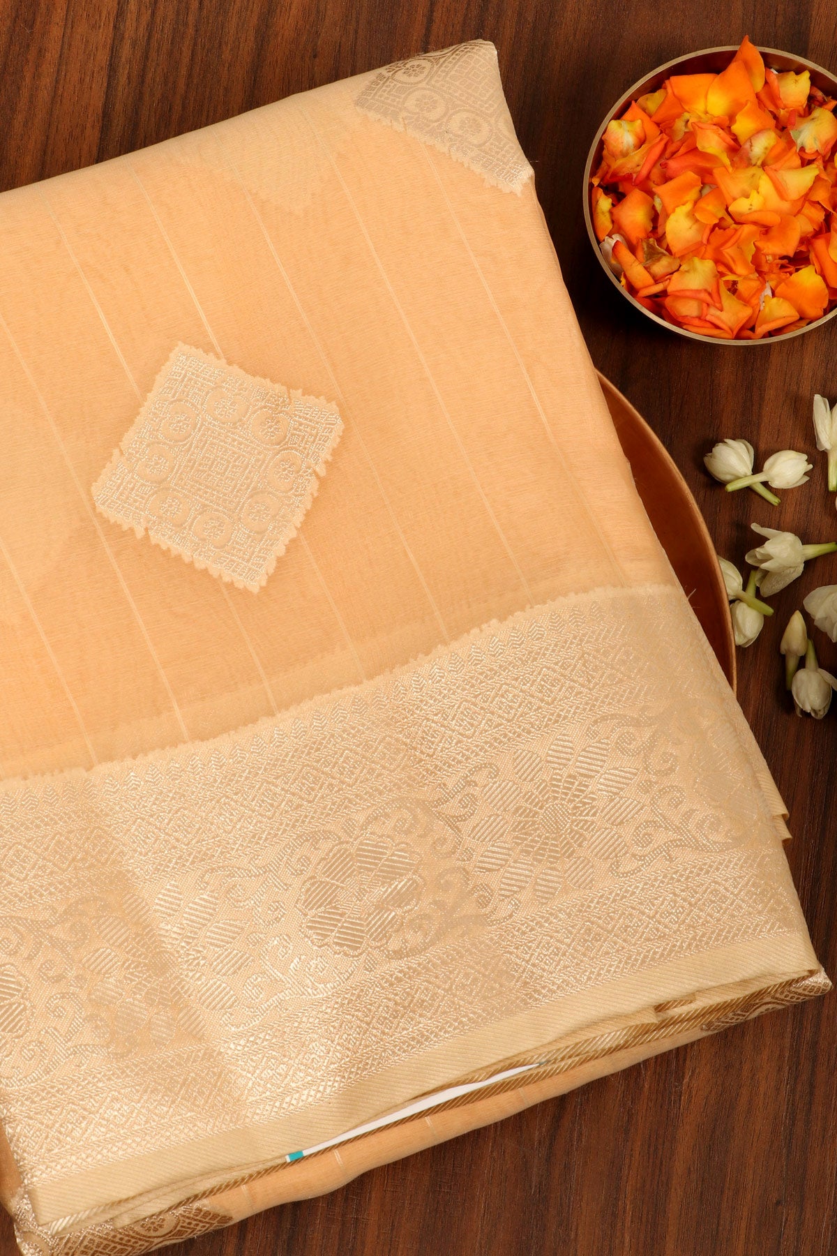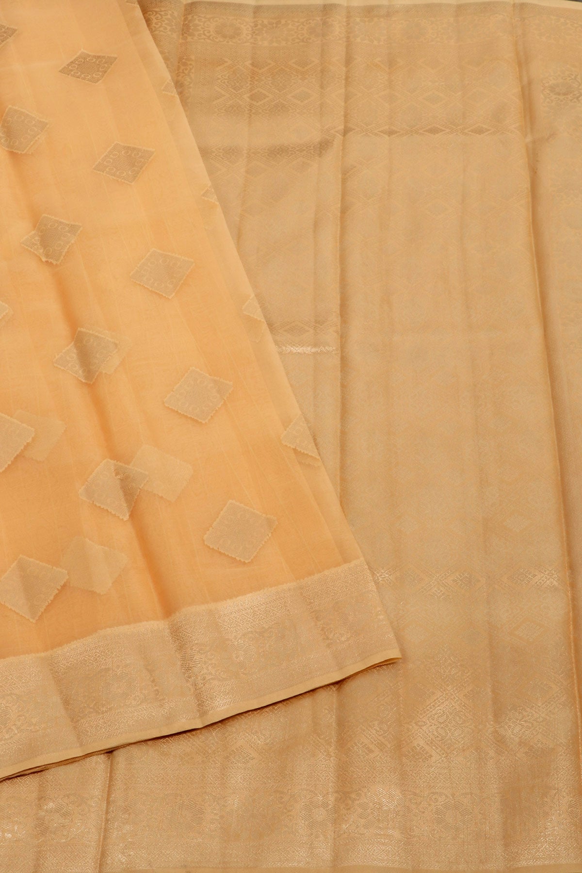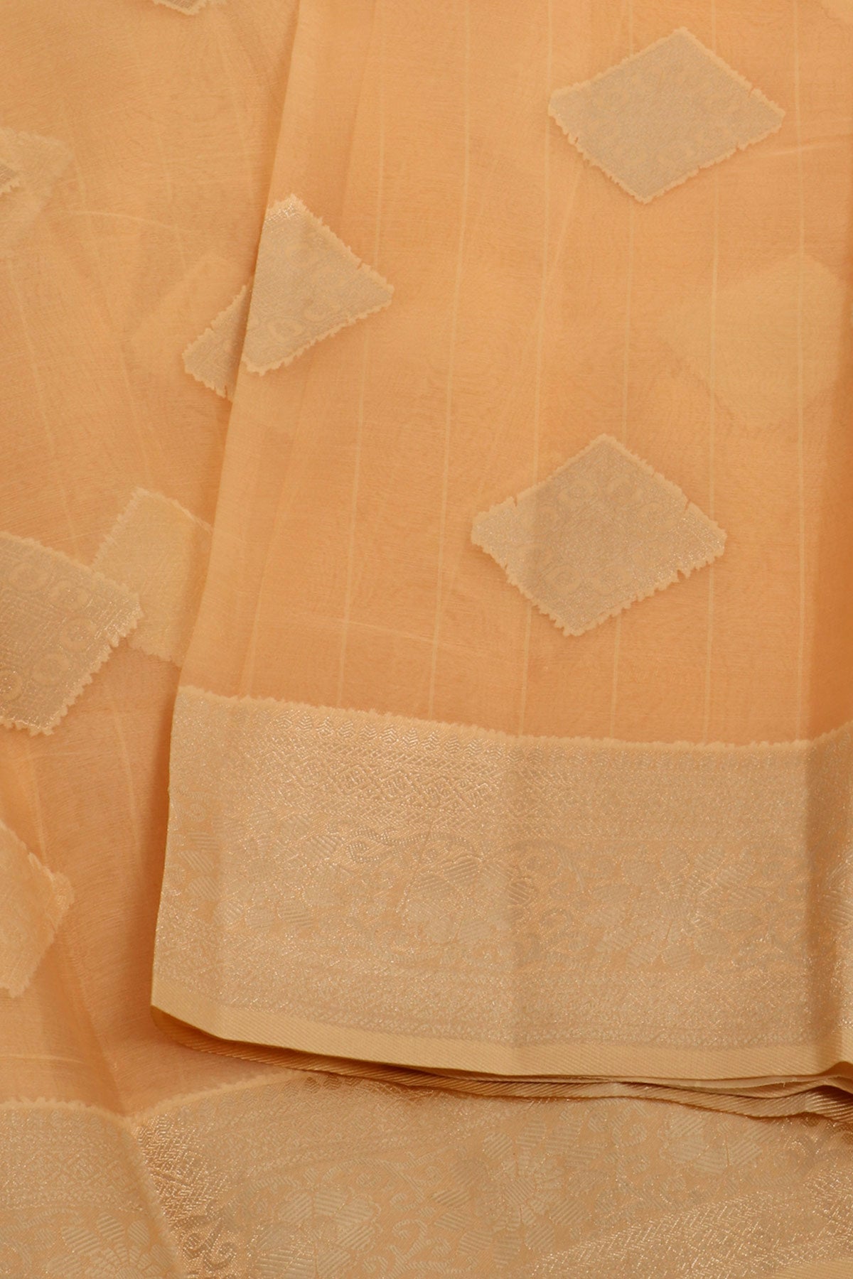Peach semi organza saree with a contrast beige border with silver zari. The body carries elegant diamond bhuttas in silver zari.