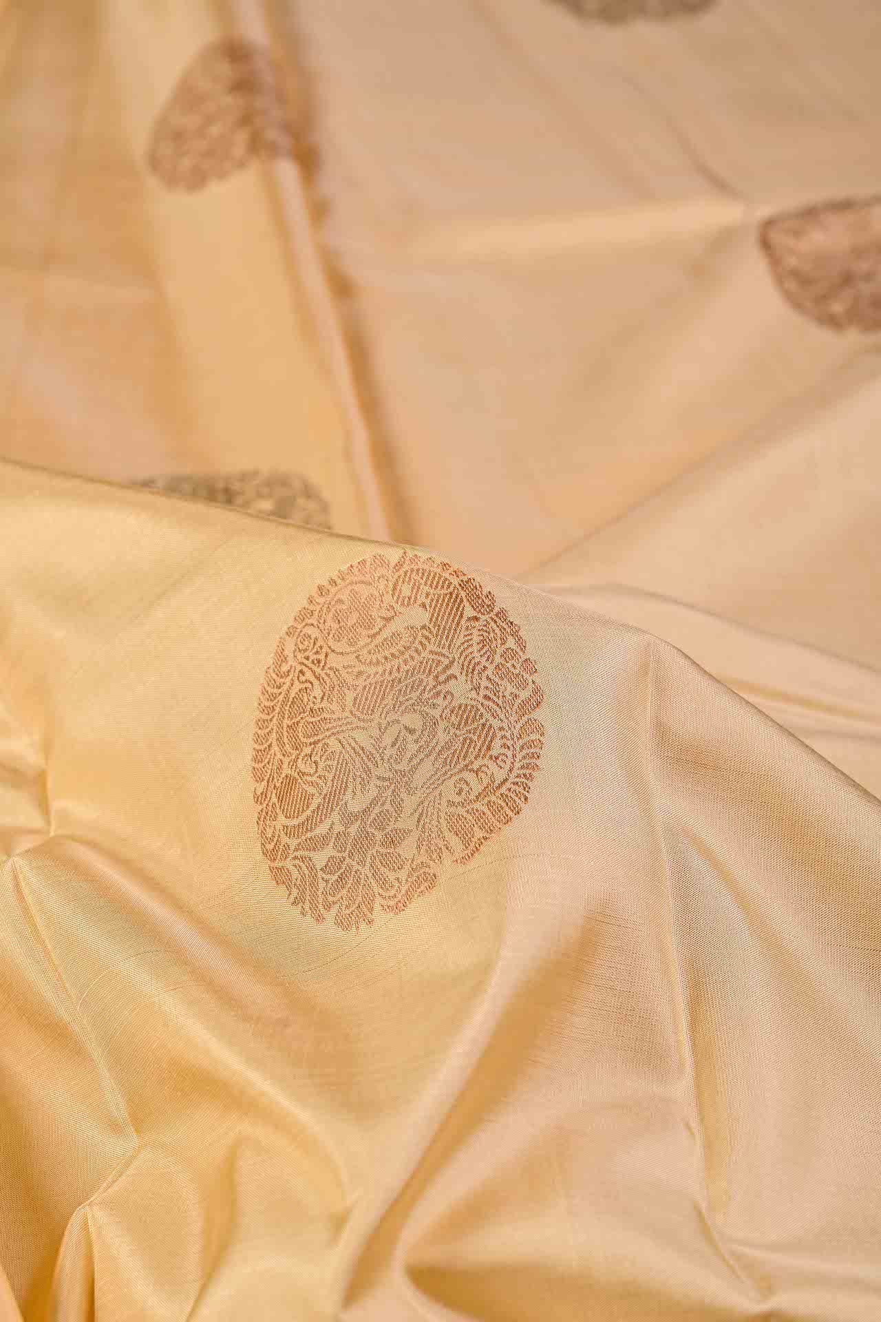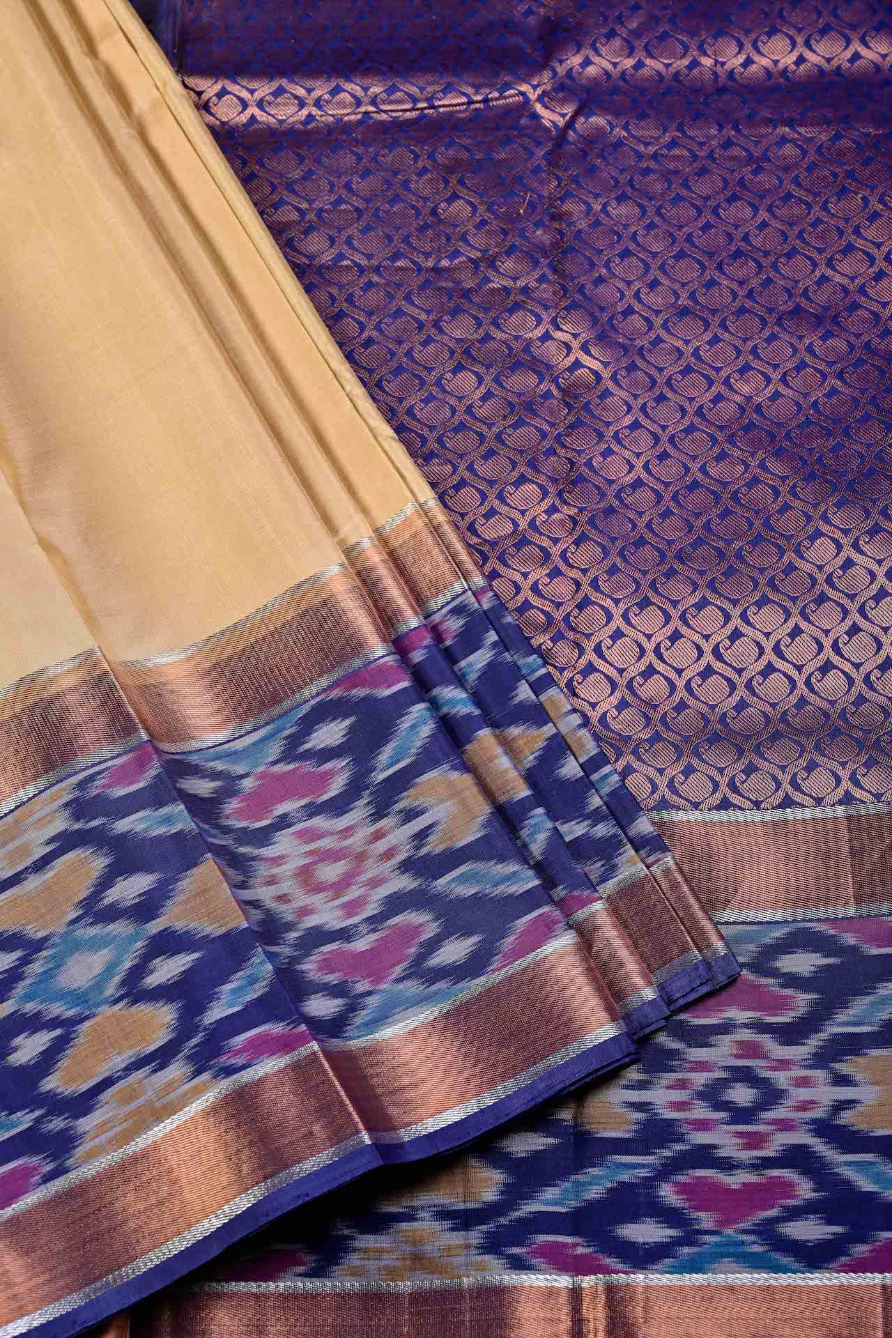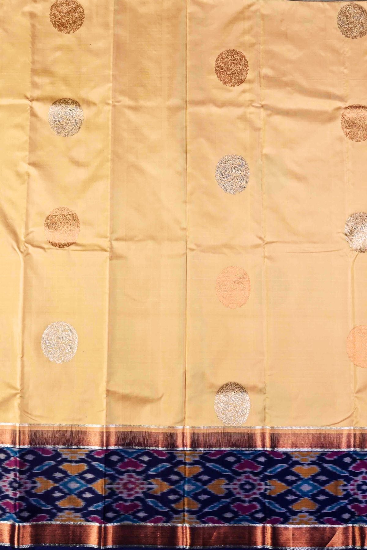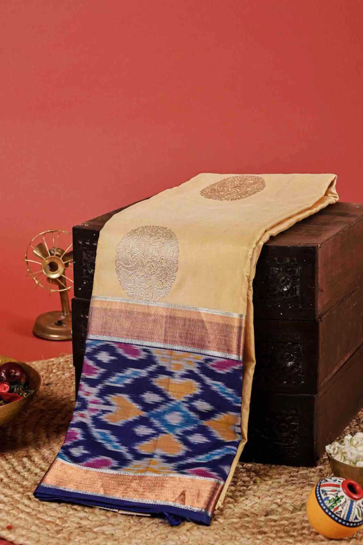 Cream kanchipuram silk saree with a versatile Ikhat woven border. The body carries abstract "chakram" bhuttas alternating in gold and silver zari.