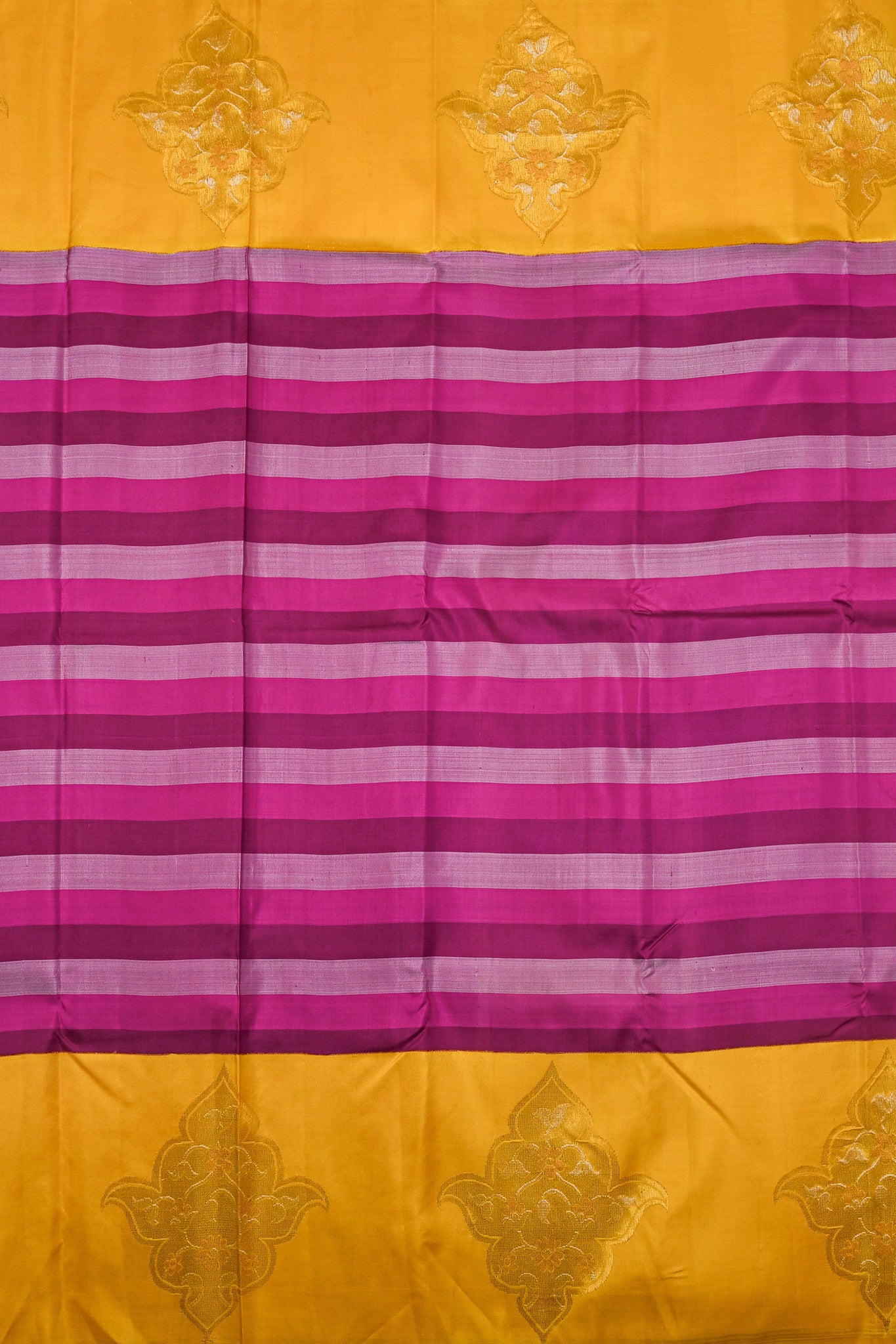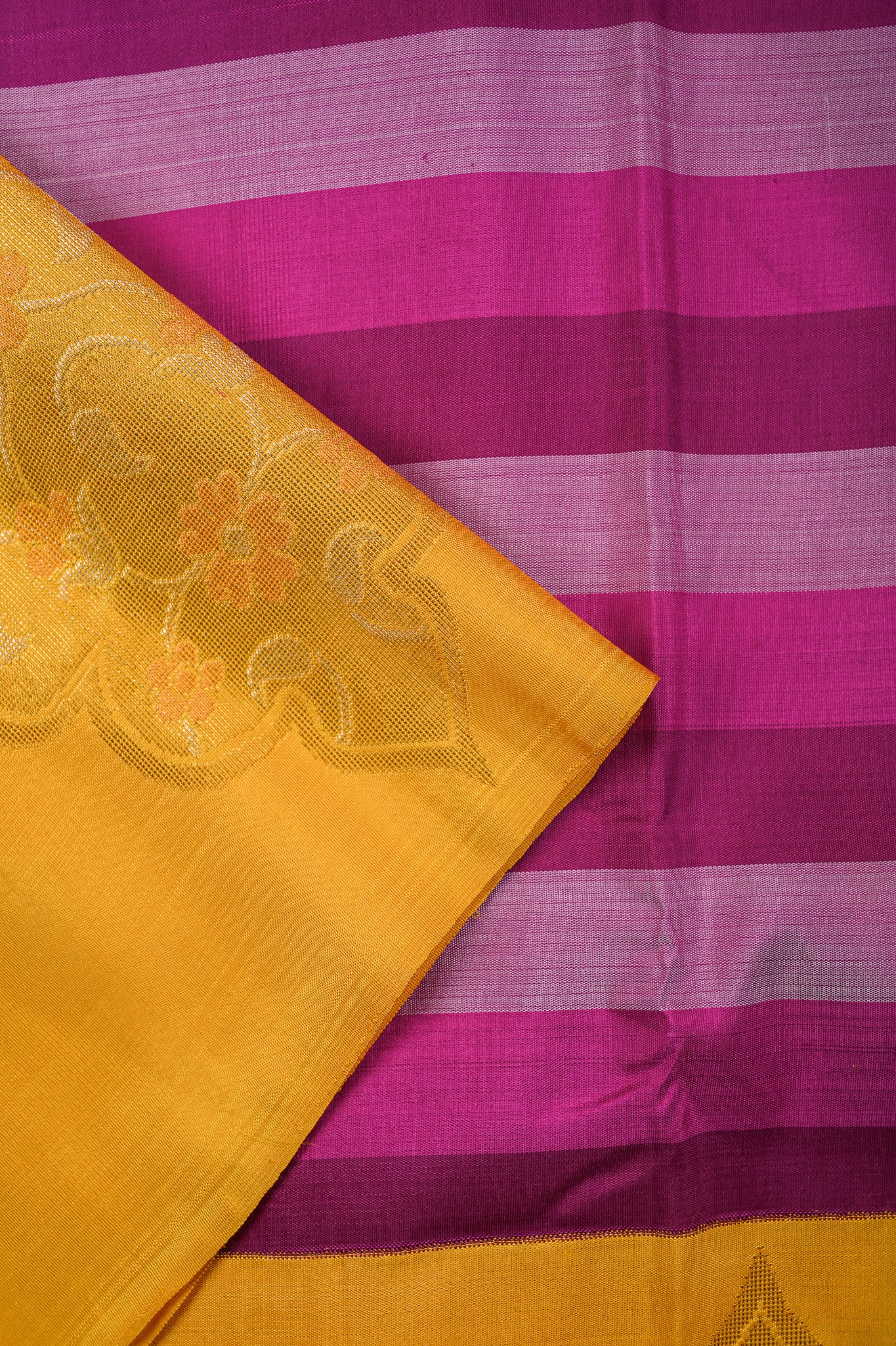 Purple kanchipuram silk saree with a mango yellow border carrying heritage bhuttas in gold zari. The body carries abstract stripes.