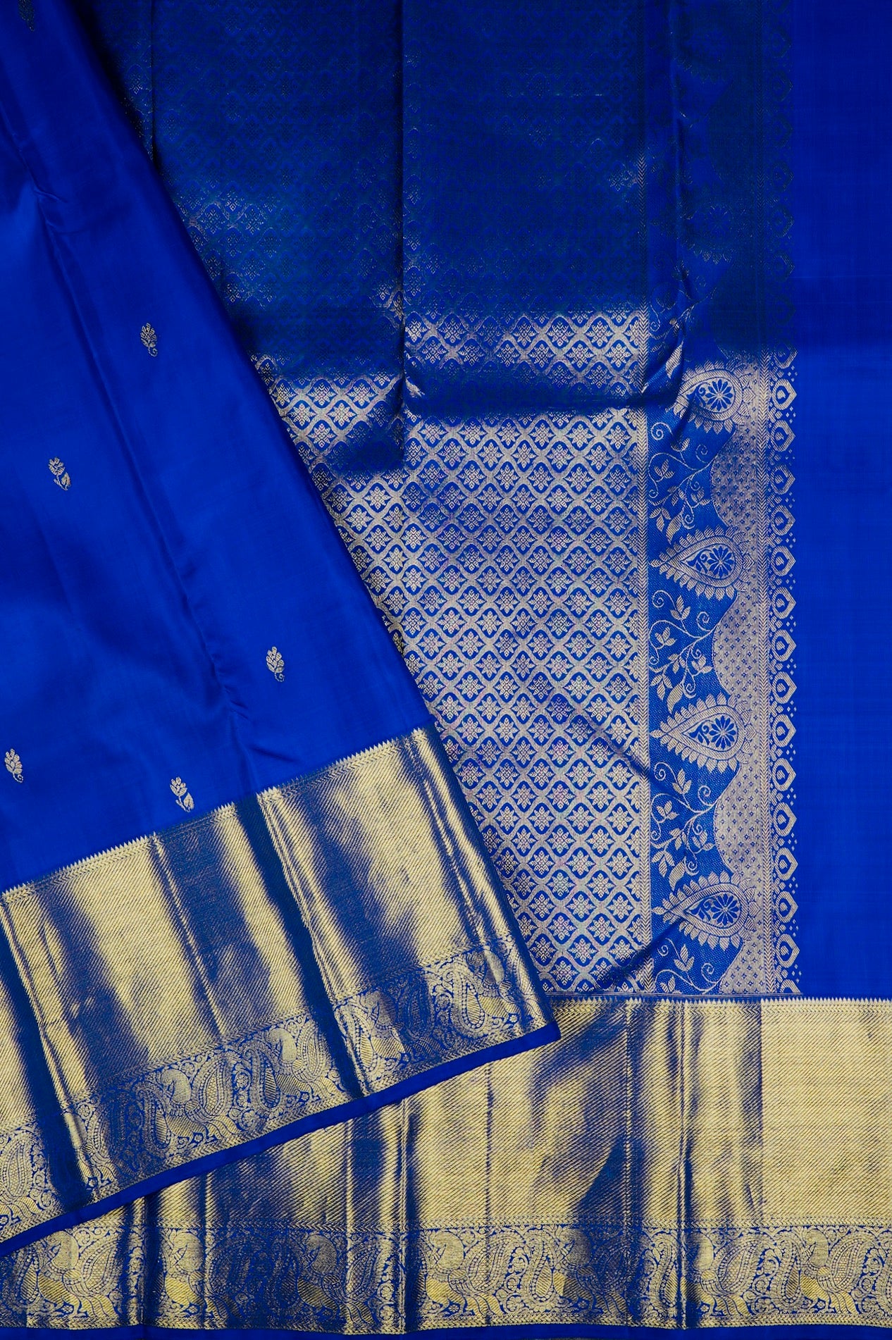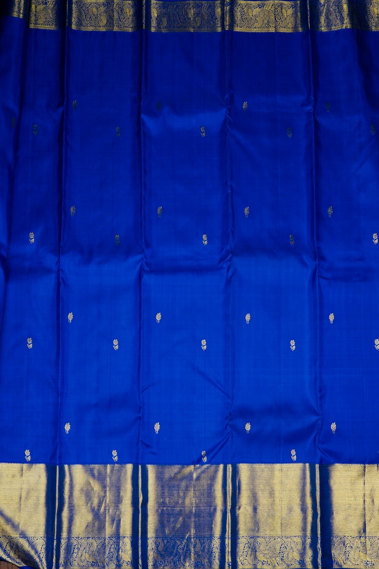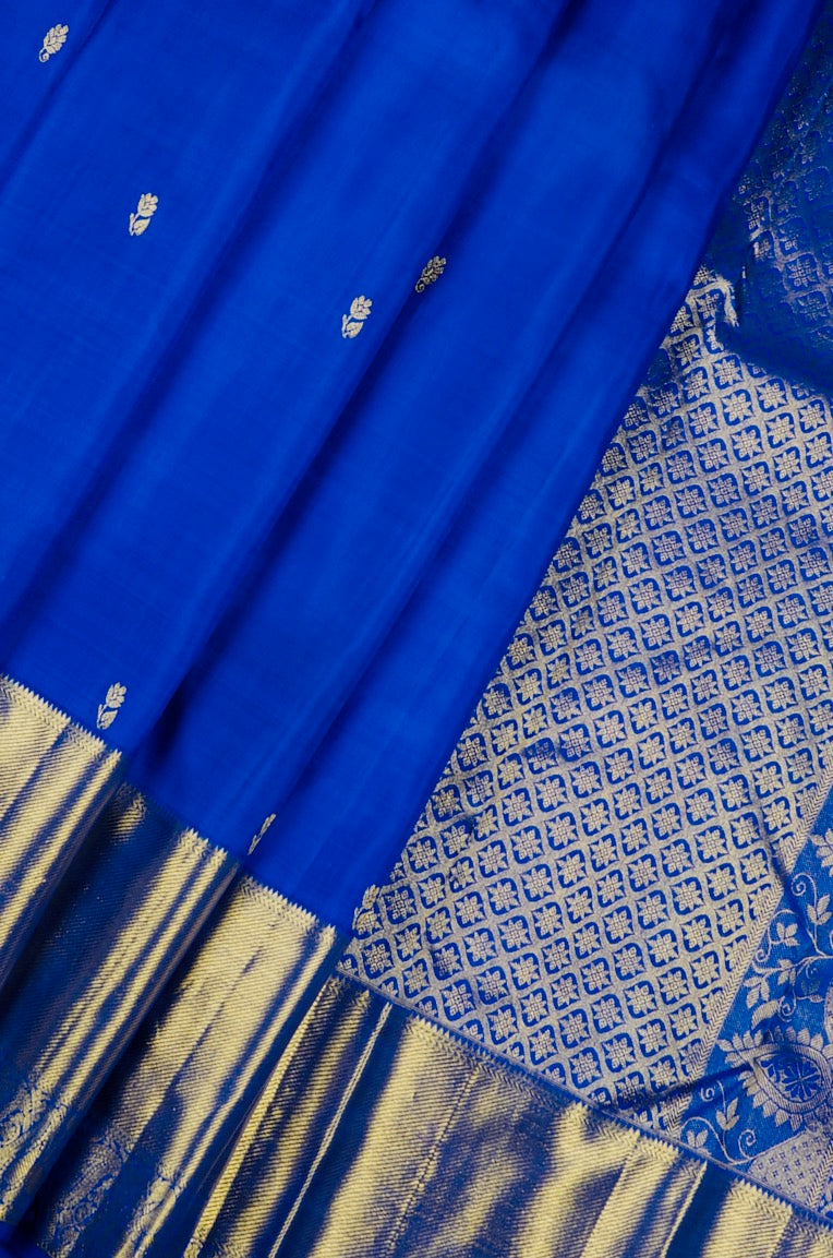 Royal blue Kanchipuram silk saree with a short upper border filled with intricate mango bhuttas woven in gold zari. The lower border is longer starting with a solid gold zari band followed by a band of mango bhuttas woven in gold. The pallu has a wide area of jaal pattern with floral motifs inside, followed by a series of big thilakam bhuttas and kodi pattern woven in gold zari. The saree has a plain royal blue blouse with the same border.