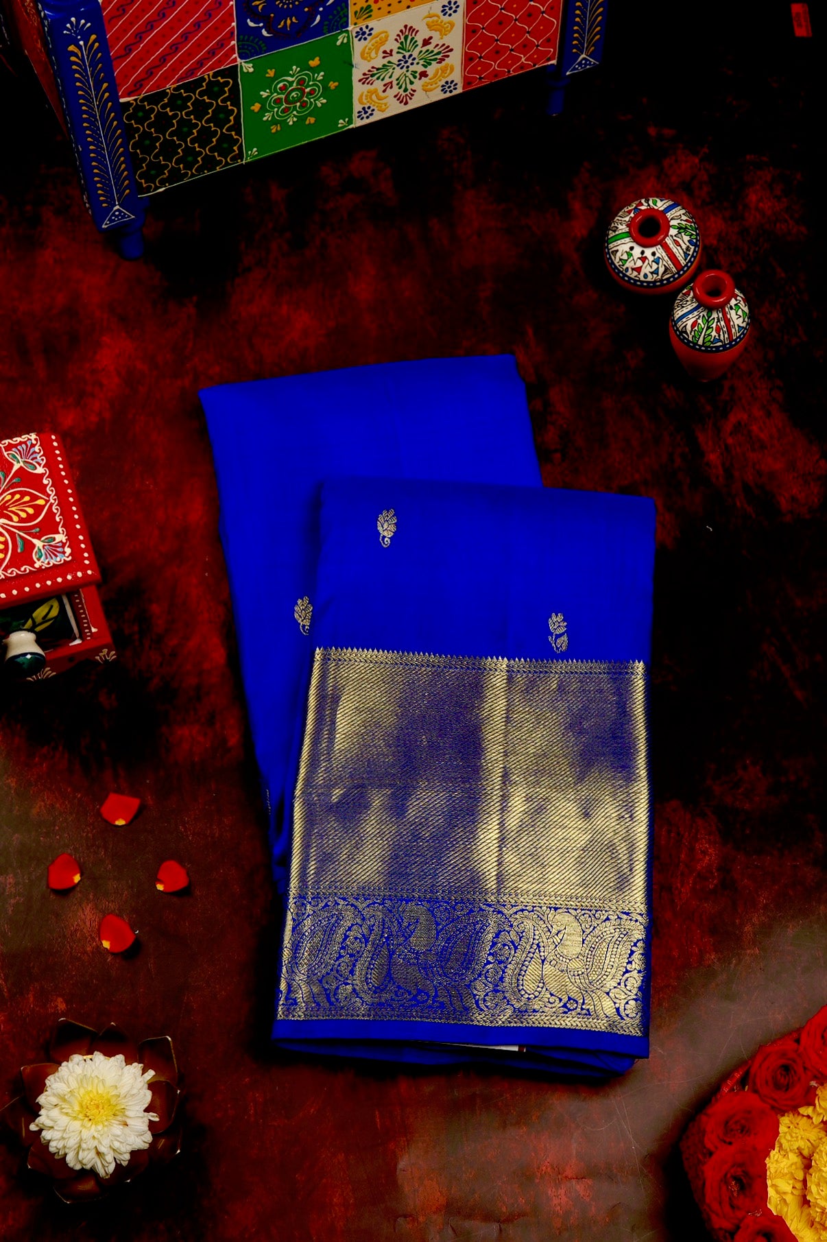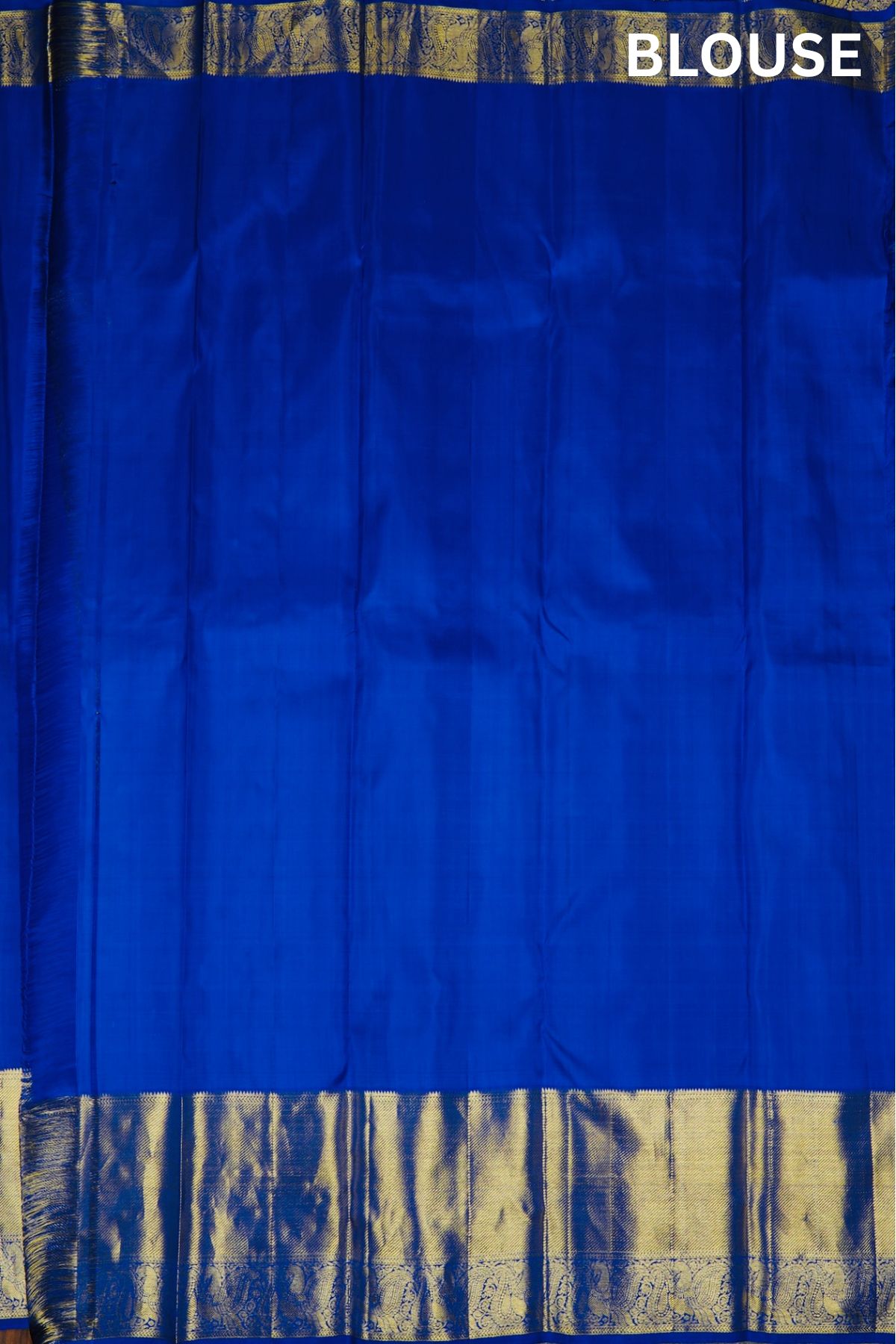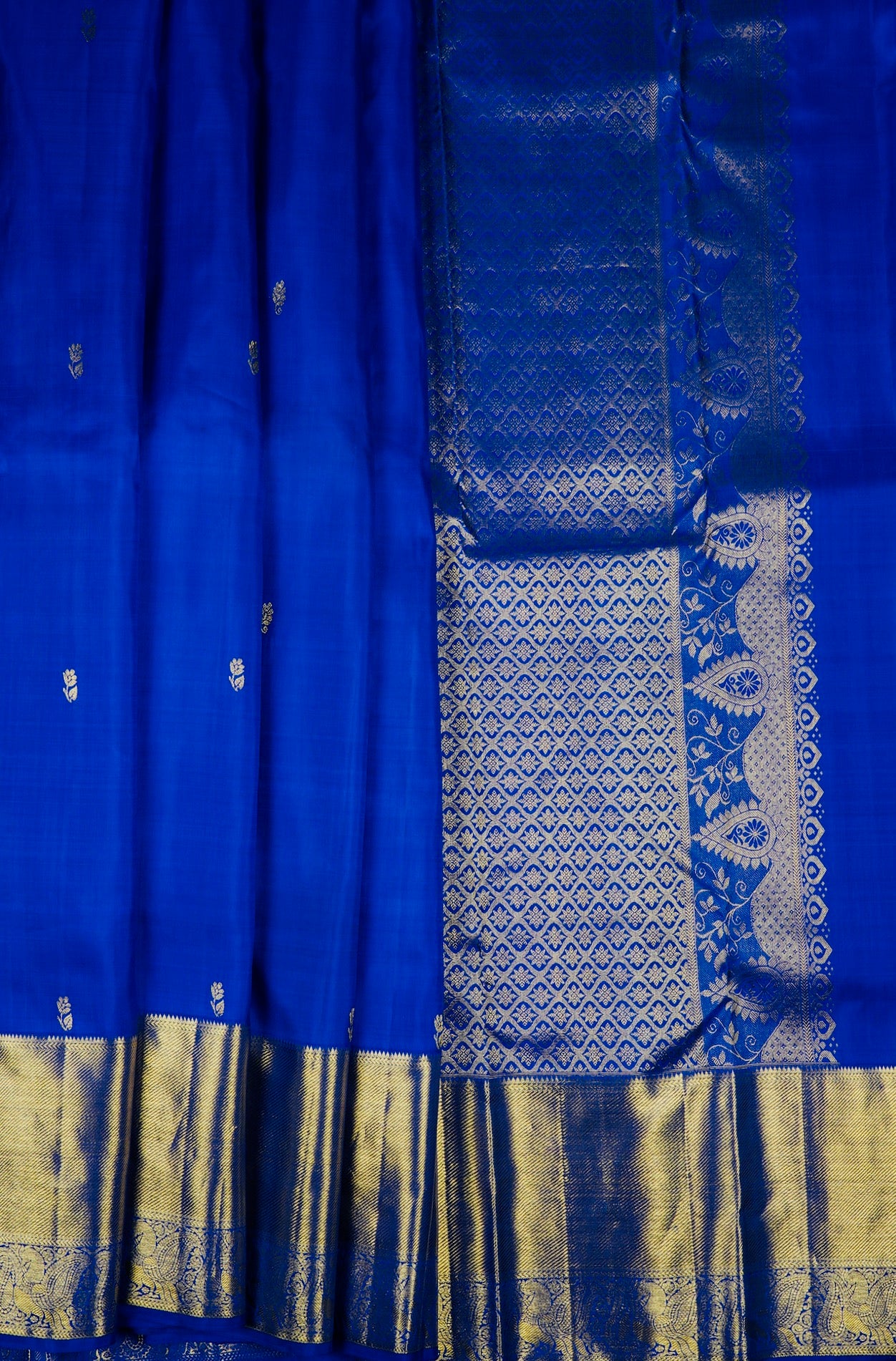 Royal blue Kanchipuram silk saree with a short upper border filled with intricate mango bhuttas woven in gold zari. The lower border is longer starting with a solid gold zari band followed by a band of mango bhuttas woven in gold. The pallu has a wide area of jaal pattern with floral motifs inside, followed by a series of big thilakam bhuttas and kodi pattern woven in gold zari. The saree has a plain royal blue blouse with the same border.