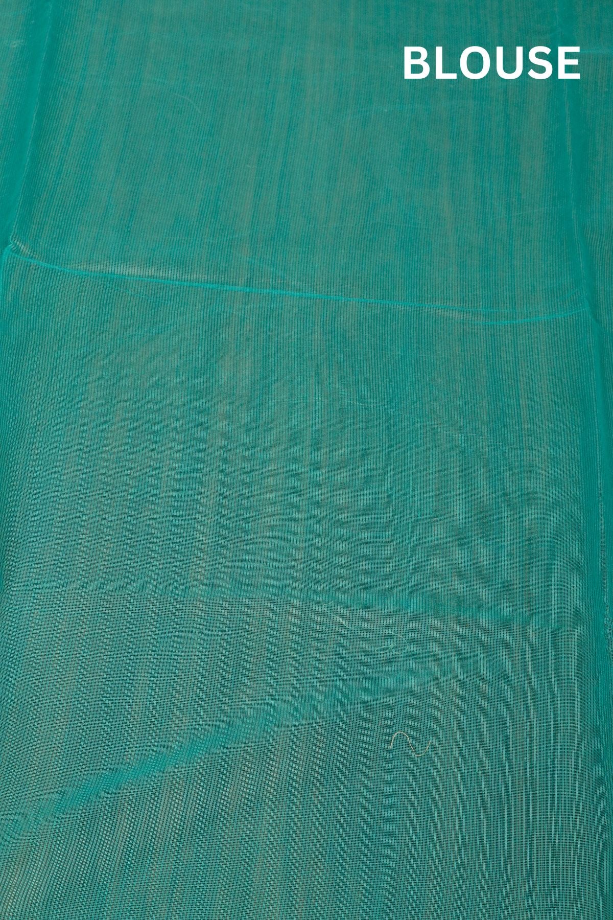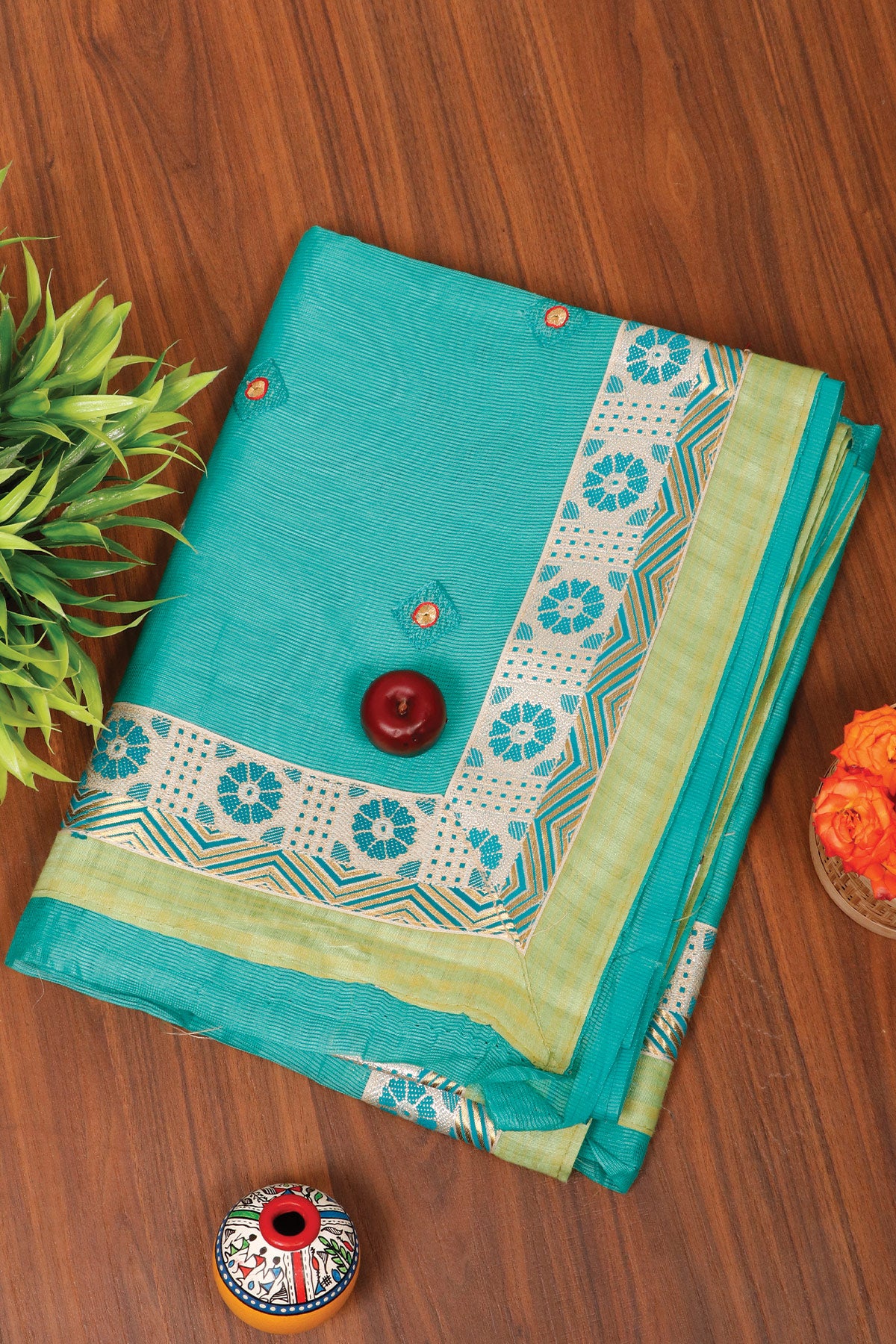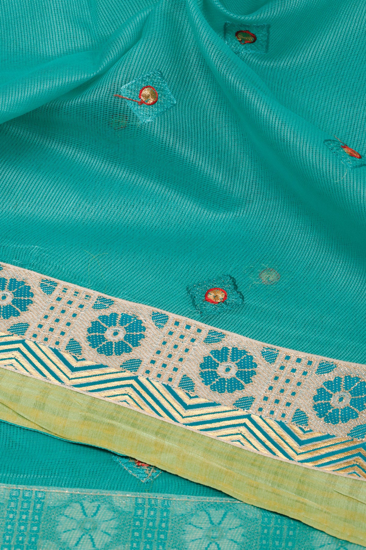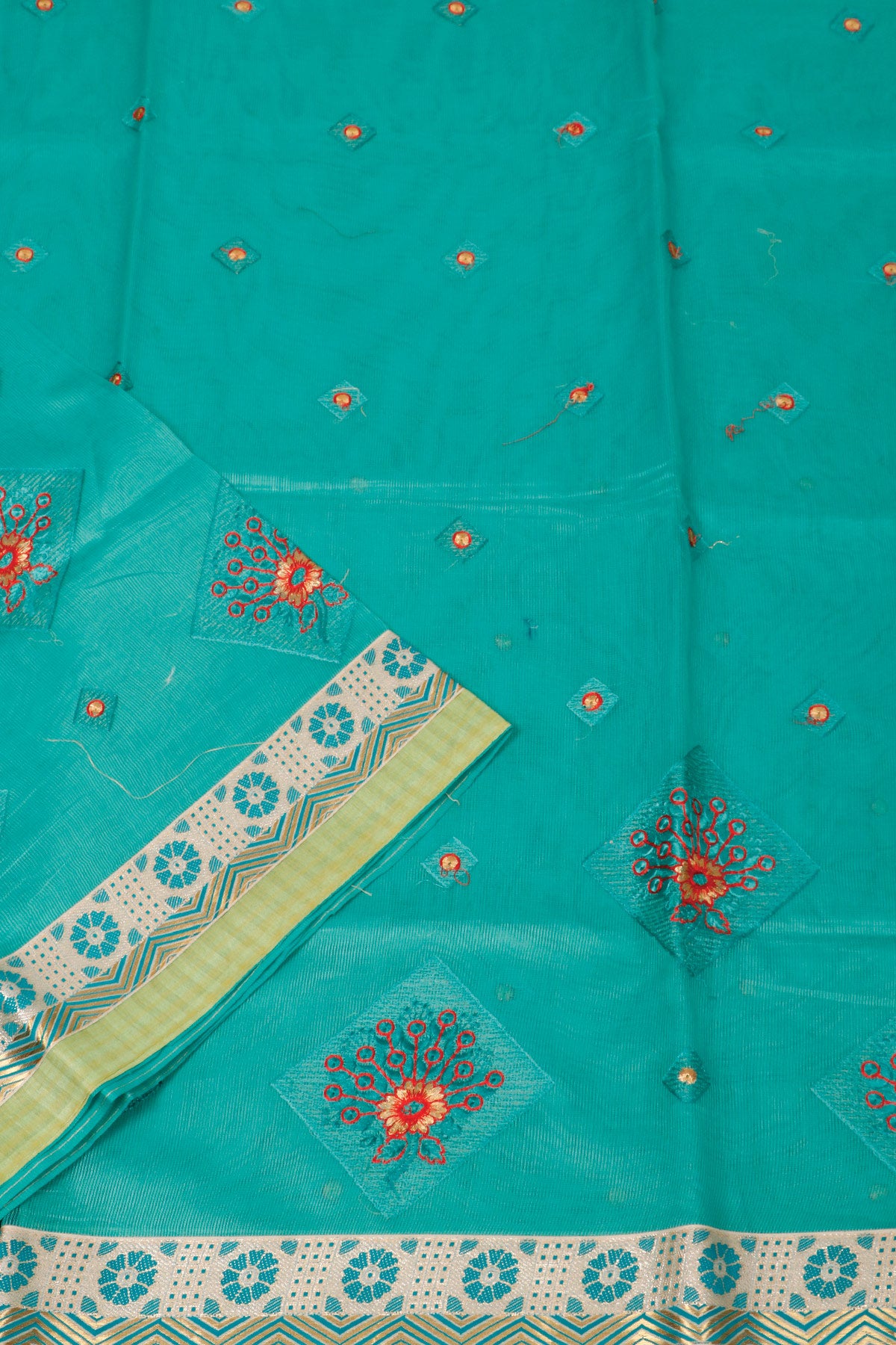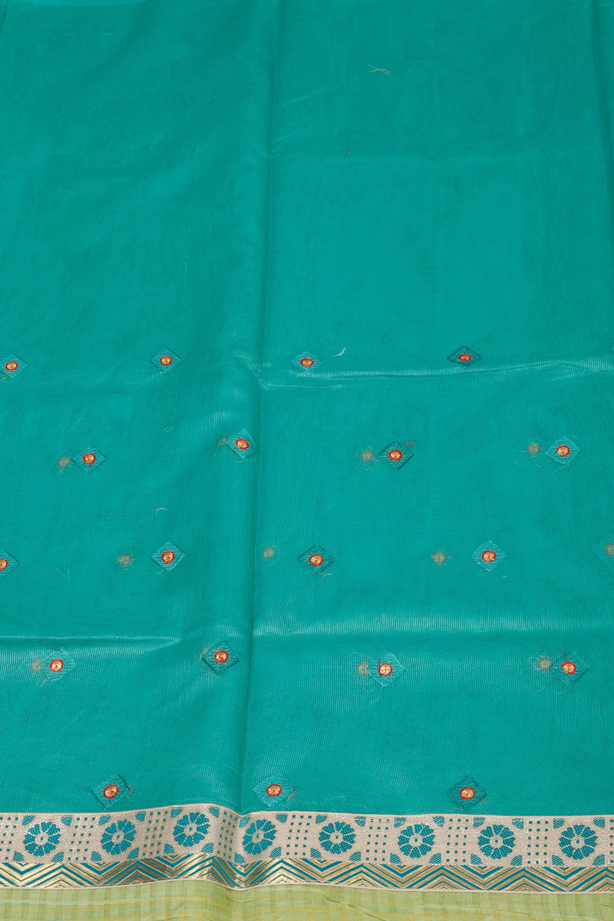 Teal blue semi silk cotton saree with floral-diamond embroidered bhuttas spread acorss the border, paired with a simple thread border
