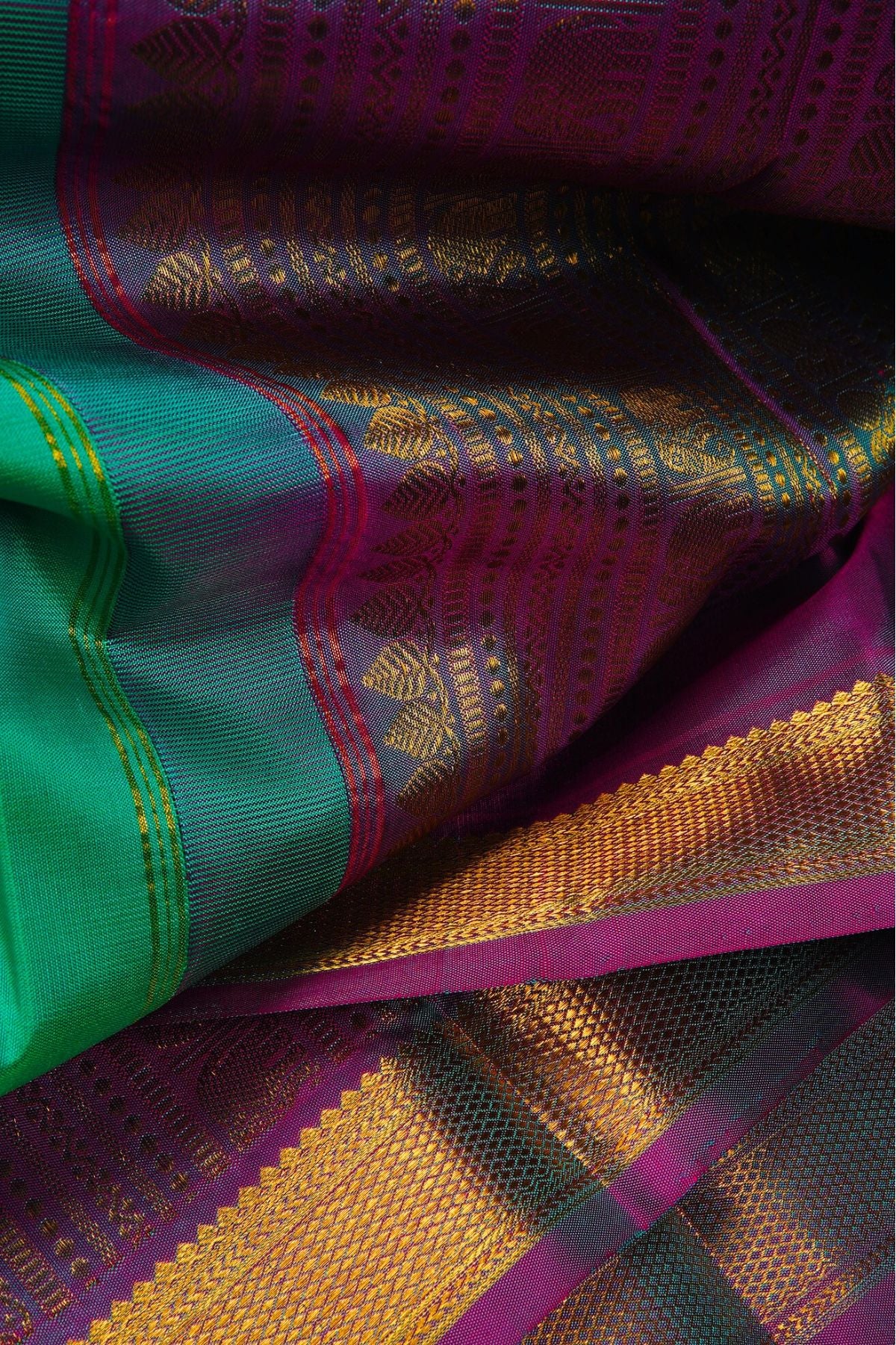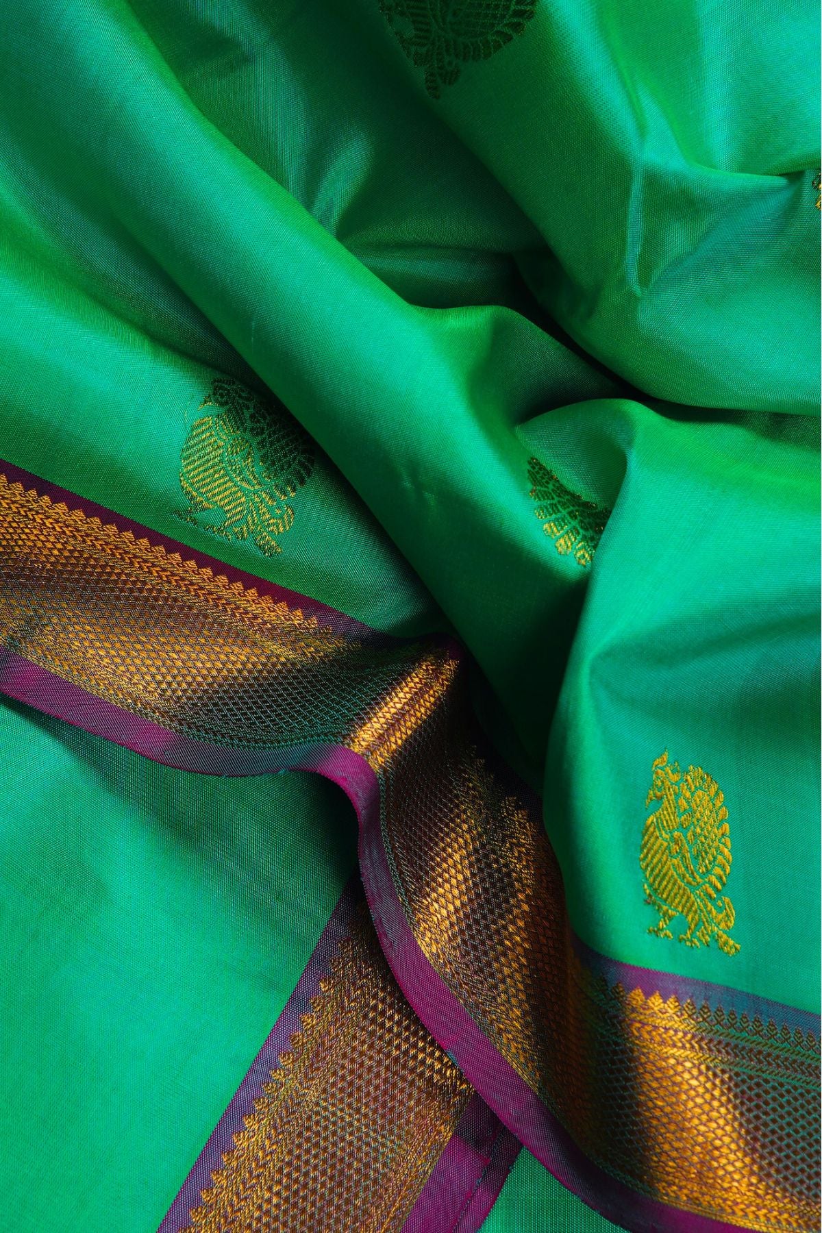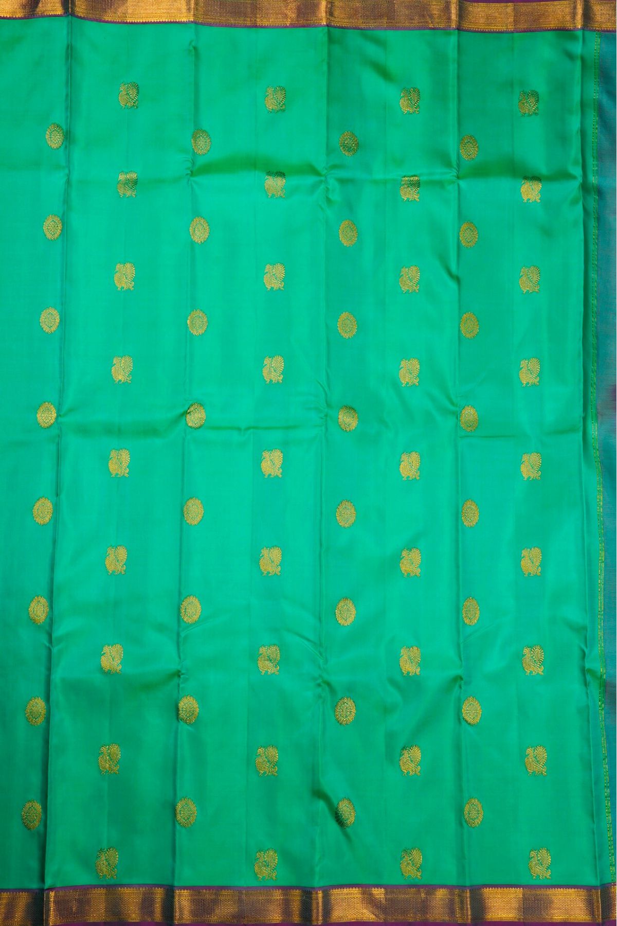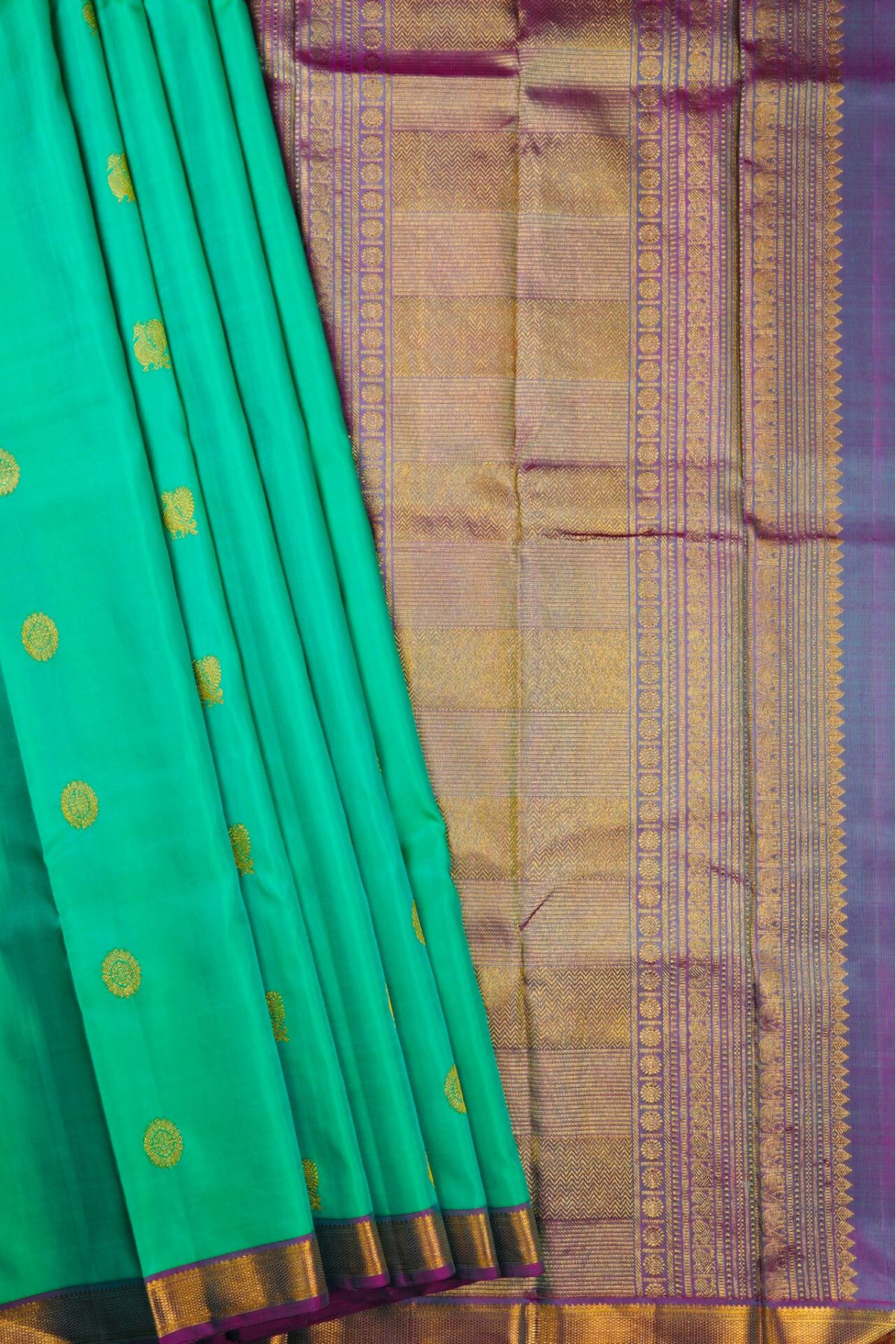 Turquoise Kanchipuram Silk Saree with alternating chakram and peacock bhuttas woven in gold zari with a bright violet border filled with gold zari. The pallu has a dusty purple base and has a series of intricate motifs, starting with a band ofleaves, followed by elephants, peacocks and circular floral motifs. A vast area of vertical bands in gold zari covers the pallu with the same series of bands repeating after. The saree has a plain dual toned dusty purple blouse with the same border.